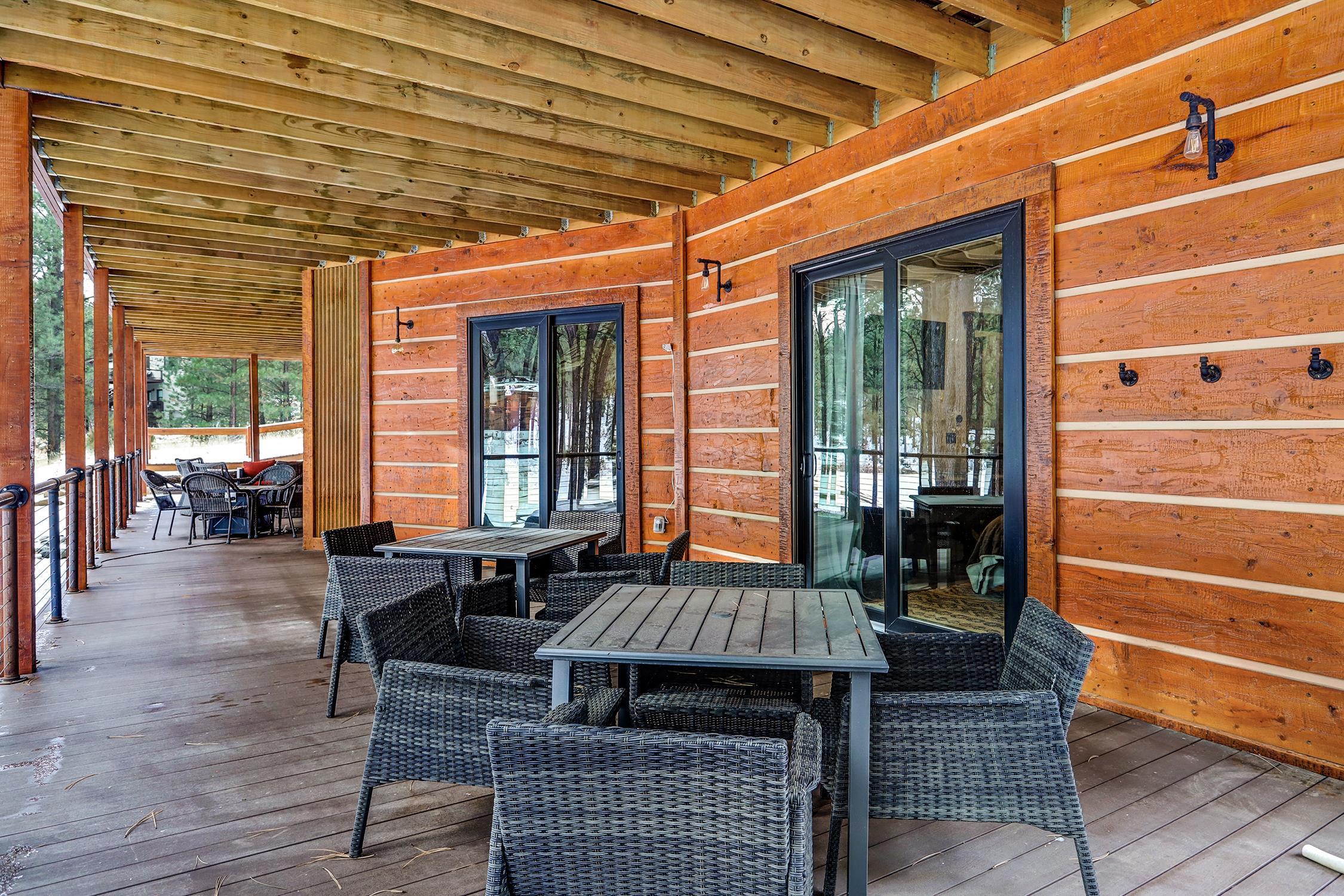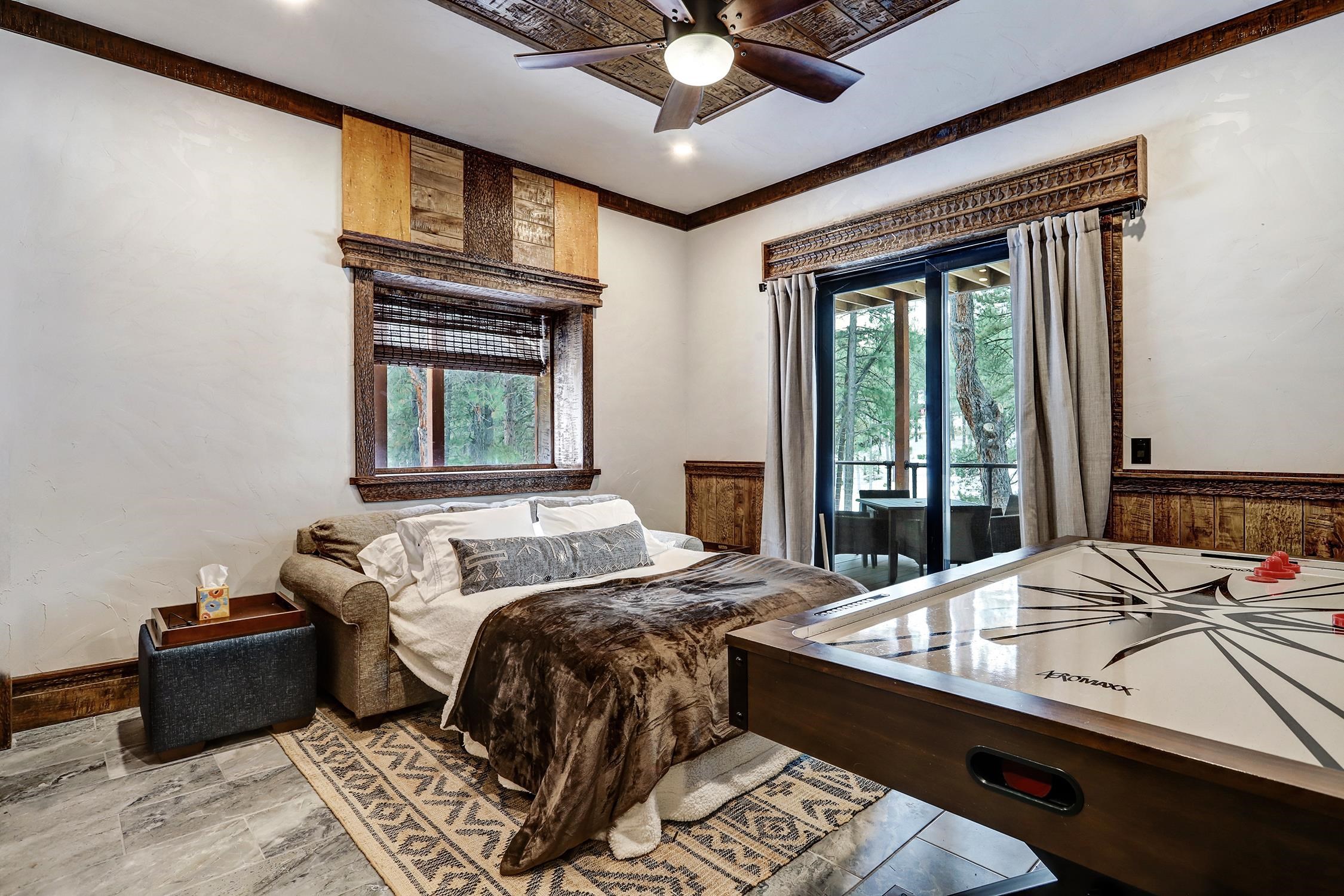 Nestled along the 3rd hole of the Angel Fire Resort Golf Course, this exceptional mountain home at 58 Colonial Trail offers a rare blend of luxury, comfort, and year-round recreation. With just over 5,000 square feet, 5 bedrooms, and 5 bathrooms, this one-of-a-kind property is designed to accommodate both intimate gatherings and large groups with ease. Custom wood features throughout the home create warmth and character, setting it apart from anything else in Angel Fire. The primary suite on the main level provides convenience and privacy, while an additional guest bedroom on the same level allows guests to enjoy the home with minimal stairs. The main living area centers around a wood-burning fireplace, perfect for cozy mountain evenings. Downstairs, a second living area with its own kitchenette offers ideal separation for guests or extended stays. This level also features a bedroom with custom-built bunk beds sleeping six, making it perfect for hosting family and friends. An entertainer’s dream, the home boasts a loft-style bar area complete with a sink, beverage refrigerators, dishwasher, ice machine, and beer taps—a truly unique feature for après-golf or ski-day gatherings. Convenience is enhanced with washer and dryer sets on both the main and lower levels, as well as a large mudroom designed for mountain living. Outdoor living is equally impressive, with expansive spaces both upstairs and downstairs, ideal for taking in golf course views and cool mountain air. A hot tub provides the perfect place to unwind after a day on the slopes or fairways. Additional highlights include a golf cart garage with direct cart path access, making trips to the course effortless. Whether you’re seeking a full-time residence, vacation getaway, or legacy mountain property, this home delivers unmatched versatility and charm. A true Angel Fire retreat—designed for making memories in every season.