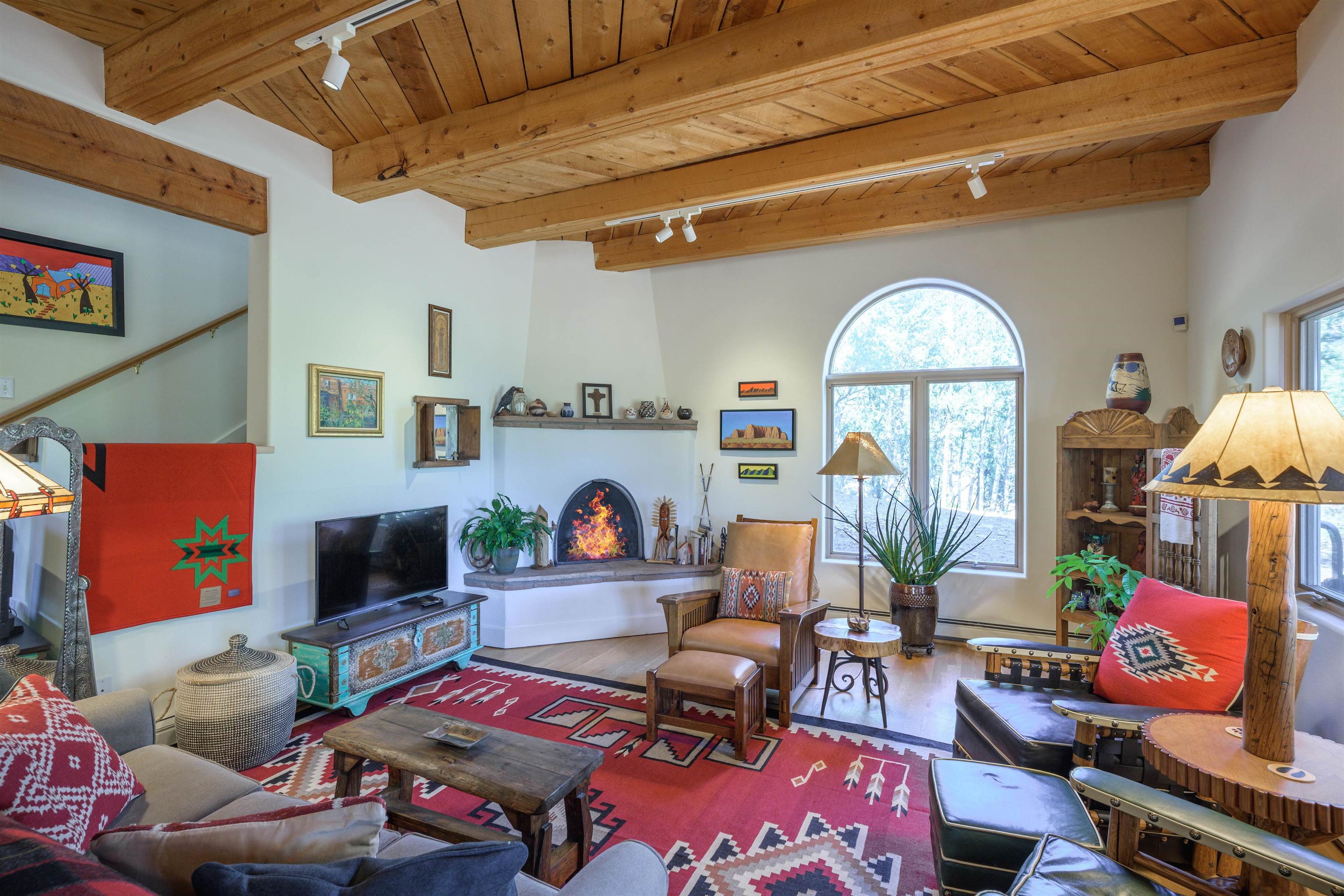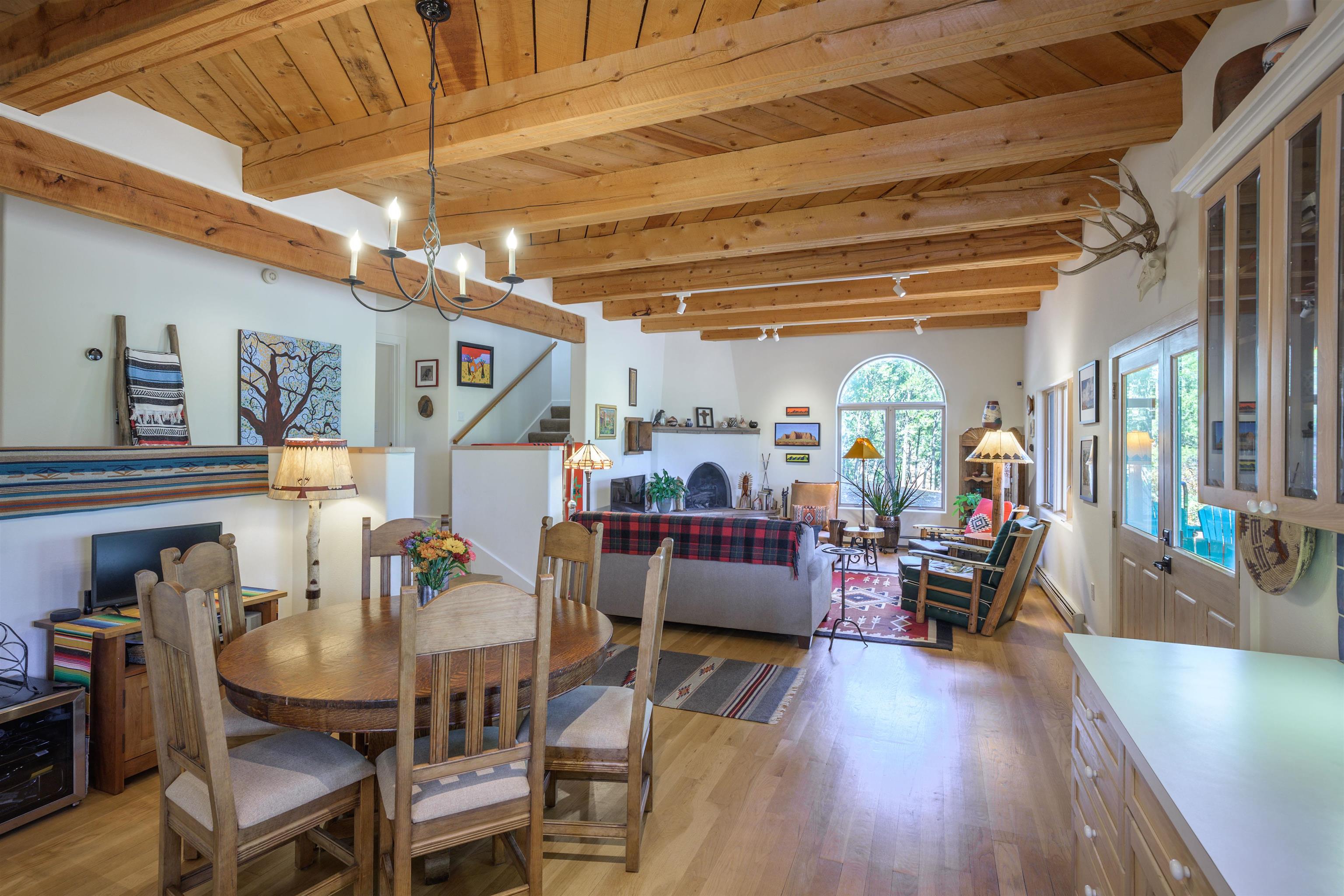 Peaceful mountain living meets timeless New Mexico charm in this beautifully updated territorial-style home on 2.54 wooded acres between Taos Ski Valley and the Town of Taos. Thoughtfully designed for comfort and connection to nature, this 3-bedroom, 2.5-bath home offers 2,064 sq ft of warm, light-filled living space. The main level features a welcoming living room with a southwest-style kiva fireplace, open-beam ceilings, and large windows that frame forest and mountain views. The inviting kitchen blends modern convenience with traditional detail and opens to the dining area for easy entertaining. The private primary suite features an updated en suite bath, while the upper level offers a spacious multi-purpose room ideal for guests, a studio, or a family retreat. Enjoy expansive outdoor living on two covered decks and a flagstone patio surrounded by low adobe walls—perfect for morning coffee or evenings by the fire pit under starry skies. The detached garage, mature trees, and serene mountain backdrop make this property a rare Taos-area gem—move-in ready and minutes to Arroyo Seco, hiking, and skiing. This home is ready for your arrival to enjoy the Winter Holidays & Ski Season Joy! HOA fee is $200/yr for road maintenance. The seller has shared a design plan for a potential addition to the house, which is located under the "documents" section.