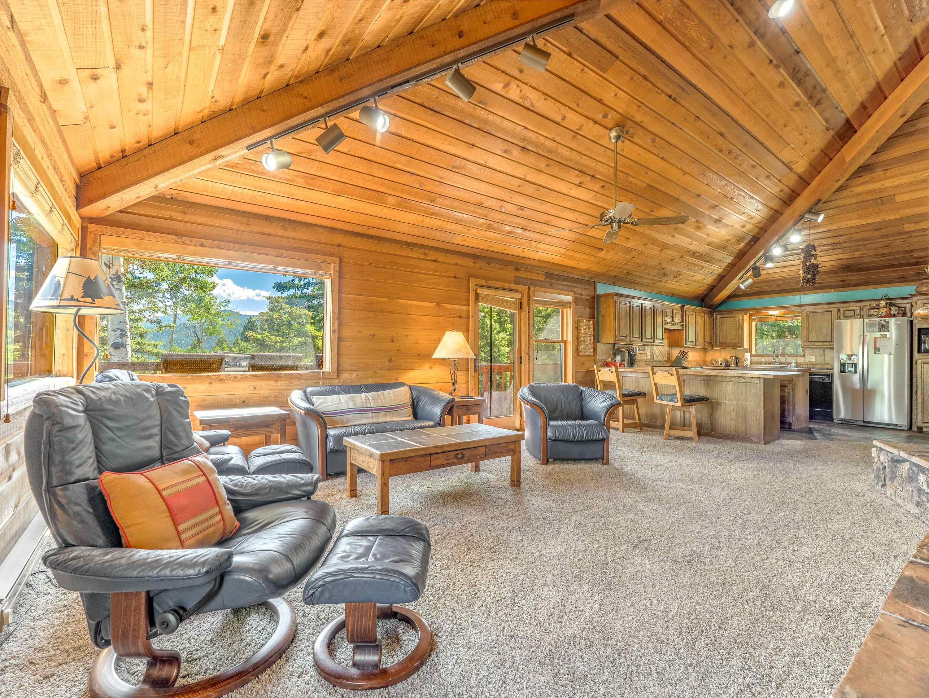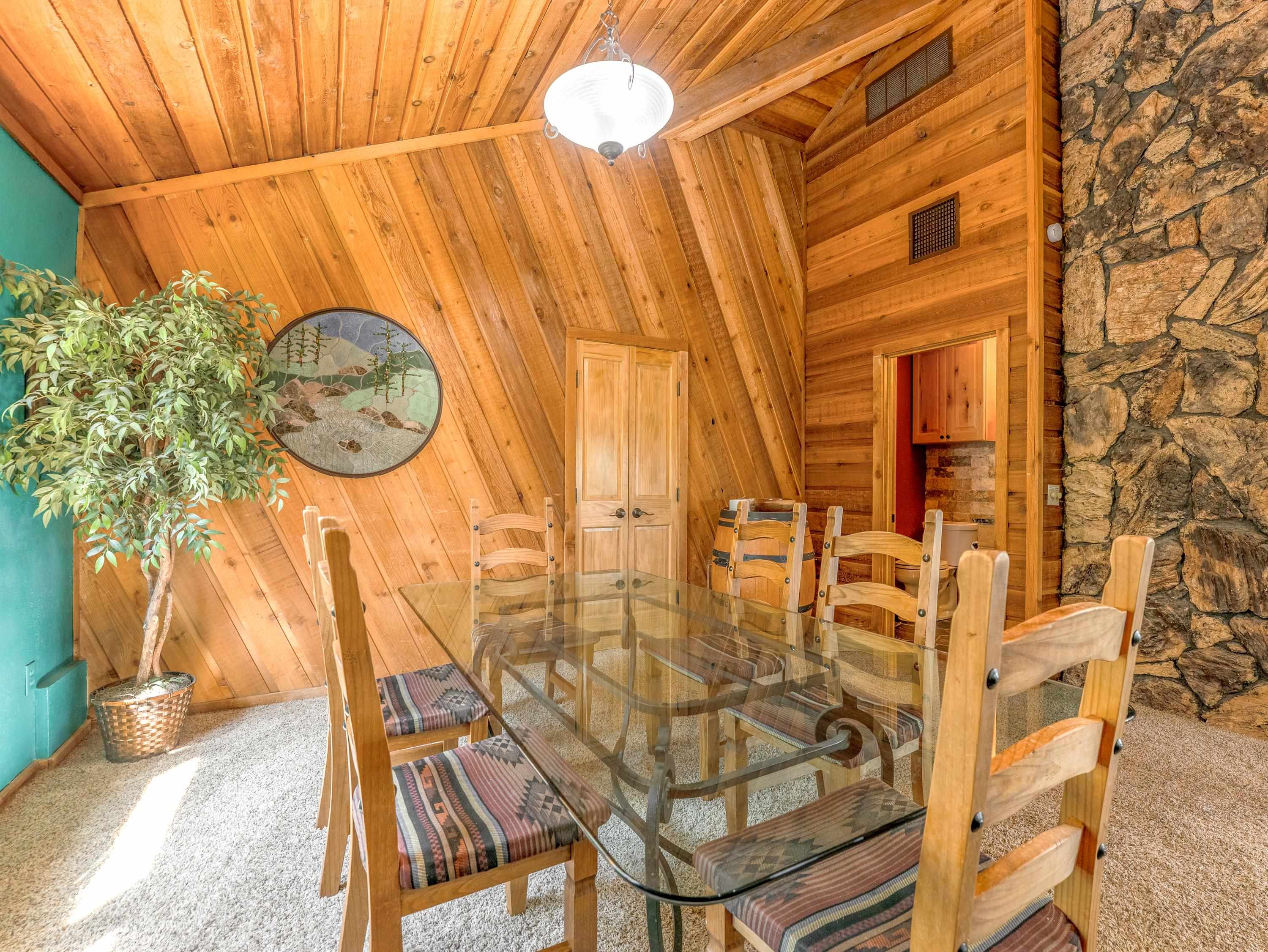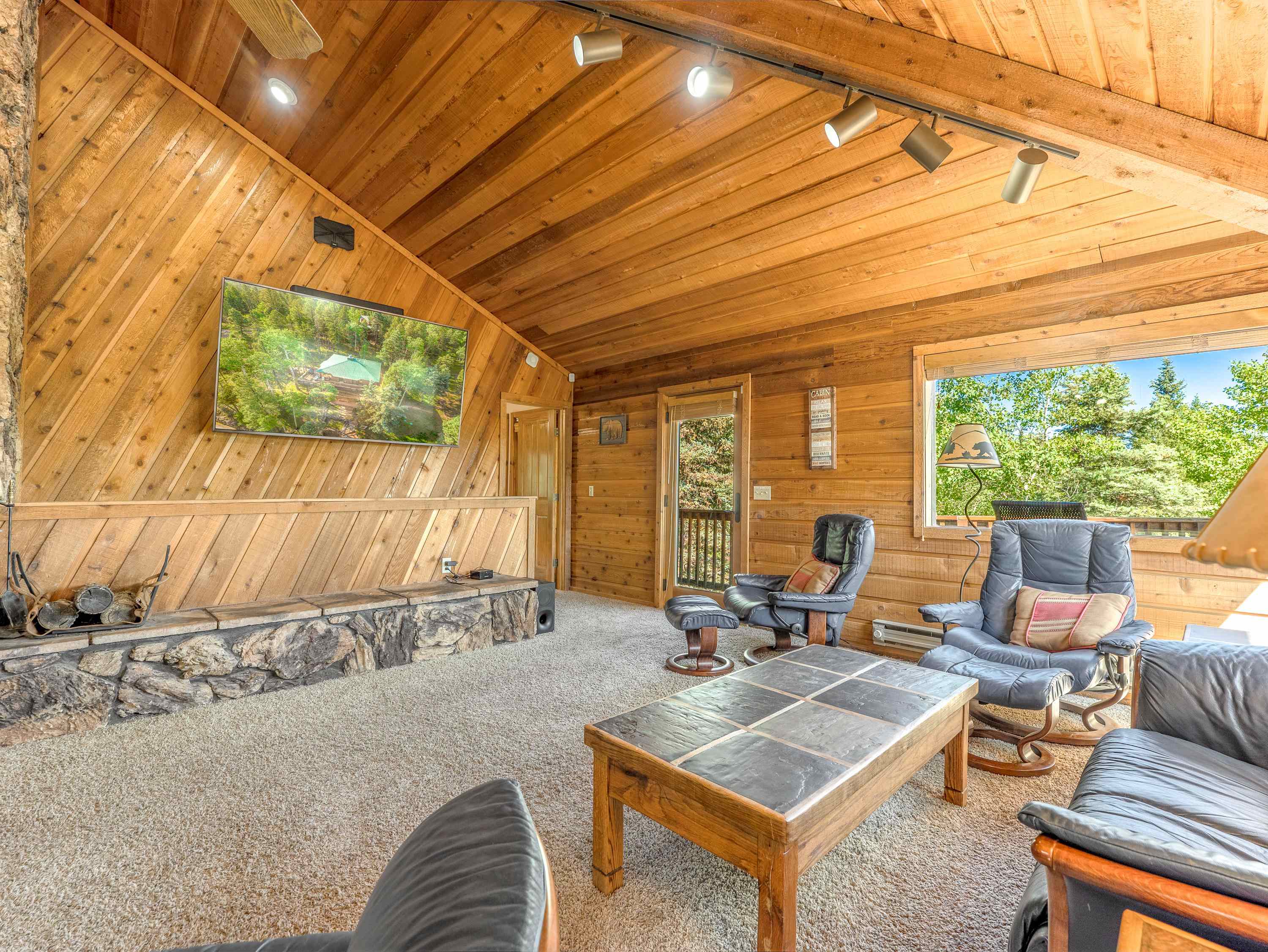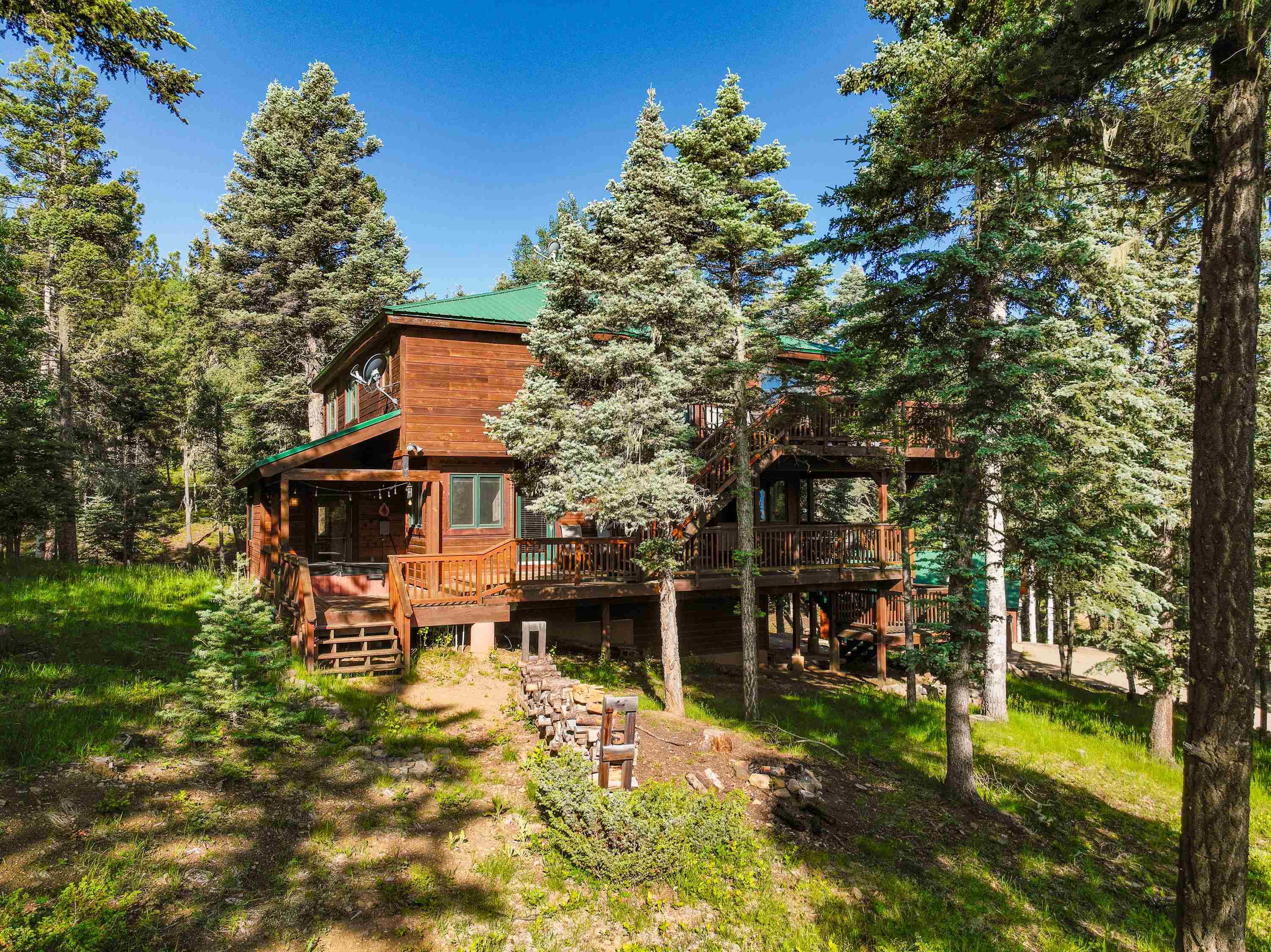 Tucked away amid whispering pines and just a short walk to the popular Cougar greenbelt trail, 60 Taos Drive in Angel Fire is teeming with mountain charm and functionality. The bright and open main living area features vaulted ceilings, a cozy fireplace, and large windows that frame the forested surroundings. It flows effortlessly into the spacious kitchen and dining area, ideal for gathering with family and friends. Also on the main level is the private primary suite with an ensuite bathroom, a convenient half-bath, and access to the upper tier of the expansive wraparound deck with views of Mt. Baldy in Eagle Nest. The middle level provides a second living area, a sunny office, two inviting guest bedrooms, and a full bathroom—plus access to the mid-level deck with space to soak in the hot tub or relax in the fresh mountain air. Downstairs, a bonus bunk room or extra hangout space makes a great retreat for kids. A two-car detached garage offers both weather protection and room for storage or workshop space. Ideally located just 10 minutes from Monte Verde Lake, the golf course and country club, abundant hiking trails, and Angel Fire Resort, this home is not only a serene getaway but also offers a smart vacation rental investment opportunity!