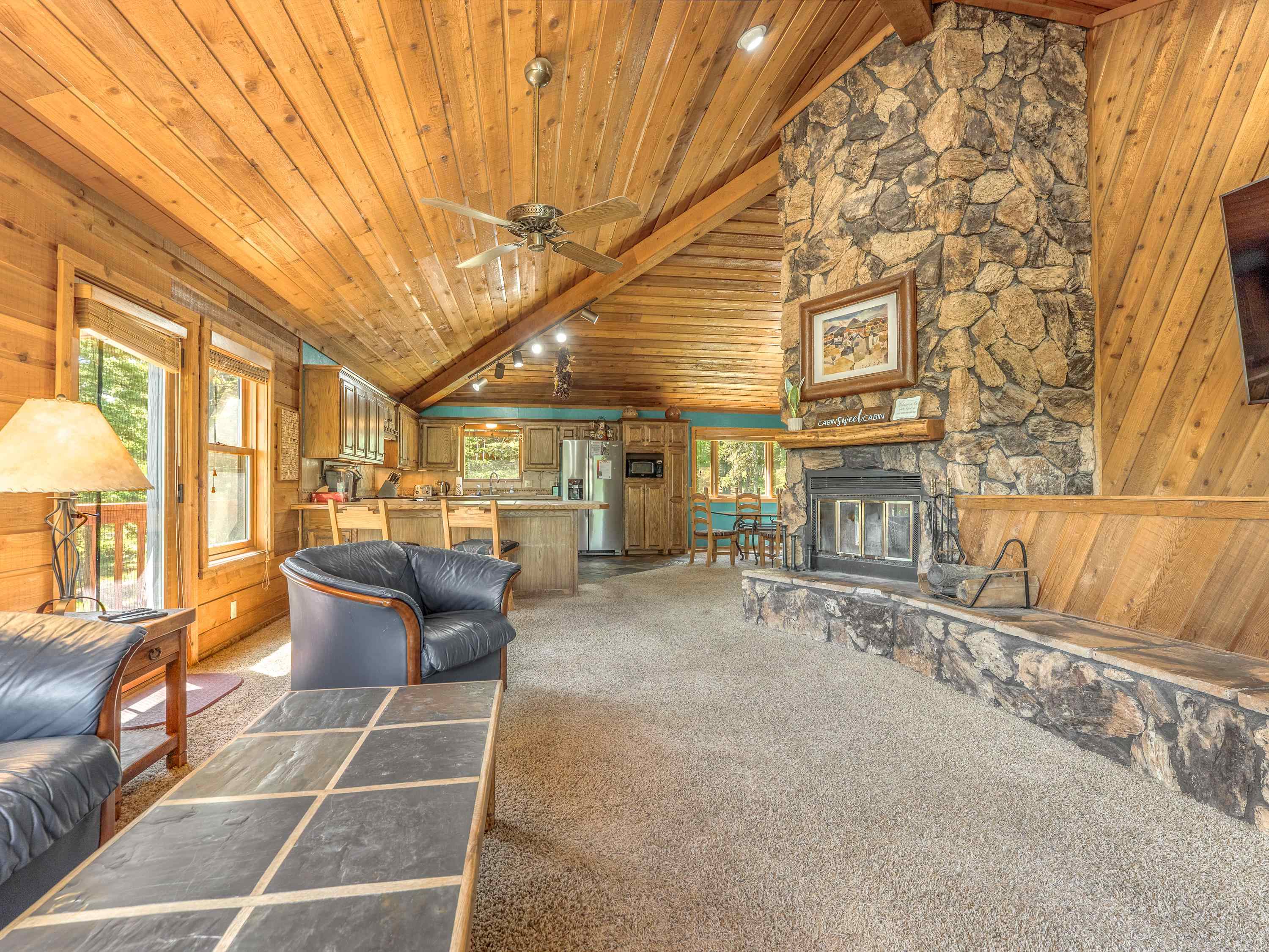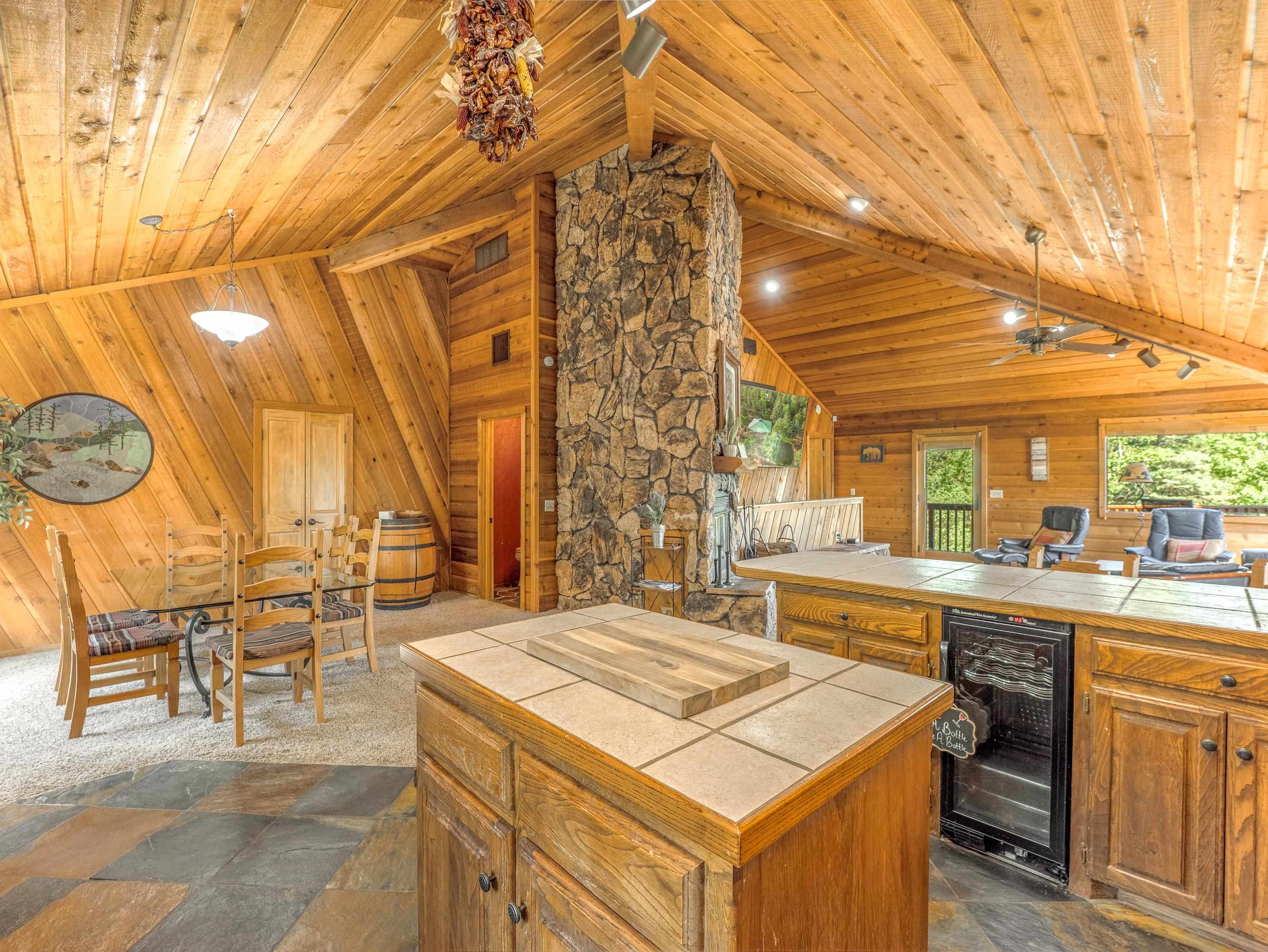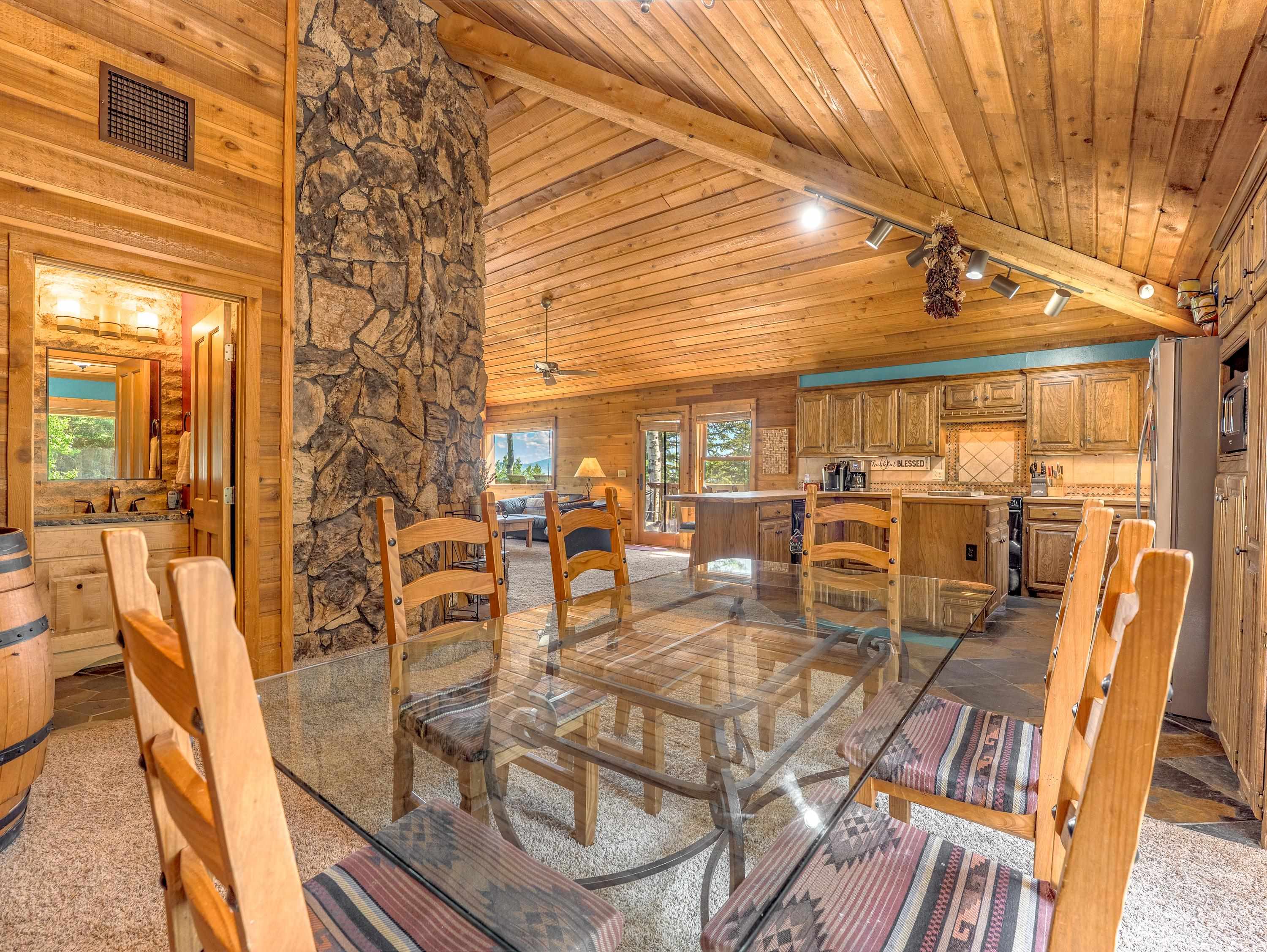 Tucked away amid whispering pines and just a short walk to the popular Cougar greenbelt trail, 60 Taos Drive in Angel Fire is teeming with mountain charm and functionality. The bright and open main living area features vaulted ceilings, a cozy fireplace, and large windows that frame the forested surroundings. It flows effortlessly into the spacious kitchen and dining area, ideal for gathering with family and friends. Also on the main level is the private primary suite with an ensuite bathroom, a convenient half-bath, and access to the upper tier of the expansive wraparound deck with views of Mt. Baldy in Eagle Nest. The middle level provides a second living area, a sunny office, two inviting guest bedrooms, and a full bathroom—plus access to the mid-level deck with space to soak in the hot tub or relax in the fresh mountain air. Downstairs, a bonus bunk room or extra hangout space makes a great retreat for kids. A two-car detached garage offers both weather protection and room for storage or workshop space. Ideally located just 10 minutes from Monte Verde Lake, the golf course and country club, abundant hiking trails, and Angel Fire Resort, this home is not only a serene getaway but also offers a smart vacation rental investment opportunity!