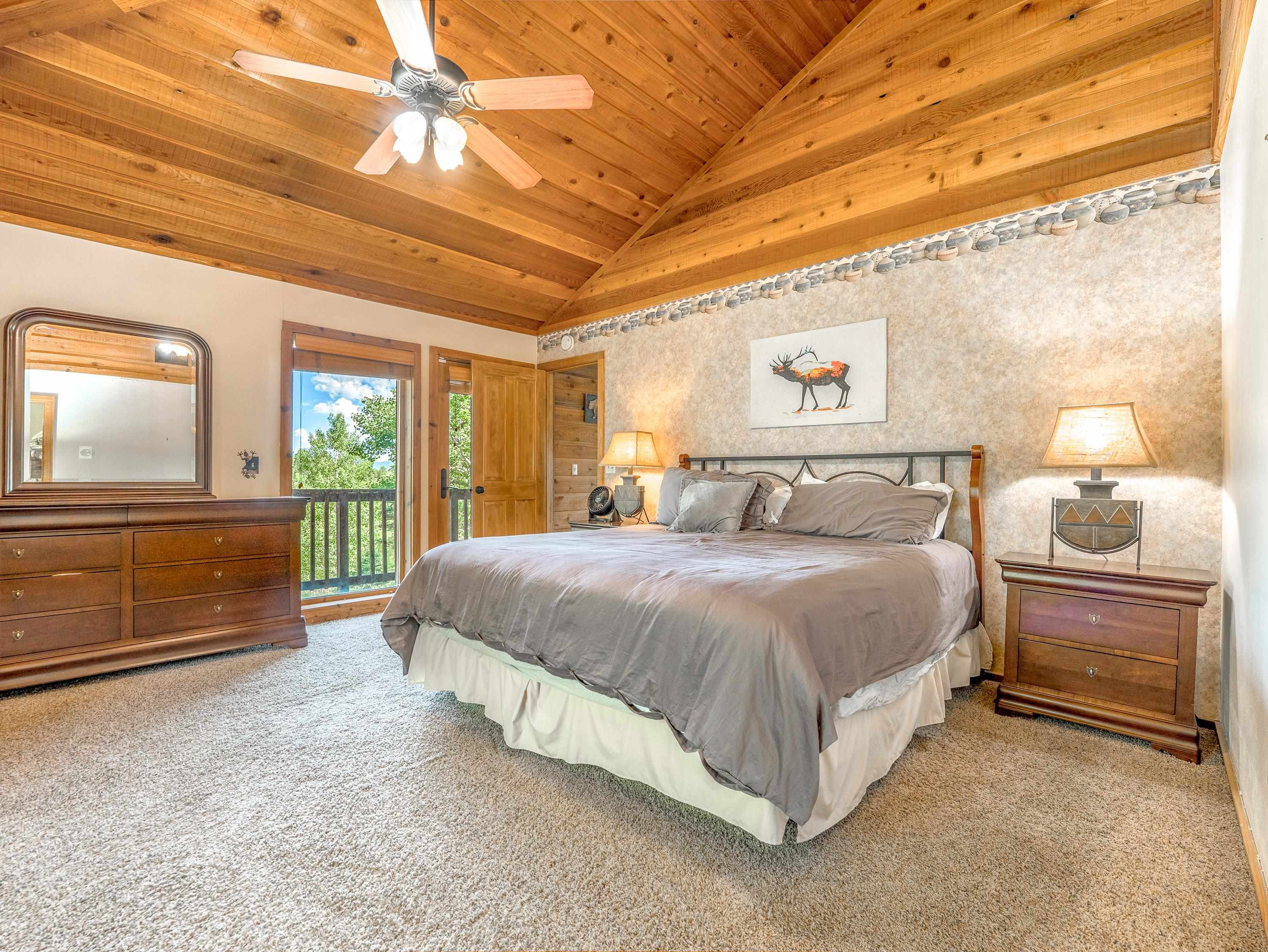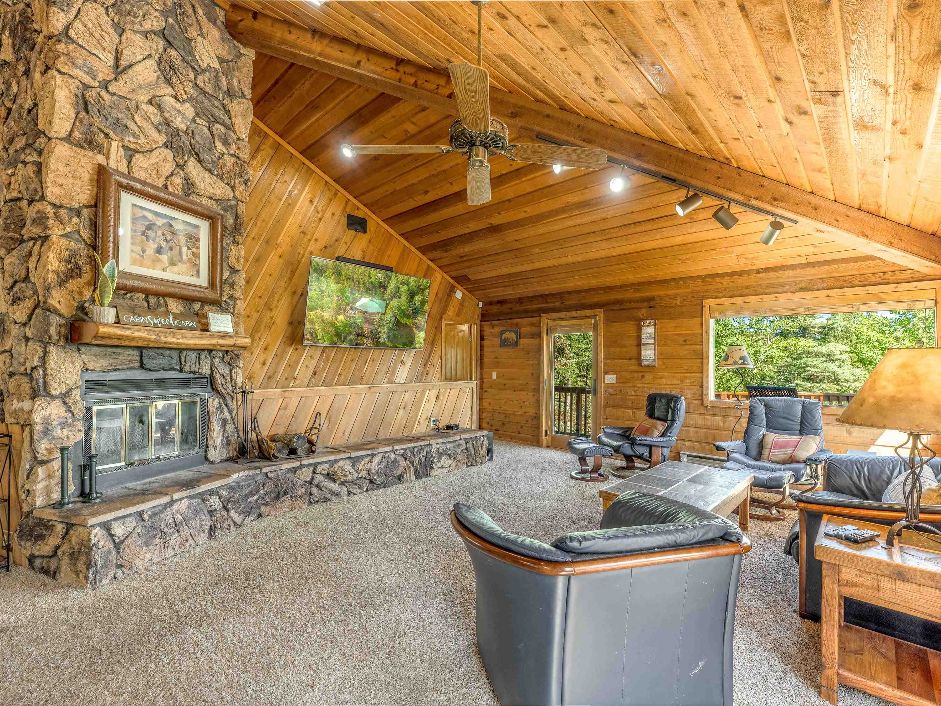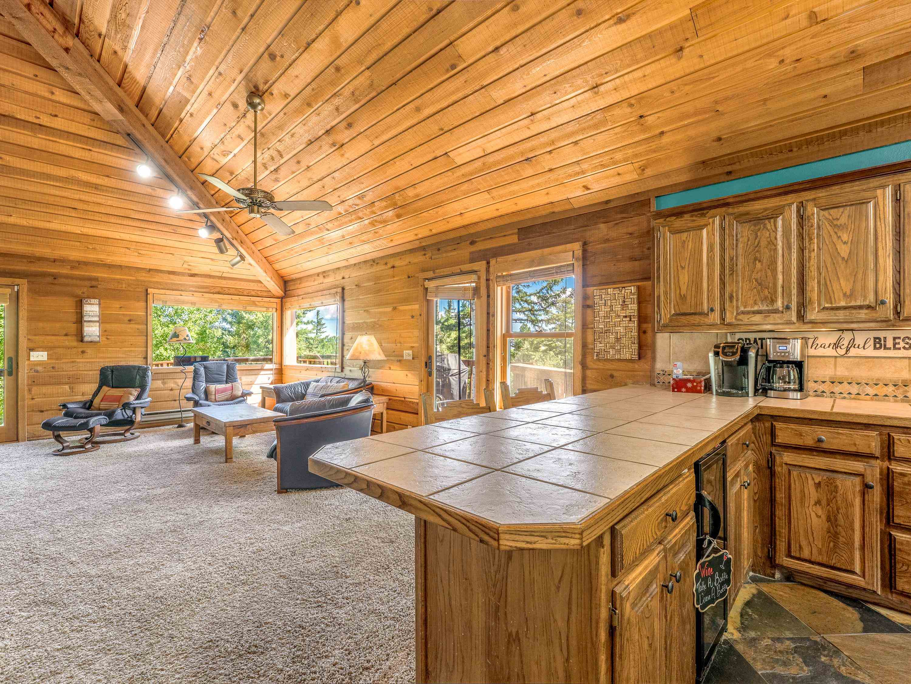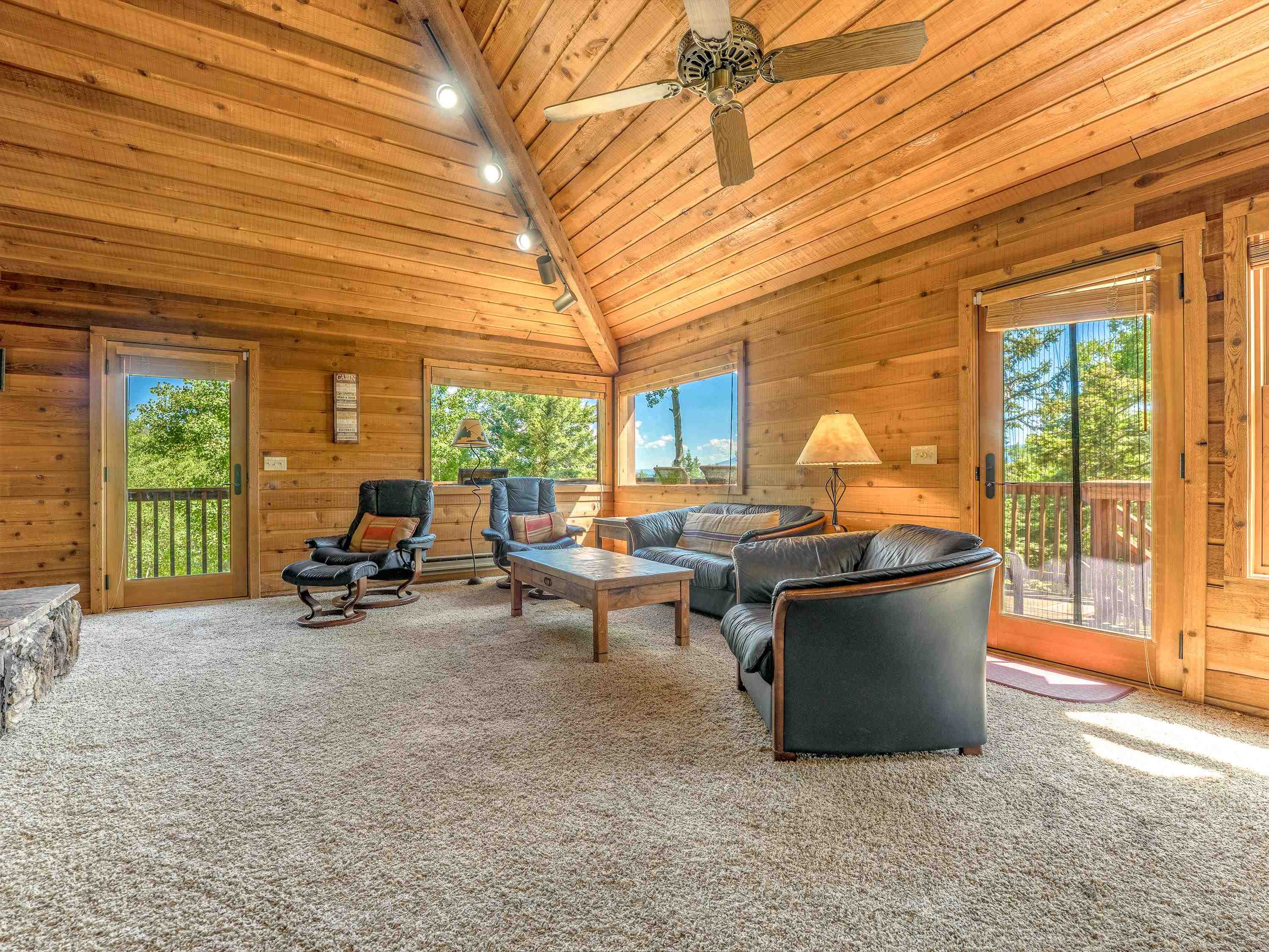 Tucked away amid whispering pines and just a short walk to the popular Cougar greenbelt trail, 60 Taos Drive in Angel Fire is teeming with mountain charm and functionality. The bright and open main living area features vaulted ceilings, a cozy fireplace, and large windows that frame the forested surroundings. It flows effortlessly into the spacious kitchen and dining area, ideal for gathering with family and friends. Also on the main level is the private primary suite with an ensuite bathroom, a convenient half-bath, and access to the upper tier of the expansive wraparound deck with views of Mt. Baldy in Eagle Nest. The middle level provides a second living area, a sunny office, two inviting guest bedrooms, and a full bathroom—plus access to the mid-level deck with space to soak in the hot tub or relax in the fresh mountain air. Downstairs, a bonus bunk room or extra hangout space makes a great retreat for kids. A two-car detached garage offers both weather protection and room for storage or workshop space. Ideally located just 10 minutes from Monte Verde Lake, the golf course and country club, abundant hiking trails, and Angel Fire Resort, this home is not only a serene getaway but also offers a smart vacation rental investment opportunity!