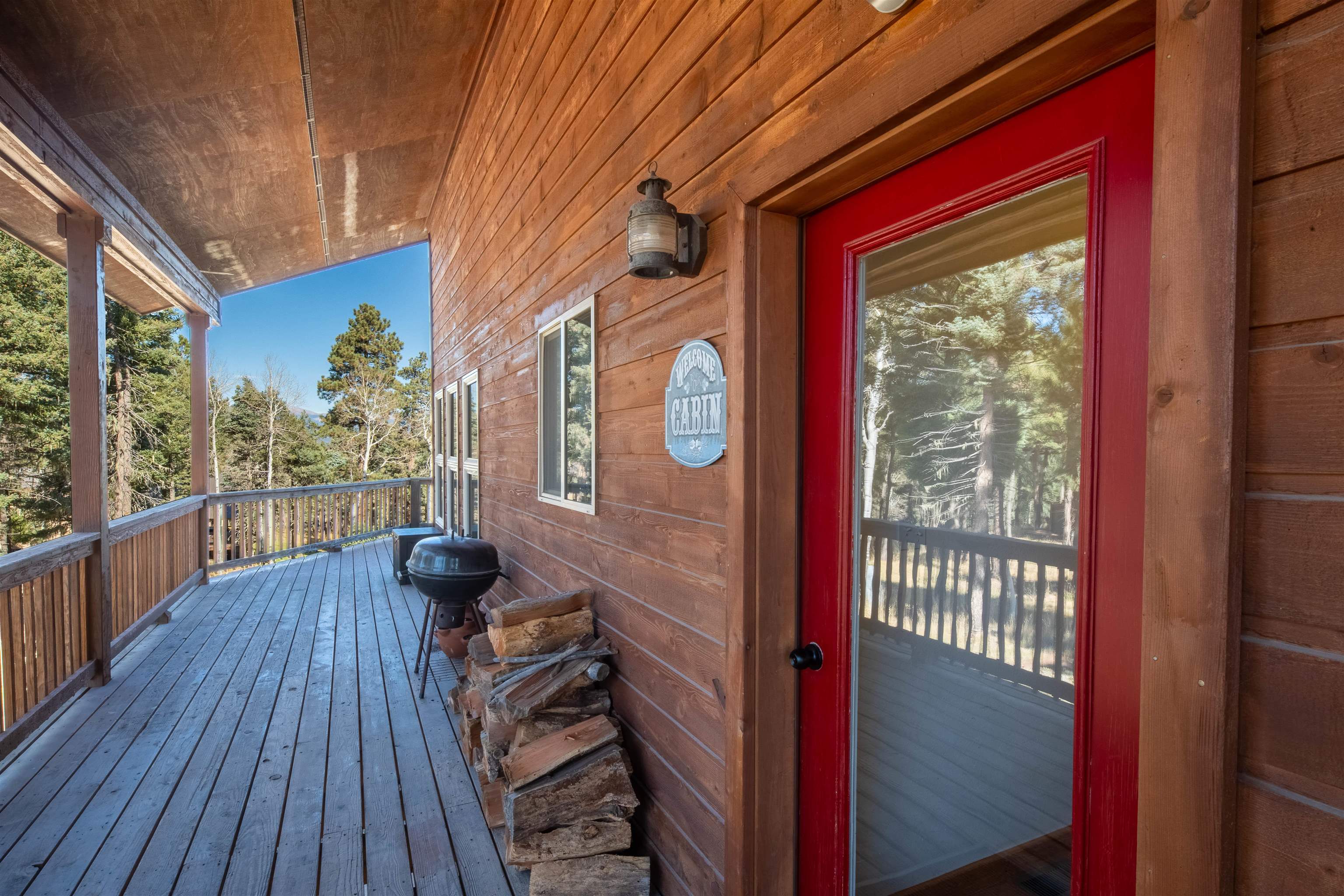 Discover this custom-built rustic retreat - a 4 bedroom, 3 bathroom chalet with Wheeler Peak views and exceptional attention to detail. With over 2,400 sq ft of living space, this home includes a fully equipped 500 sq ft studio apartment with private garage entry, offering the perfect guest quarters, owner’s suite, or rental opportunity. Step inside to soaring ceilings anchored by a dramatic BIS Ultima wood-burning fireplace, framed floor-to-ceiling Harristone stone wall. The oversized loft spans more than 400 sq ft and overlooks the living room and extends to a wall of windows, filling the home with light and mountain views. Solid oak hardwood floors, warm-toned tile with tumbled stone accents, and solid wood Southwestern-style doors bring rich texture and warmth throughout. Thoughtful upgrades include soundproof insulation in all interior walls and ceilings, energy-efficient design, and a cast-iron tub with colorful Mexican porcelain sink in the primary suite. Outdoor living is just as impressive with an expanded wrap-around deck (12’ wide instead of standard 8’) and a private balcony off the primary bedroom, perfect for taking in sunsets or watching elk and deer wander across the open space bordering two sides of the property. The circle driveway makes access easy year-round and provides extra parking. Additional highlights include a finished garage with electrical in place for future expansion, furniture with distinctive Southwest character, and the peace of knowing no additional neighbors will be building next door. A private, yet accessible location, abundant natural beauty, and thoughtful custom features make this home truly move-in ready and a standout value in Angel Fire. This is a short walk to Monte Verde Lake.
