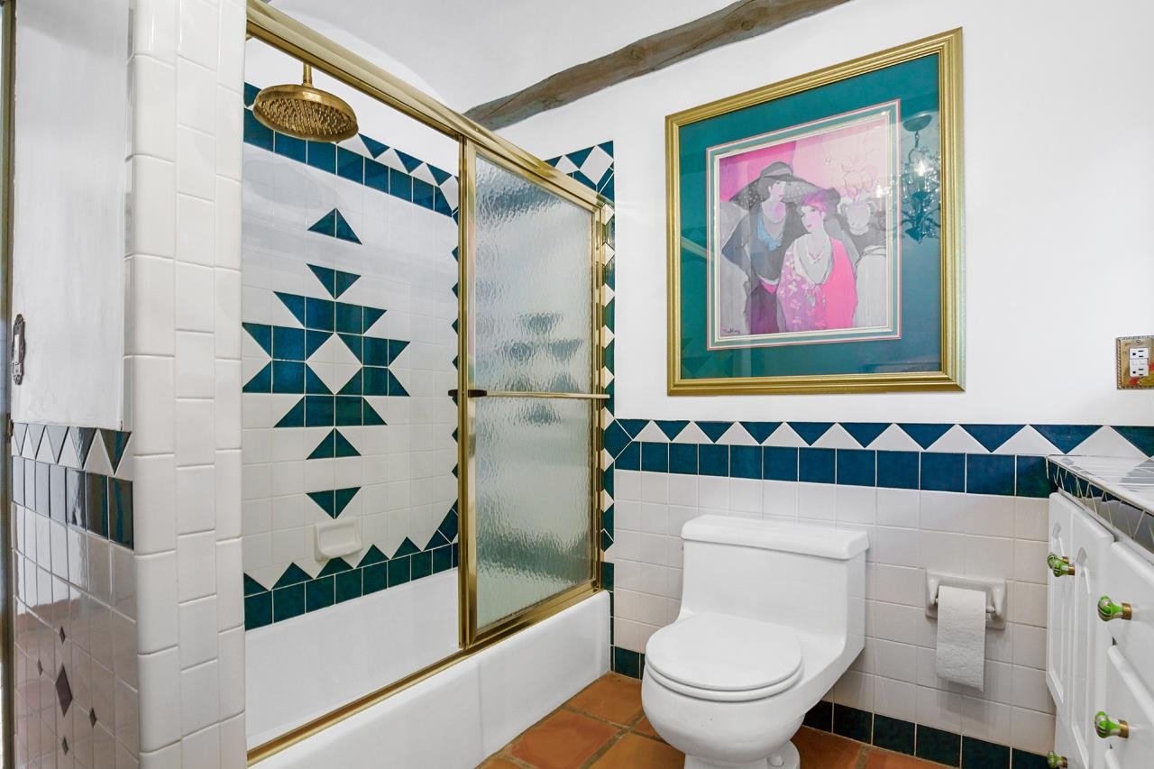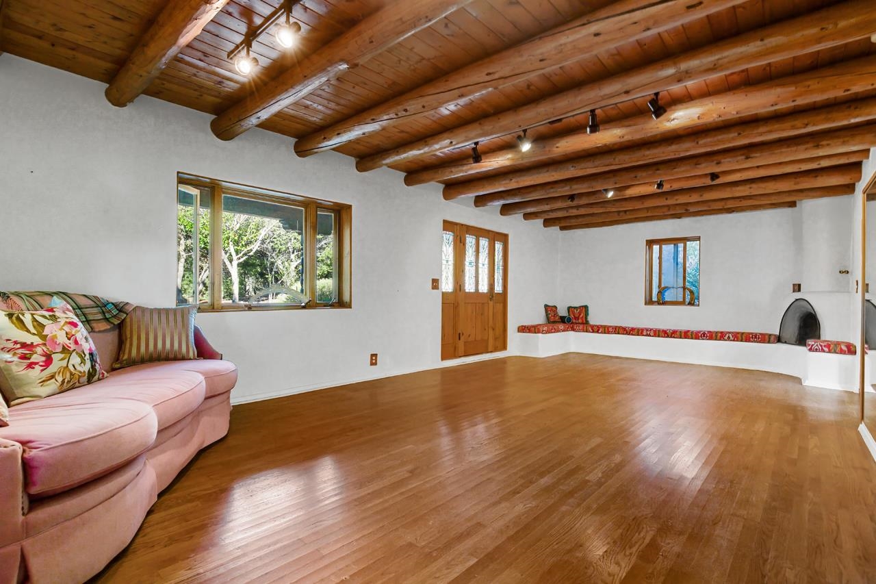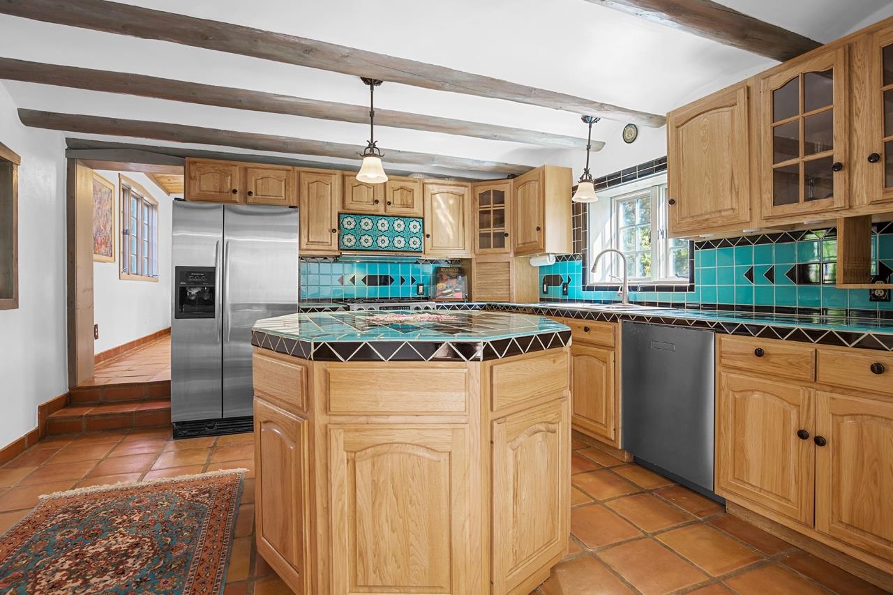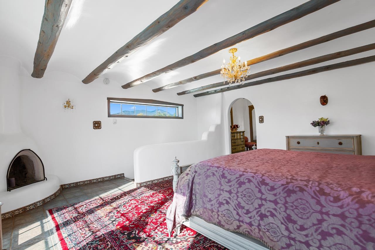Set amidst the pinon- juniper woodland of the Canon foothills, this beautiful two story, 2400 sq ft, 3 bed and 2 bath adobe home exudes another era – a time when craftsmanship and care reigned supreme. Warm Saltillo tile, rounded plaster walls, large light-filled, mullioned windows, coved ceilings, one-of-a-kind, hand-carved doors in every room, 3 kiva style fireplaces, elaborate tilework throughout - all this just 5 minutes from Taos Plaza. Secluded behind a heavy wooden gates this 1 acre compound comes with a detached dance studio, a 1-car garage and flag stone walkways that lead to terraced gardens. Built in 1975, this lovely home has been lovingly maintained and updated and expanded over the years. Walking down past a giant wisteria, you pass beds of roses and native perennials and then you enter through those dramatic unforgettable front doors with the intaglio images of a Matachine dancer over the classic Zia sun (carved by Mark Romero). The bright foyer with coved vigas leads to living room centered around a fireplace with nichos and a long banco. The murals on this floor by Taos artist Linda Kimmons. The guest wing with two spacious bedrooms is past the living room. Head In the other direction to get to the well-appointed kitchen where ample oak cabinets are wrapped around a tile clad island that will be the hang out spot of the home. Beyond is the dining room with its own kiva style fireplace and French doors leading out to the west facing patio where you can entertain al fresco to those famous Taos sunsets and colorful skies. Up a couple of steps from the kitchen is a library with built in shelves and another way to slip out to the southside gardens. Up the stairs with the elaborately carved balustrade you arrive at the 580 sq ft primary suite with windows facing werst and giving you views of el Pedernal and the Jemez mountains. The spacious bedroom leads to a dressing area and then to a sumptuous bath centered around a jetted tub and separate shower with windows looking over the valley below. Detached from the house is mirror-walled dance studio with a sprung-oak floor where the owner offered flamenco classes and recitals. And attached to that is the single car garage with lots of storage in back. Come take a look at this one of a kind, jewelbox of a home that takes you away from a life of bland.