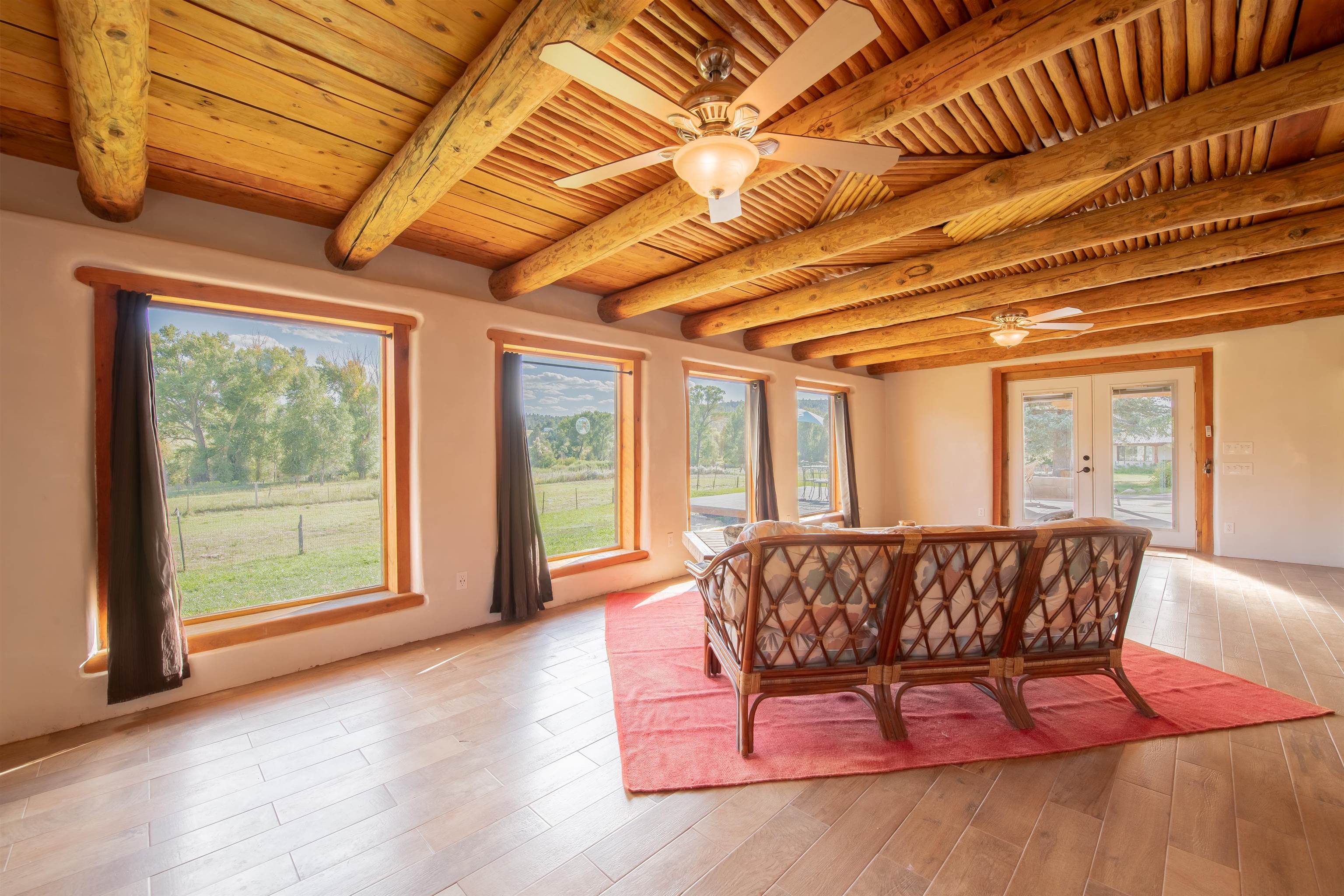 TWO HOMES - Welcome to the Sunrise and Sunset Homes. Nestled in the quaint Village of Vadito, NM, lies this rare 6+ acre property with two unique adobe homes, situated for peaceful pastural views that provide the full colorful spectrums of New Mexico sunrises and sunsets. The potential for organic farming, (soil has been free of herbicides and pesticides, nourished by only sheep and llama manure for owner’s 25 years), agricultural and livestock, a retreat or healing center, a family compound, and even rental income while living in one of the homes. The dark skies of this quiet location will leave you in awe of the brightness of the Milky Way, Orion, and all the constellations. Listen to the Rio Pueblo River which borders the south line of this property, alive with trout perfect for fly fishing and spot a heron on the shore catching breakfast. A river fed pond sits on the west side of the property awaiting your presence to share its views and quiet solitude. The property contains acequia water rights (6 acres), 3 water memberships available with the MDWCA that has been awarded annually in New Mexico for quality drinking water, two septic systems, a garage/ shop/ equipment building, a corral with 3 rooms and a hay barn that currently houses 2 llamas who produce manure second only to bat guano. The Sunset House boasts a kitchen that was recently refurbished with granite countertops, storage galore, soft close cabinets and a large kitchen island with seating space. There is new flooring throughout the living room, kitchen, and bathroom areas. The living room includes a wood burning stove and views of glorious sunsets framed by carved vigas and corbels. There is a 12’x 17’ greenhouse/sunroom/mudroom and also a 30’ x 10’ porch with storage attached. The Sunrise House is an 1864 circa custom updated adobe home with 2 separate living areas joined by a beautiful custom door. Either area could be perfect for caretaker or short-term renter. Local lore has it that Billy the Kid used to dance here when it was originally a dance hall! Ground floor living area has a gorgeous caramel- colored ceiling with vigas and latillas designed with a centerpiece Ojo de Dios. Four large windows in the great room look towards the fields and river to view and inhale mother nature’s beauty. Walk out from this great room to a 21’ x 20’ covered patio with attached composite 16’ x 20’ deck for those lovely morning/evening coffee, tea or cocktail times. Attached to this home is a 13' x 40' storage area. Could be converted to a carport, etc. This property is located approximately 18 miles SE of historic towns Ranchos de Taos and Taos, New Mexico and at approximately 7,500 ft elevation with a seasonal view of the 13,000 ft Jicarita Peak (a mountain held sacred by the local Picuris Pueblo people). The property produces a synergistic ecosystem and wildlife habitat for flowers, grasses, llamas, hawks and eagles among other wild birds. Sometimes you even get a visit from a buffalo or two! Located within 60 to 70 miles of six ski resorts, namely Sipapu (8 miles), Taos Ski Valley, Angel Fire, Red River, Ski Santa Fe, and Pajarito Ski Valley; supplying an outstanding selection of diverse activities for people of all ages and abilities. A RARE PROPERTY AVAILABLE FOR SALE! Please schedule your viewing today. **Buffalo not included**