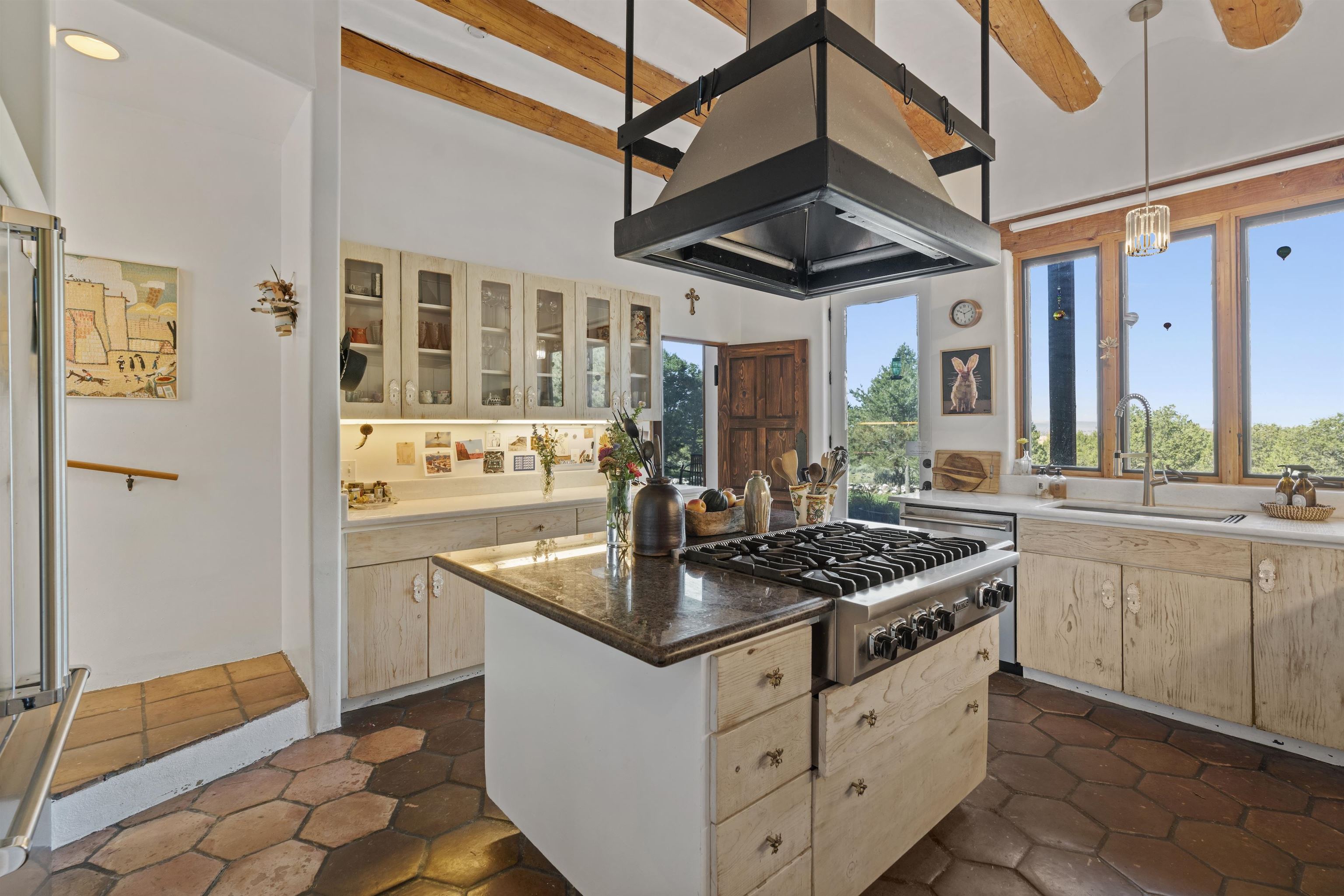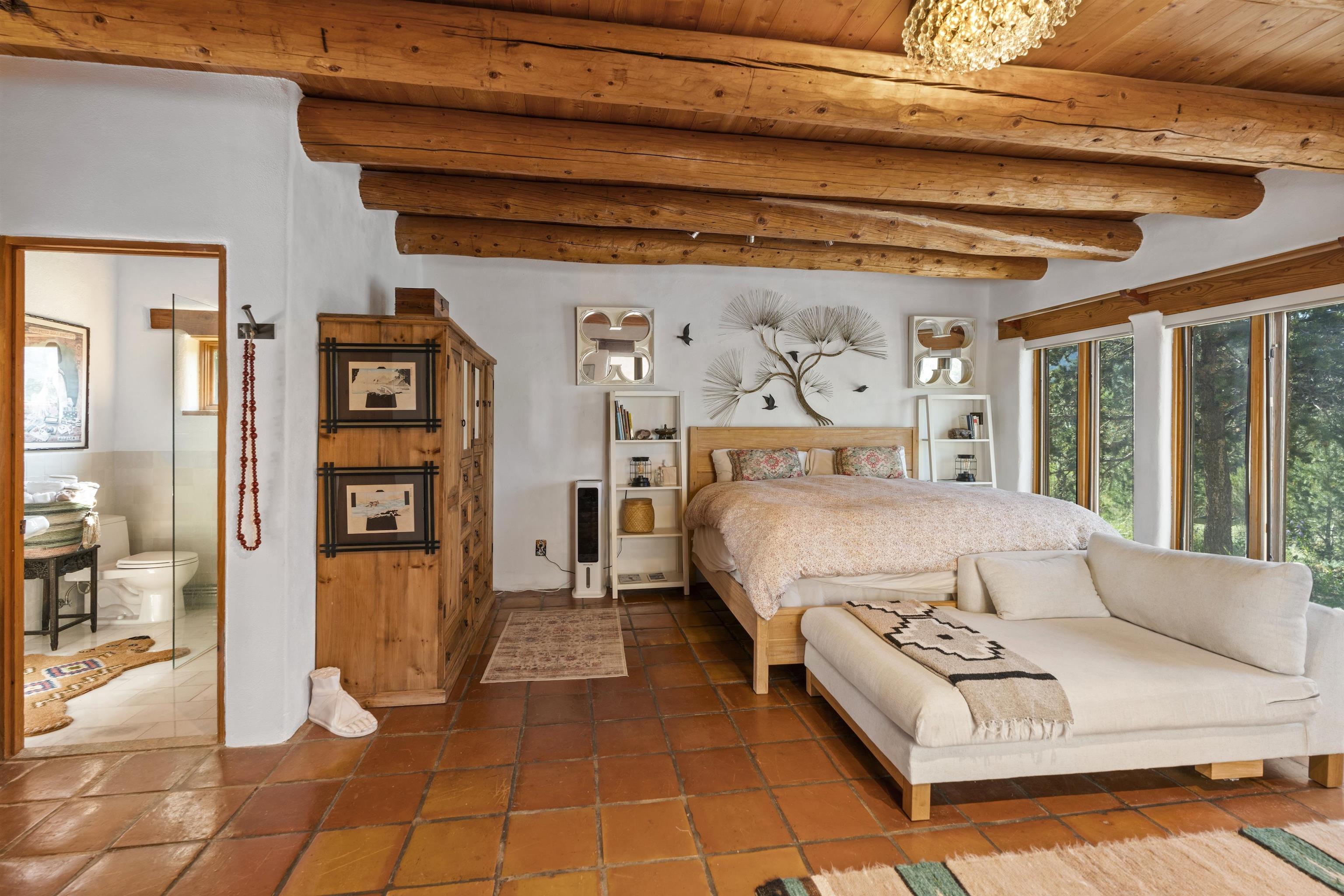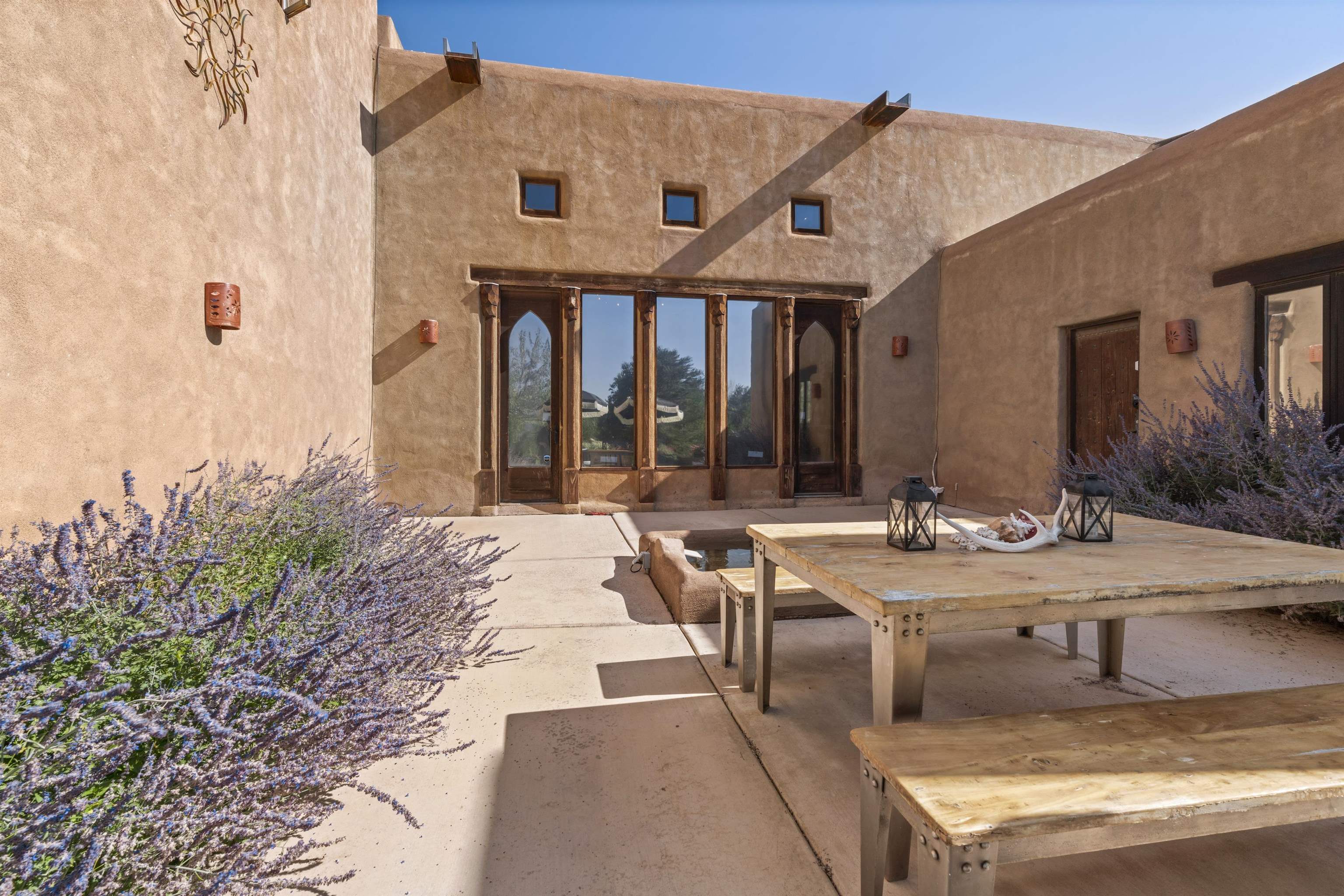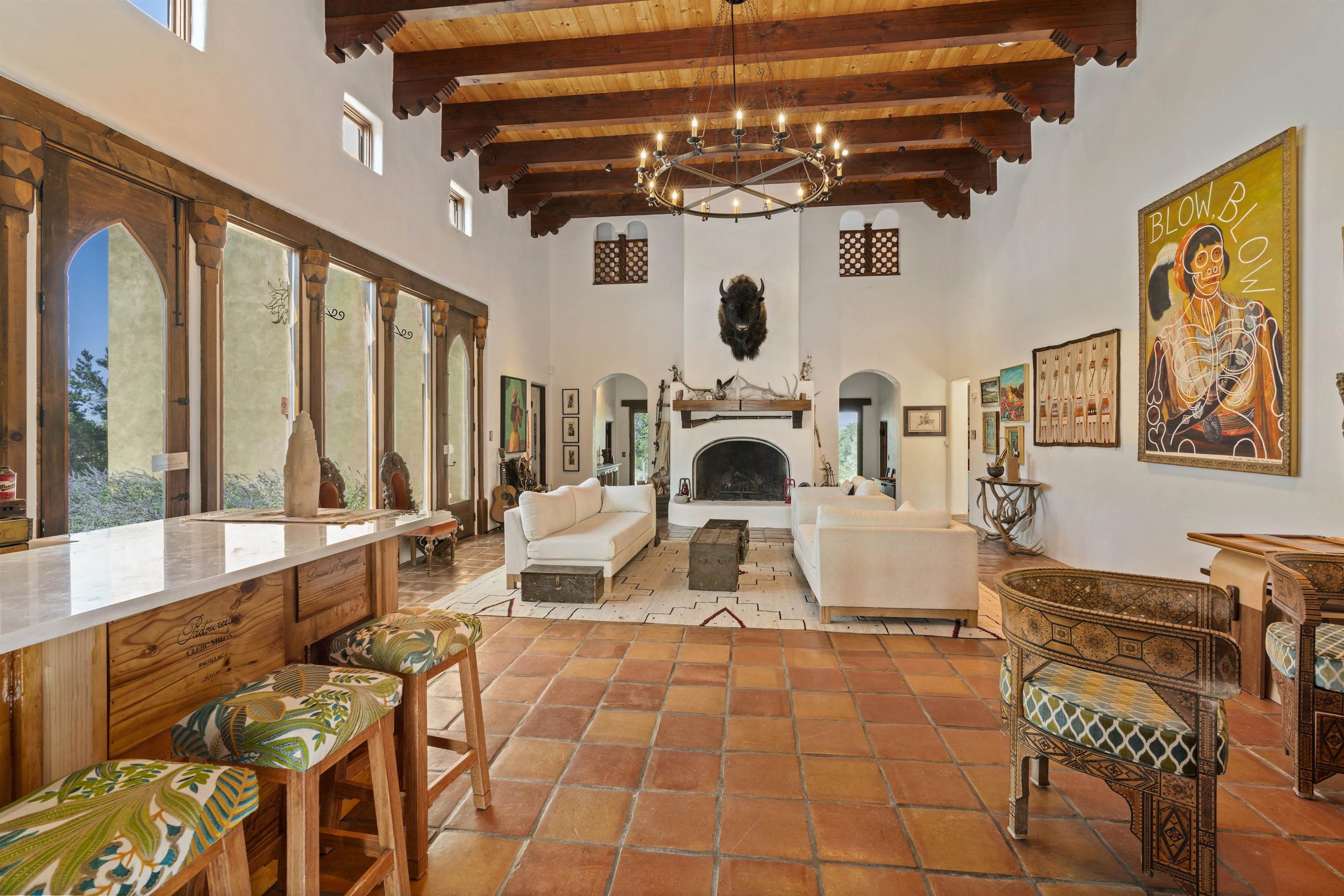 Perfect for refined hosting and elevated entertaining, this exceptional estate offers a rare blend of timeless design, global influence, and contemporary luxury. Crafted for those who value architectural artistry and effortless hospitality, the residence unfolds with thoughtful flow, generous gathering spaces, and sophisticated indoor and outdoor living. Each room opens like its own chapter. Distinct, intentional, and seamlessly connected to create a refined sense of livability and design. A timeless piece of Taos, New Mexico real estate, this 5-bedroom, 5-bathroom estate is haute couture in architectural form. A blend of classic Southwest character, Middle Eastern influence, and modern elegance, the home feels both storied and contemporary. Exquisite woodwork and one-of-a-kind doors anchor the estate with craftsmanship rarely seen today. A full, high-end renovation elevates the entire second floor as well as the lower pool suite, pairing luxury finishes with thoughtful spatial design. Every bathroom has been re-imagined to maximize comfort, serenity, and elevated hospitality. Designed for seamless entertaining, the sophisticated working chef’s kitchen opens into a grand dining room with soaring ceilings and an adjacent, beautifully appointed library. Two primary suites, one on each level, offer flexibility and privacy. From the upstairs porch, enjoy sweeping views of the town of Taos and the striking profile of the El Salto cliffs. Originally built by Ambassador Bill Eagleton, a career diplomat to numerous Middle Eastern nations, the residence carries an international pedigree matched by its exceptional design. With over 4,300 square feet of interior living and more than 3,100 square feet of outdoor patios, portals, and porches, the home is ideally suited for both intimate gatherings and large celebrations. The expansive great room opens onto a meticulously maintained patio featuring a 41-foot heated lap pool and in-ground hot tub. Lush gardens on drip irrigation create a private oasis of blooms, shade, and outdoor living. Set on 3 acres, the property also includes a peach orchard and thriving blackberry and raspberry patches just off the kitchen terrace. Six fireplaces, dramatic vaulted ceilings, generous art walls, and cozy architectural nooks complete the experience. An estate that feels both grand and deeply livable. A rare opportunity to own a truly singular oasis in the heart of magical Taos.