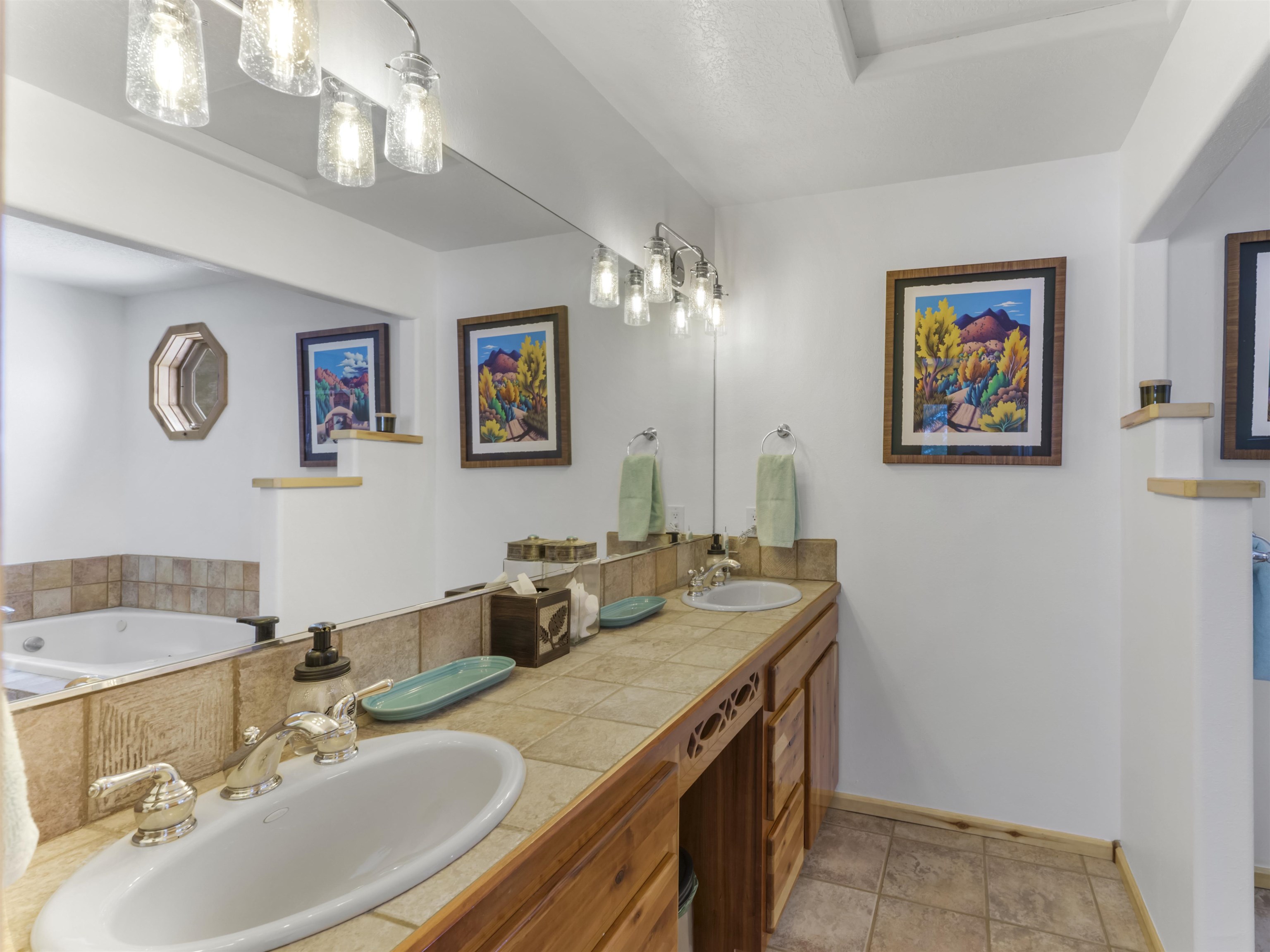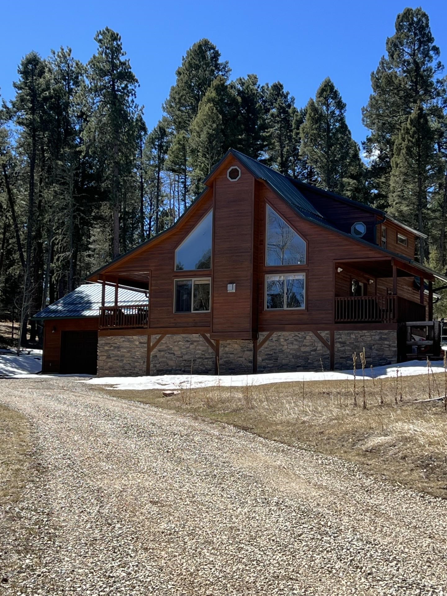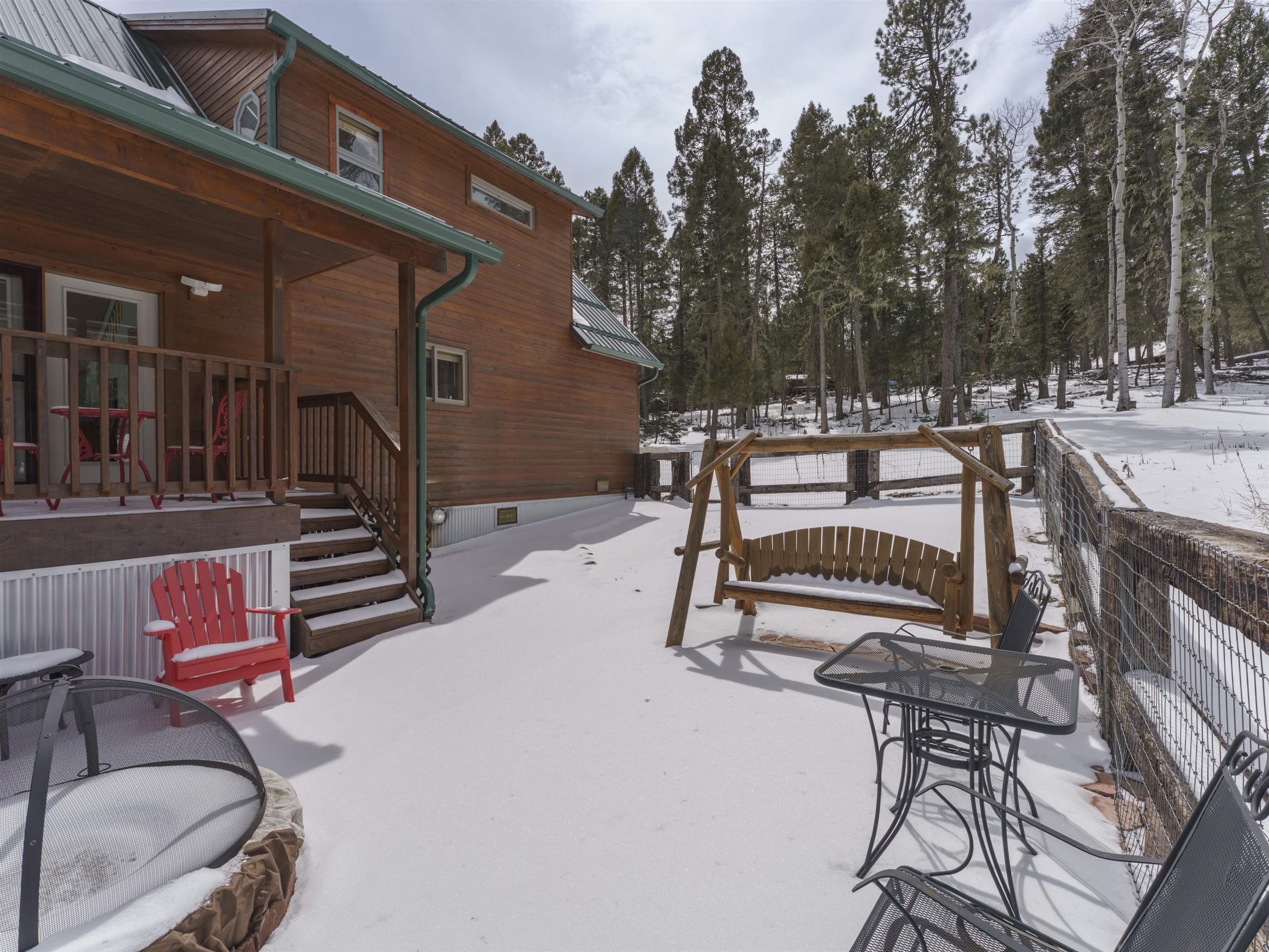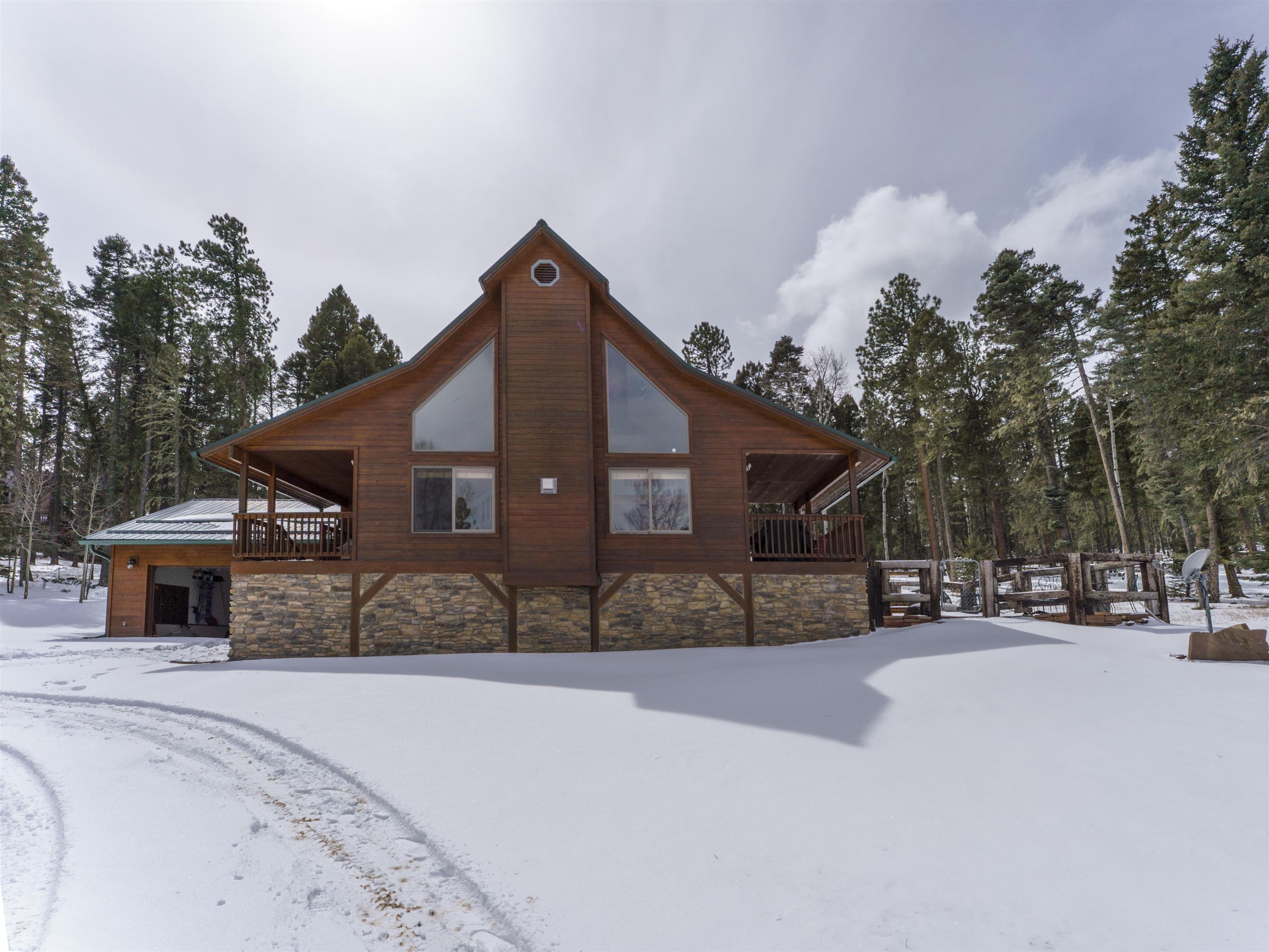 This beautiful mountain home sits perched on three combined lots. The large living room features great views, plenty of natural light, vaulted ceilings, and a cozy southwest style fireplace. Open living concept with a designated dining area offering plenty of seating, plus glass doors leading to a covered deck. Outside you will find a fenced yard with a firepit and room for pets. Surrounded by dense forest the outdoor spaces are perfect for viewing wildlife. Enjoy a well-equipped kitchen with custom cabinetry, suitable counter space and ample storage. Upgrades and improvements include new central heating, new roof, new flooring, new lighting, newer septic system, and new furniture. Bonus features include fiber-optic internet, a separate laundry room and a spacious garage with a separate storage area. Angel Fire Ski Resort, a PGA rated golf-course and a trout-stocked lake are just minutes away as well as other resort amenities included in your resort membership package.