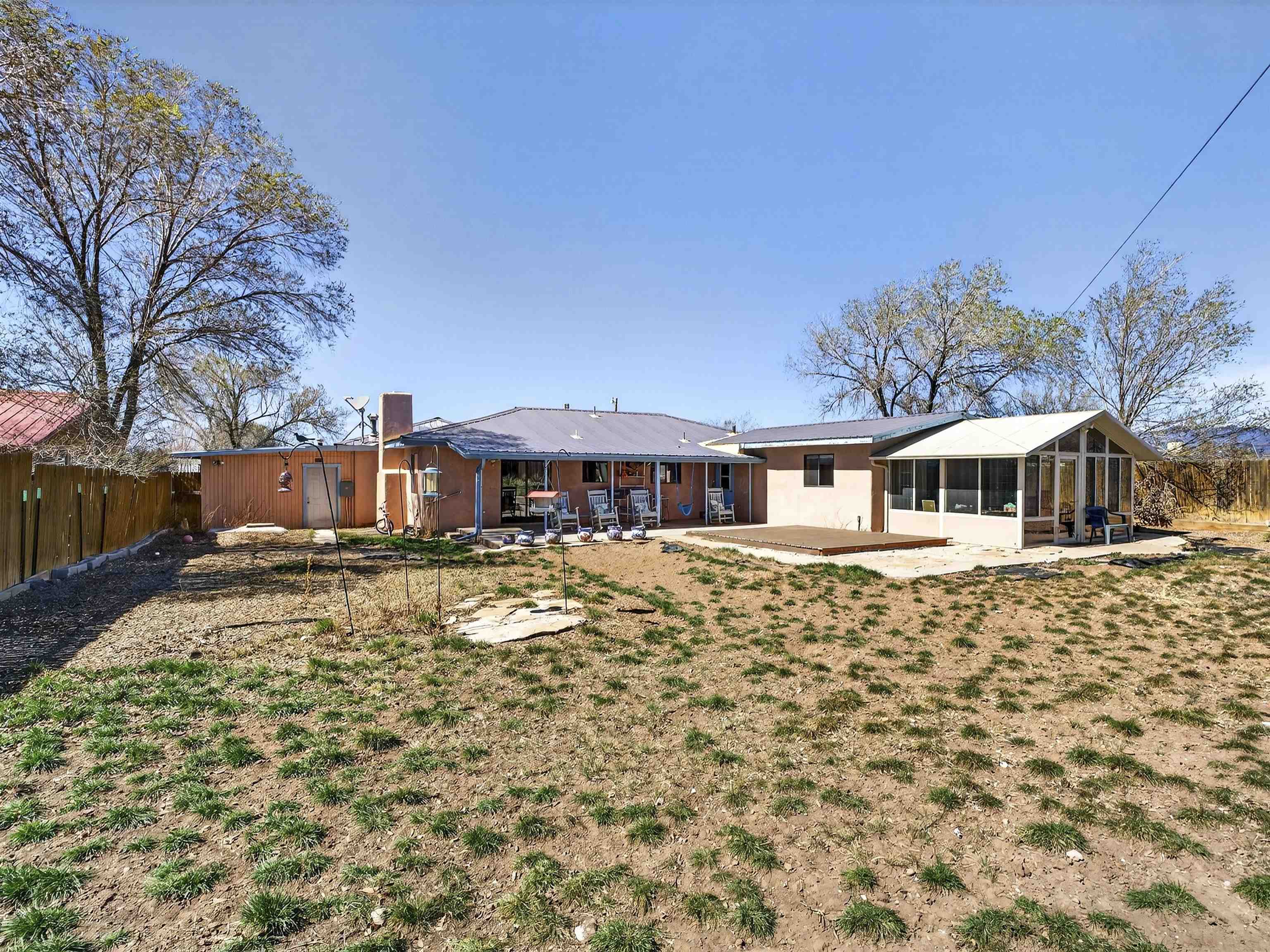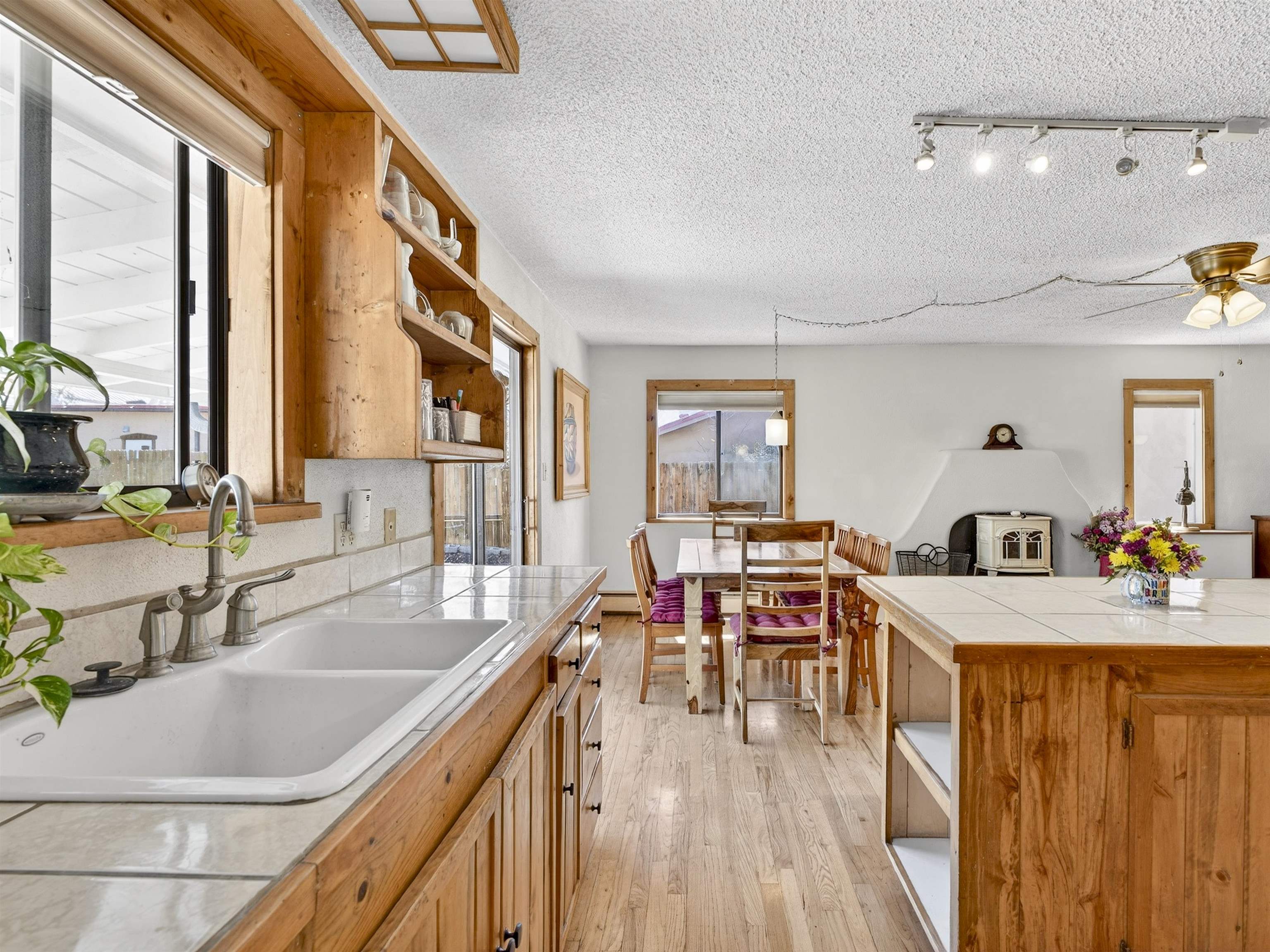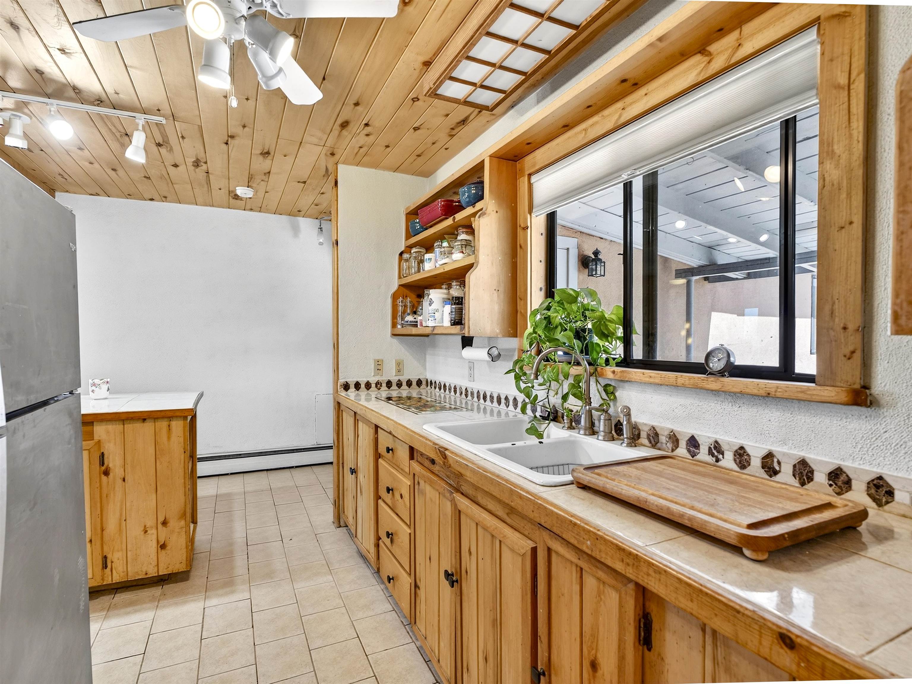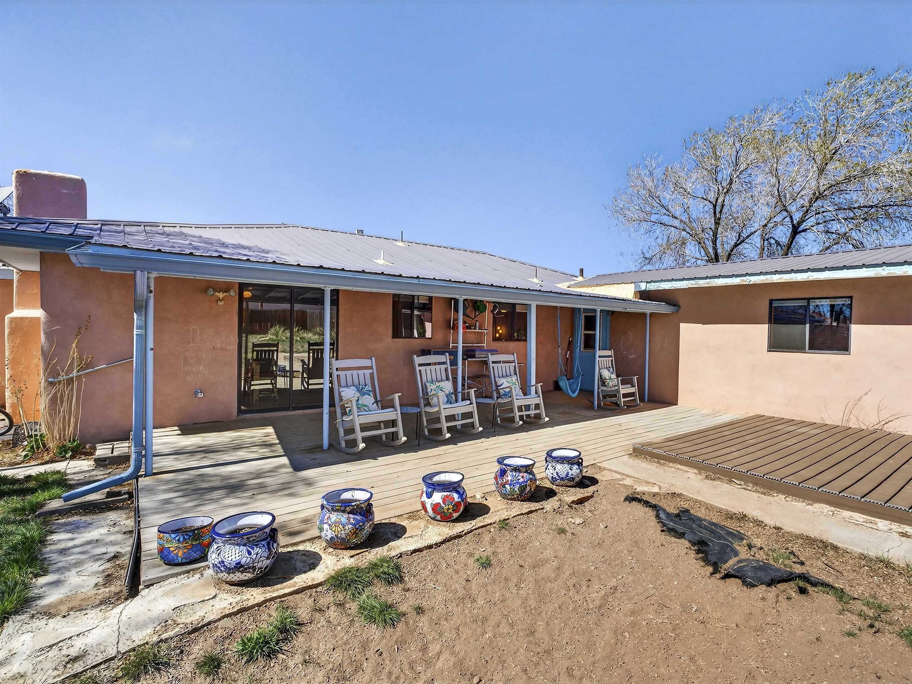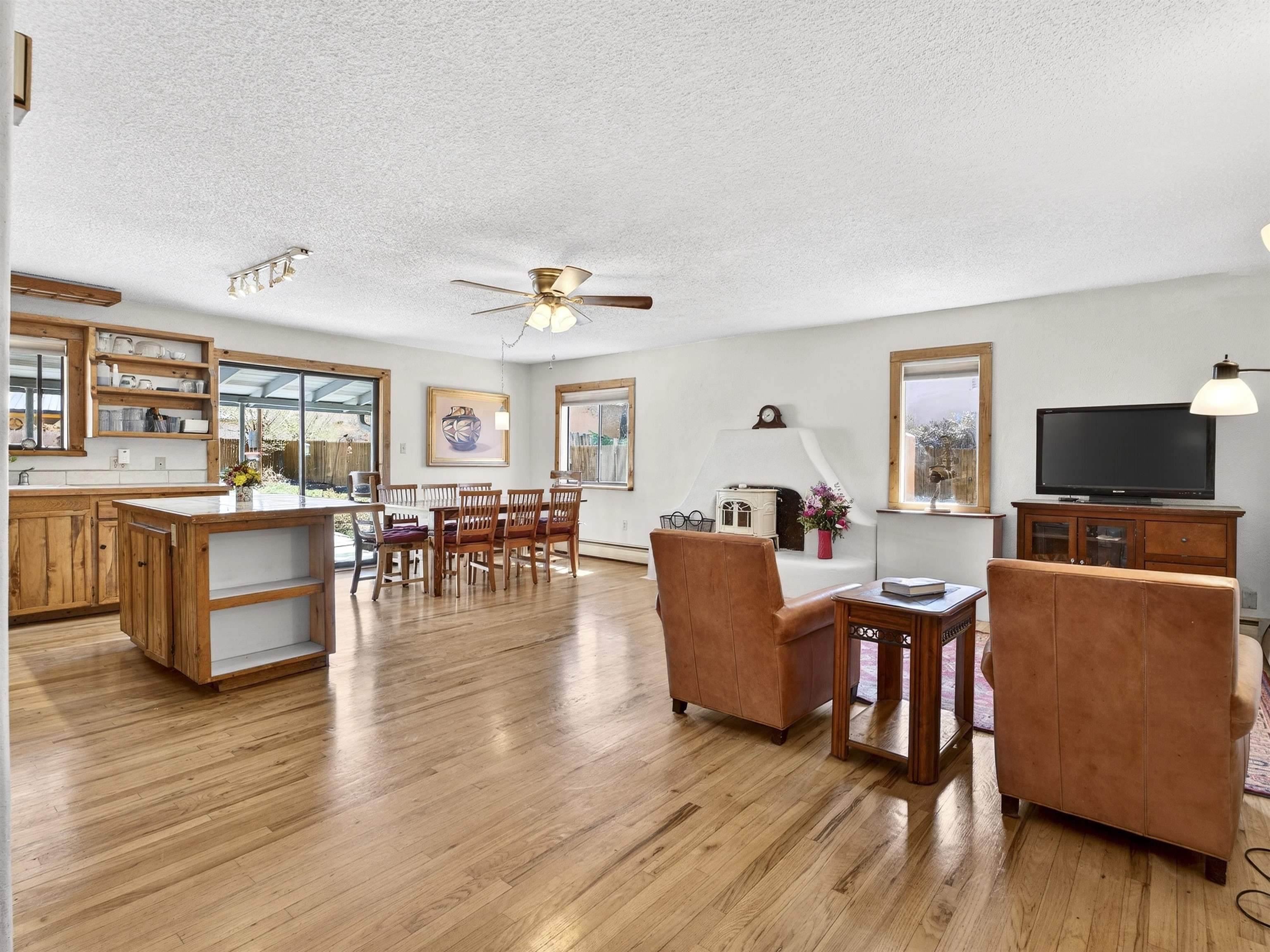 711 Cavalry Court, Taos, NM Centrally located on a quiet .31-acre cul-de-sac lot, this 4-bedroom, 3-bathroom home offers 2,163 sq. ft. of versatile living space with mountain views and a spacious fenced yard. Originally designed as a duplex, the functional layout provides excellent flexibility for multi-generational living, work-from-home professions, or a simple conversion back to a dual-rental investment. The main living area features a wood-burning stove and an open-concept flow between the living, dining, and kitchen areas. The unique kitchen setup is divided into two connected spaces, both featuring islands with breakfast bars, double sinks, and ample storage. Additional features include a primary suite with an ensuite bathroom and large enclosed sunroom, a second living area with a full bathroom nearby, and covered patios perfect for outdoor entertaining.