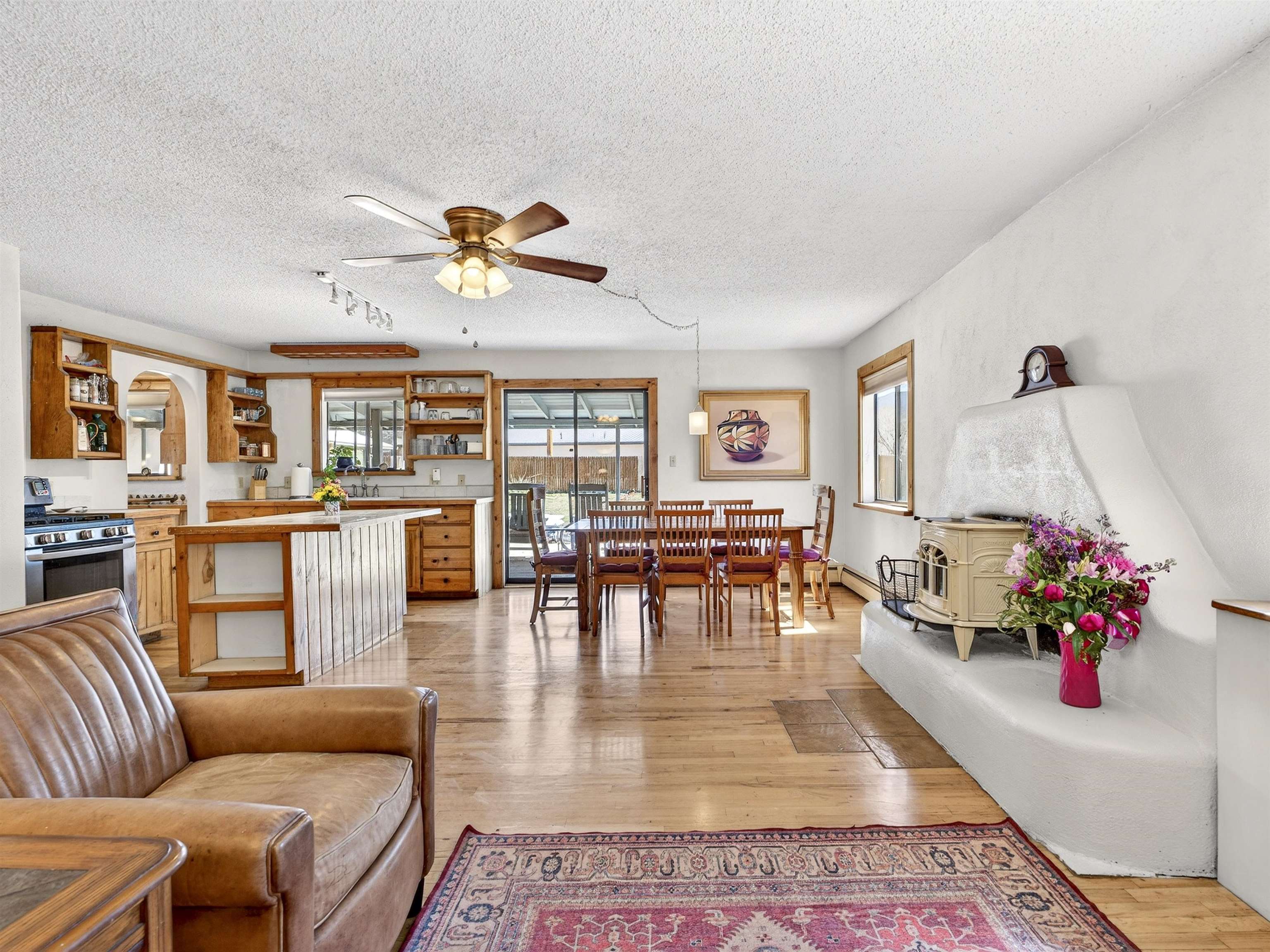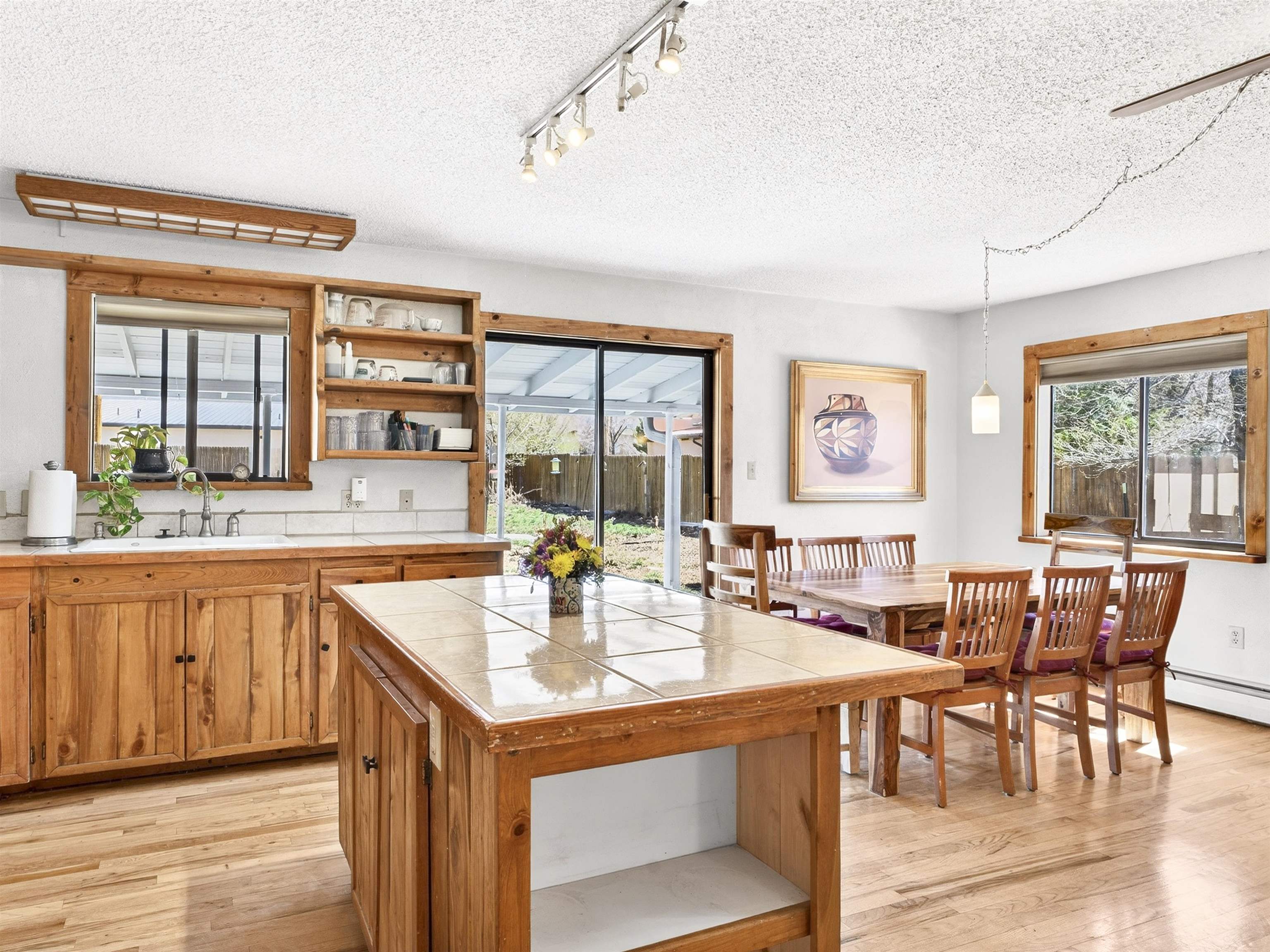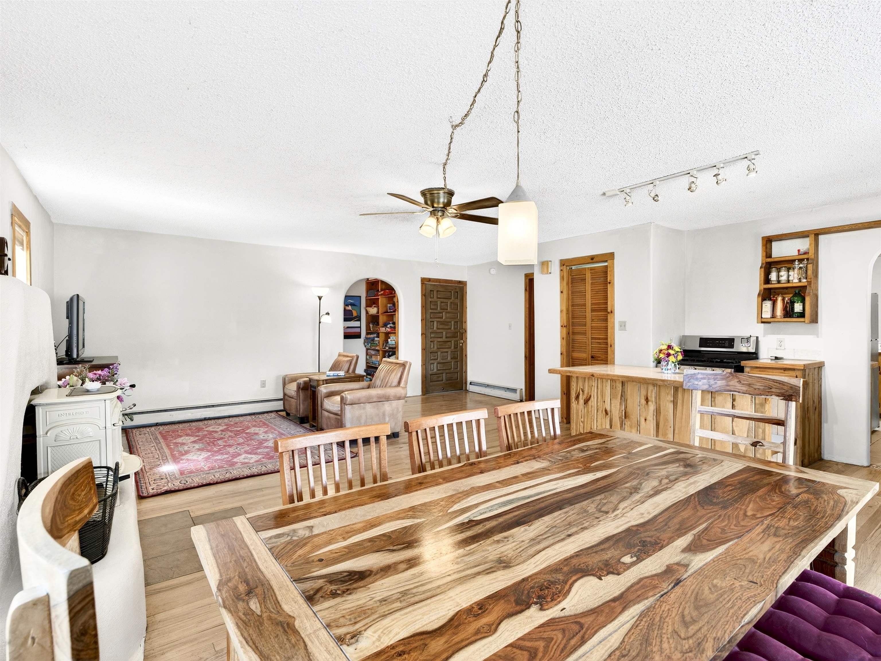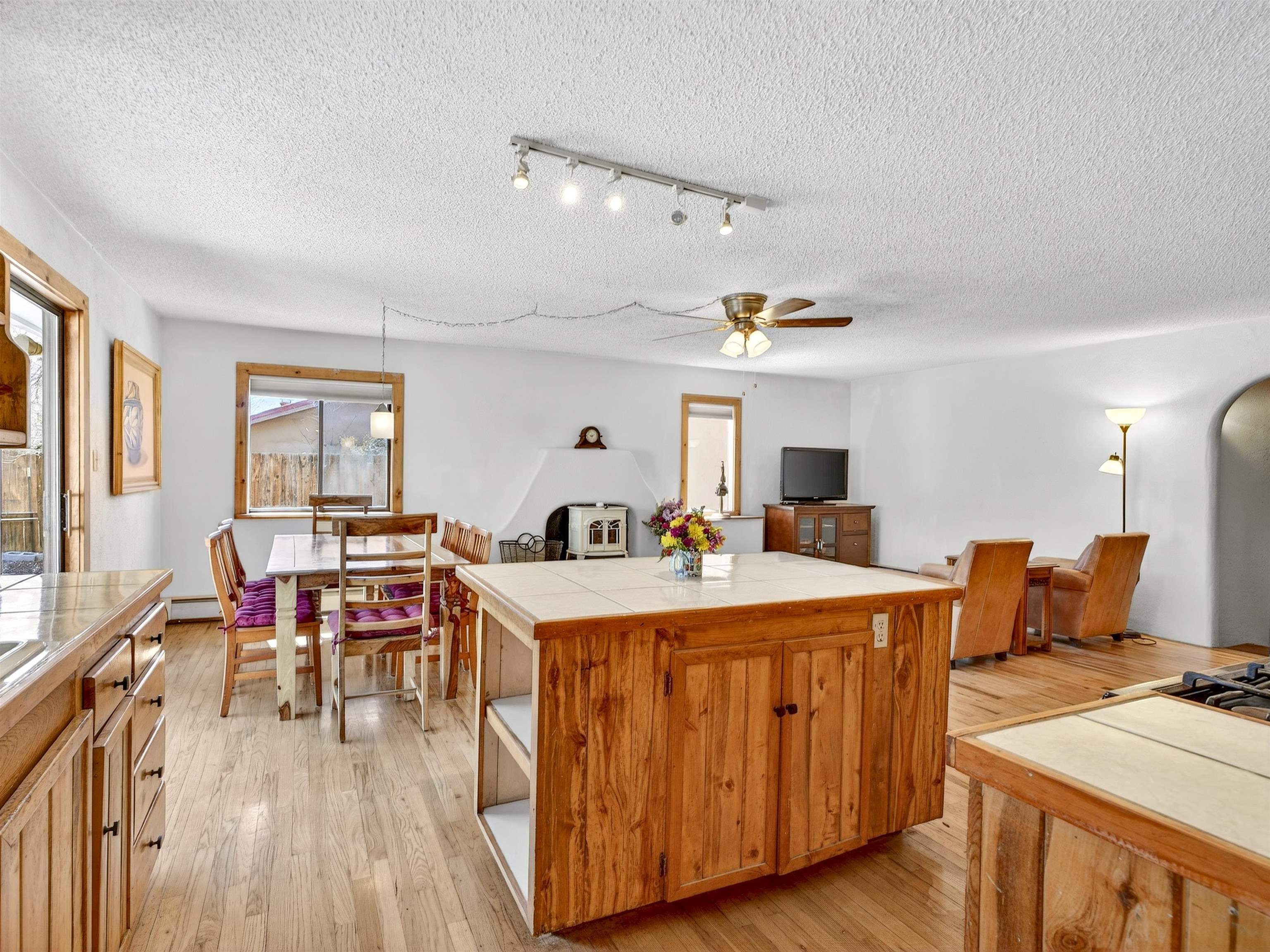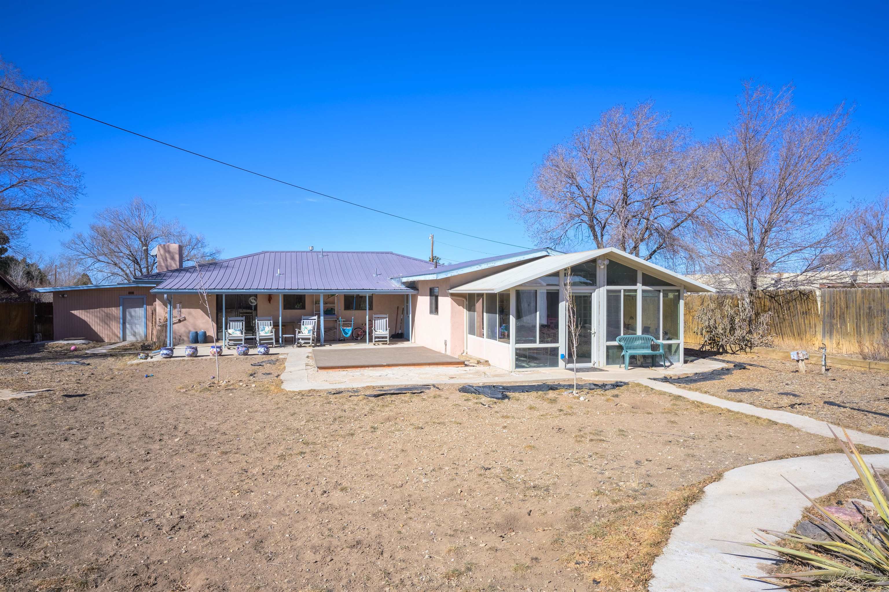 711 Cavalry Court, Taos, NM Centrally located on a quiet .31-acre cul-de-sac lot, this 4-bedroom, 3-bathroom home offers 2,163 sq. ft. of versatile living space with mountain views and a spacious fenced yard. Originally designed as a duplex, the functional layout provides excellent flexibility for multi-generational living, work-from-home professions, or a simple conversion back to a dual-rental investment. The main living area features a wood-burning stove and an open-concept flow between the living, dining, and kitchen areas. The unique kitchen setup is divided into two connected spaces, both featuring islands with breakfast bars, double sinks, and ample storage. Additional features include a primary suite with an ensuite bathroom and large enclosed sunroom, a second living area with a full bathroom nearby, and covered patios perfect for outdoor entertaining.