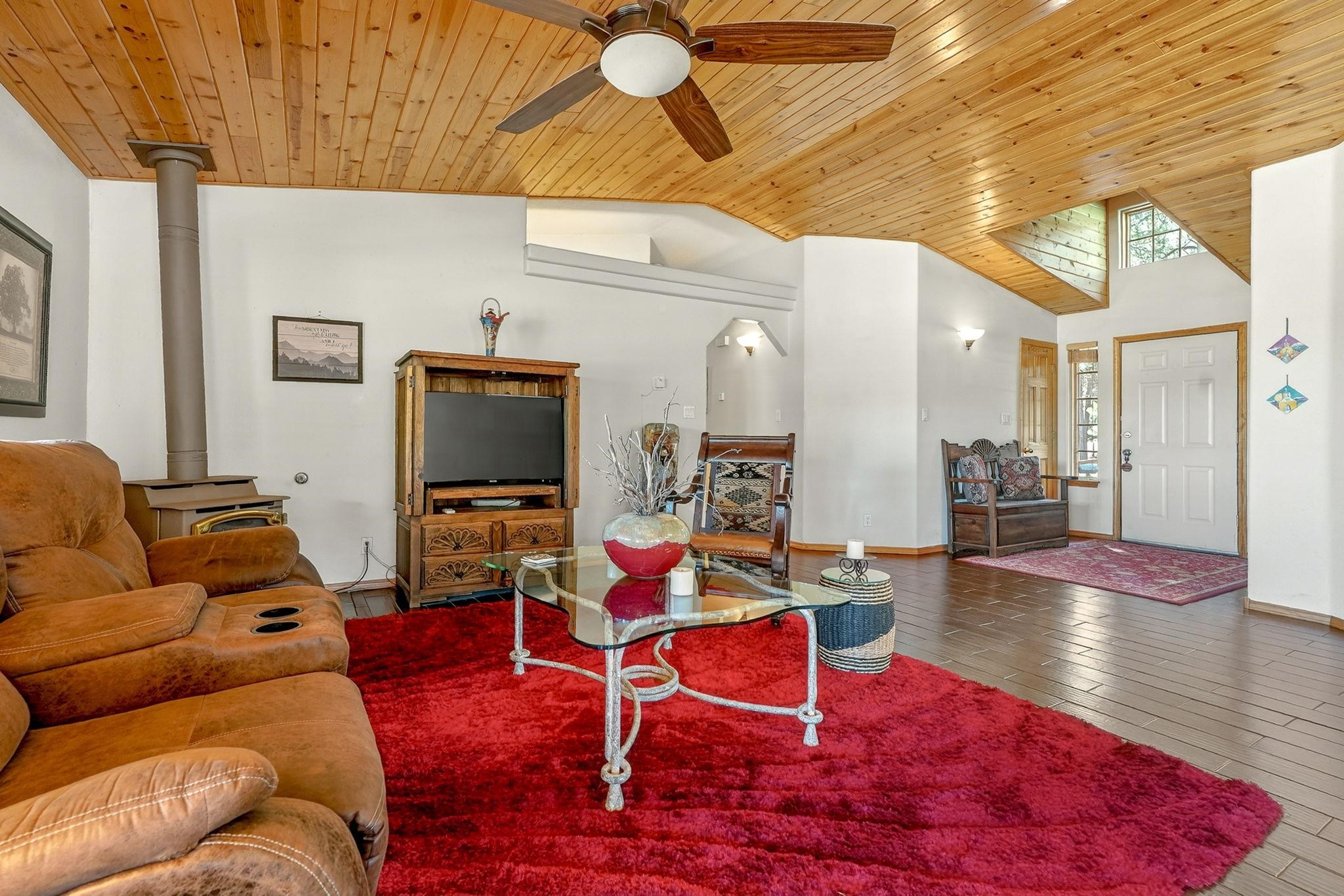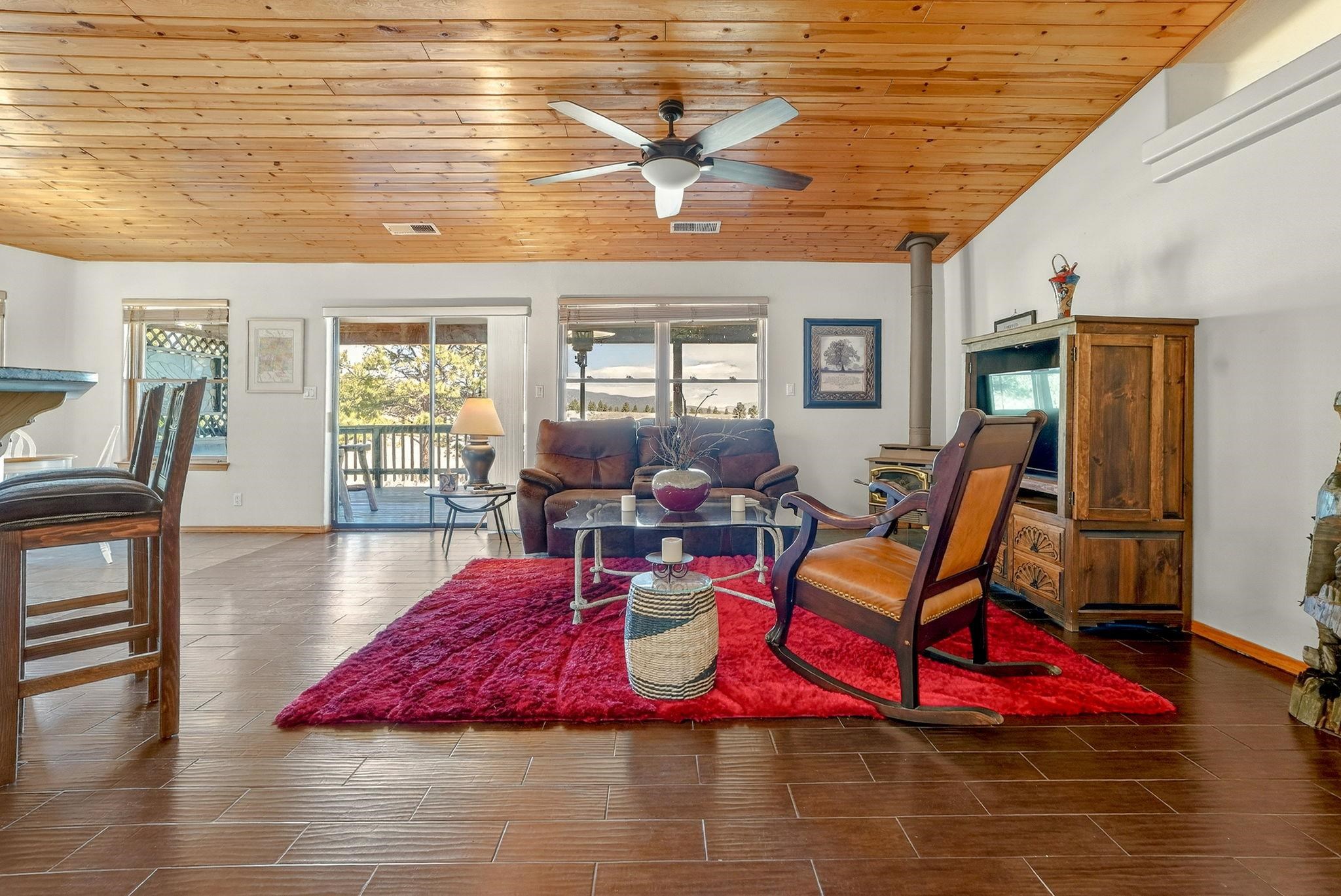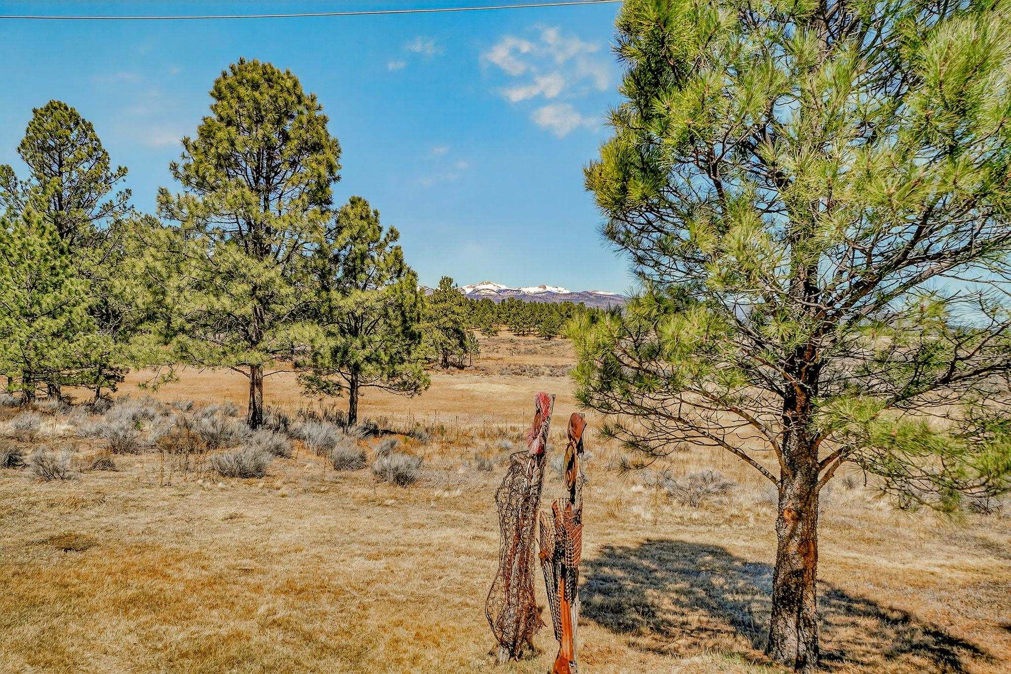 Enjoy mountain living in this turn-key 3-bedroom, 2-bath home with BIG views. Set on a treed lot with two sides bordering greenbelt and nearby hiking trails, this property offers a rare blend of privacy and easy access to outdoor recreation. The single-level layout provides comfortable, easy living with an open-concept main area, warm wood accents, and a tongue-and-groove ceiling that adds classic mountain character. Large windows and a covered deck showcase sweeping views of Wheeler Peak, Touch Me Not, and Baldy Mountain, perfect for relaxing or entertaining. The spacious primary suite features a walk-in closet and ensuite bath, while two additional bedrooms offer flexibility for guests or family. An attached two-car garage provides ample space for vehicles and mountain gear. Just minutes from the center of town and Angel Fire Resort, this home is well-suited as a full-time residence, vacation getaway, or investment property.