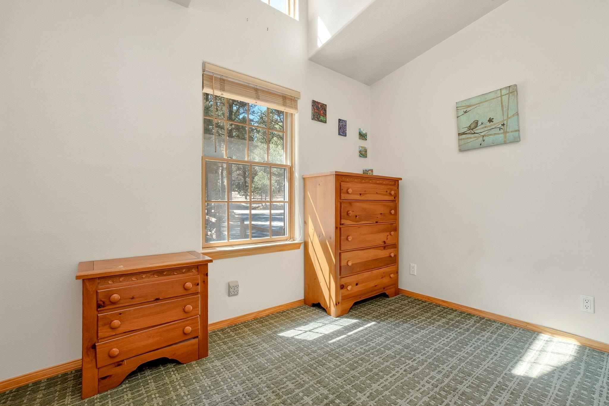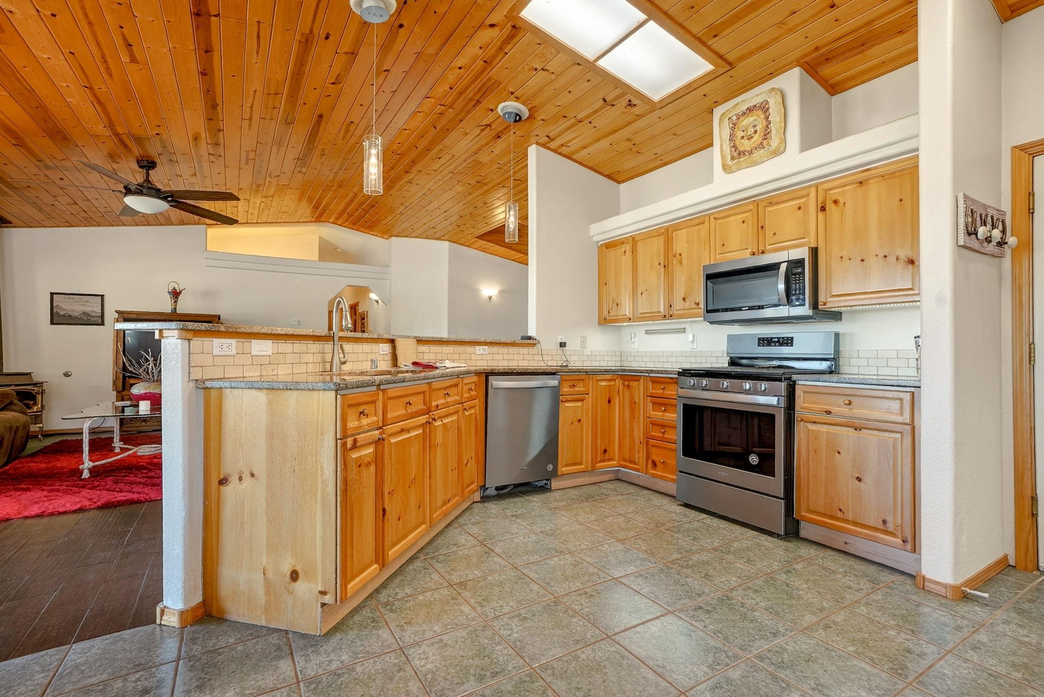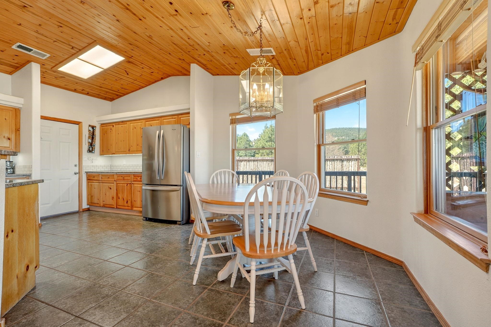 Enjoy mountain living in this turn-key 3-bedroom, 2-bath home with BIG views. Set on a treed lot with two sides bordering greenbelt and nearby hiking trails, this property offers a rare blend of privacy and easy access to outdoor recreation. The single-level layout provides comfortable, easy living with an open-concept main area, warm wood accents, and a tongue-and-groove ceiling that adds classic mountain character. Large windows and a covered deck showcase sweeping views of Wheeler Peak, Touch Me Not, and Baldy Mountain, perfect for relaxing or entertaining. The spacious primary suite features a walk-in closet and ensuite bath, while two additional bedrooms offer flexibility for guests or family. An attached two-car garage provides ample space for vehicles and mountain gear. Just minutes from the center of town and Angel Fire Resort, this home is well-suited as a full-time residence, vacation getaway, or investment property.