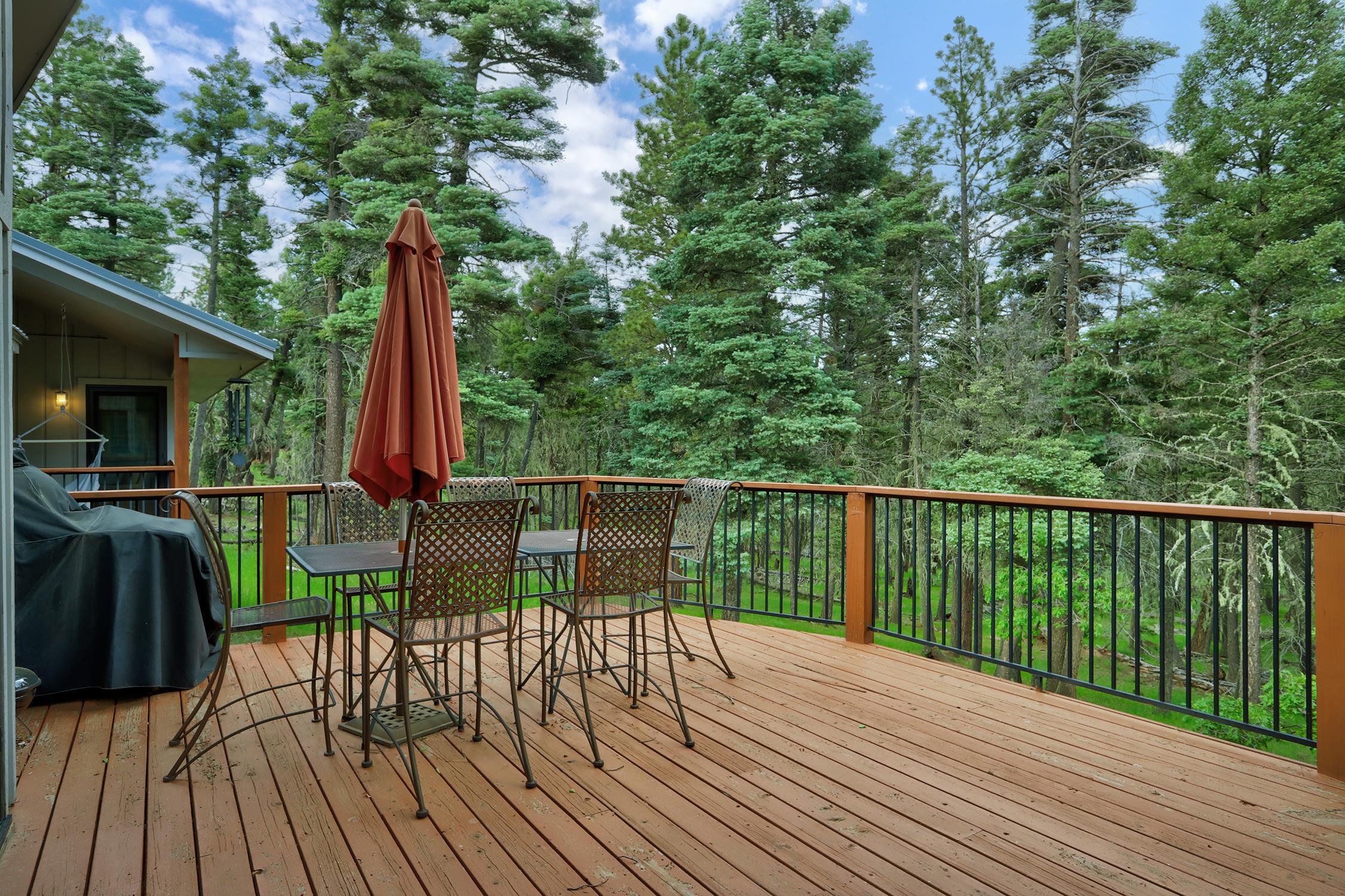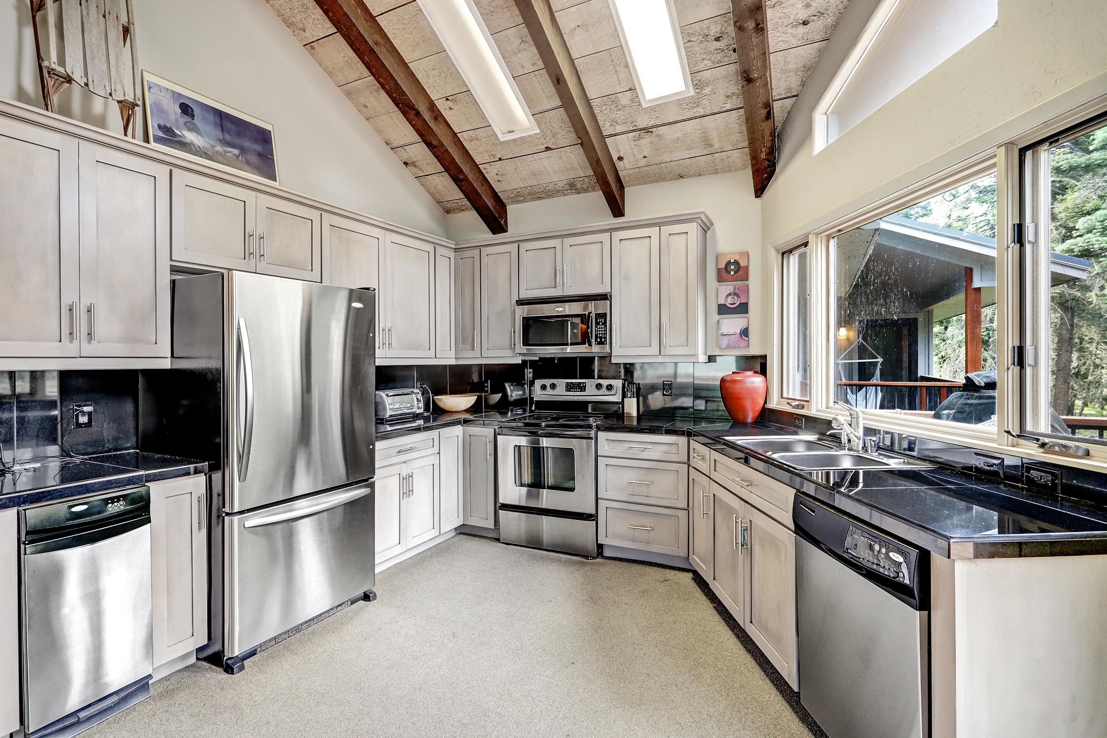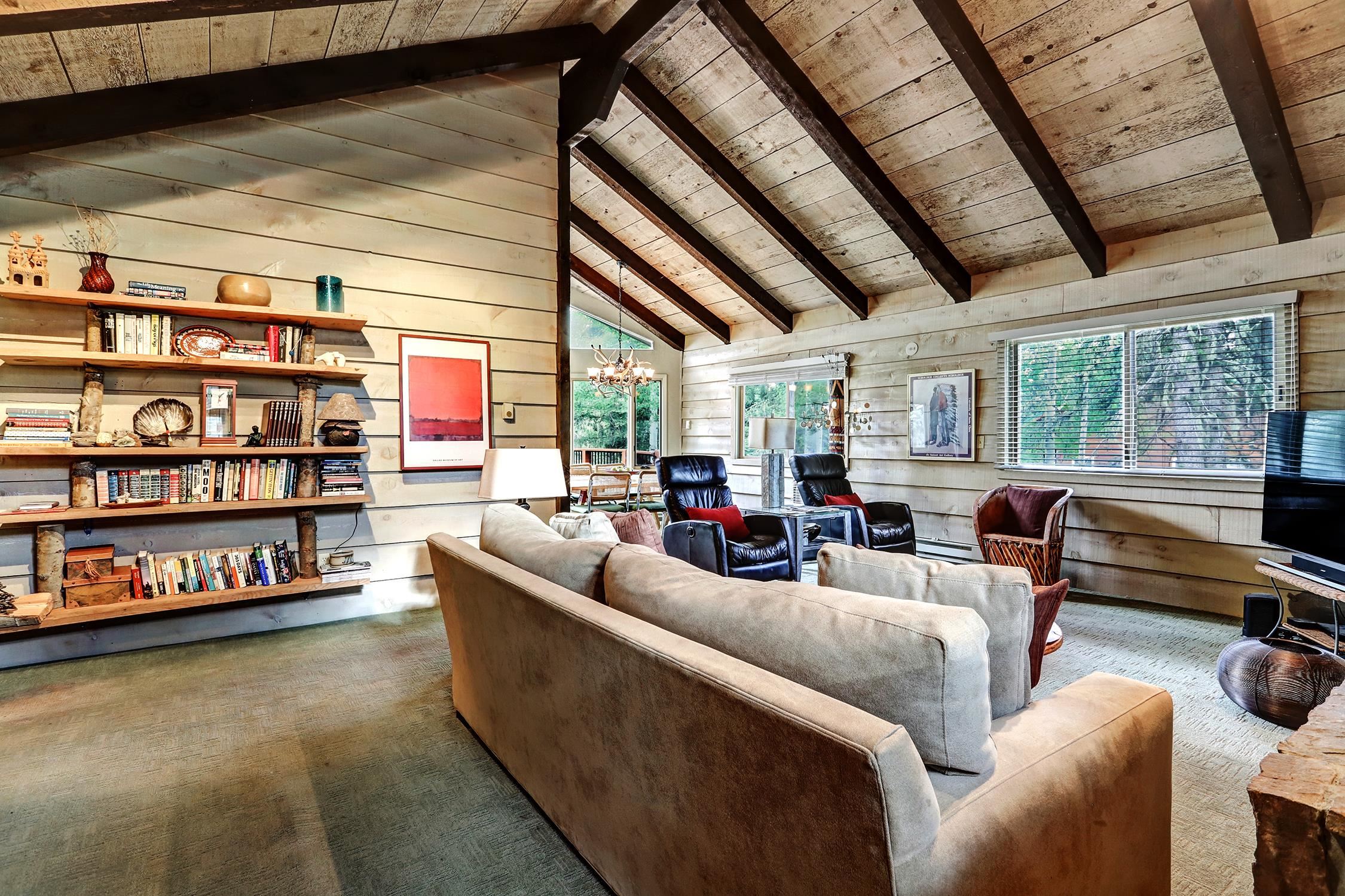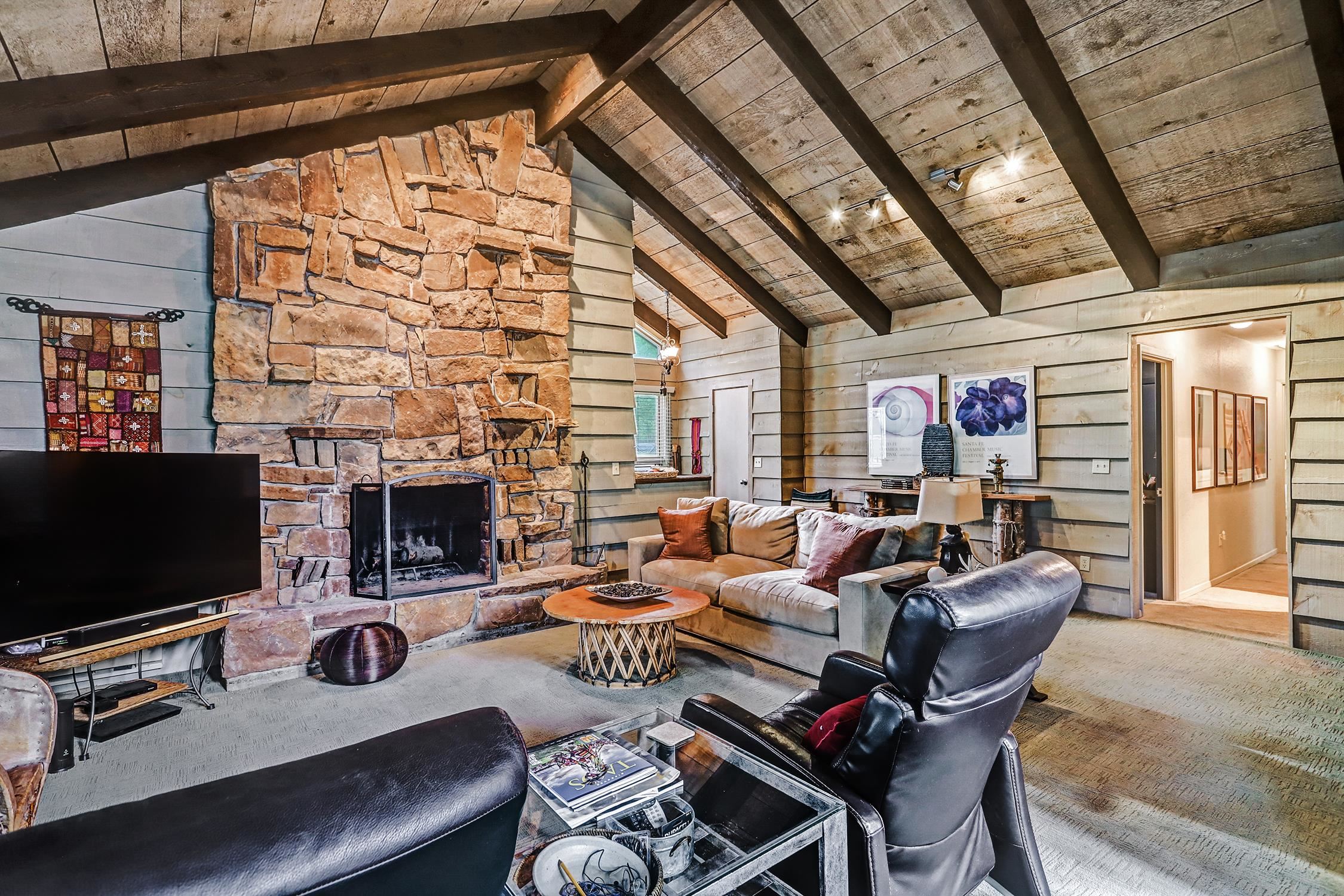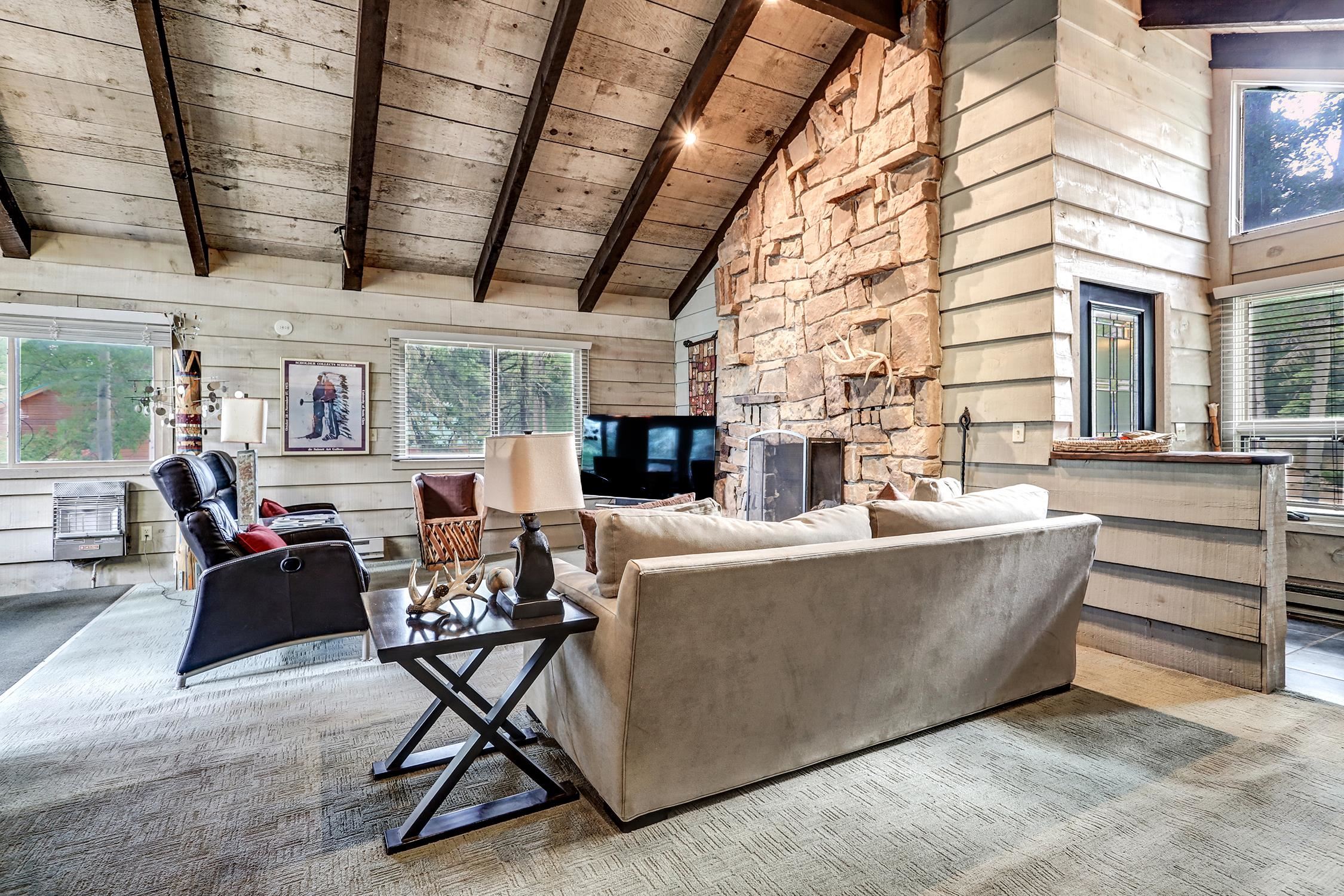 Charming Single-Story Mountain Retreat with Flat Circular Driveway This inviting single-story home offers the perfect mountain getaway, with easy year-round access via a flat, circular driveway. Step inside and you'll be welcomed by a spacious living room featuring vaulted ceilings and a stunning rock fireplace—perfect for cozy winter days. The open-concept kitchen and dining area provide ample space for entertaining family and friends. From the kitchen, step directly onto a private deck with serene forest views—ideal for relaxing or outdoor dining. Down the hall, you'll find two comfortable bedrooms and a full guest bathroom. The primary suite offers a peaceful retreat with its own ensuite bathroom, a private covered deck, and a flexible additional space—perfect as a home office, reading nook, or sitting area. The laundry area is conveniently accessible from this suite and leads to a bonus room which can be used as an office or a game room. An attached two-car garage adds functionality, while the property’s location—bordered on two sides by greenbelt—provides privacy and a peaceful, natural setting. AAFPO Membership is $1,695 paid annually (valid May 2025-April 2026).