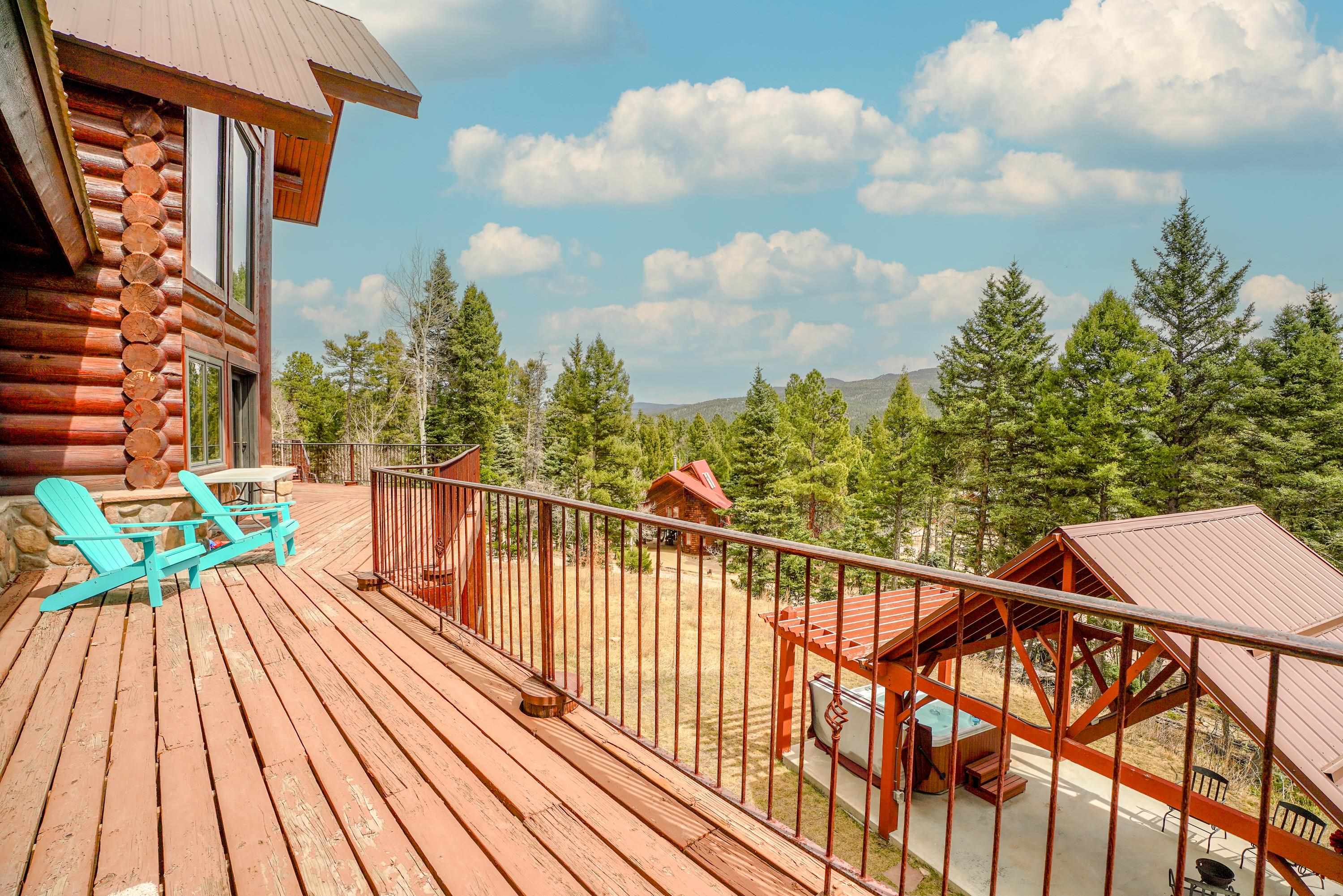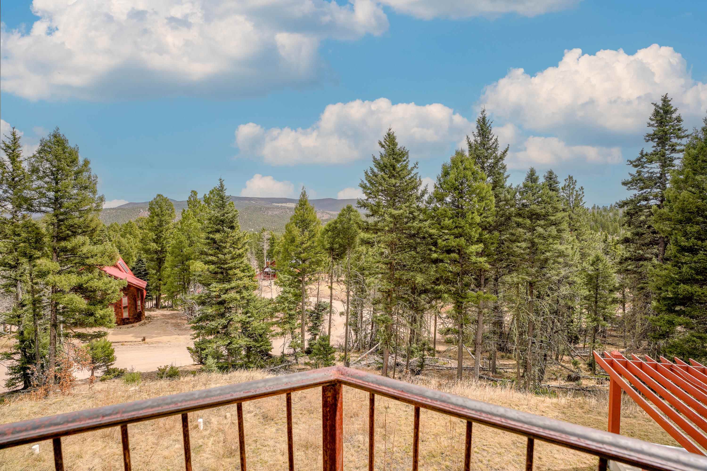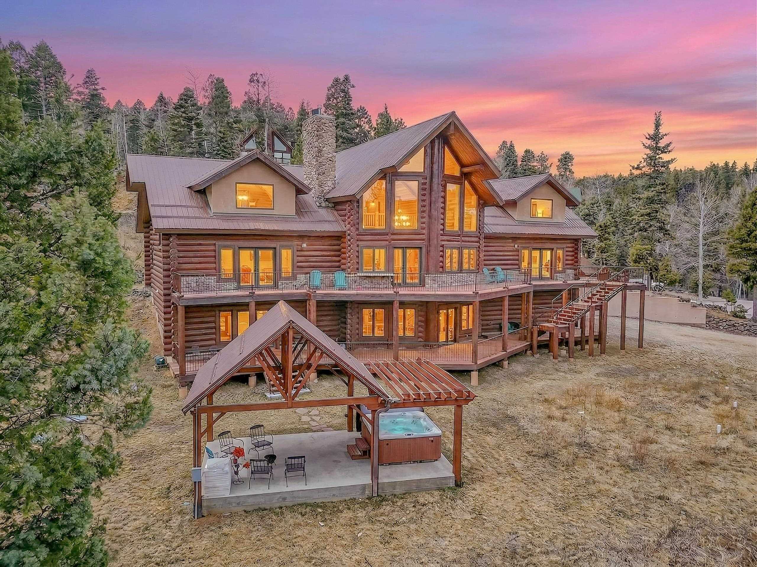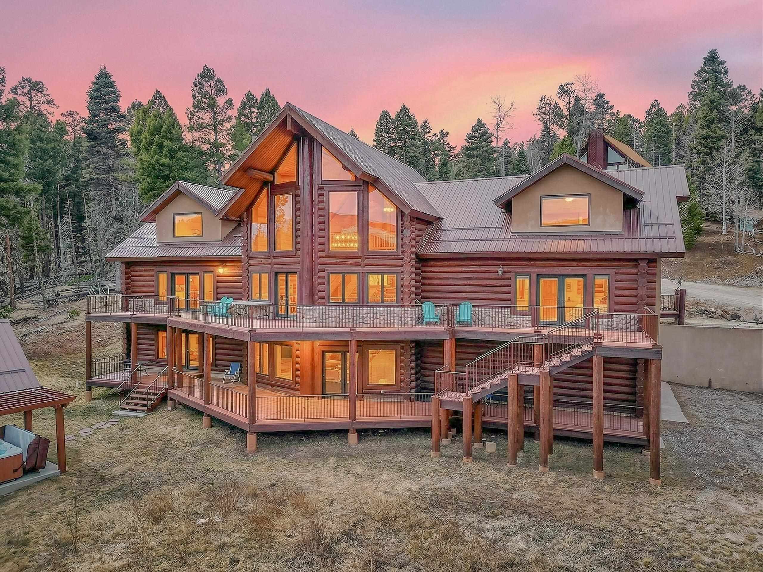 Mountain Luxury Living At Its Finest! This beautiful log and stucco residence boasts 4 spacious bedrooms, 5 bathrooms, a safe room, a children's game room and multiple living areas. Highlighted with impressive natural log columns, soaring ceilings and a wall of windows with great views. A massive rock fireplace serves as the centerpiece of the expansive living room. The kitchen is thoughtfully designed with custom cabinetry, granite countertops, and high-quality appliances. This home offers two additional living or recreational spaces, making it ideal for large or extended family gatherings. Downstairs the "bear den" has plenty of space for game-night and the other room has unique custom bunkbeds which is perfect for the little ones. Step outside to enjoy multiple outdoor spaces, including a hot tub gazebo, a main-level deck, and a lower deck—perfect for relaxing and taking in the beautiful views toward the Valley of the Utes. Located a couple of blocks from Monte Verde Lake, this stunning home offers easy access to all the amenities Angel Fire has to offer, including skiing and golfing. Additional features include a large two-car garage and a covered drive-up portal at the front of the home, spacious enough for convenient sheltered parking. Generated $100,000+ per year in rental income for the past two years!