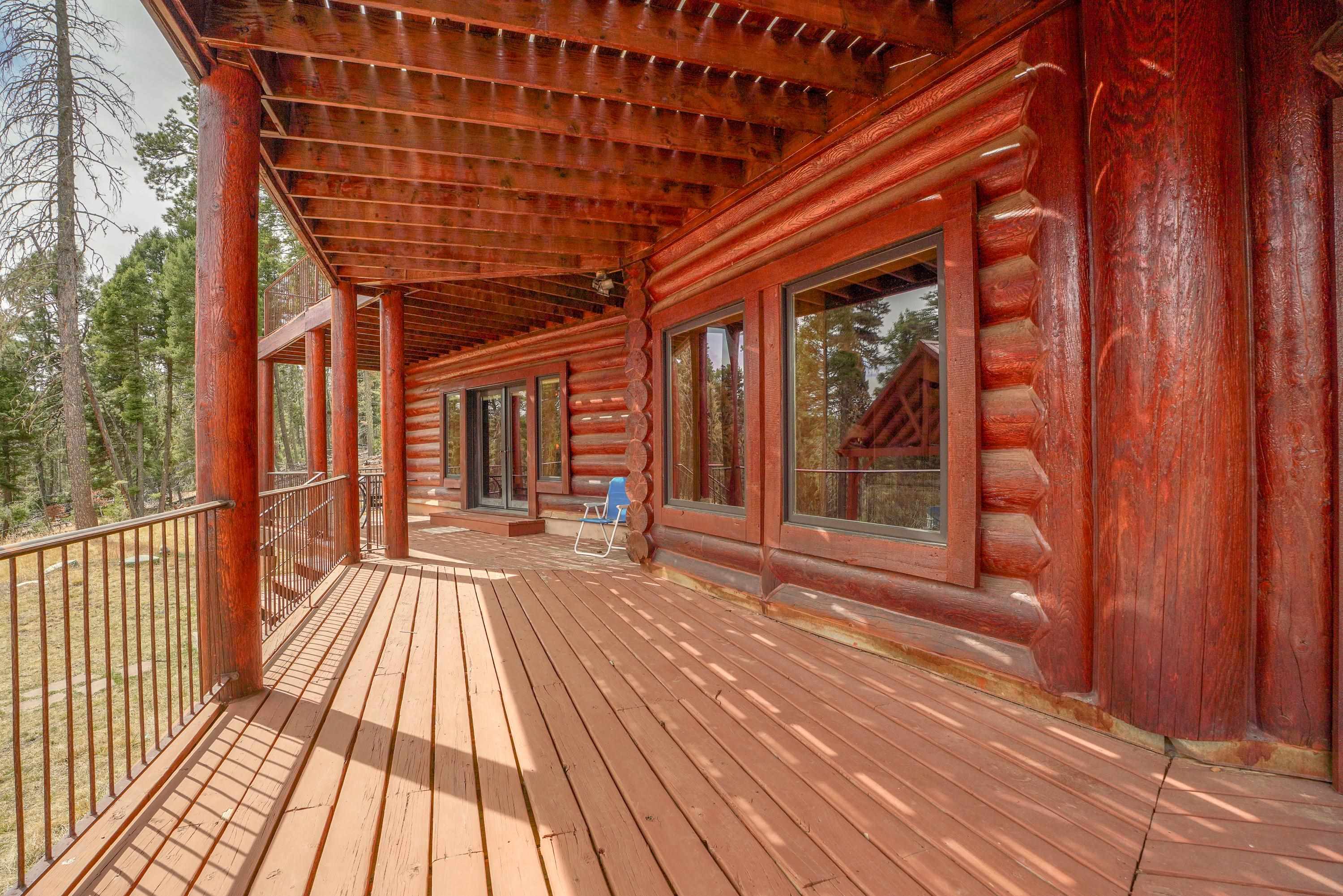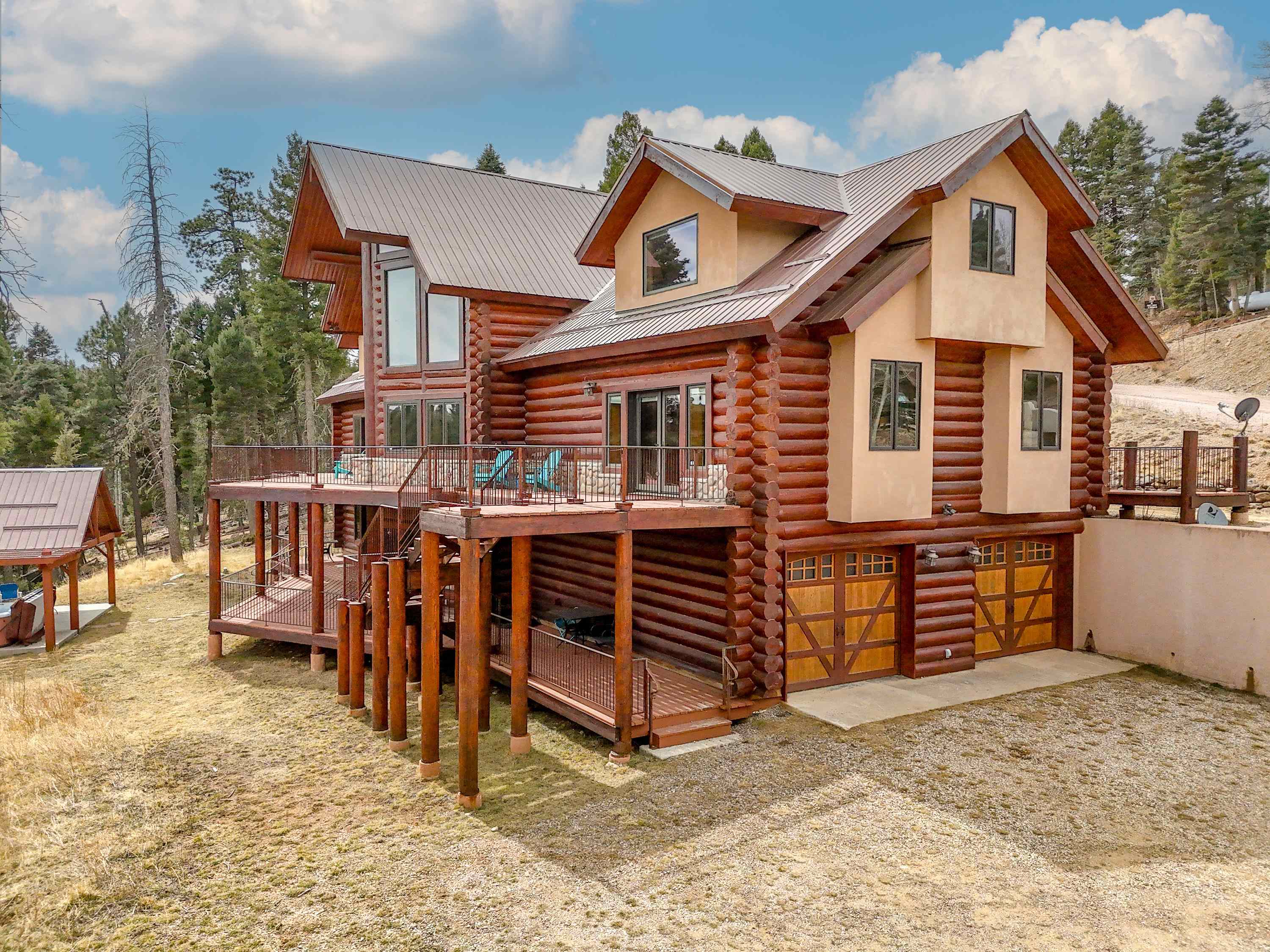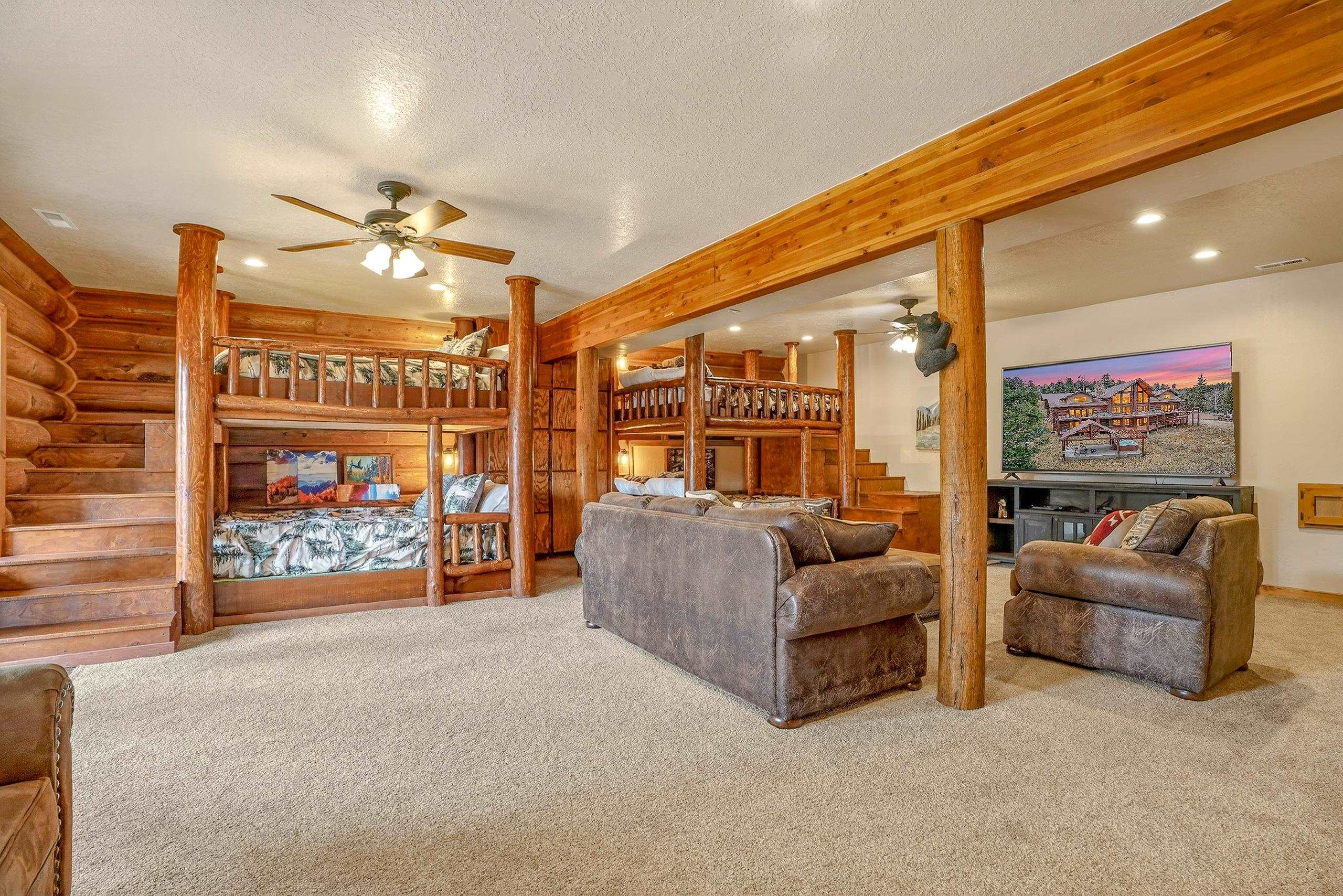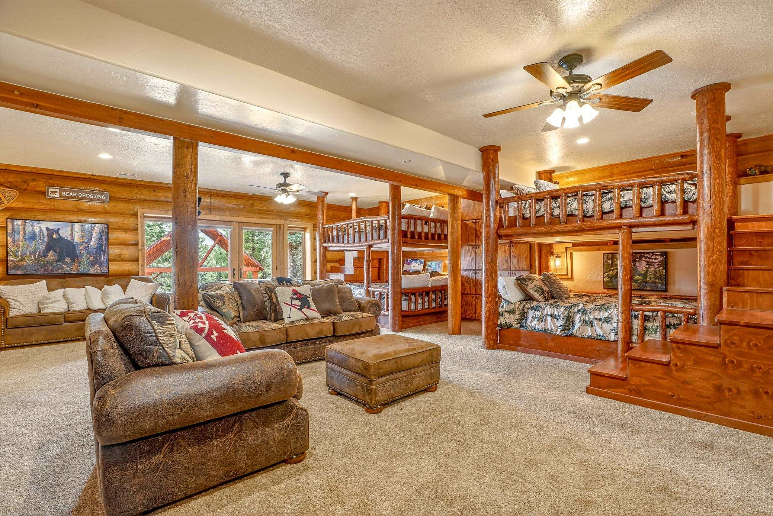 Mountain Luxury Living At Its Finest! This beautiful log and stucco residence boasts 4 spacious bedrooms, 5 bathrooms, a safe room, a children's game room and multiple living areas. Highlighted with impressive natural log columns, soaring ceilings and a wall of windows with great views. A massive rock fireplace serves as the centerpiece of the expansive living room. The kitchen is thoughtfully designed with custom cabinetry, granite countertops, and high-quality appliances. This home offers two additional living or recreational spaces, making it ideal for large or extended family gatherings. Downstairs the "bear den" has plenty of space for game-night and the other room has unique custom bunkbeds which is perfect for the little ones. Step outside to enjoy multiple outdoor spaces, including a hot tub gazebo, a main-level deck, and a lower deck—perfect for relaxing and taking in the beautiful views toward the Valley of the Utes. Located a couple of blocks from Monte Verde Lake, this stunning home offers easy access to all the amenities Angel Fire has to offer, including skiing and golfing. Additional features include a large two-car garage and a covered drive-up portal at the front of the home, spacious enough for convenient sheltered parking. Generated $100,000+ per year in rental income for the past two years!