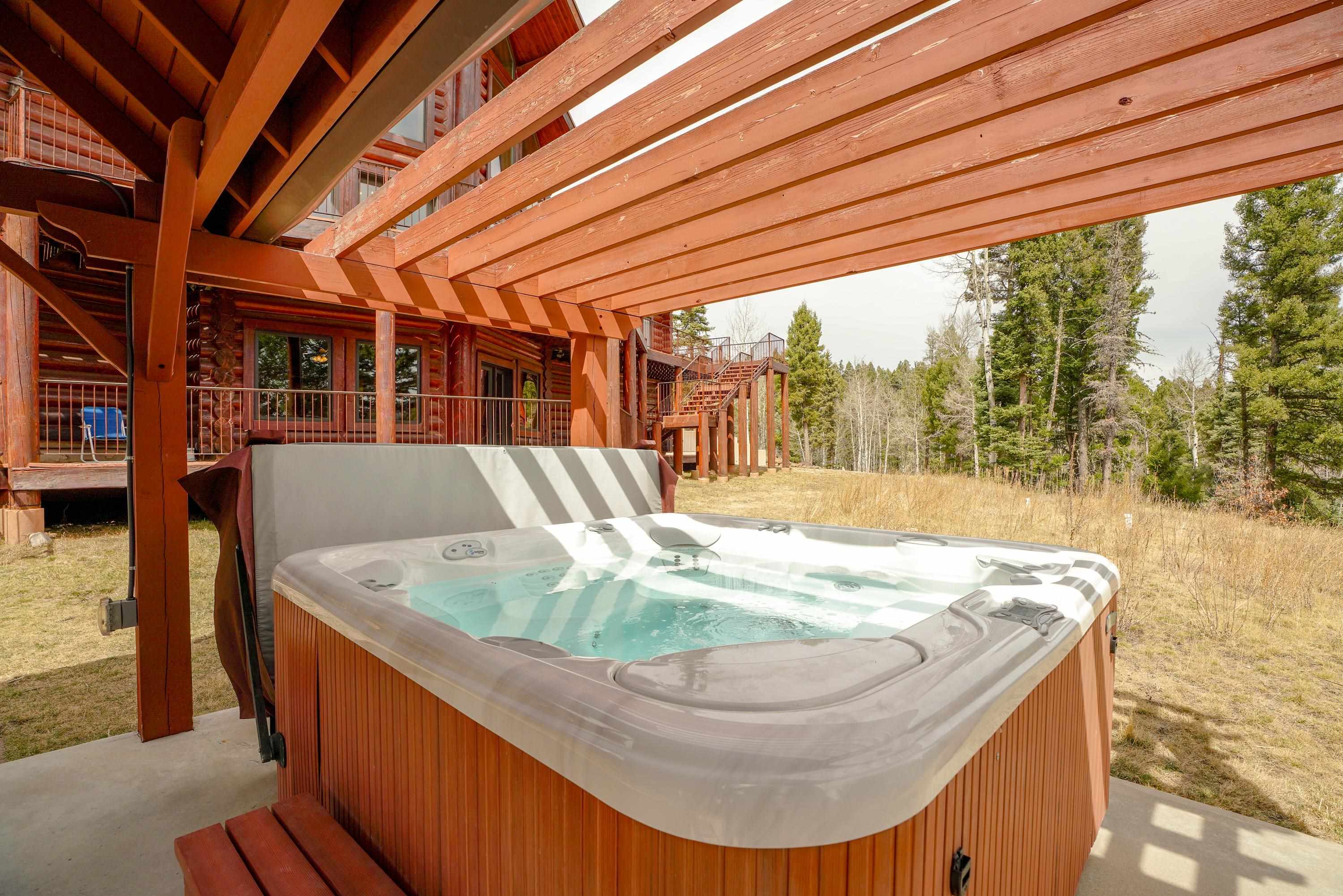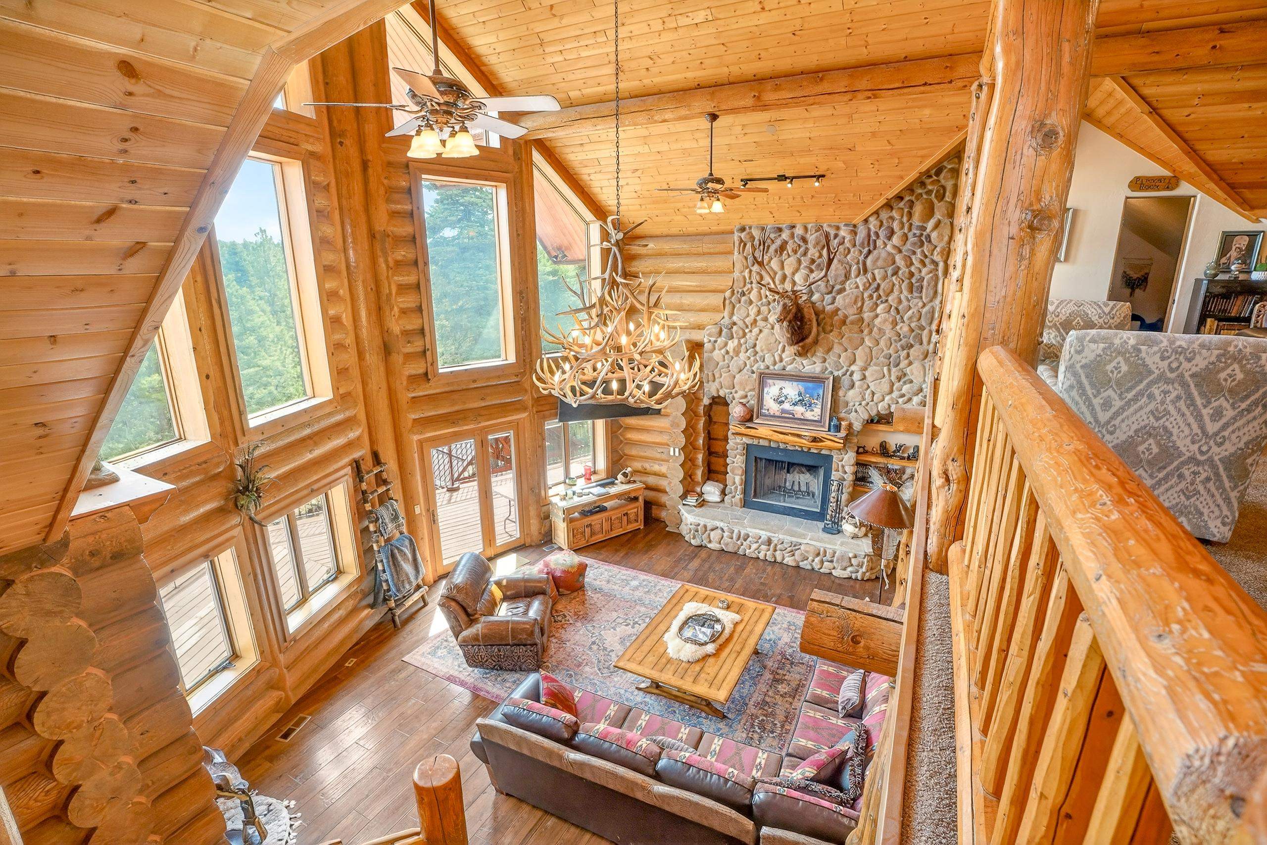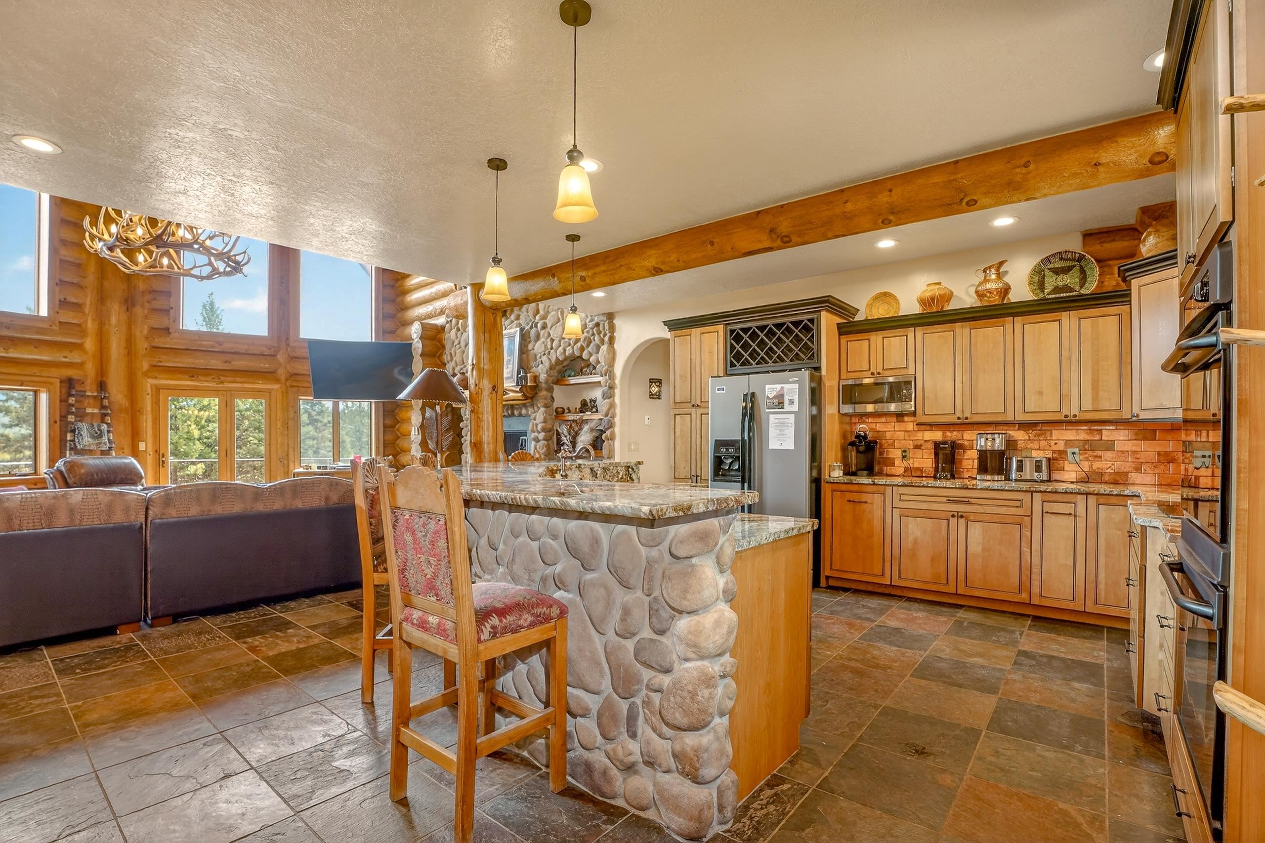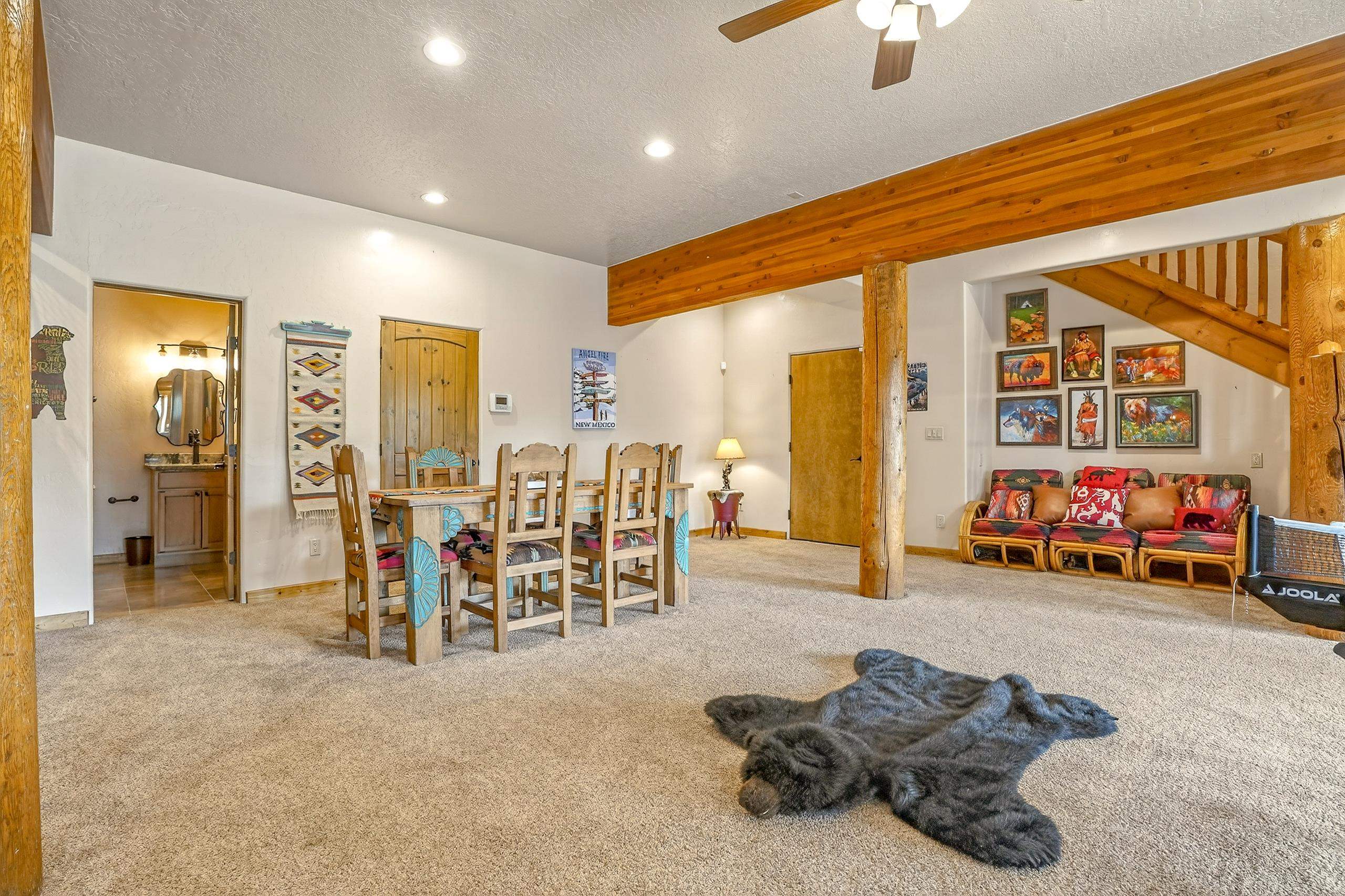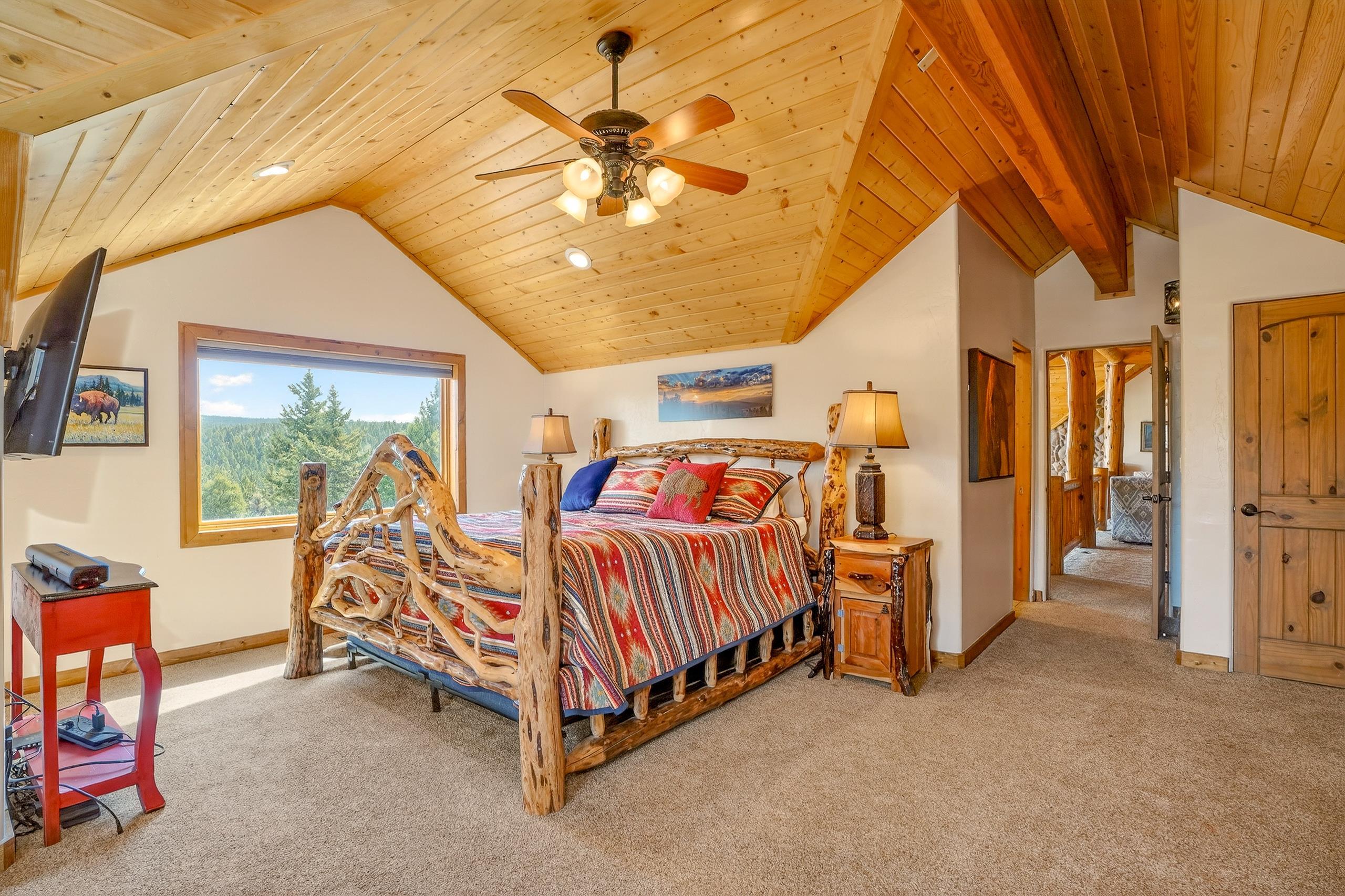 Mountain Luxury Living At Its Finest! This beautiful log and stucco residence boasts 4 spacious bedrooms, 5 bathrooms, a safe room, a children's game room and multiple living areas. Highlighted with impressive natural log columns, soaring ceilings and a wall of windows with great views. A massive rock fireplace serves as the centerpiece of the expansive living room. The kitchen is thoughtfully designed with custom cabinetry, granite countertops, and high-quality appliances. This home offers two additional living or recreational spaces, making it ideal for large or extended family gatherings. Downstairs the "bear den" has plenty of space for game-night and the other room has unique custom bunkbeds which is perfect for the little ones. Step outside to enjoy multiple outdoor spaces, including a hot tub gazebo, a main-level deck, and a lower deck—perfect for relaxing and taking in the beautiful views toward the Valley of the Utes. Located a couple of blocks from Monte Verde Lake, this stunning home offers easy access to all the amenities Angel Fire has to offer, including skiing and golfing. Additional features include a large two-car garage and a covered drive-up portal at the front of the home, spacious enough for convenient sheltered parking. Generated $100,000+ per year in rental income for the past two years!