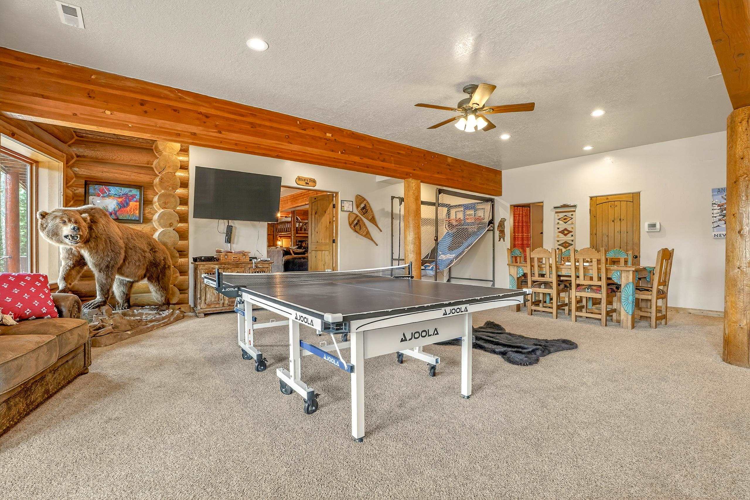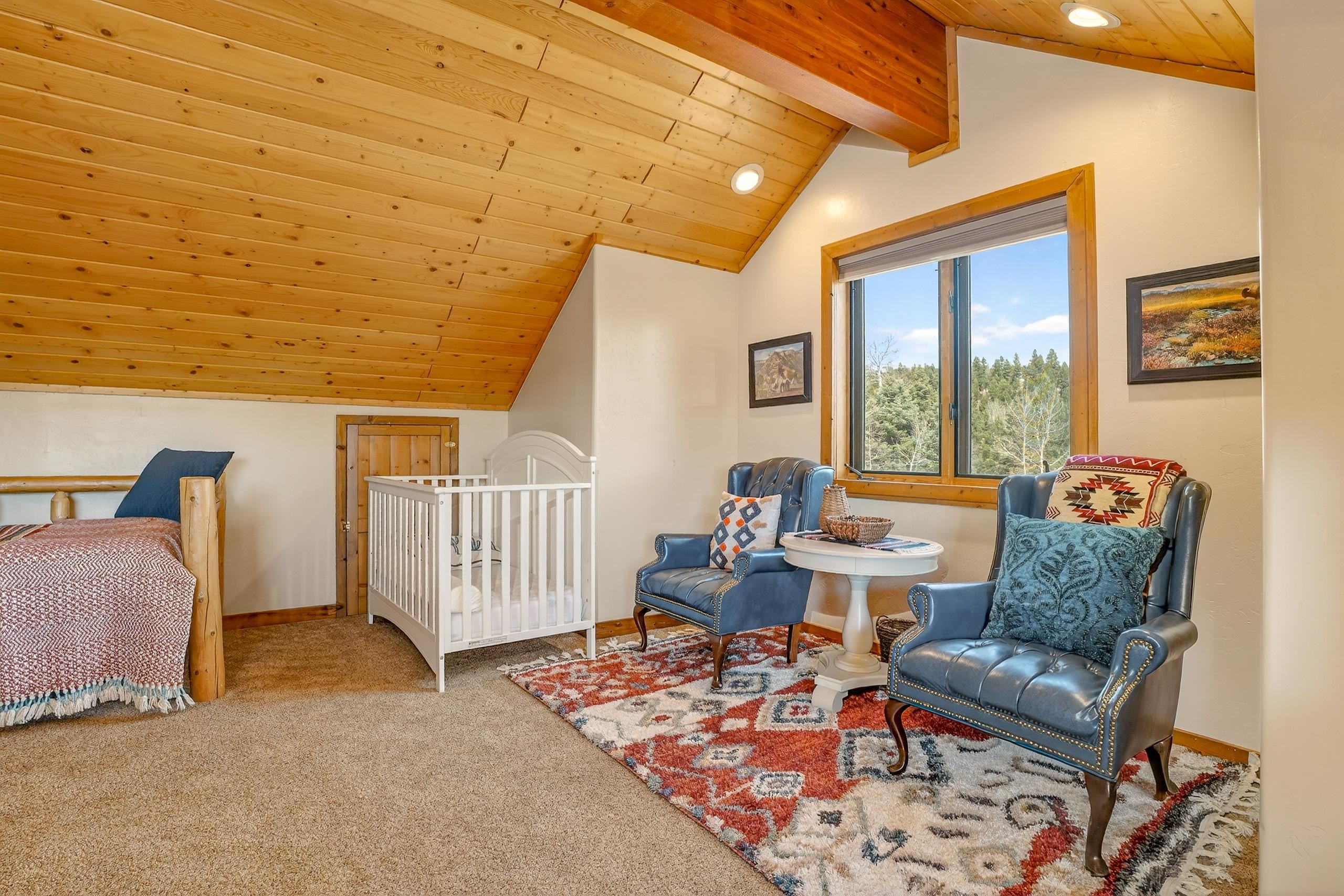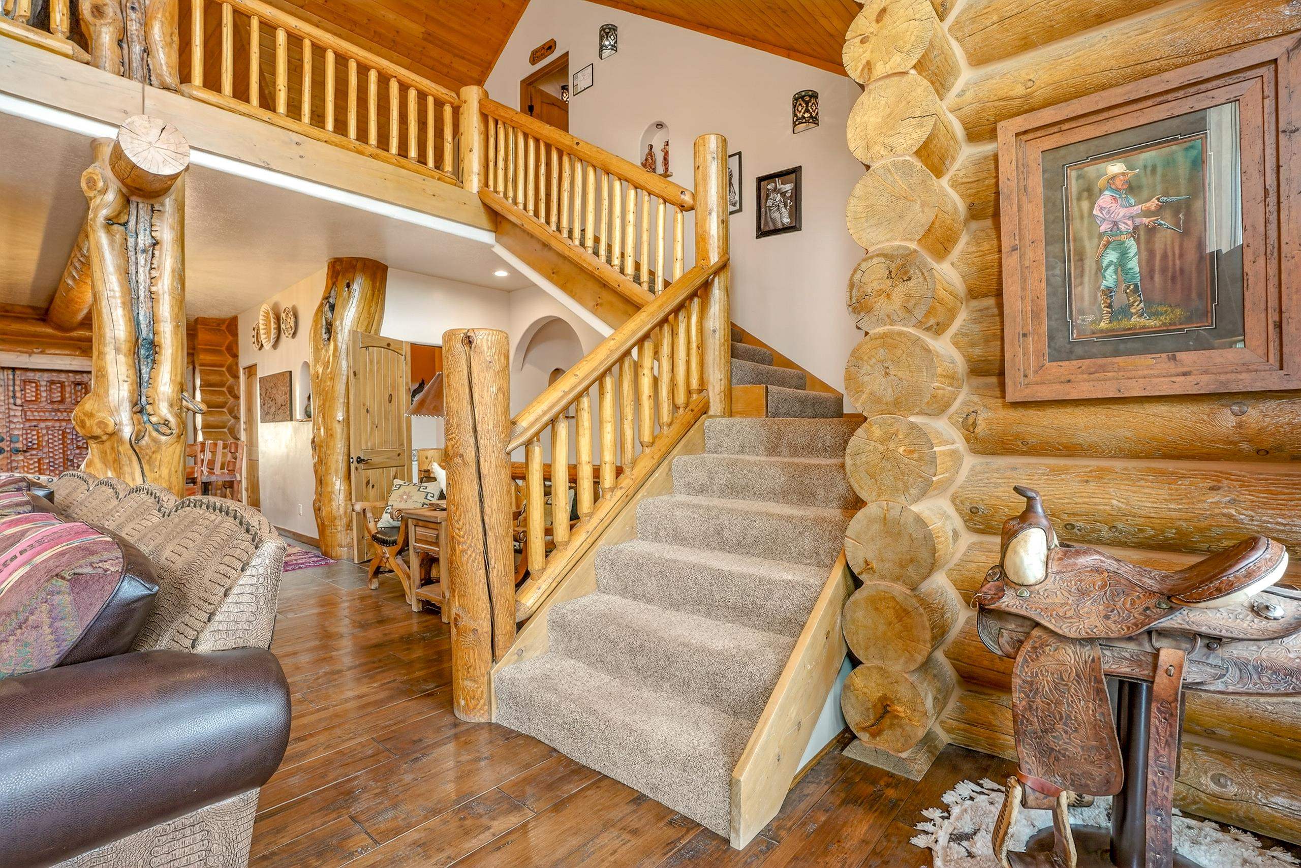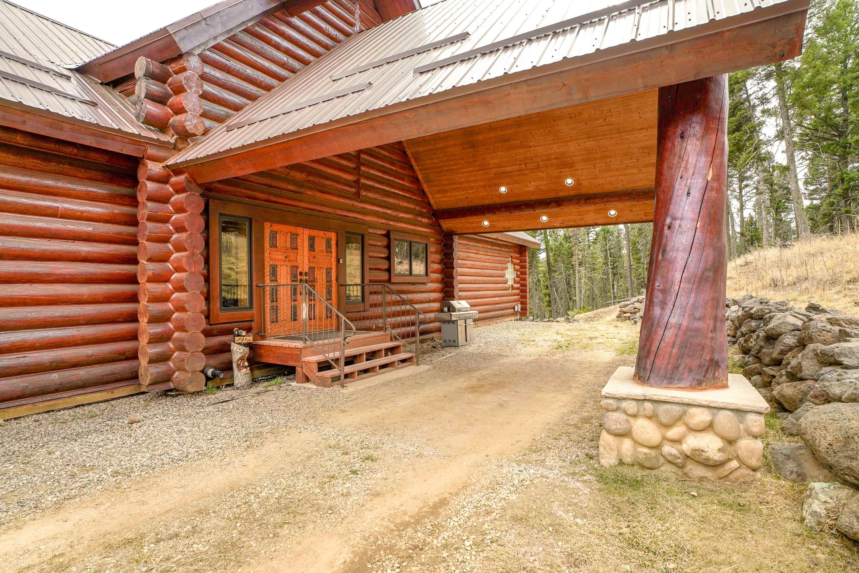 Mountain Luxury Living At Its Finest! This beautiful log and stucco residence boasts 4 spacious bedrooms, 5 bathrooms, a safe room, a children's game room and multiple living areas. Highlighted with impressive natural log columns, soaring ceilings and a wall of windows with great views. A massive rock fireplace serves as the centerpiece of the expansive living room. The kitchen is thoughtfully designed with custom cabinetry, granite countertops, and high-quality appliances. This home offers two additional living or recreational spaces, making it ideal for large or extended family gatherings. Downstairs the "bear den" has plenty of space for game-night and the other room has unique custom bunkbeds which is perfect for the little ones. Step outside to enjoy multiple outdoor spaces, including a hot tub gazebo, a main-level deck, and a lower deck—perfect for relaxing and taking in the beautiful views toward the Valley of the Utes. Located a couple of blocks from Monte Verde Lake, this stunning home offers easy access to all the amenities Angel Fire has to offer, including skiing and golfing. Additional features include a large two-car garage and a covered drive-up portal at the front of the home, spacious enough for convenient sheltered parking. Generated $100,000+ per year in rental income for the past two years!