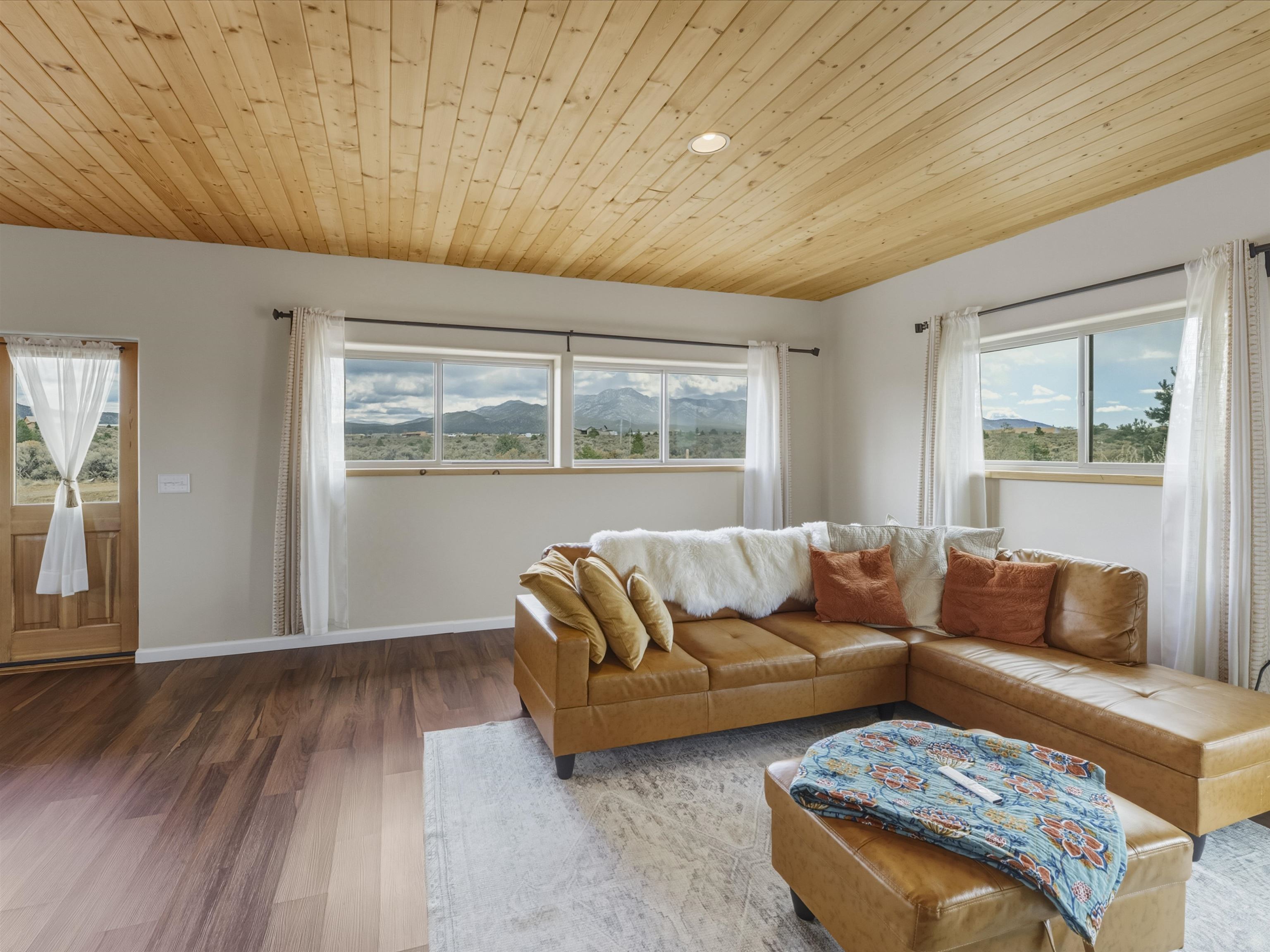 Set on 2.4 acres at the end of a quiet road, this charming 2-bedroom, 1-bathroom home is located just 15 minutes from the Taos Plaza and 40 minutes from Taos Ski Valley. Recent updates include repaired stucco, brand new appliances, and luxury vinyl plank flooring throughout. The open layout creates a comfortable flow from the living area to the kitchen, while large windows frame sweeping views of the Sangre de Cristo Mountains and the vast Taos landscape. Stay cozy in the winter with Radiant Floor and Passive Solar Heating. You'll enjoy proximity to UNM-Taos, the Country Club and golf course, the Slide Trailhead, and the Rio Grande. When you’re craving a change of pace, Santa Fe’s vibrant city life is only about an hour and fifteen minutes away. Whether you’re seeking a full-time residence, a peaceful getaway, or an investment opportunity in a prime location, this Ranchos de Taos property combines comfort, updates, and unmatched views in one inviting package.