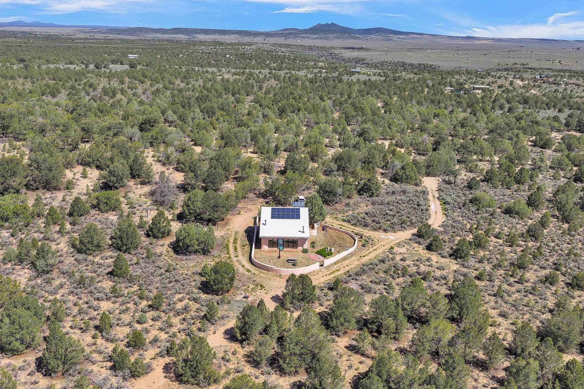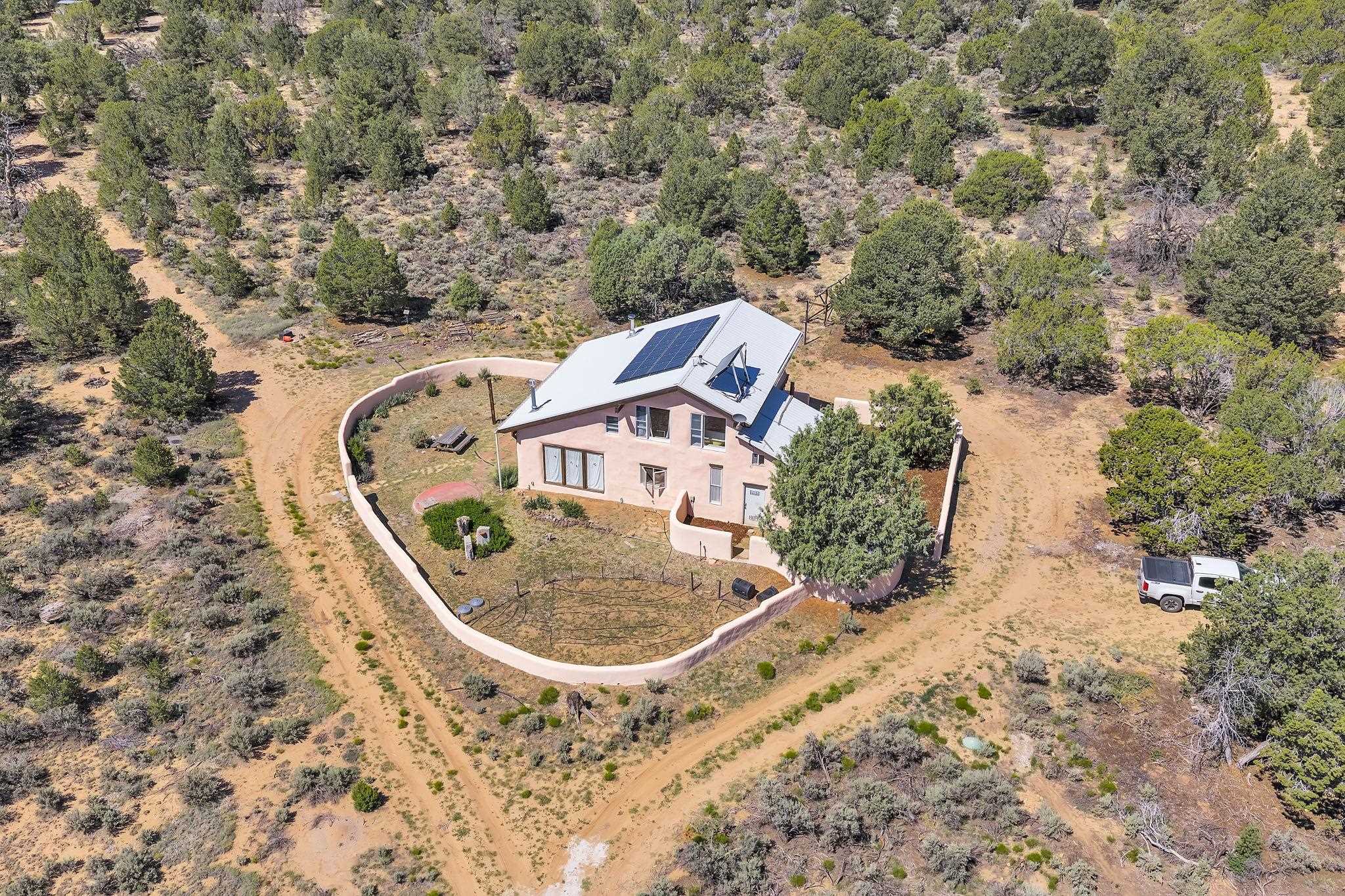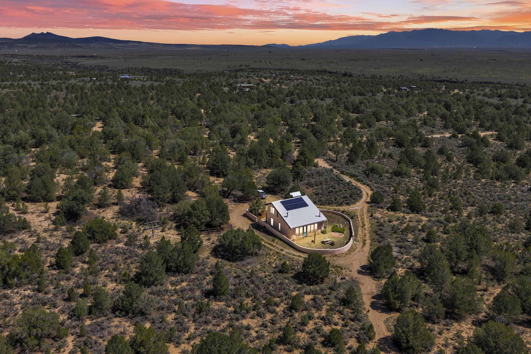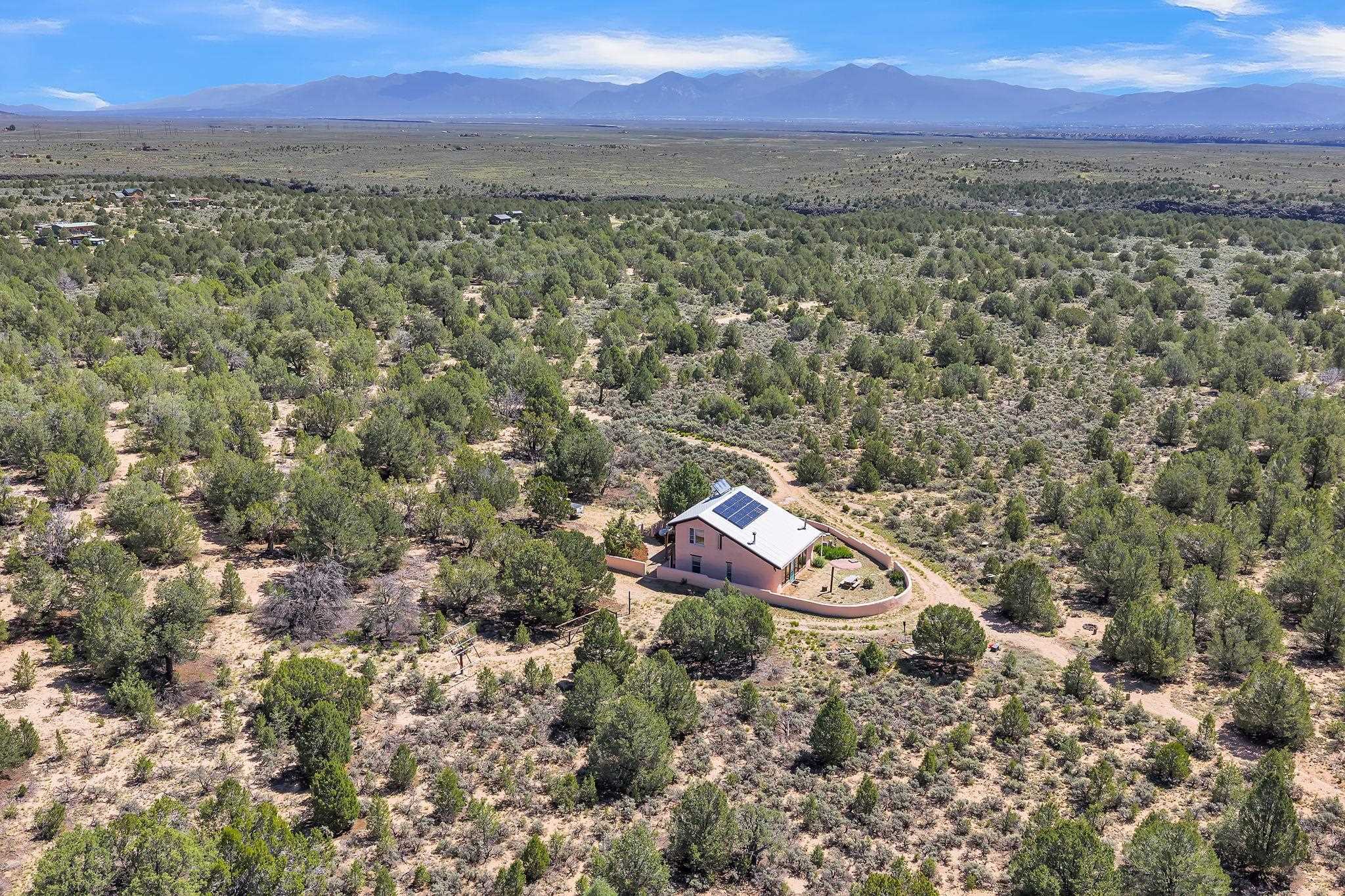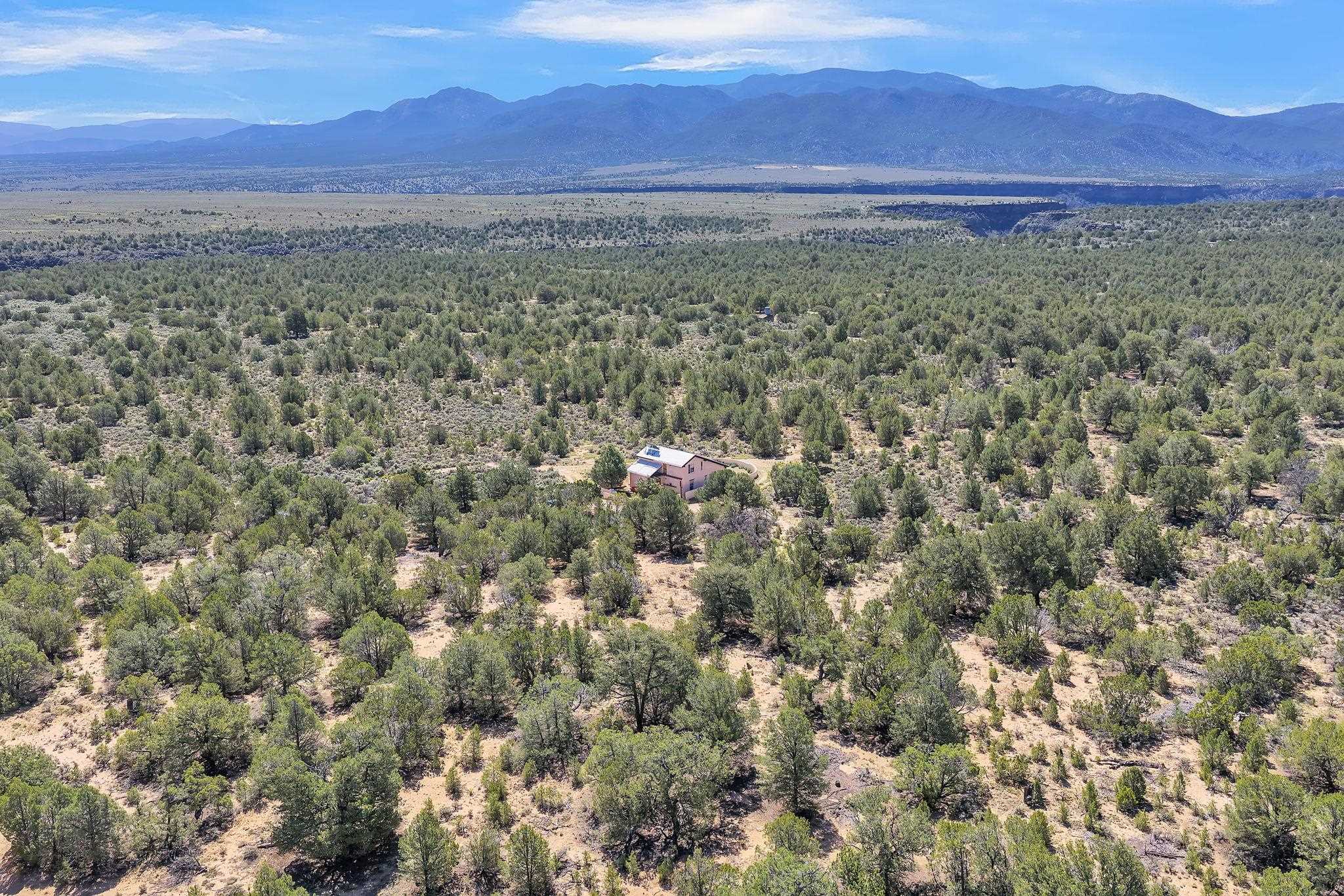 Extraordinary High Desert Property in Carson Near the Petaca ~ 77 North Road is an exceptional off-grid sanctuary in Carson, New Mexico close to the Rio Grande, Ojo Caliente, and minutes from the Petaca. This 2-story Territorial-style home sits on 20 private acres of mature piñon & juniper forest that offers unmatched tranquility. The home is powered by solar photovoltaics with brand new lithium batteries, and its very own private water Well. A rare find in this part of the world. Downstairs you have expansive South and East-facing windows that maximize passive solar warmth while also showcasing stunning views of Taos Mountain and the Sangre de Cristo Mountain Range. The open living-dining area boasts massive ceiling beams, flagstone, and tile floors with a stunning stair case that is art of its own. The kitchen includes a propane range, oven and refrigerator, with desirable wood cabinetry; a space the chef in the household will adore. The primary heat source comes from hot water in-floor heating, baseboards, and supplemental heat from a powerful wood-burning stove. Upstairs, the spacious primary bedroom features pine wood floors, a walk-in closet, and bonus meditation, office, or additional storage space. The half-bath upstairs includes a lovely clawfoot bathtub beside a window with the best views yet, and downstairs you'll find the shower. Walk outside under a covered portal beside the enclosed battery and generator room, and a detached laundry room. The front of the home features a low-walled lush courtyard with more exquisite views, and not far from the home you will find a 15' x 30' straw bale casita that can be transformed to whatever the heart desires. Wildlife, like elk, deer, and coyote, are your neighbors along with numerous bird species that perch up on the bush top daily. Internet is available via TaosNet. The home has been virtually staged to spark design creativity. This is your chance to own a magical 20 acre property in the New Mexico High Desert, don't miss it!