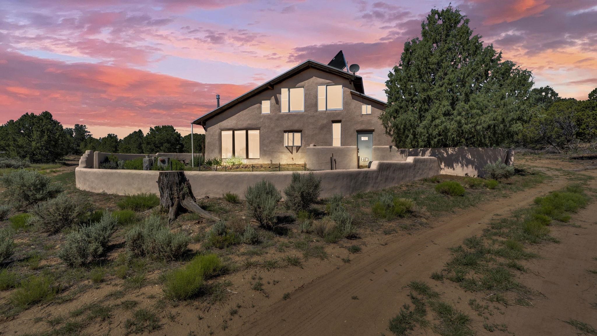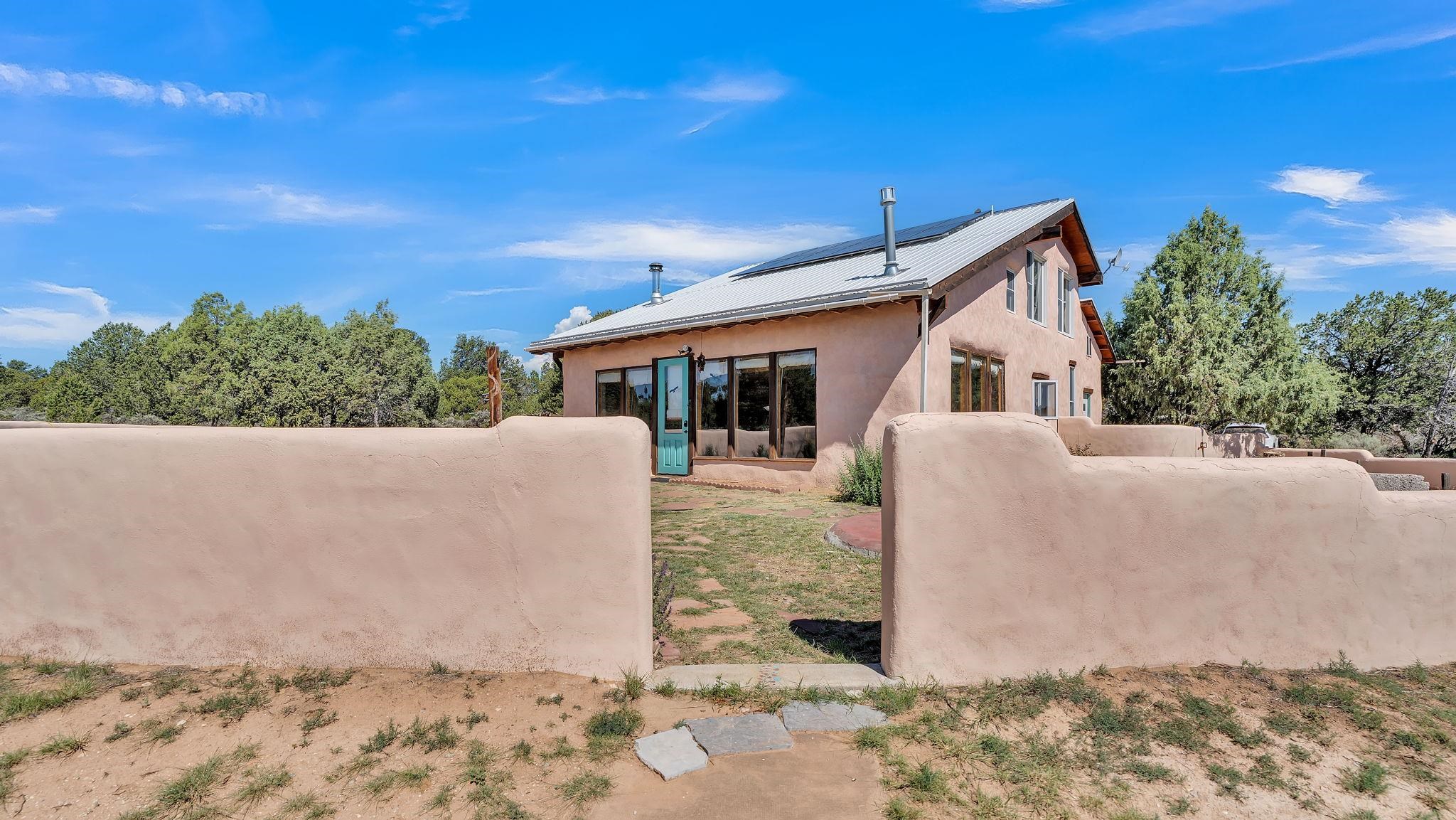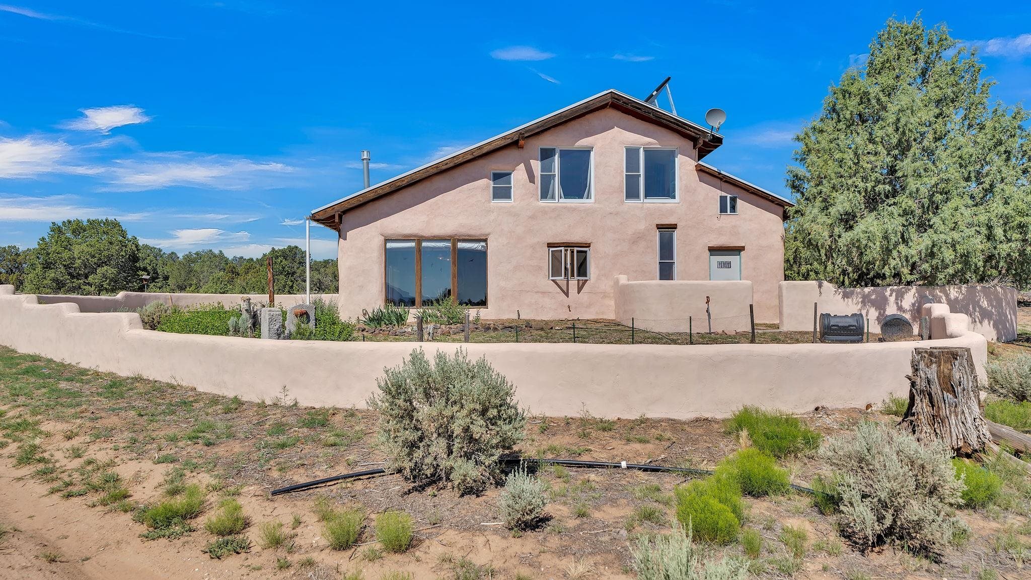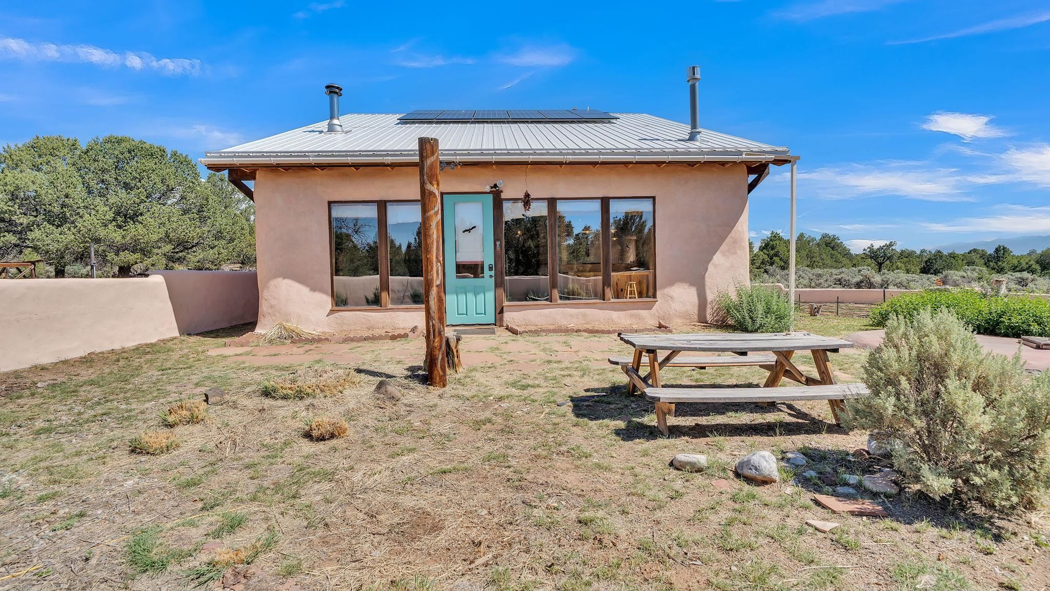 Extraordinary High Desert Property in Carson Near the Petaca ~ 77 North Road is an exceptional off-grid sanctuary in Carson, New Mexico close to the Rio Grande, Ojo Caliente, and minutes from the Petaca. This 2-story Territorial-style home sits on 20 private acres of mature piñon & juniper forest that offers unmatched tranquility. The home is powered by solar photovoltaics with brand new lithium batteries, and its very own private water Well. A rare find in this part of the world. Downstairs you have expansive South and East-facing windows that maximize passive solar warmth while also showcasing stunning views of Taos Mountain and the Sangre de Cristo Mountain Range. The open living-dining area boasts massive ceiling beams, flagstone, and tile floors with a stunning stair case that is art of its own. The kitchen includes a propane range, oven and refrigerator, with desirable wood cabinetry; a space the chef in the household will adore. The primary heat source comes from hot water in-floor heating, baseboards, and supplemental heat from a powerful wood-burning stove. Upstairs, the spacious primary bedroom features pine wood floors, a walk-in closet, and bonus meditation, office, or additional storage space. The half-bath upstairs includes a lovely clawfoot bathtub beside a window with the best views yet, and downstairs you'll find the shower. Walk outside under a covered portal beside the enclosed battery and generator room, and a detached laundry room. The front of the home features a low-walled lush courtyard with more exquisite views, and not far from the home you will find a 15' x 30' straw bale casita that can be transformed to whatever the heart desires. Wildlife, like elk, deer, and coyote, are your neighbors along with numerous bird species that perch up on the bush top daily. Internet is available via TaosNet. The home has been virtually staged to spark design creativity. This is your chance to own a magical 20 acre property in the New Mexico High Desert, don't miss it!