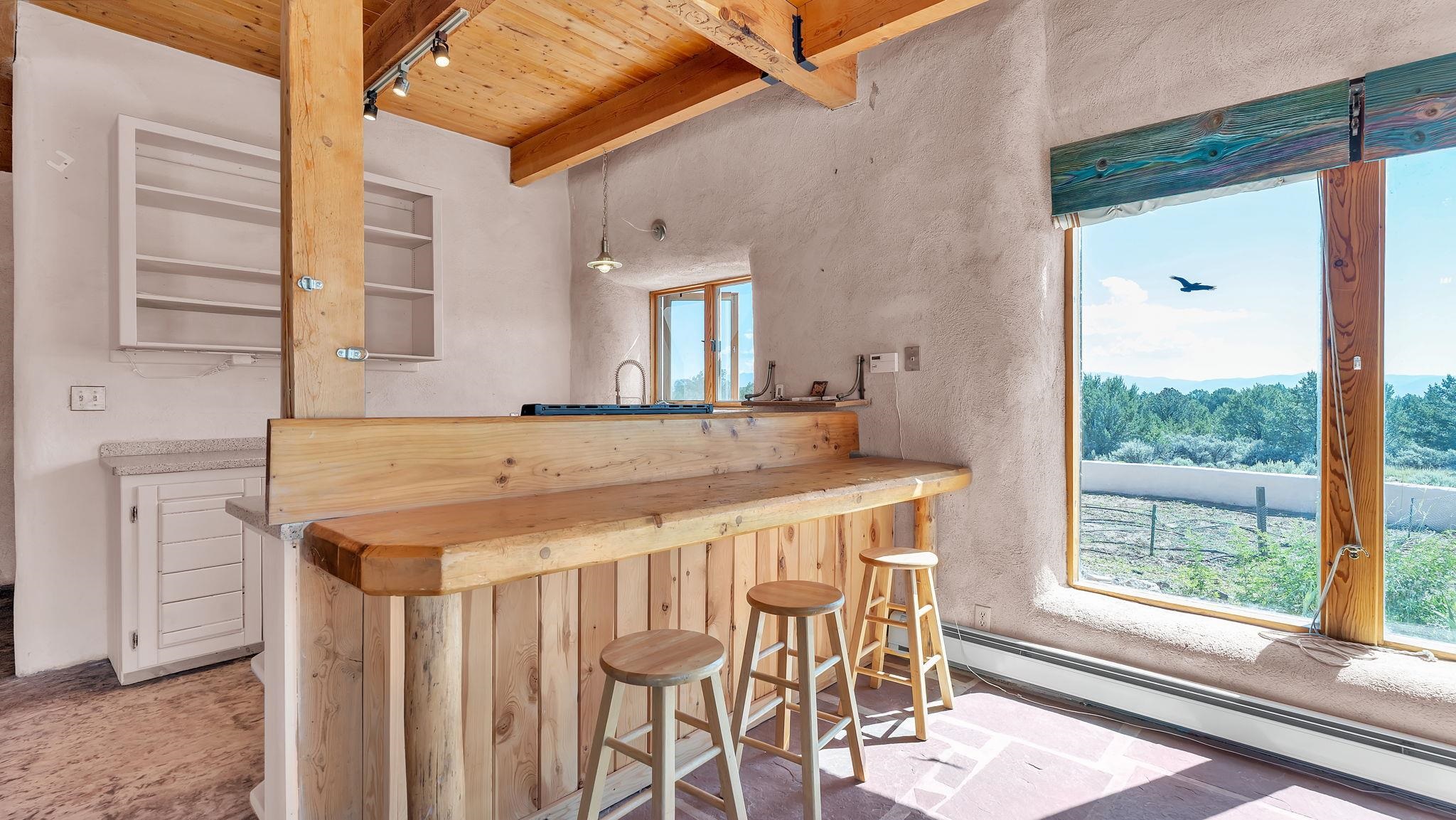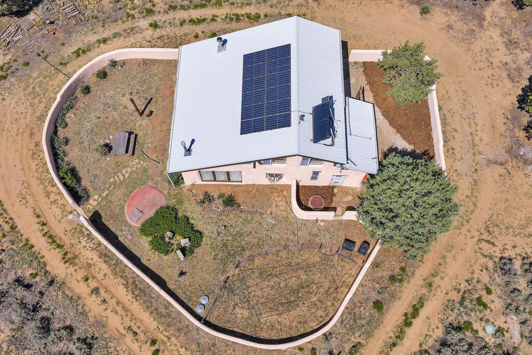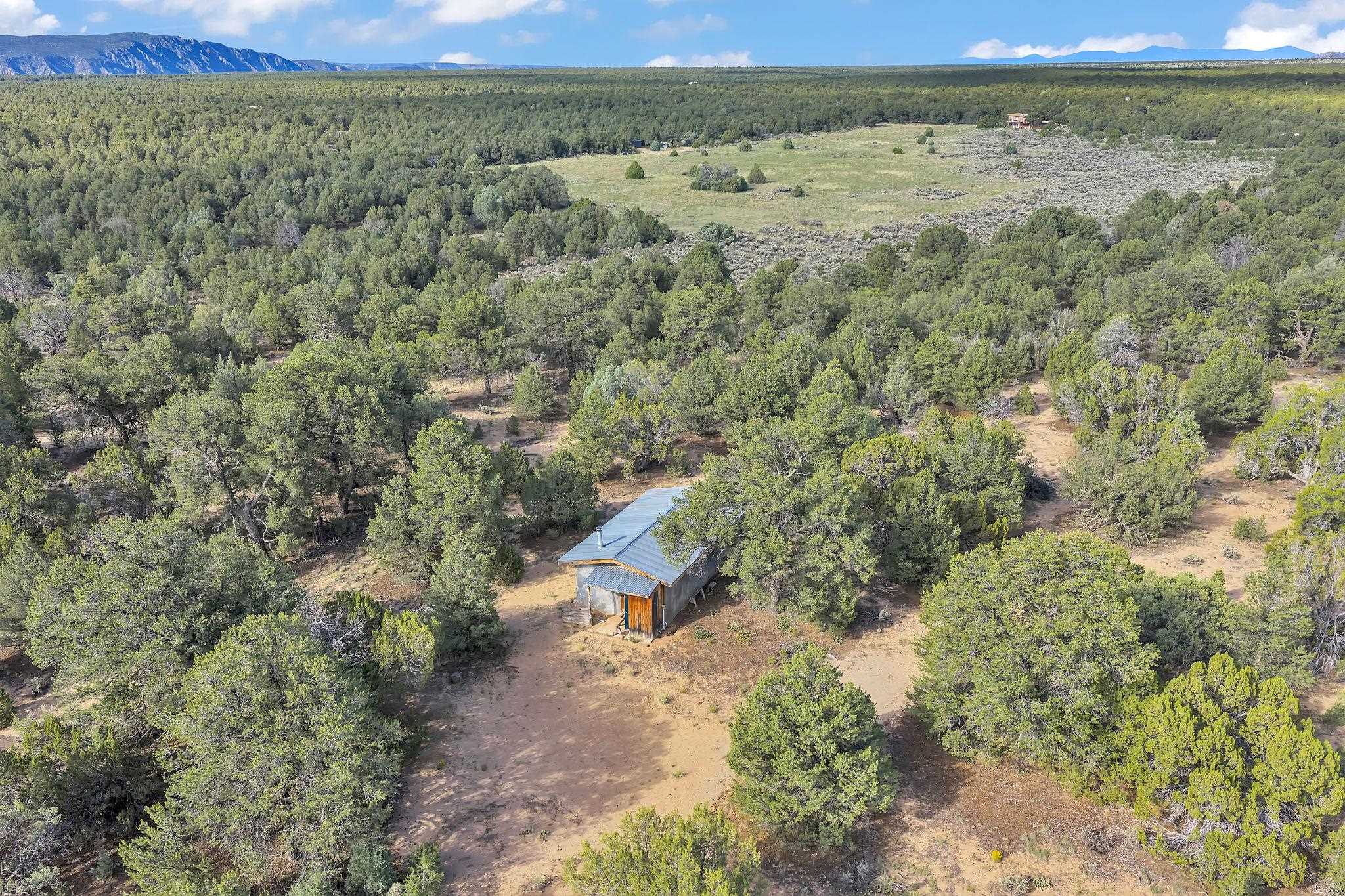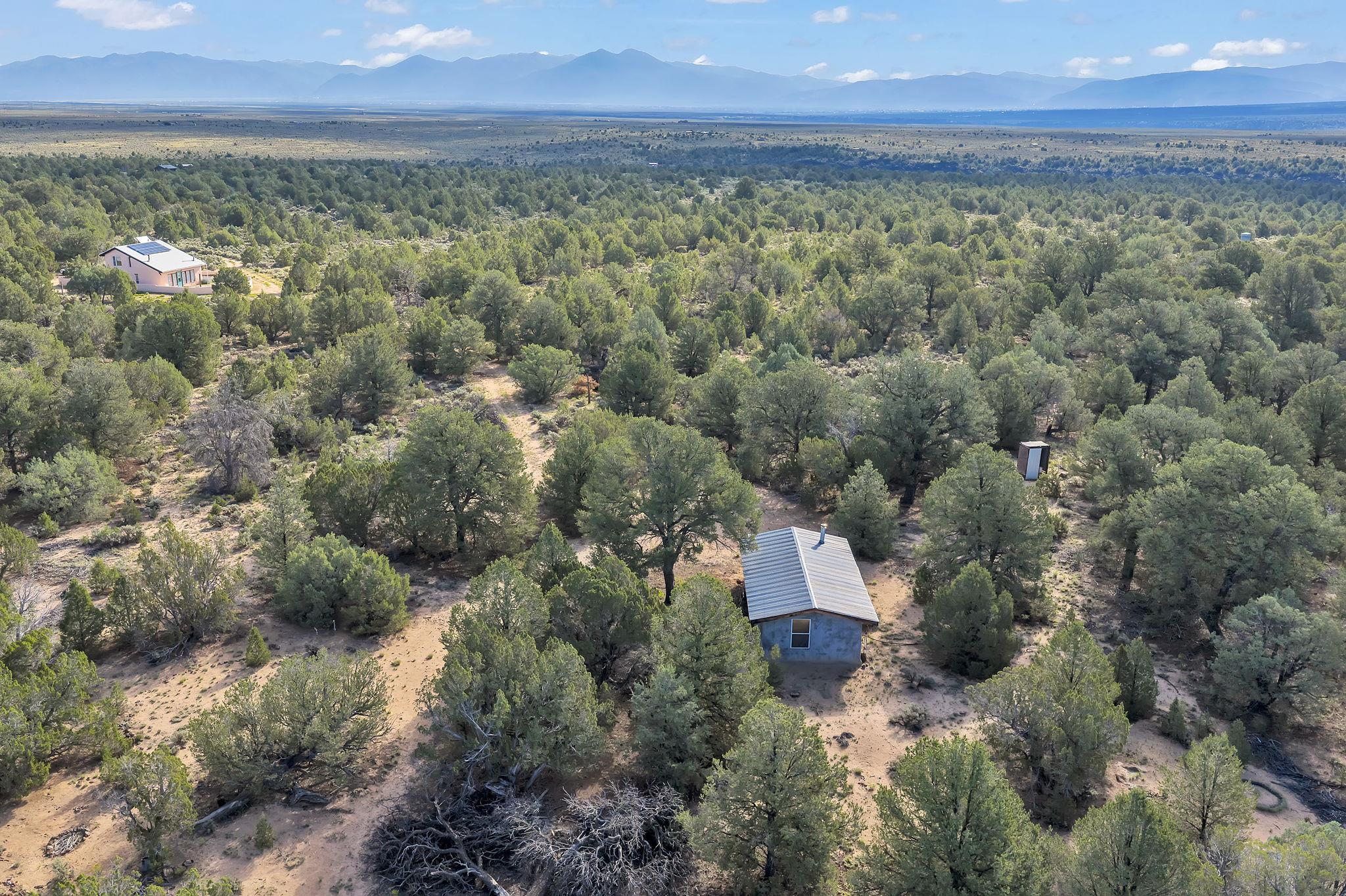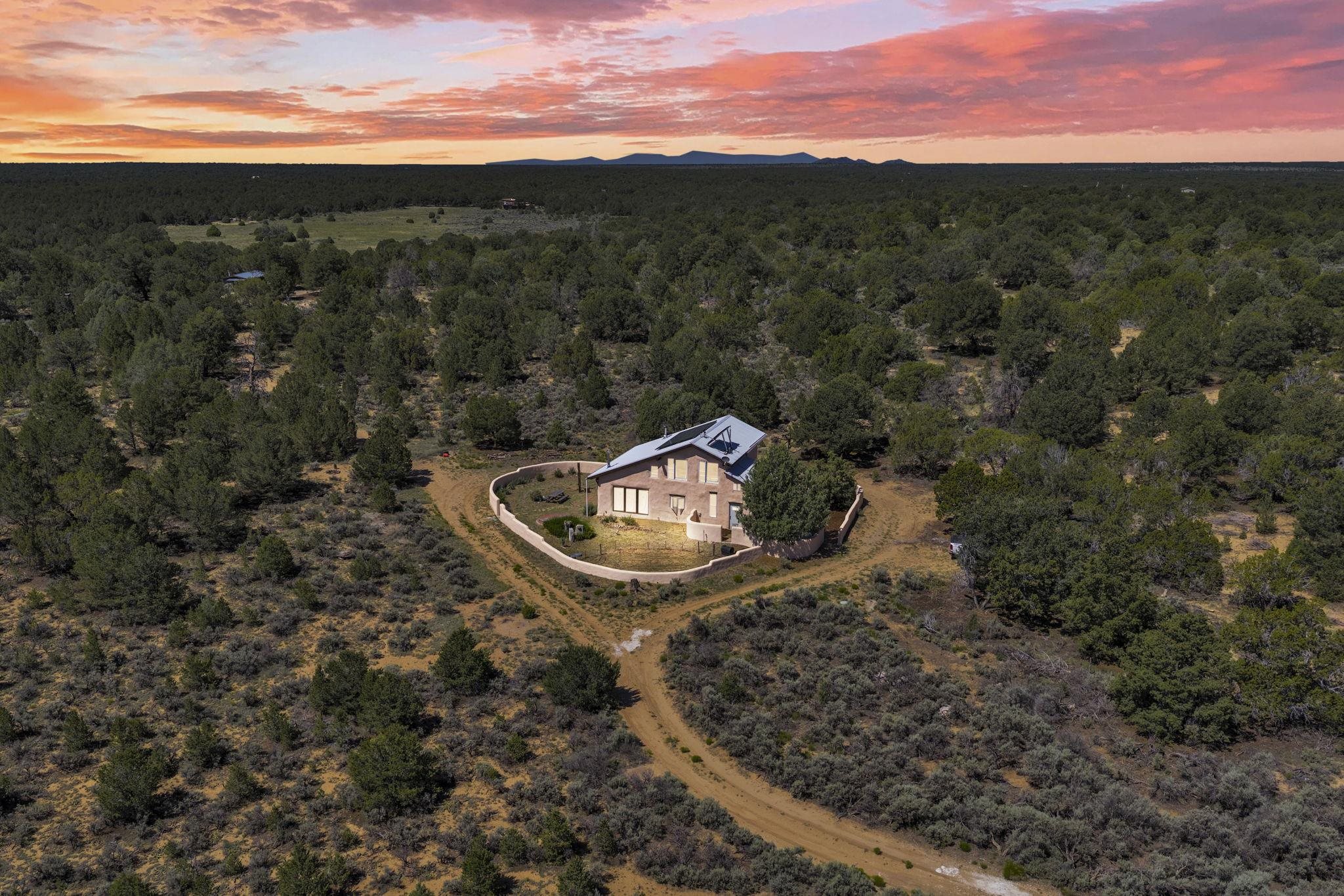 Extraordinary High Desert Property in Carson Near the Petaca ~ 77 North Road is an exceptional off-grid sanctuary in Carson, New Mexico close to the Rio Grande, Ojo Caliente, and minutes from the Petaca. This 2-story Territorial-style home sits on 20 private acres of mature piñon & juniper forest that offers unmatched tranquility. The home is powered by solar photovoltaics with brand new lithium batteries, and its very own private water Well. A rare find in this part of the world. Downstairs you have expansive South and East-facing windows that maximize passive solar warmth while also showcasing stunning views of Taos Mountain and the Sangre de Cristo Mountain Range. The open living-dining area boasts massive ceiling beams, flagstone, and tile floors with a stunning stair case that is art of its own. The kitchen includes a propane range, oven and refrigerator, with desirable wood cabinetry; a space the chef in the household will adore. The primary heat source comes from hot water in-floor heating, baseboards, and supplemental heat from a powerful wood-burning stove. Upstairs, the spacious primary bedroom features pine wood floors, a walk-in closet, and bonus meditation, office, or additional storage space. The half-bath upstairs includes a lovely clawfoot bathtub beside a window with the best views yet, and downstairs you'll find the shower. Walk outside under a covered portal beside the enclosed battery and generator room, and a detached laundry room. The front of the home features a low-walled lush courtyard with more exquisite views, and not far from the home you will find a 15' x 30' straw bale casita that can be transformed to whatever the heart desires. Wildlife, like elk, deer, and coyote, are your neighbors along with numerous bird species that perch up on the bush top daily. Internet is available via TaosNet. The home has been virtually staged to spark design creativity. This is your chance to own a magical 20 acre property in the New Mexico High Desert, don't miss it!