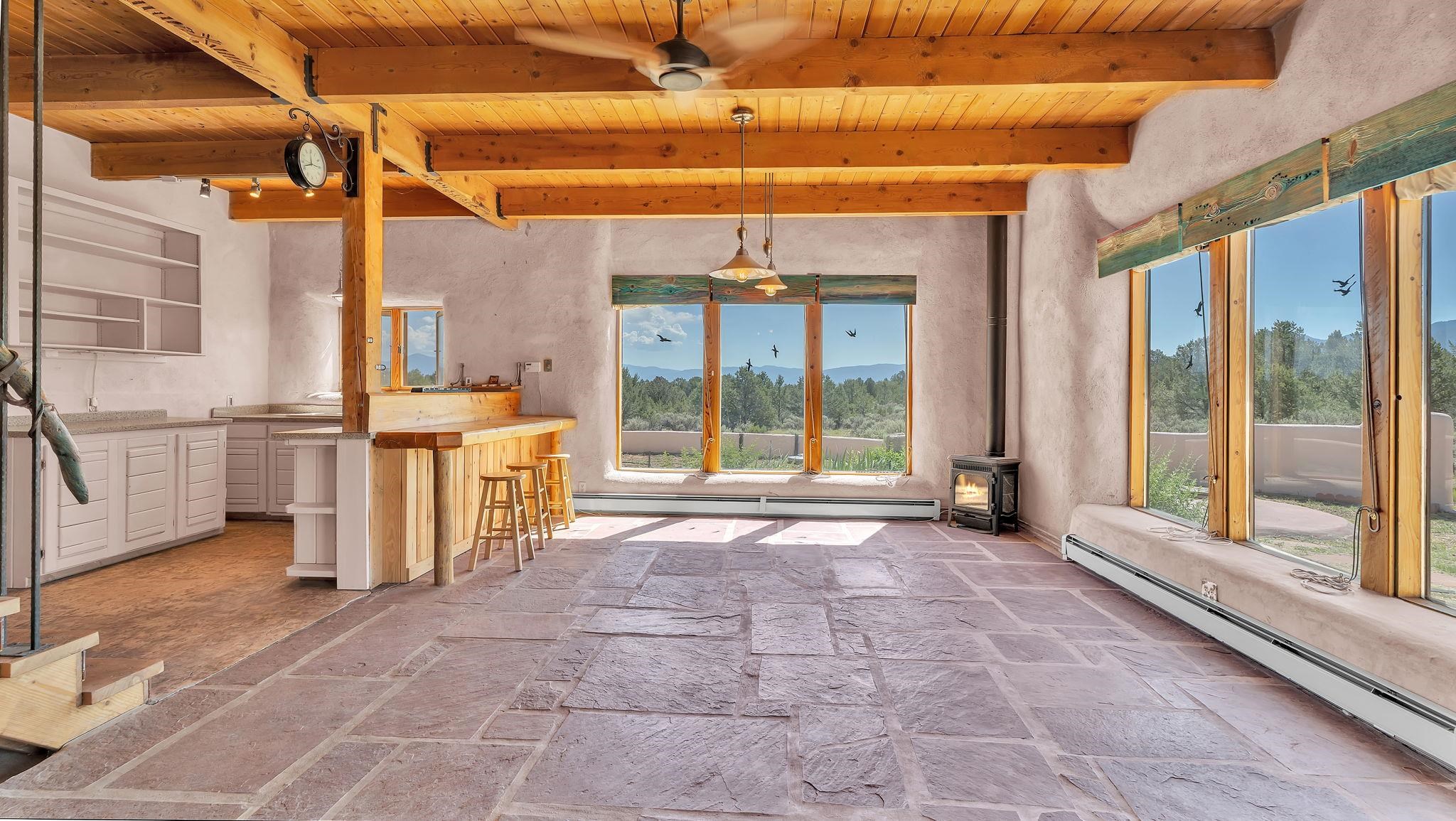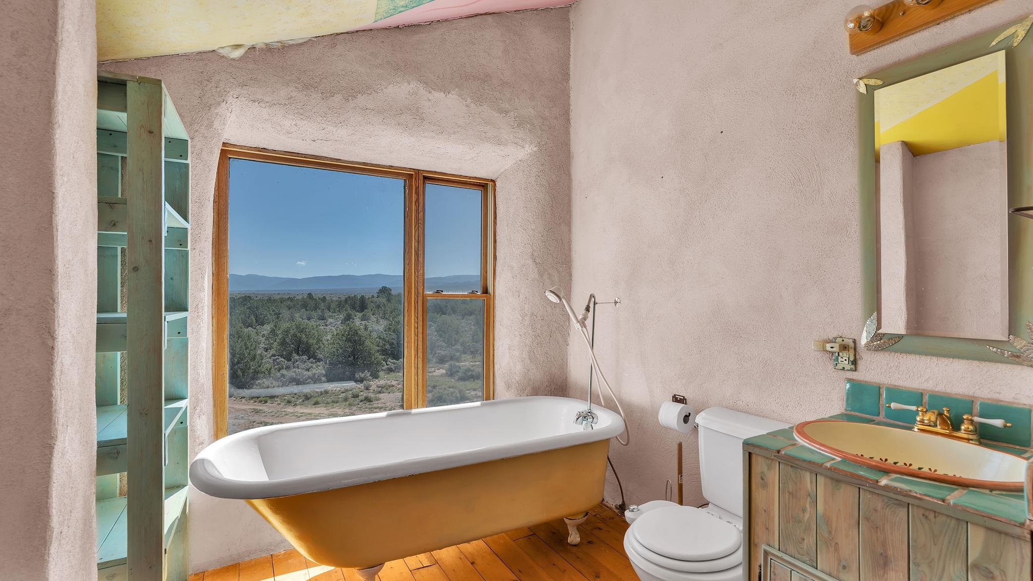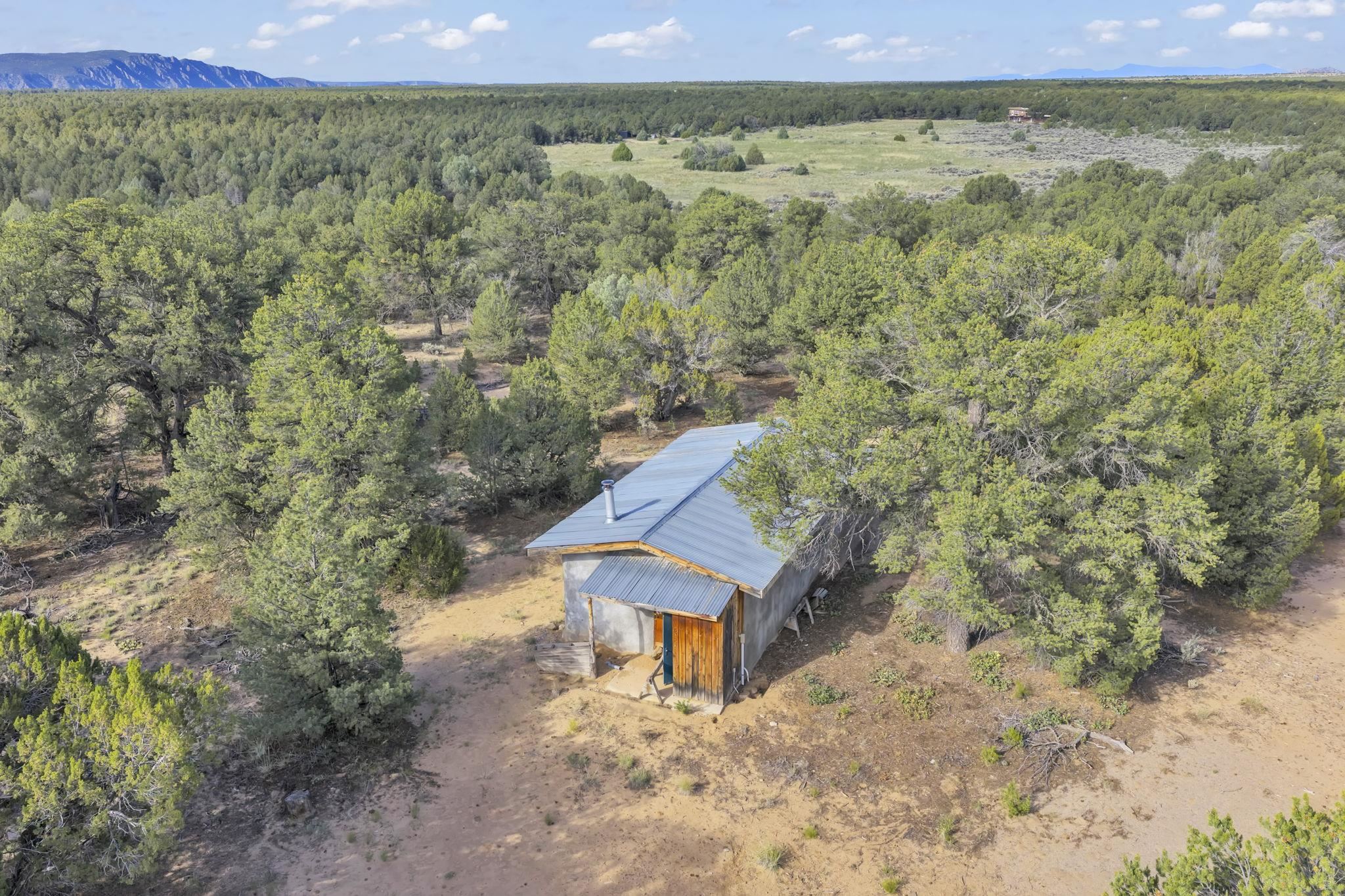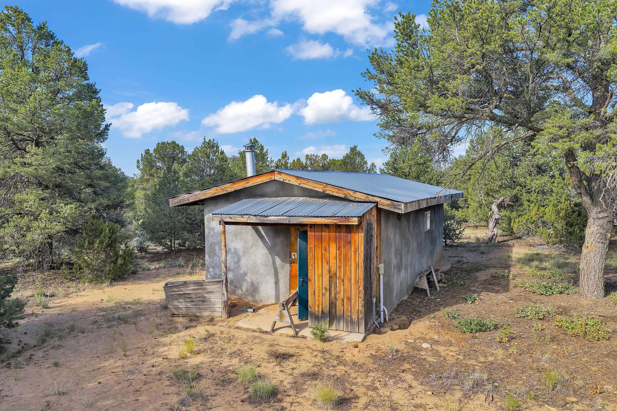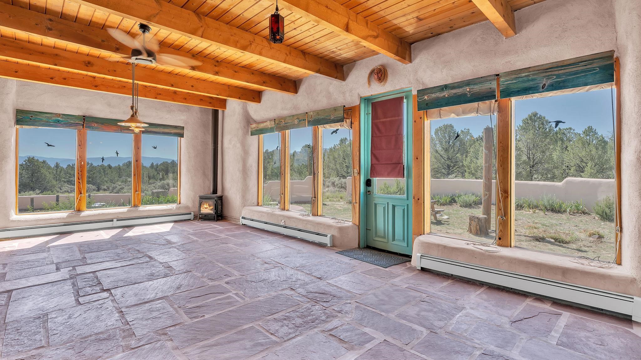 Extraordinary High Desert Property in Carson Near the Petaca ~ 77 North Road is an exceptional off-grid sanctuary in Carson, New Mexico close to the Rio Grande, Ojo Caliente, and minutes from the Petaca. This 2-story Territorial-style home sits on 20 private acres of mature piñon & juniper forest that offers unmatched tranquility. The home is powered by solar photovoltaics with brand new lithium batteries, and its very own private water Well. A rare find in this part of the world. Downstairs you have expansive South and East-facing windows that maximize passive solar warmth while also showcasing stunning views of Taos Mountain and the Sangre de Cristo Mountain Range. The open living-dining area boasts massive ceiling beams, flagstone, and tile floors with a stunning stair case that is art of its own. The kitchen includes a propane range, oven and refrigerator, with desirable wood cabinetry; a space the chef in the household will adore. The primary heat source comes from hot water in-floor heating, baseboards, and supplemental heat from a powerful wood-burning stove. Upstairs, the spacious primary bedroom features pine wood floors, a walk-in closet, and bonus meditation, office, or additional storage space. The half-bath upstairs includes a lovely clawfoot bathtub beside a window with the best views yet, and downstairs you'll find the shower. Walk outside under a covered portal beside the enclosed battery and generator room, and a detached laundry room. The front of the home features a low-walled lush courtyard with more exquisite views, and not far from the home you will find a 15' x 30' straw bale casita that can be transformed to whatever the heart desires. Wildlife, like elk, deer, and coyote, are your neighbors along with numerous bird species that perch up on the bush top daily. Internet is available via TaosNet. The home has been virtually staged to spark design creativity. This is your chance to own a magical 20 acre property in the New Mexico High Desert, don't miss it!