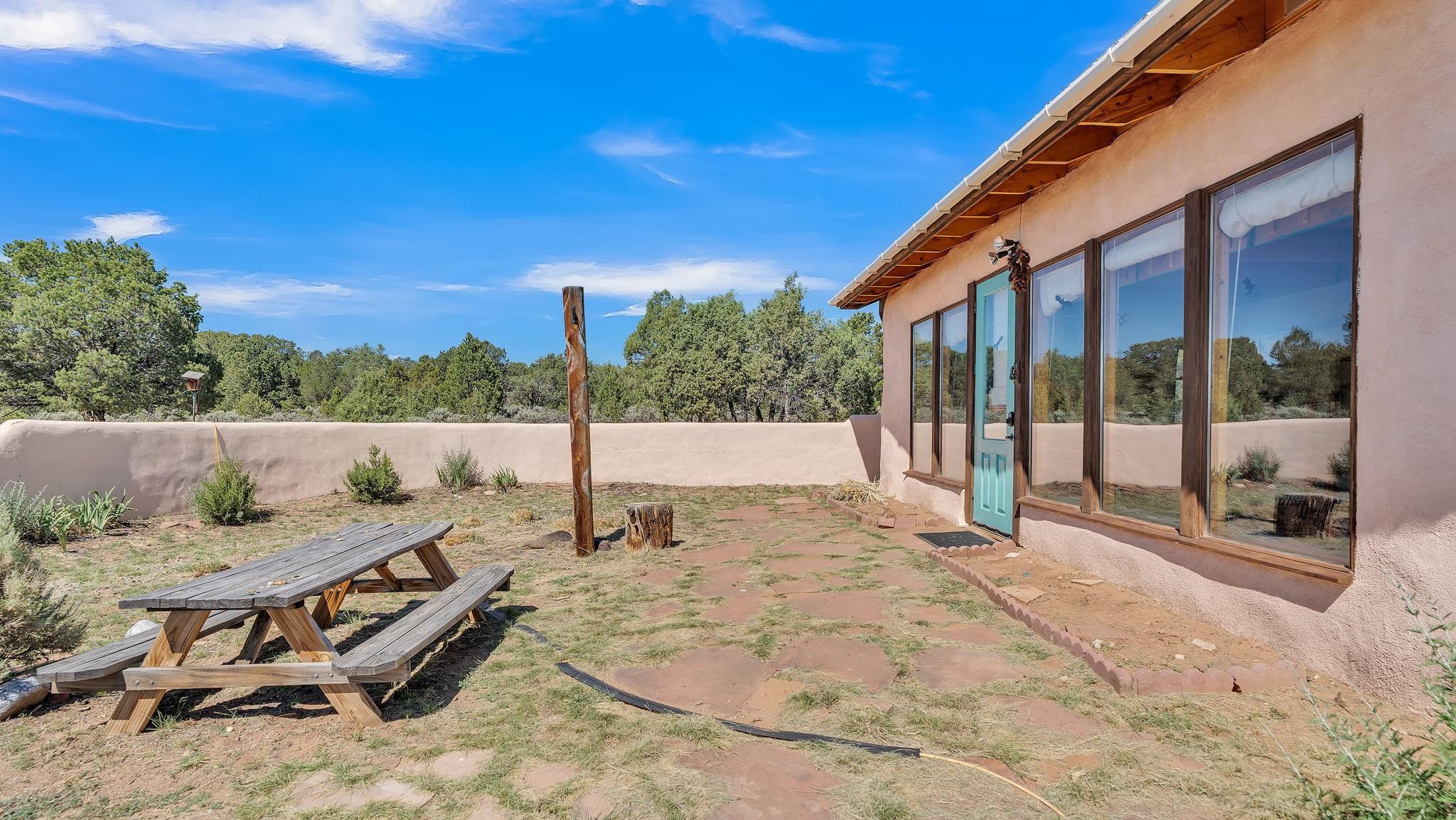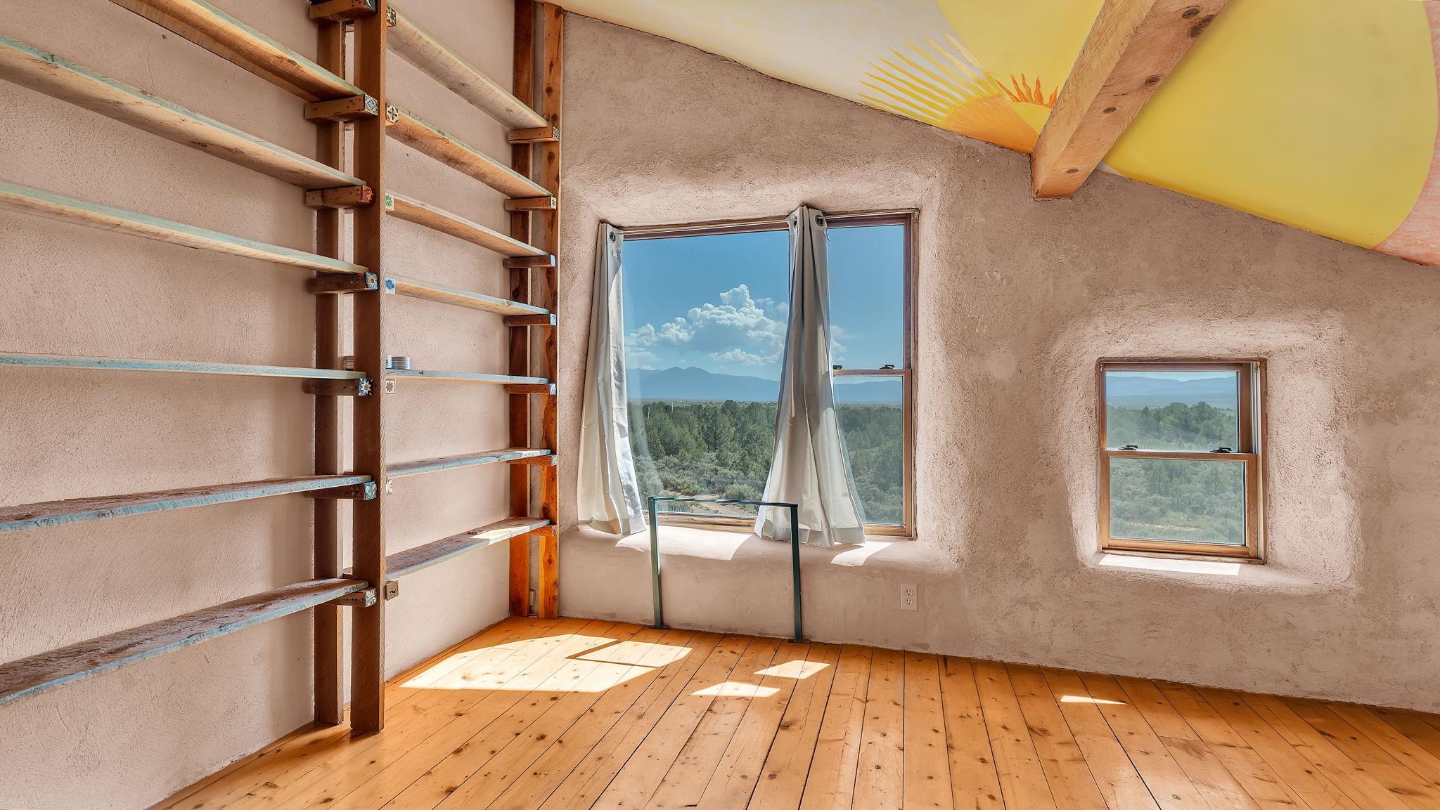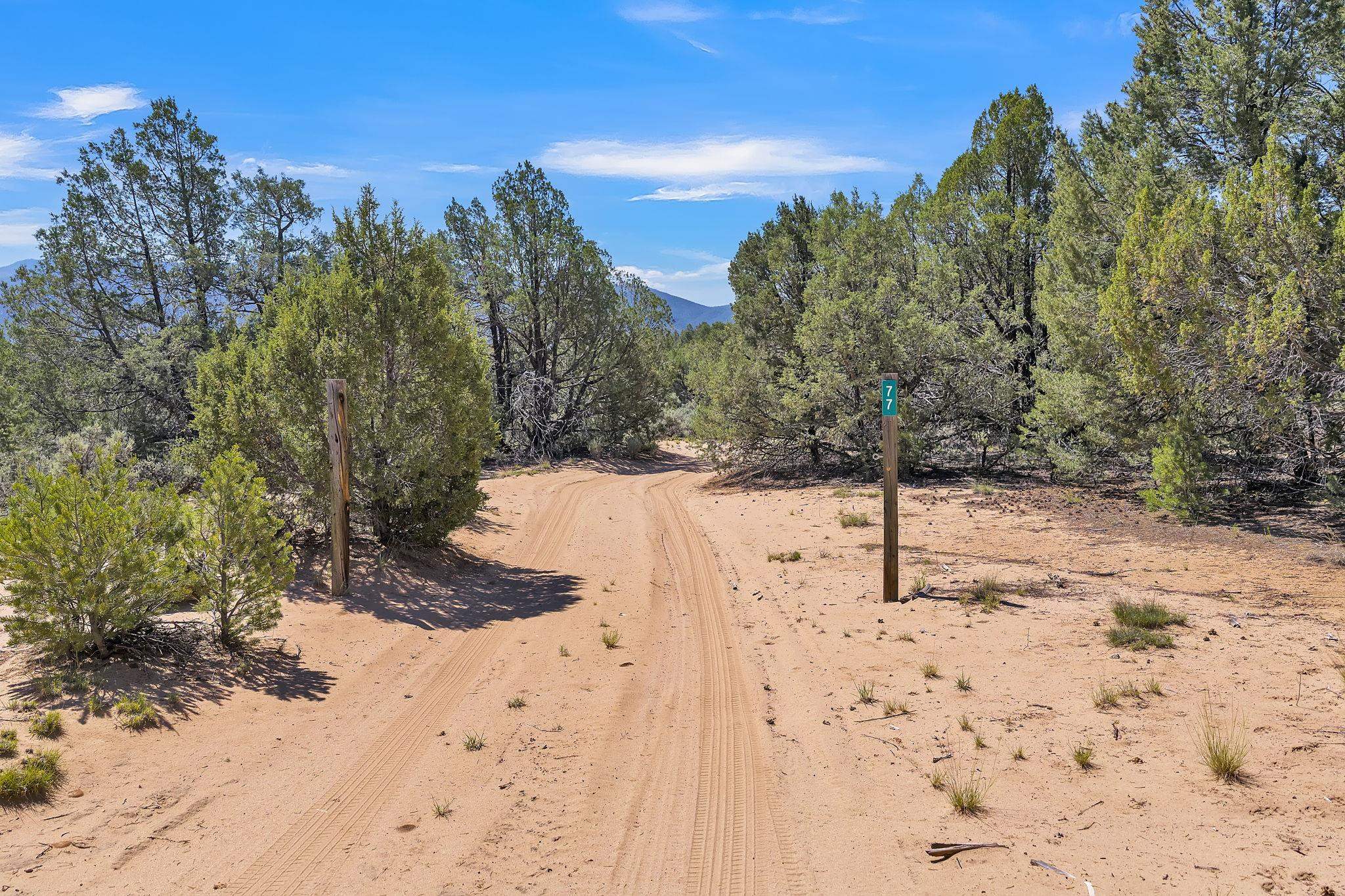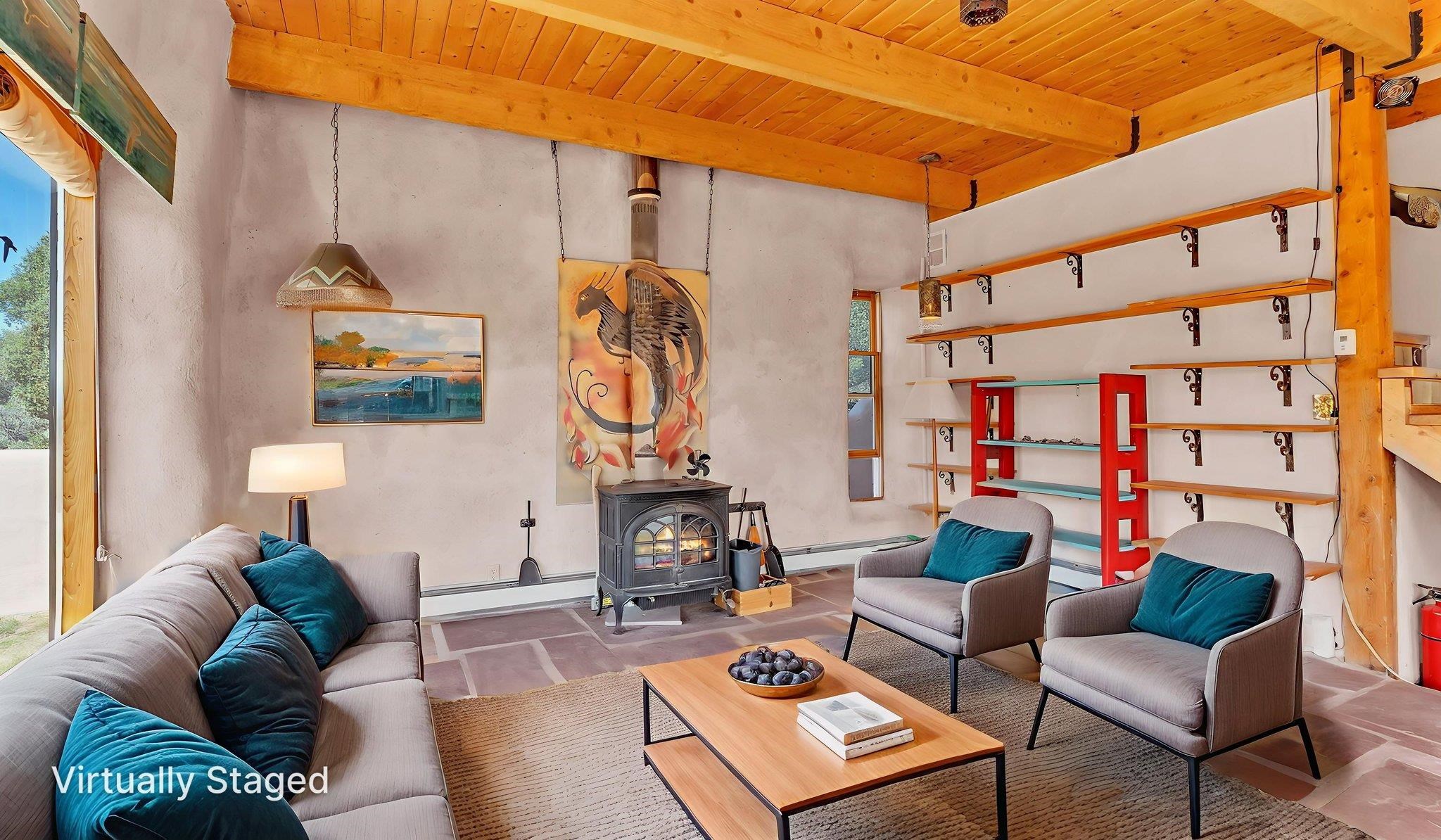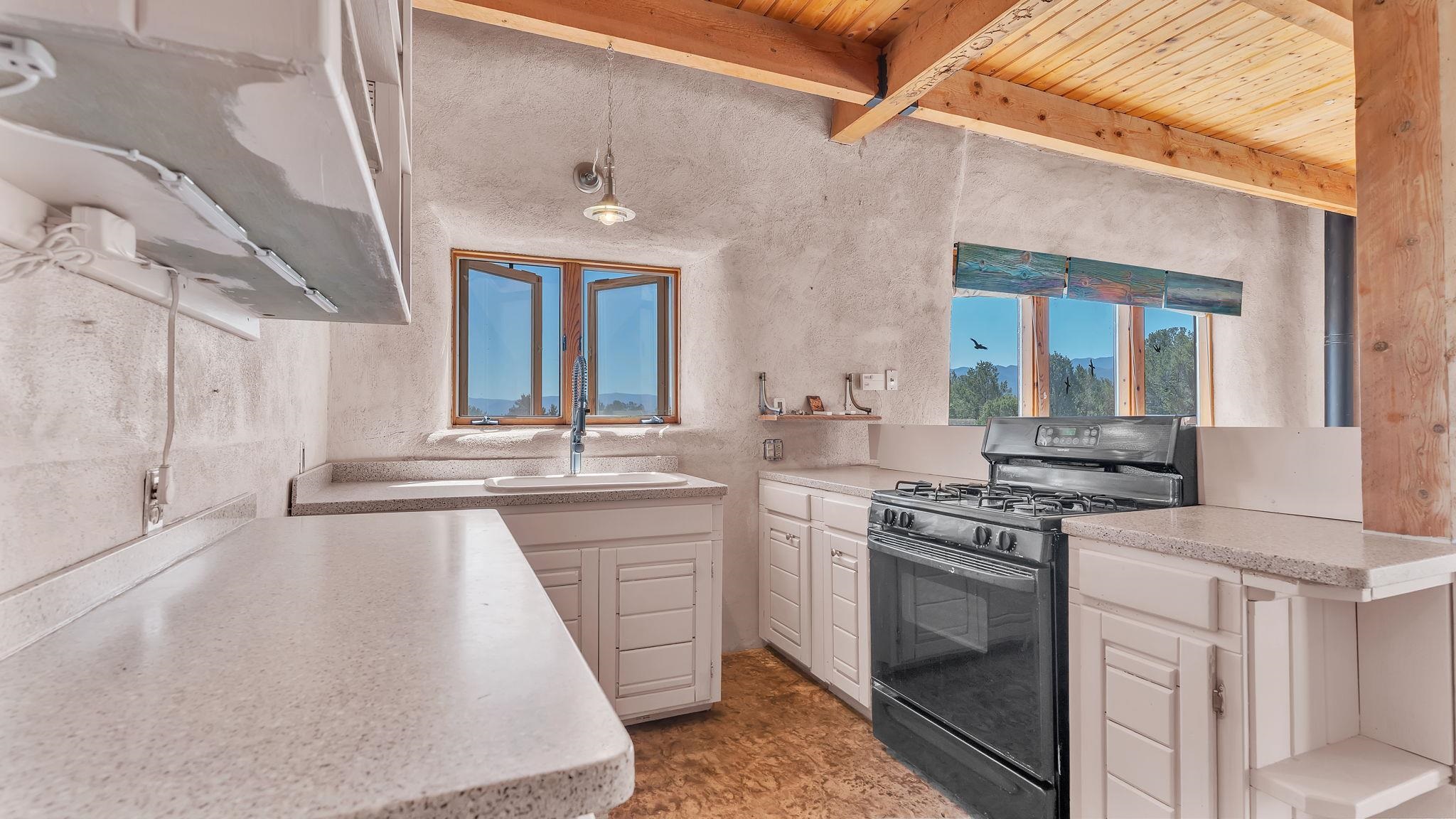 Extraordinary High Desert Property in Carson Near the Petaca ~ 77 North Road is an exceptional off-grid sanctuary in Carson, New Mexico close to the Rio Grande, Ojo Caliente, and minutes from the Petaca. This 2-story Territorial-style home sits on 20 private acres of mature piñon & juniper forest that offers unmatched tranquility. The home is powered by solar photovoltaics with brand new lithium batteries, and its very own private water Well. A rare find in this part of the world. Downstairs you have expansive South and East-facing windows that maximize passive solar warmth while also showcasing stunning views of Taos Mountain and the Sangre de Cristo Mountain Range. The open living-dining area boasts massive ceiling beams, flagstone, and tile floors with a stunning stair case that is art of its own. The kitchen includes a propane range, oven and refrigerator, with desirable wood cabinetry; a space the chef in the household will adore. The primary heat source comes from hot water in-floor heating, baseboards, and supplemental heat from a powerful wood-burning stove. Upstairs, the spacious primary bedroom features pine wood floors, a walk-in closet, and bonus meditation, office, or additional storage space. The half-bath upstairs includes a lovely clawfoot bathtub beside a window with the best views yet, and downstairs you'll find the shower. Walk outside under a covered portal beside the enclosed battery and generator room, and a detached laundry room. The front of the home features a low-walled lush courtyard with more exquisite views, and not far from the home you will find a 15' x 30' straw bale casita that can be transformed to whatever the heart desires. Wildlife, like elk, deer, and coyote, are your neighbors along with numerous bird species that perch up on the bush top daily. Internet is available via TaosNet. The home has been virtually staged to spark design creativity. This is your chance to own a magical 20 acre property in the New Mexico High Desert, don't miss it!