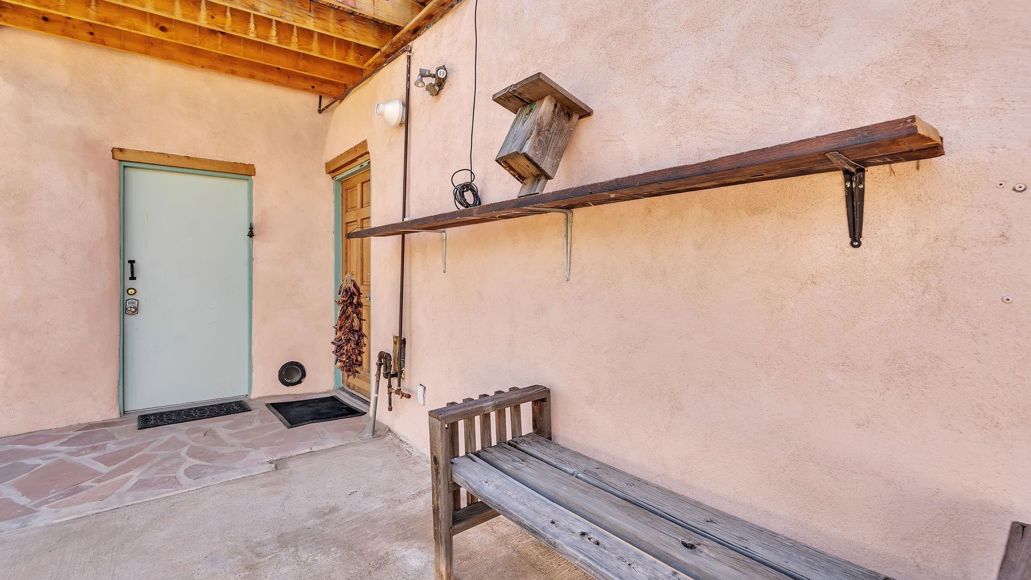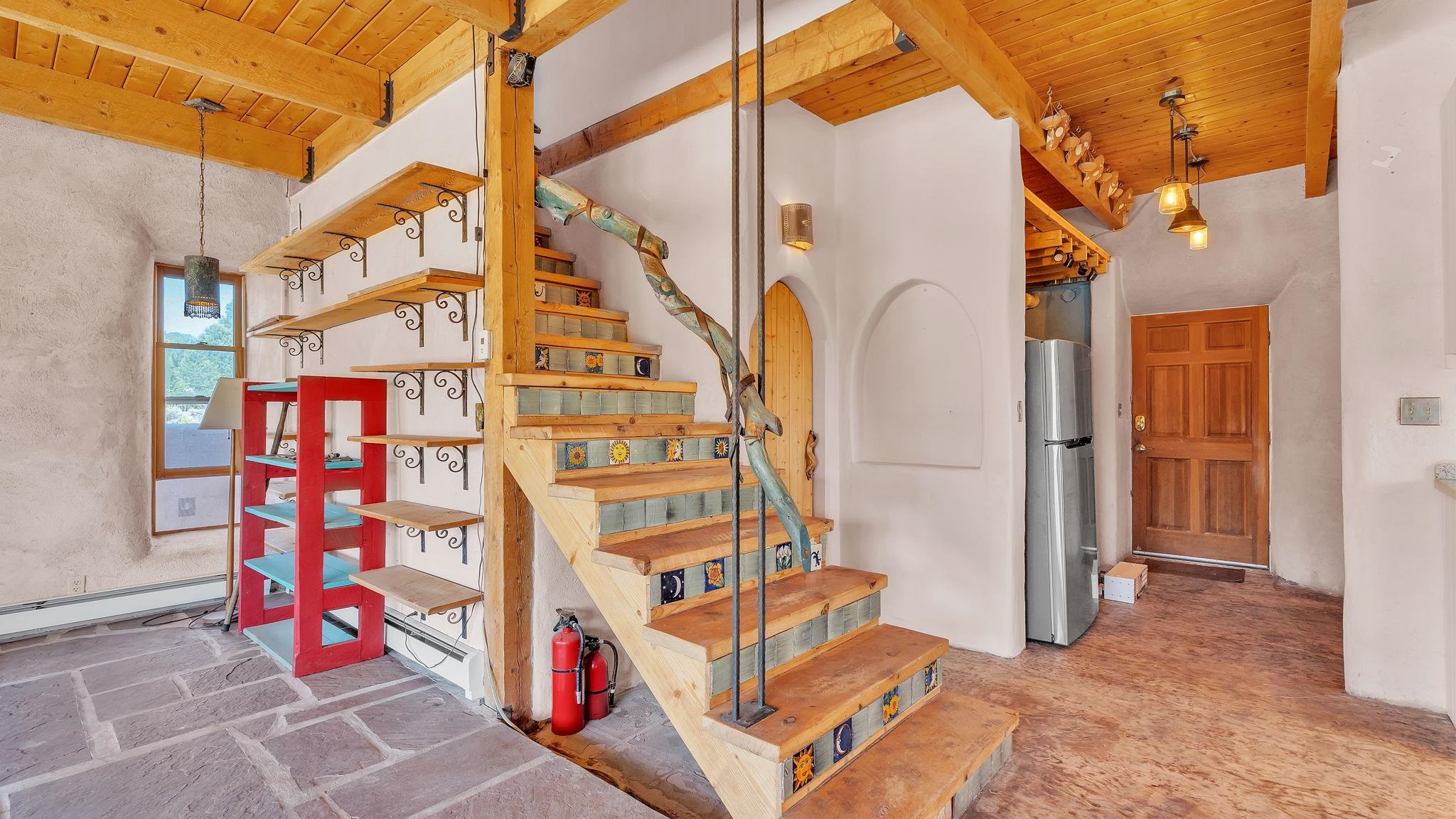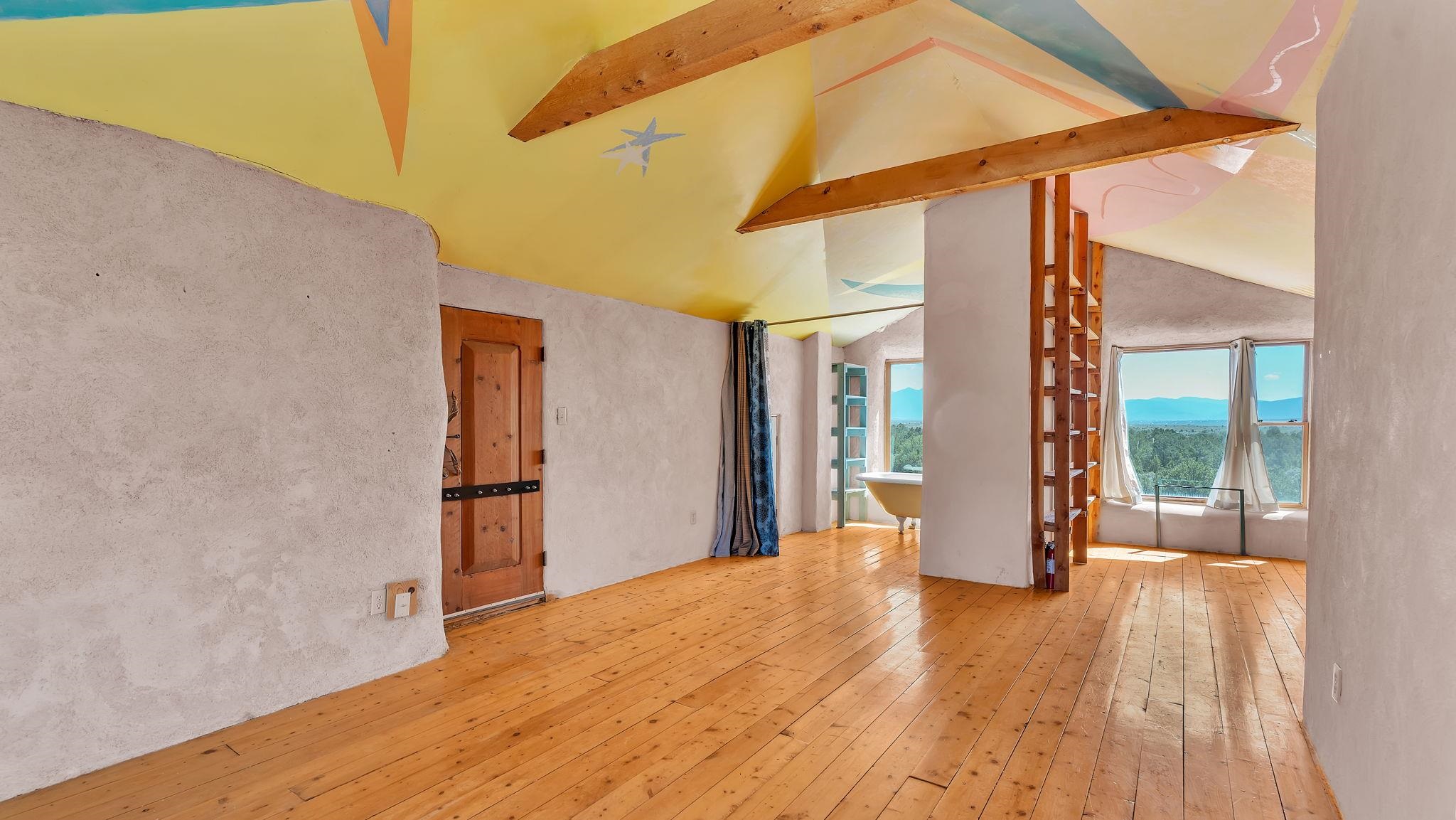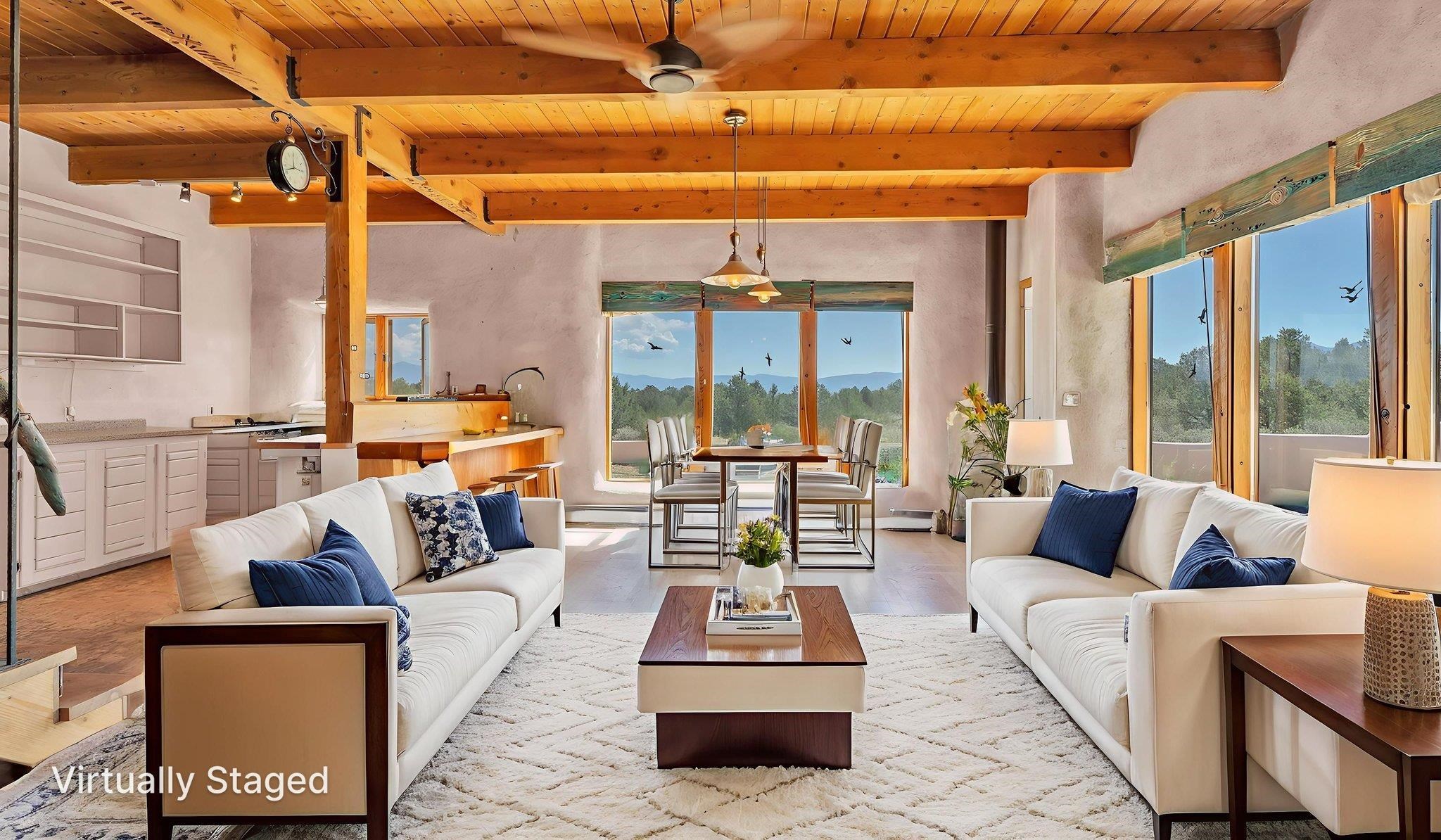 Extraordinary High Desert Property in Carson Near the Petaca ~ 77 North Road is an exceptional off-grid sanctuary in Carson, New Mexico close to the Rio Grande, Ojo Caliente, and minutes from the Petaca. This 2-story Territorial-style home sits on 20 private acres of mature piñon & juniper forest that offers unmatched tranquility. The home is powered by solar photovoltaics with brand new lithium batteries, and its very own private water Well. A rare find in this part of the world. Downstairs you have expansive South and East-facing windows that maximize passive solar warmth while also showcasing stunning views of Taos Mountain and the Sangre de Cristo Mountain Range. The open living-dining area boasts massive ceiling beams, flagstone, and tile floors with a stunning stair case that is art of its own. The kitchen includes a propane range, oven and refrigerator, with desirable wood cabinetry; a space the chef in the household will adore. The primary heat source comes from hot water in-floor heating, baseboards, and supplemental heat from a powerful wood-burning stove. Upstairs, the spacious primary bedroom features pine wood floors, a walk-in closet, and bonus meditation, office, or additional storage space. The half-bath upstairs includes a lovely clawfoot bathtub beside a window with the best views yet, and downstairs you'll find the shower. Walk outside under a covered portal beside the enclosed battery and generator room, and a detached laundry room. The front of the home features a low-walled lush courtyard with more exquisite views, and not far from the home you will find a 15' x 30' straw bale casita that can be transformed to whatever the heart desires. Wildlife, like elk, deer, and coyote, are your neighbors along with numerous bird species that perch up on the bush top daily. Internet is available via TaosNet. The home has been virtually staged to spark design creativity. This is your chance to own a magical 20 acre property in the New Mexico High Desert, don't miss it!
