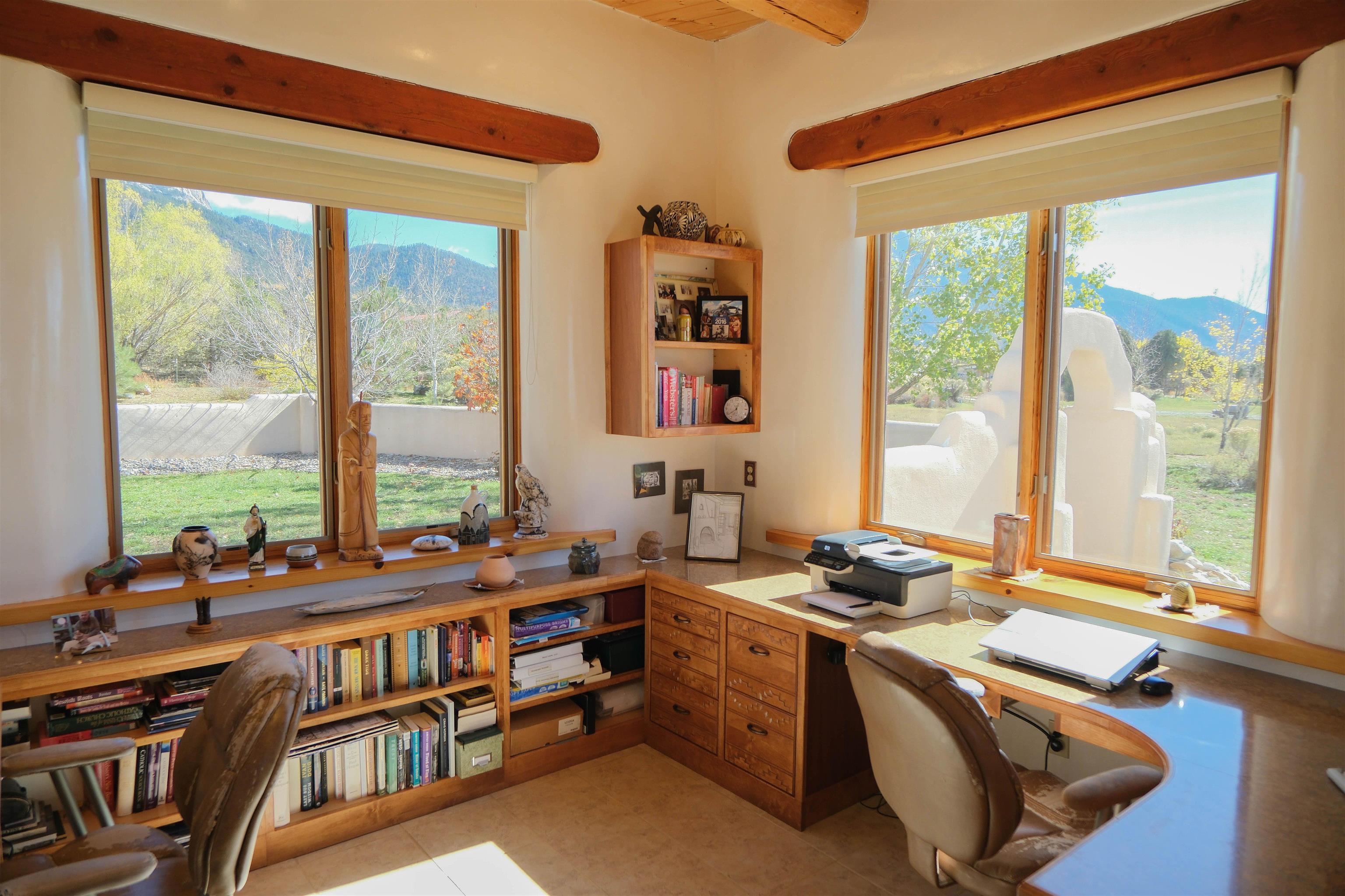 Tucked into the coveted El Salto enclave along the scenic road to Taos Ski Valley, this soulful adobe estate captures the timeless spirit of Northern New Mexico living. Set against big skies and high-desert light, the home enjoys classic Southwestern touches and stunning views in every direction. Authentic adobe construction grounds the main residence in warmth and character, with thick earthen walls, viga ceilings, diamond finish plaster, custom carved built-ins and handcrafted traditional details throughout. The main house has two beds, two baths, a fantastic chef's kitchen, an office nook with stunning, direct views of El Salto Mountain, front and back portals designed for slow mornings and golden-hour evenings, and a heated attached garage with a built-in work bench. To the side of the primary residence is a wonderful, large shady Ramada with a sunken-firepit-a perfect place to gather with friends and family under the large, expansive starry sky. The property unfolds as a true compound: the charming guest house with a full kitchen is wonderful for visitors or rental potential. The guesthouse also has a dedicated workshop for creative or practical pursuits, and an additional attached garage. There is a 3-bay pole barn on the Western edge of the property, ideal for storing equipment, and all the gear you will want to support the outdoor recreating opportunities that are literally right outside your door. 8 Juan Martinez is located at the mouth of the canyon that connects to Taos Ski Valley- 15 minutes and you're at the base of one of the best Ski and snowboard resorts in the Rockies! This custom home has been lovingly maintained by the original Owner who has created many of the custom finishes that grace this property on-site. Valuable water rights enhance both lifestyle and long-term value, supporting gardens, land stewardship, or future vision. Private, grounded, and rich with character, this El Salto offering is perfectly positioned for those who want serene mountain living with quick access to skiing, hiking, and the cultural heartbeat of Taos. A rare blend of authenticity, versatility, and location—this is Northern New Mexico living at its most genuine.
