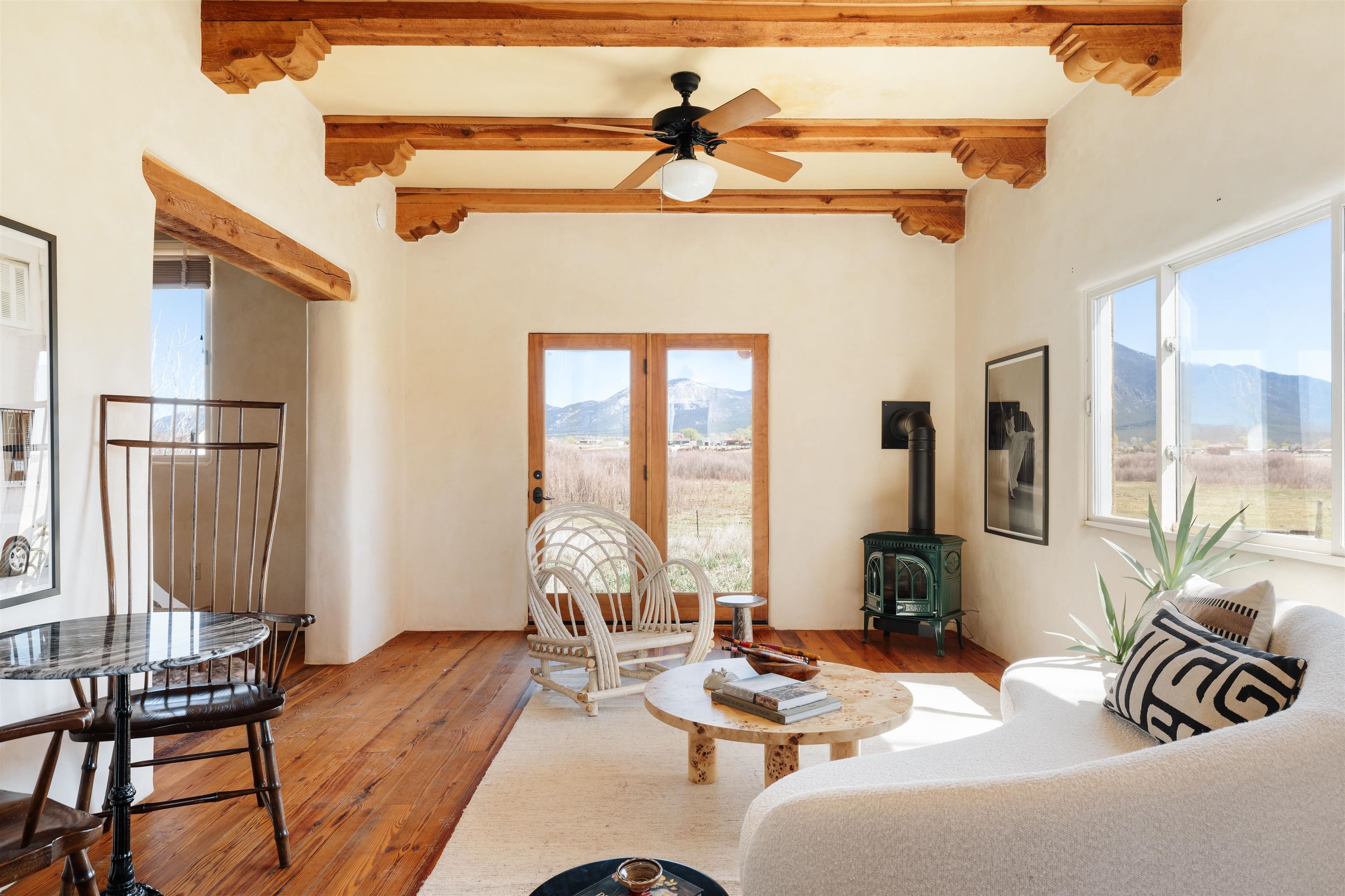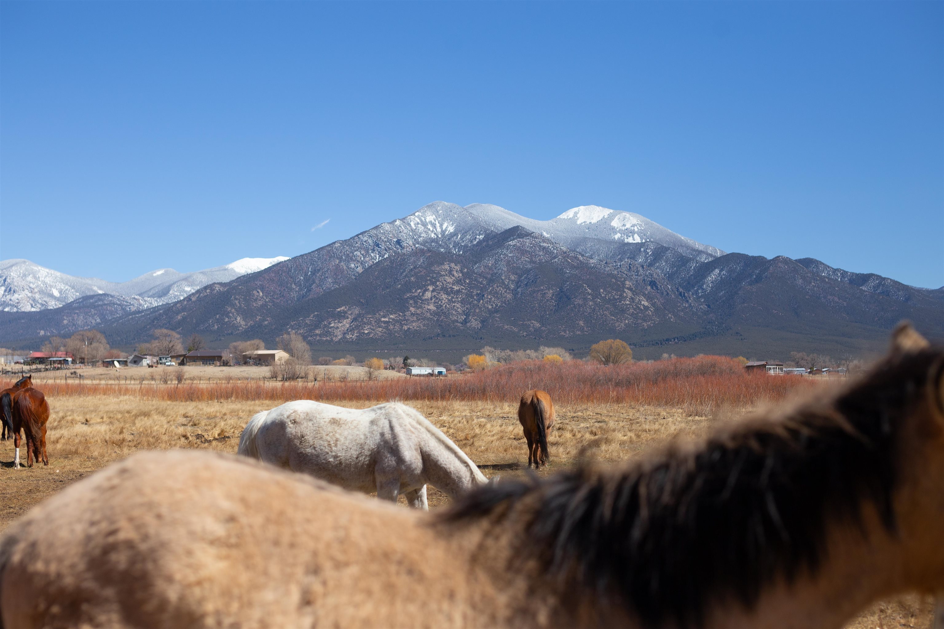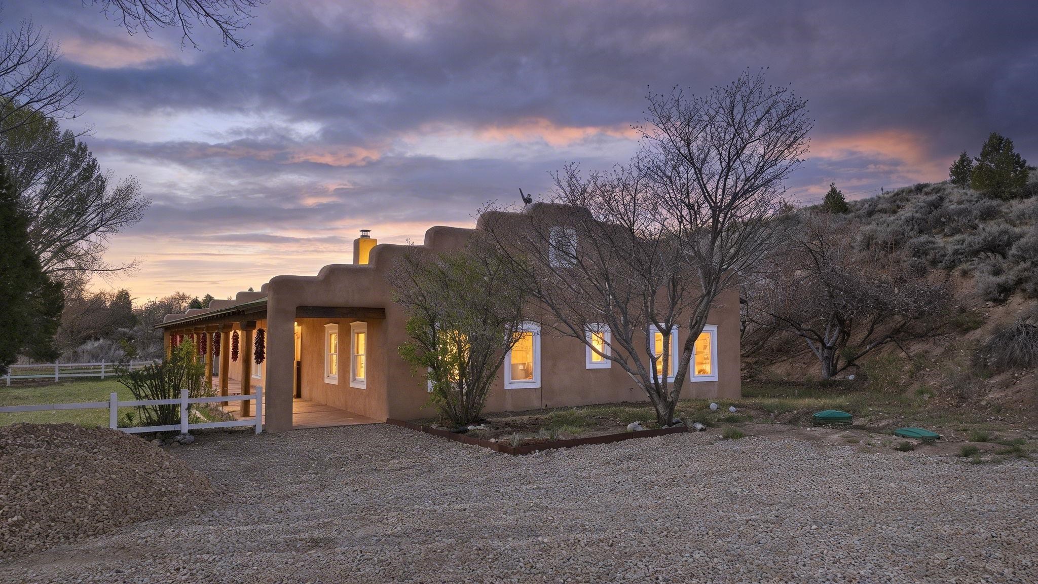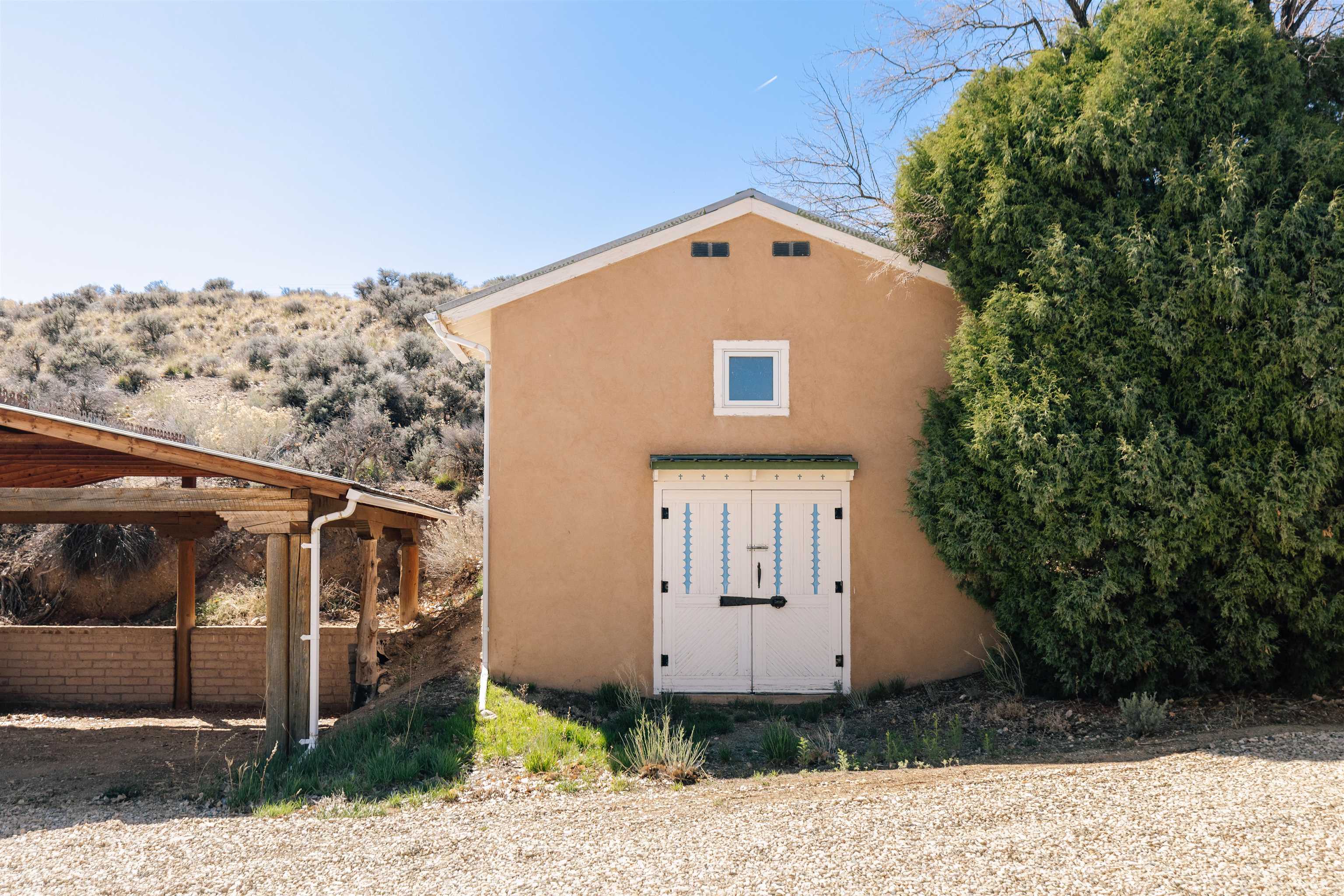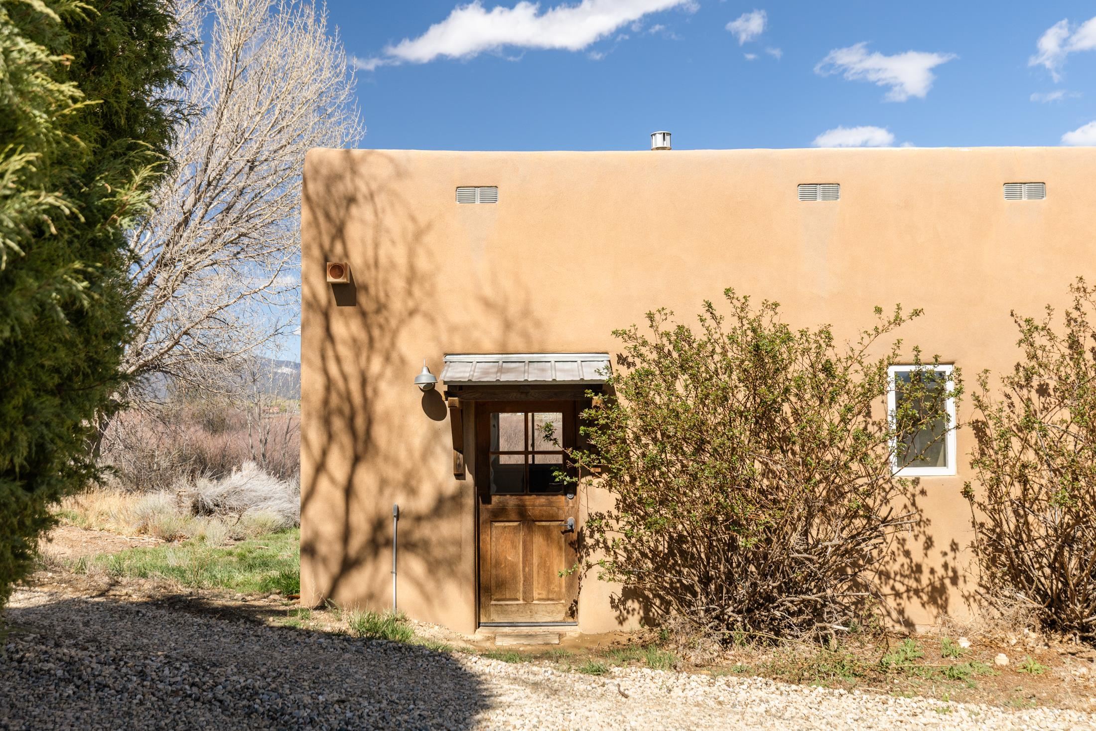 Main Home (4 beds 2 baths) Taos magic is unveiled at the end of a private road on 6.5 sprawling acres, where a fully renovated, turn key residence is wrapped in unobstructed views of Taos Mountain. Bordered by protected horse land, the enchantment of this residence is enhanced by its enduring privacy. The 80-foot covered portal transports visitors from the wild surrounding landscape into remarkable interiors, where Southwestern character blends with modern refinement in the form of upgraded electrical, new hardware, and curated lighting throughout. Radiant heated saltillo tile floors, 18-inch traditional adobe walls, a corner kiva fireplace, and showstopping wood & beam ceilings work in harmony to craft a motif that is both time-honored and luxurious. An easy flow between each of these well-appointed spaces leads to a chef’s kitchen with KitchenAid and Bosch appliances, Aravalli stone countertops with a waterfall edge, a custom high-capacity vent hood, farmhouse sink, and brass hardware, all illuminated by Visual Comfort designer pendants. The bedrooms are a masterclass in Southwestern refinement, and the bathrooms are equally elevated with Carrera marble, Zellige tile, and custom finishes. Floor-to-ceiling, south-facing windows infuse the sunroom with cascades of natural light, setting the stage for mornings with a favorite book, and evenings tending to your own indoor garden. Behind the scenes, thoughtful upgrades include a new additional septic system, freshly painted trim, and smart Nest thermostats throughout that ensure both beauty and functionality. A two-story freestanding shed with a loft provides generous additional storage, while a covered two-car carport with fresh gravel ensures ease and convenience. Guest Home (1 bed 1 bath) Privately situated to capture the same sweeping views, the detached guest house offers a charming 1-bedroom, 1-bath retreat, or rental. With abundant natural light and a sense of quiet independence, it’s ideal for hosting guests or for extended stays. An open kitchen featuring vintage Chambers stove, adds to the guest home’s value. A 300 sqft expansive attached storage and workshop area adds versatility and potential for creative art space, gym, or functional use. Surrounded by sweeping meadows, red willow, and the striking silhouette of the Sangre de Cristo Mountains, the property offers a rare connection to both nature and heritage. With Taos Plaza, the Rio Grande, and Taos Ski Valley just minutes away, the location balances serenity with accessibility. Moments here are defined by shifting light across the mountains, the quiet movement of horses in the distance, and the timeless beauty of the high desert. It is an atmosphere that is both grounding and inspiring.