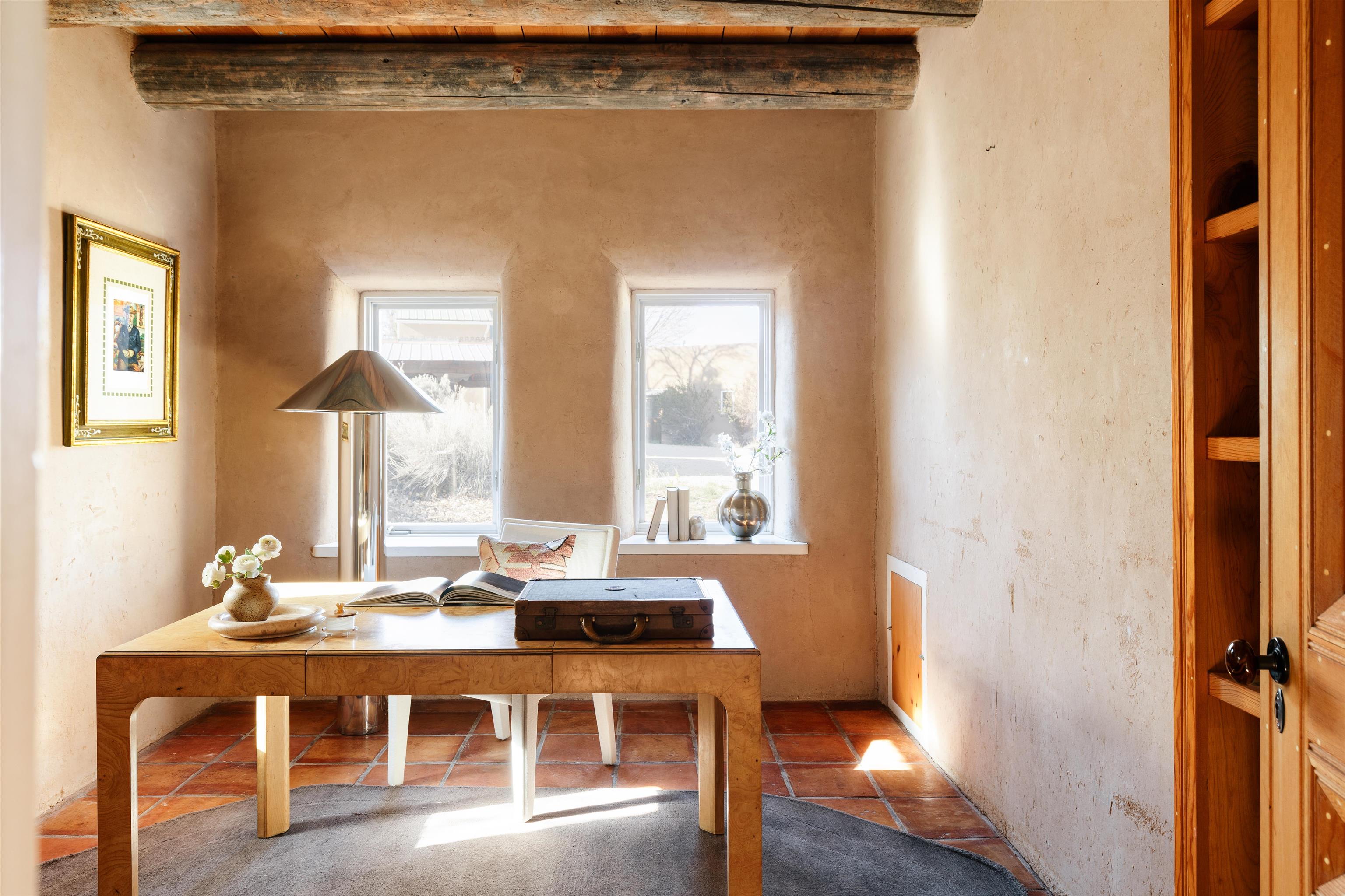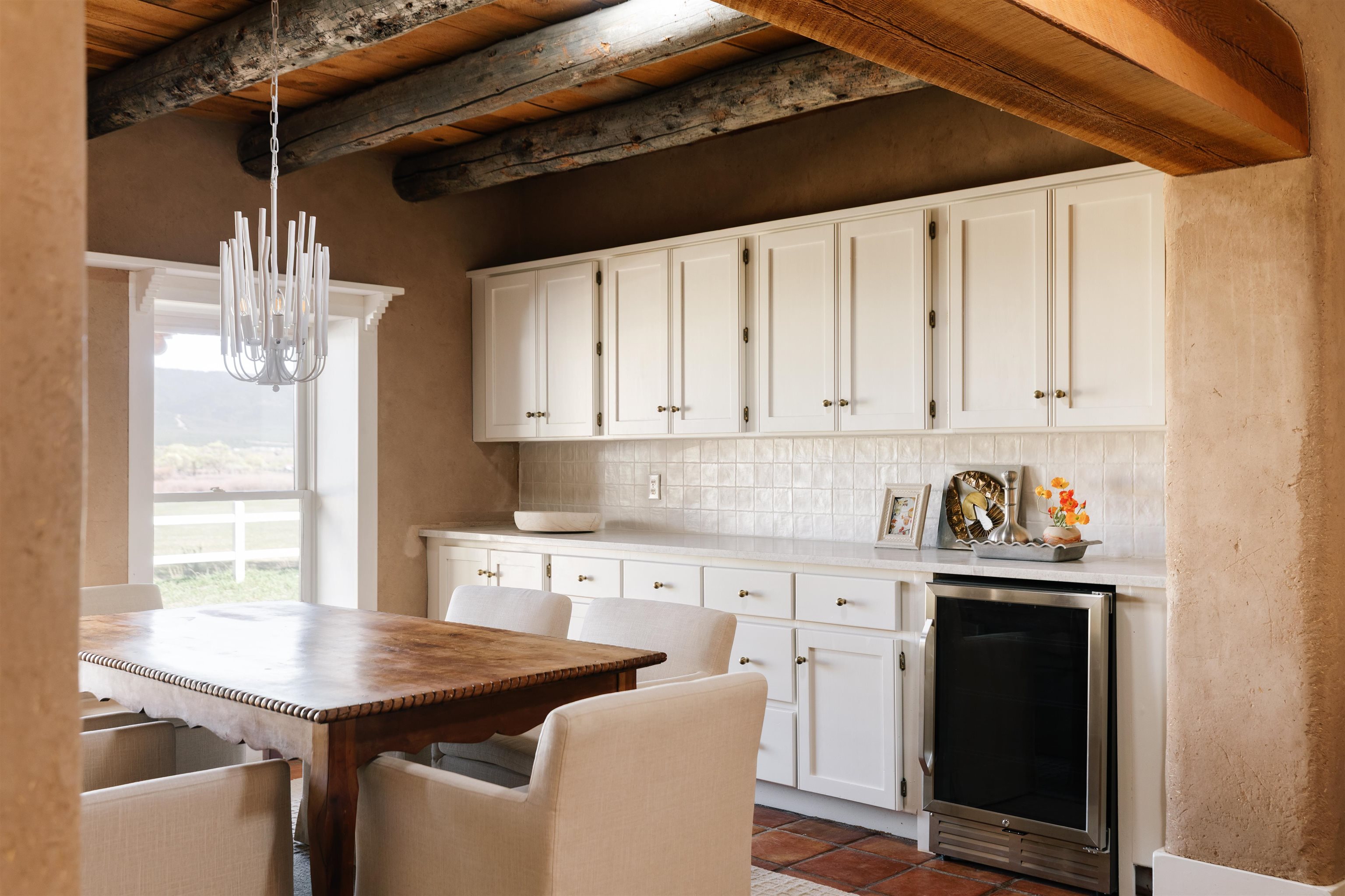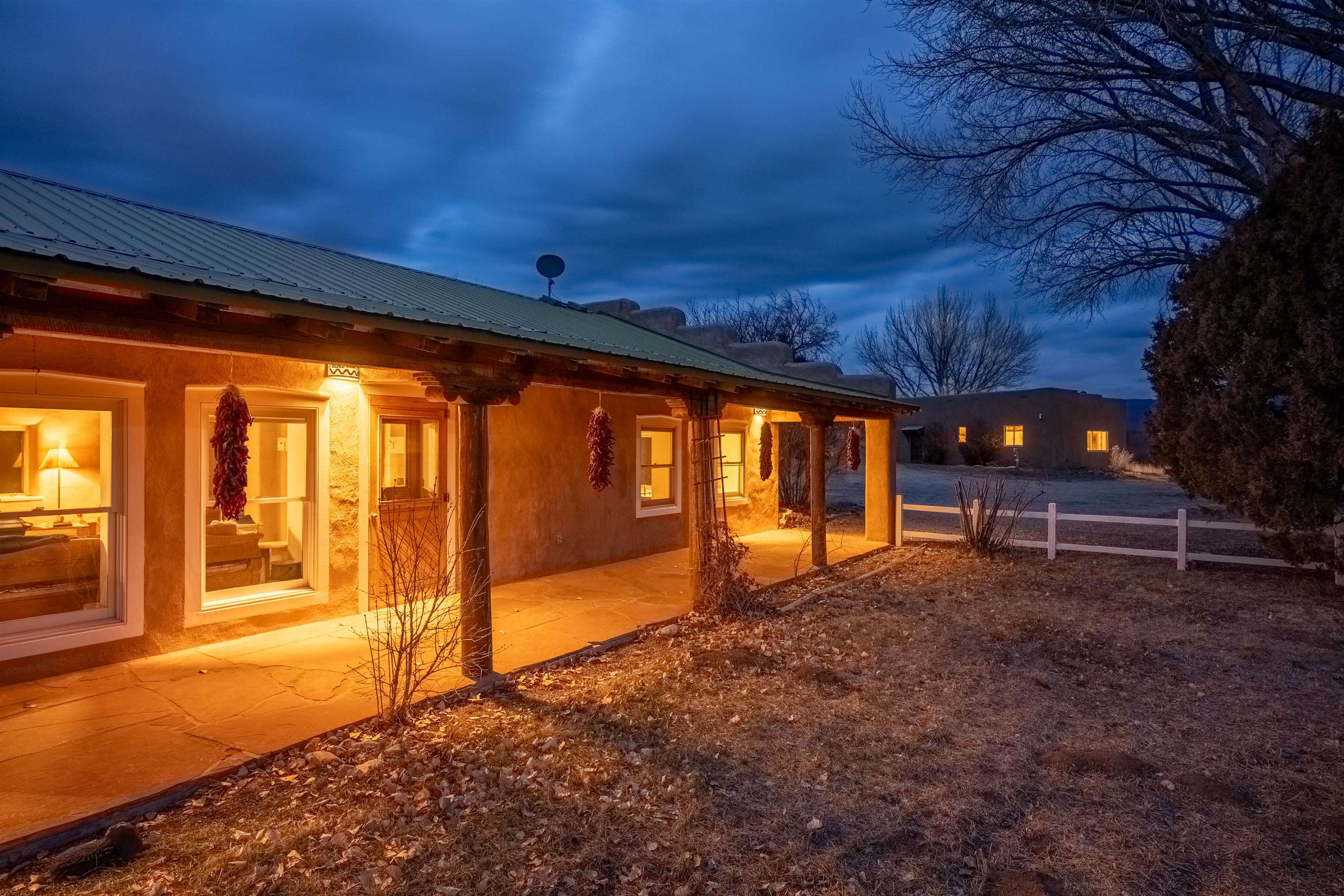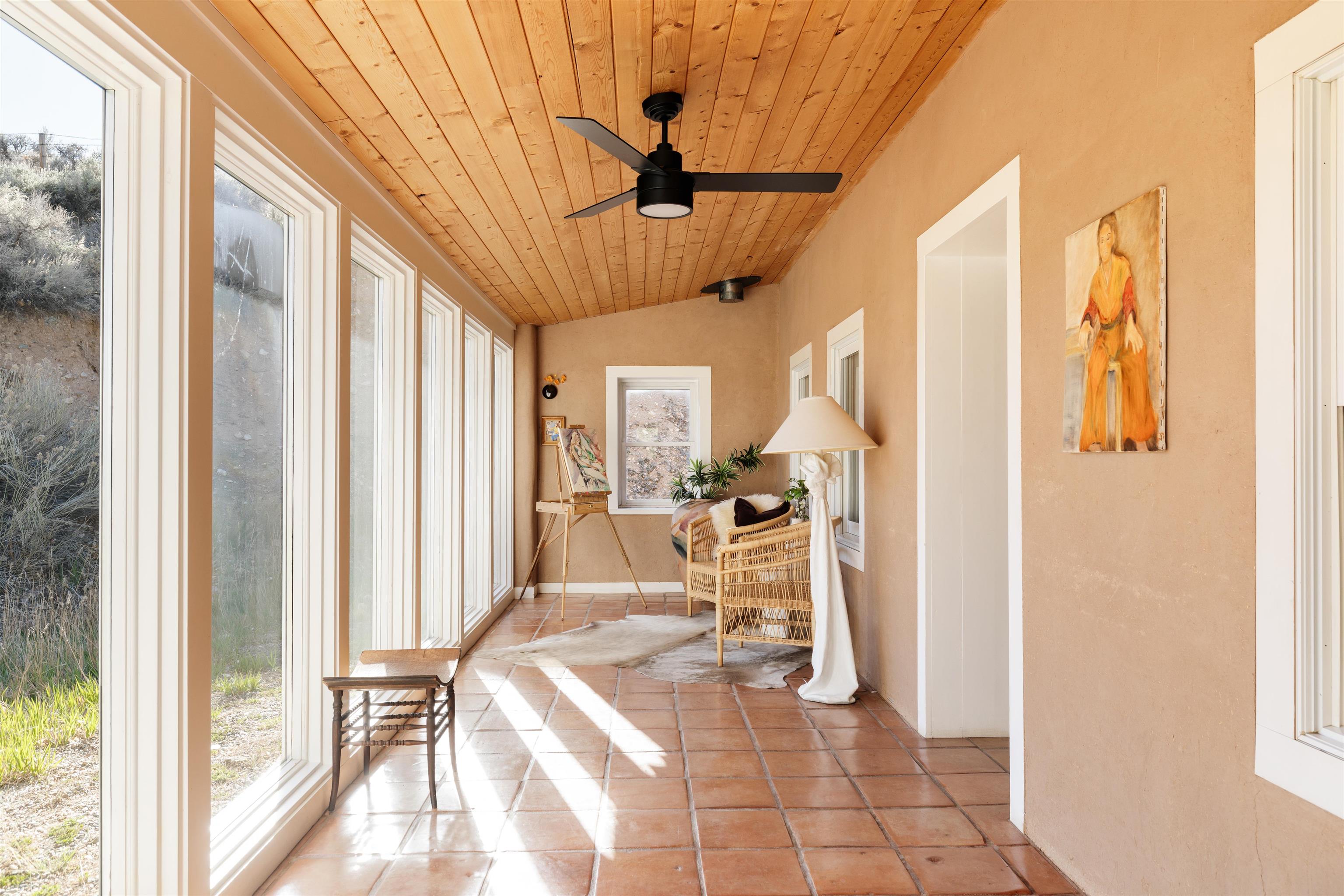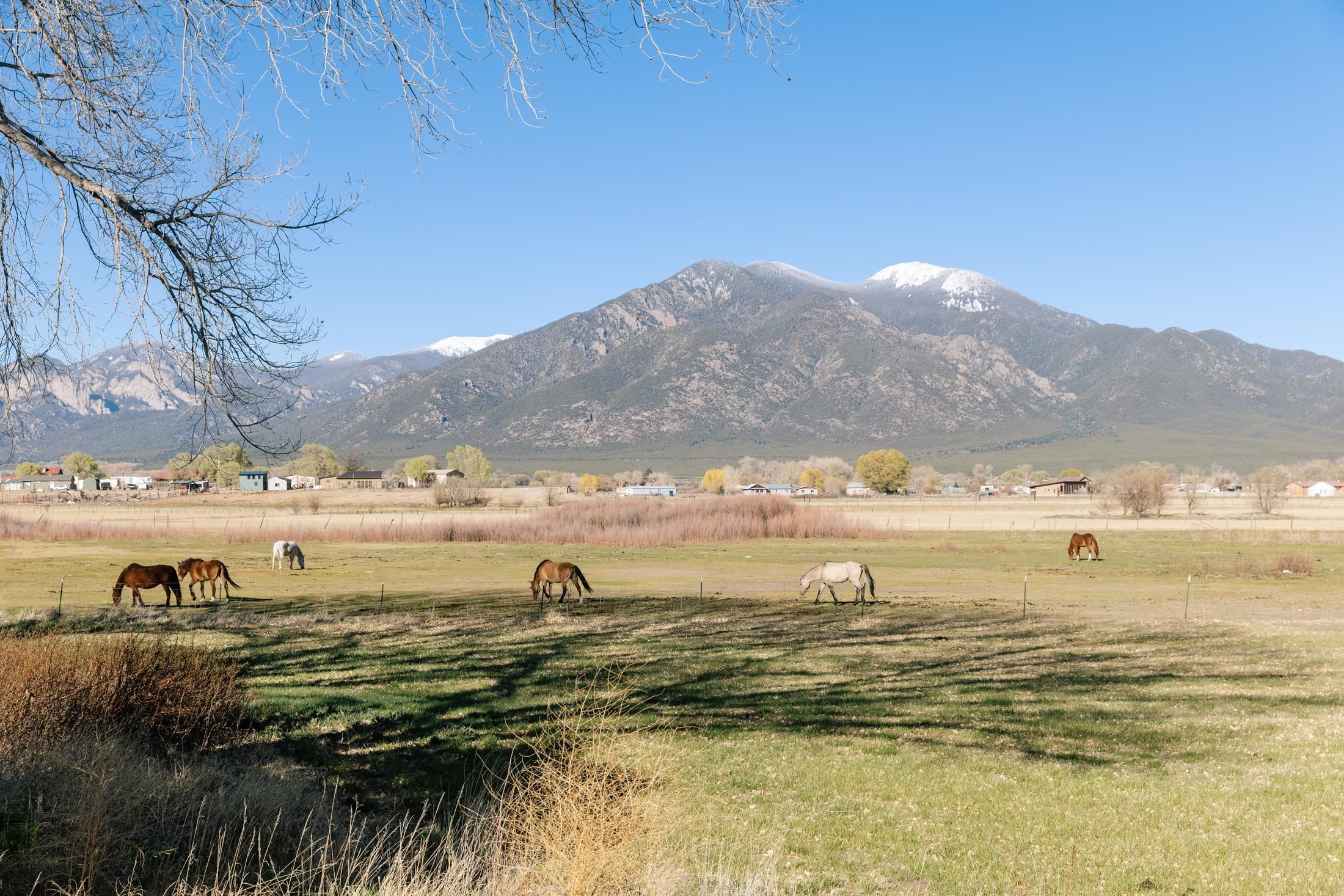 Main Home (4 beds 2 baths) Taos magic is unveiled at the end of a private road on 6.5 sprawling acres, where a fully renovated, turn key residence is wrapped in unobstructed views of Taos Mountain. Bordered by protected horse land, the enchantment of this residence is enhanced by its enduring privacy. The 80-foot covered portal transports visitors from the wild surrounding landscape into remarkable interiors, where Southwestern character blends with modern refinement in the form of upgraded electrical, new hardware, and curated lighting throughout. Radiant heated saltillo tile floors, 18-inch traditional adobe walls, a corner kiva fireplace, and showstopping wood & beam ceilings work in harmony to craft a motif that is both time-honored and luxurious. An easy flow between each of these well-appointed spaces leads to a chef’s kitchen with KitchenAid and Bosch appliances, Aravalli stone countertops with a waterfall edge, a custom high-capacity vent hood, farmhouse sink, and brass hardware, all illuminated by Visual Comfort designer pendants. The bedrooms are a masterclass in Southwestern refinement, and the bathrooms are equally elevated with Carrera marble, Zellige tile, and custom finishes. Floor-to-ceiling, south-facing windows infuse the sunroom with cascades of natural light, setting the stage for mornings with a favorite book, and evenings tending to your own indoor garden. Behind the scenes, thoughtful upgrades include a new additional septic system, freshly painted trim, and smart Nest thermostats throughout that ensure both beauty and functionality. A two-story freestanding shed with a loft provides generous additional storage, while a covered two-car carport with fresh gravel ensures ease and convenience. Guest Home (1 bed 1 bath) Privately situated to capture the same sweeping views, the detached guest house offers a charming 1-bedroom, 1-bath retreat, or rental. With abundant natural light and a sense of quiet independence, it’s ideal for hosting guests or for extended stays. An open kitchen featuring vintage Chambers stove, adds to the guest home’s value. A 300 sqft expansive attached storage and workshop area adds versatility and potential for creative art space, gym, or functional use. Surrounded by sweeping meadows, red willow, and the striking silhouette of the Sangre de Cristo Mountains, the property offers a rare connection to both nature and heritage. With Taos Plaza, the Rio Grande, and Taos Ski Valley just minutes away, the location balances serenity with accessibility. Moments here are defined by shifting light across the mountains, the quiet movement of horses in the distance, and the timeless beauty of the high desert. It is an atmosphere that is both grounding and inspiring.