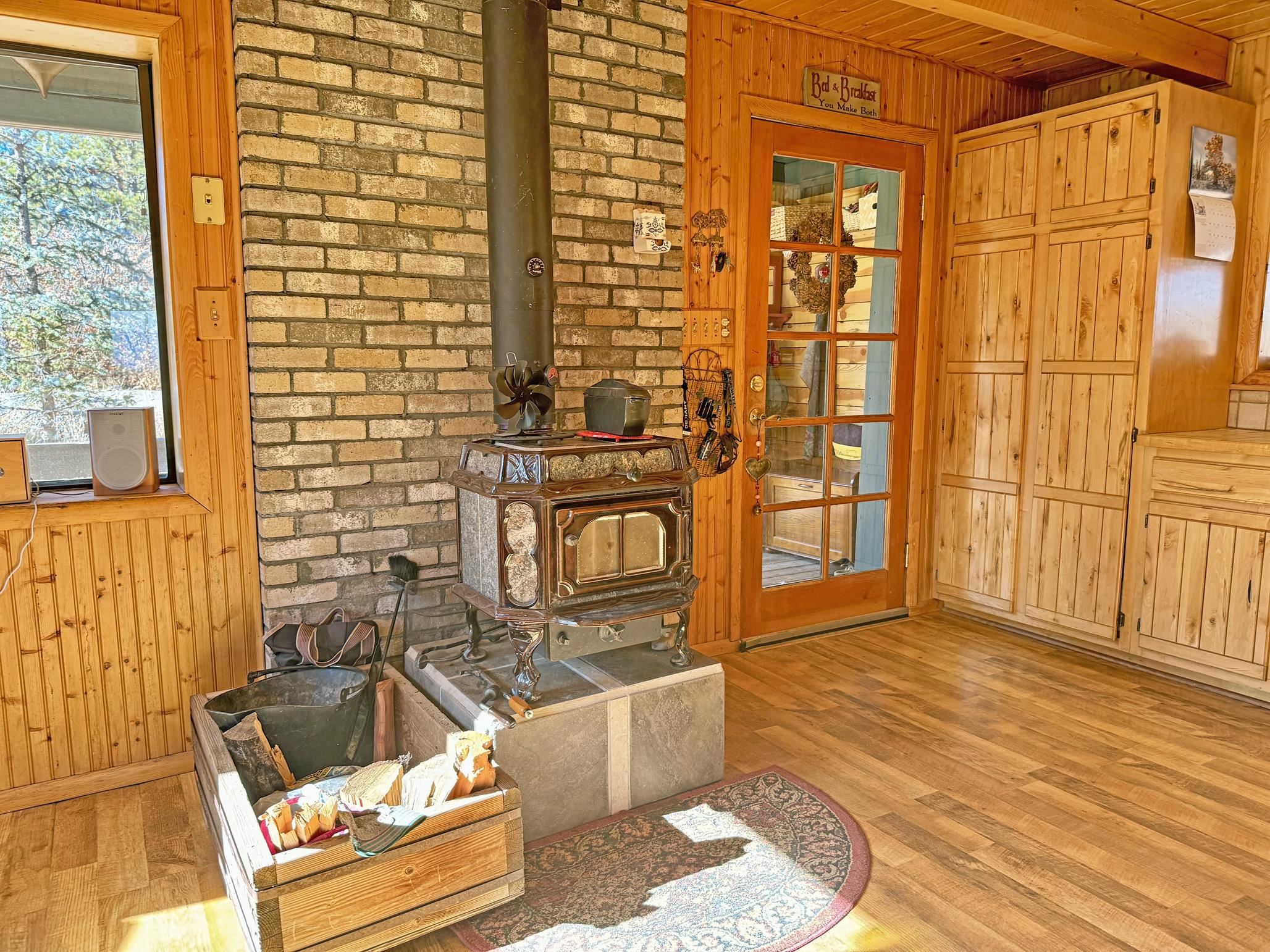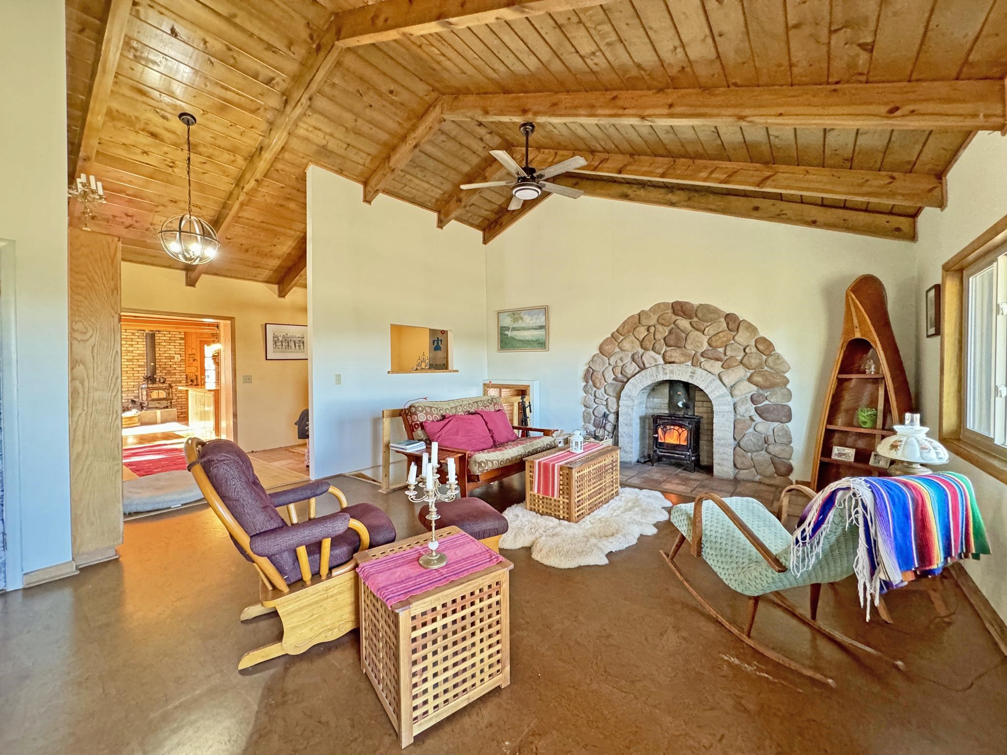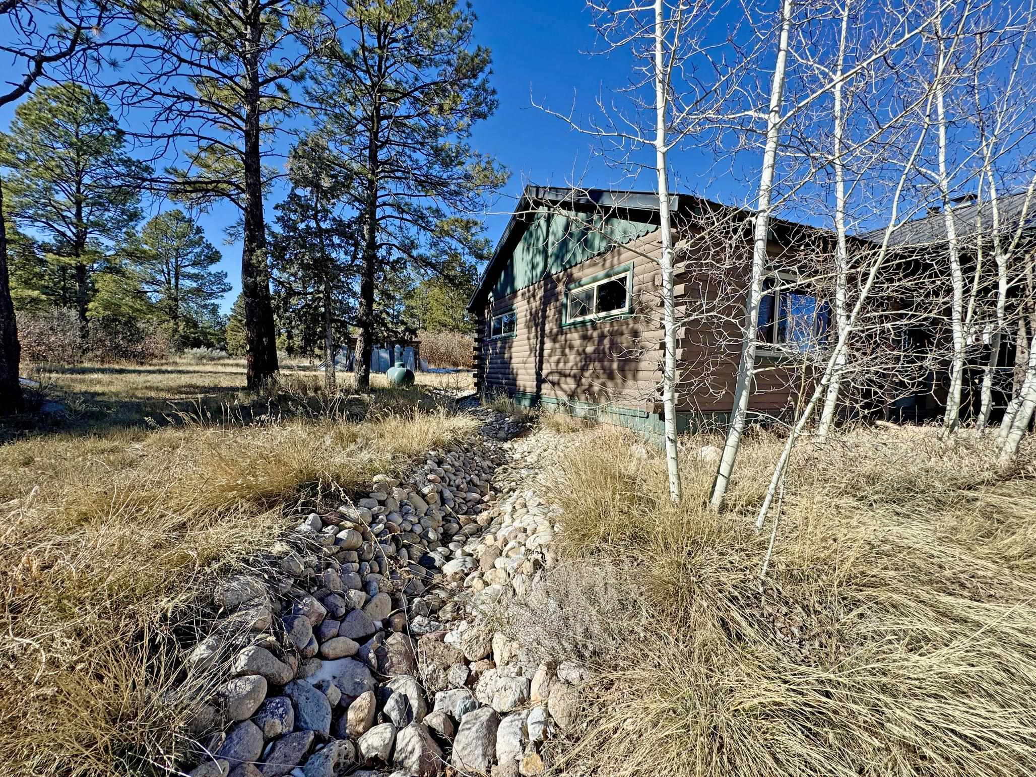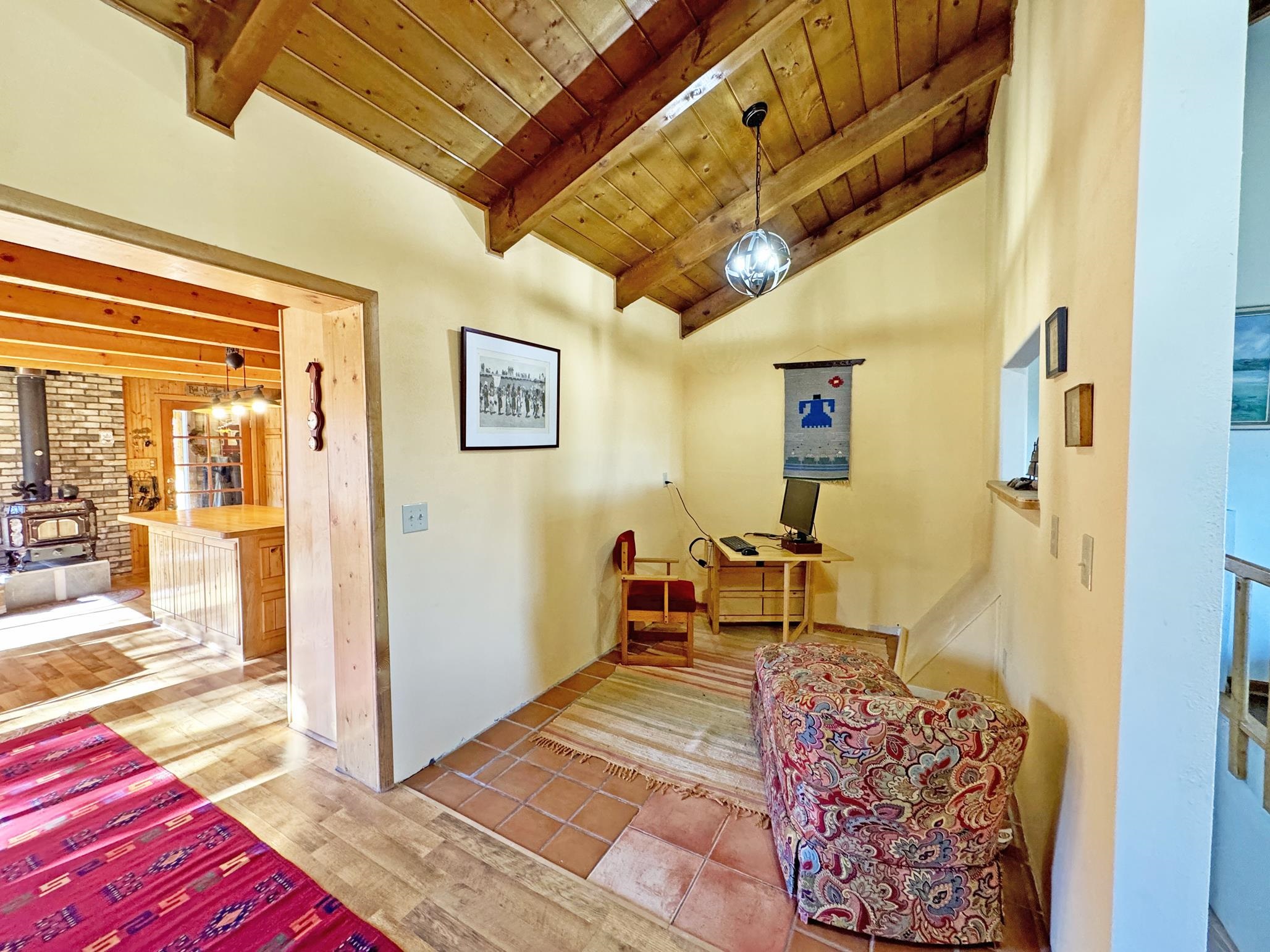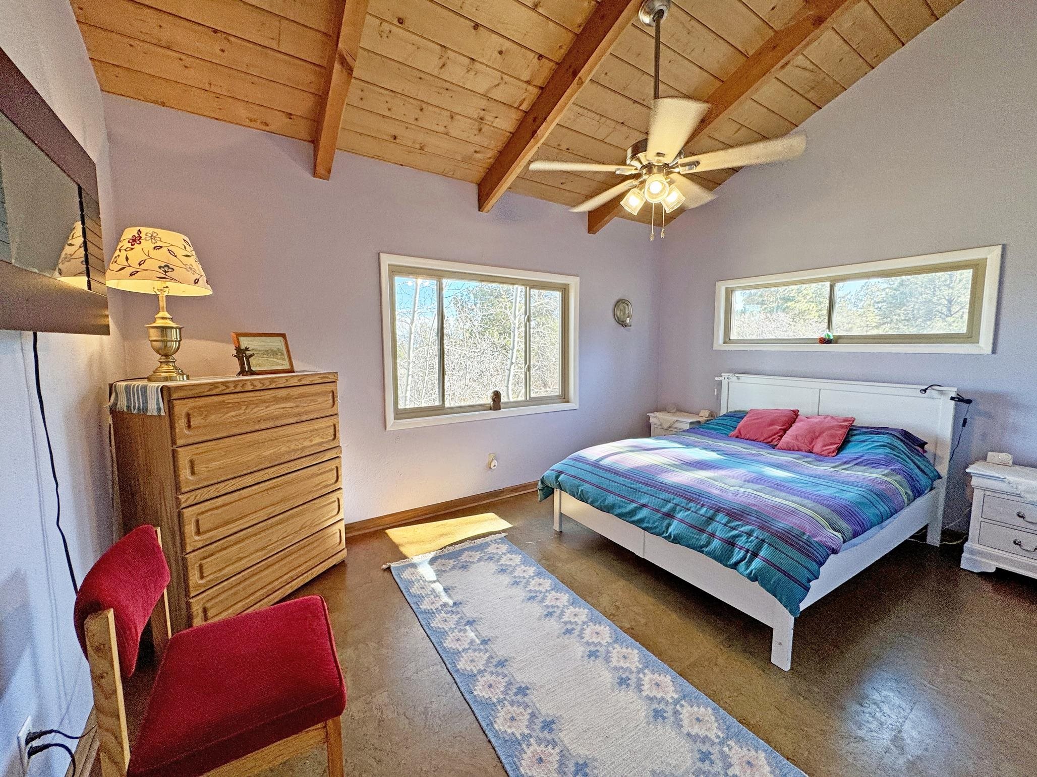Escape to your own piece of Northern New Mexico paradise! This beautifully maintained split-level premium log cabin in the peaceful Highland Estates subdivision of Tres Piedras offers the perfect blend of rustic charm and modern updates. Surrounded by stunning mountain views, wide-open spaces, and starry night skies, this property is ideal for those seeking privacy and outdoor adventure such as hiking, skiing, rafting and the Rio Grande Gorge. This cabin in the woods is located in the beautiful Tusas Mountains half an hour west of Taos, half an hour north of Ojo Caliente Mineral Hot Springs, and an hour and a half away from Santa Fe. Step inside to vaulted ceilings, warm wood accents, and multiple heating sources for cozy year-round comfort: wood stoves in the kitchen, living room, and expansive primary suite (converted from the original garage), wall heaters in the living room and primary, plus luxurious in-floor radiant heat in the main bathroom. The main level features an open kitchen with hardwood floors and brand-new stainless-steel refrigerator and range, an inviting living room, dining room (currently used as a home office) with authentic Saltillo tiles, a primary suite with cement floors and private wood stove, two guest bedrooms with cork flooring and ceiling fans, and the main bathroom. The fully finished basement adds versatile living space with tile floors throughout, an additional bedroom, 3/4 bathroom, and plenty of room for a family room, guest quarters, or recreation area. Enjoy outdoor living at its finest with two covered porches—one east-facing for morning coffee and one west-facing for spectacular sunsets. The 2-acre property is fully fenced with chain-link for privacy and security, and includes a storage shed, garden shed, and wood shed. Recent upgrades include all-new rain gutters, a new mudroom, a one year old on demand electric water heater, a French drain where water from graveled driveway drains off from and electric heating cables on the roof to effortlessly melt winter snow. Practical features abound: propane tank for gas heating/cooking, septic system, community water, reliable cell service and high-speed fiber optic internet already on the property. This turnkey mountain retreat is ready for you to move in and start living the serene Tres Piedras lifestyle.