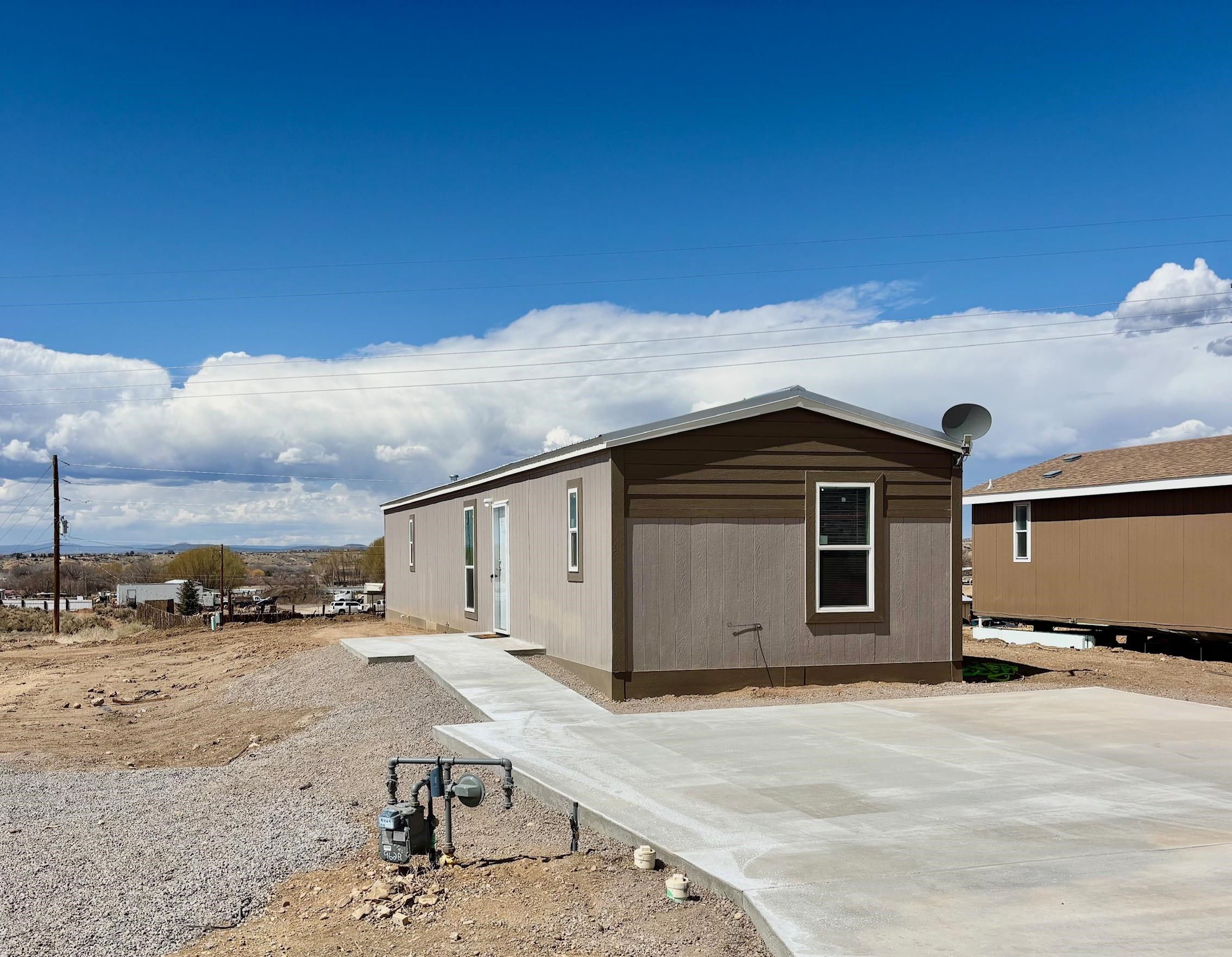 Home is under development / construction completion. Move in ready by March 31st 2025. Live in the beautiful new subdivision called Salazar Estates. This 2024 Champion 2 bed / 2 bath home with 7-year warranty from manufacturer is in city limits of Taos with city water, sewer, natural gas, paved roads, sidewalks, concrete driveway, 8 x 12 front door patio and 6 x 6 rear door patio, gravel landscaping, pro-panel 5' metal fencing and yes 10 x 10 Tuff Shed for storage. Come see the exterior home on lot 17 which is completed. Home features rolled vinyl flooring. Home is set up on an inground permanent engineered foundation with concrete stem wall which qualifies this property for FHA, Conventional and VA financing. Down payment & closing cost assistance available through preferred lender. Don't wait, get pre-qualified for your new home today! Own for less than renting in city limits of Taos. House will have 5' metal fencing and Tuff Shed.