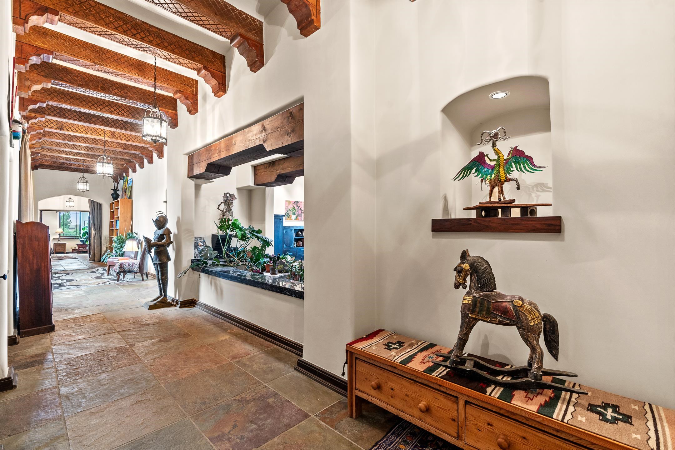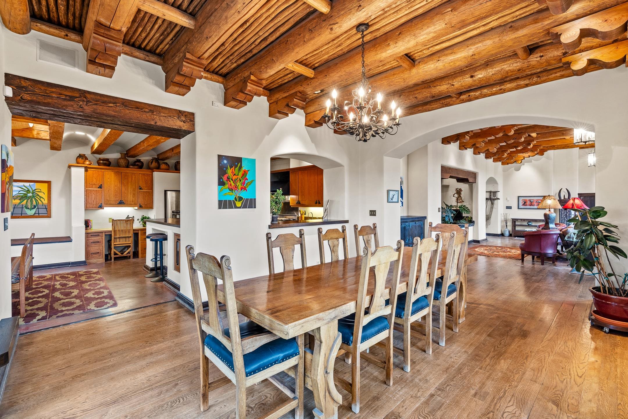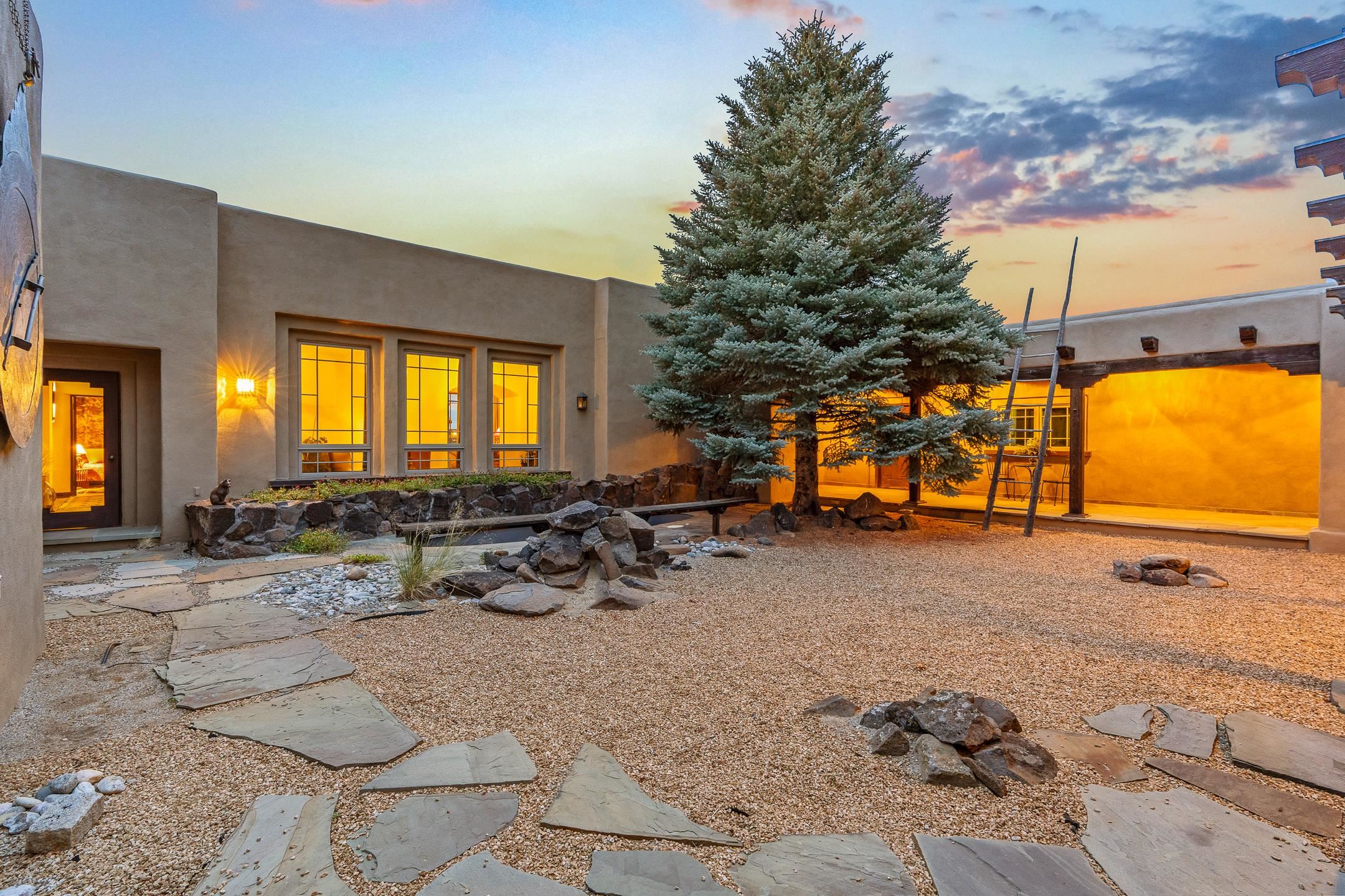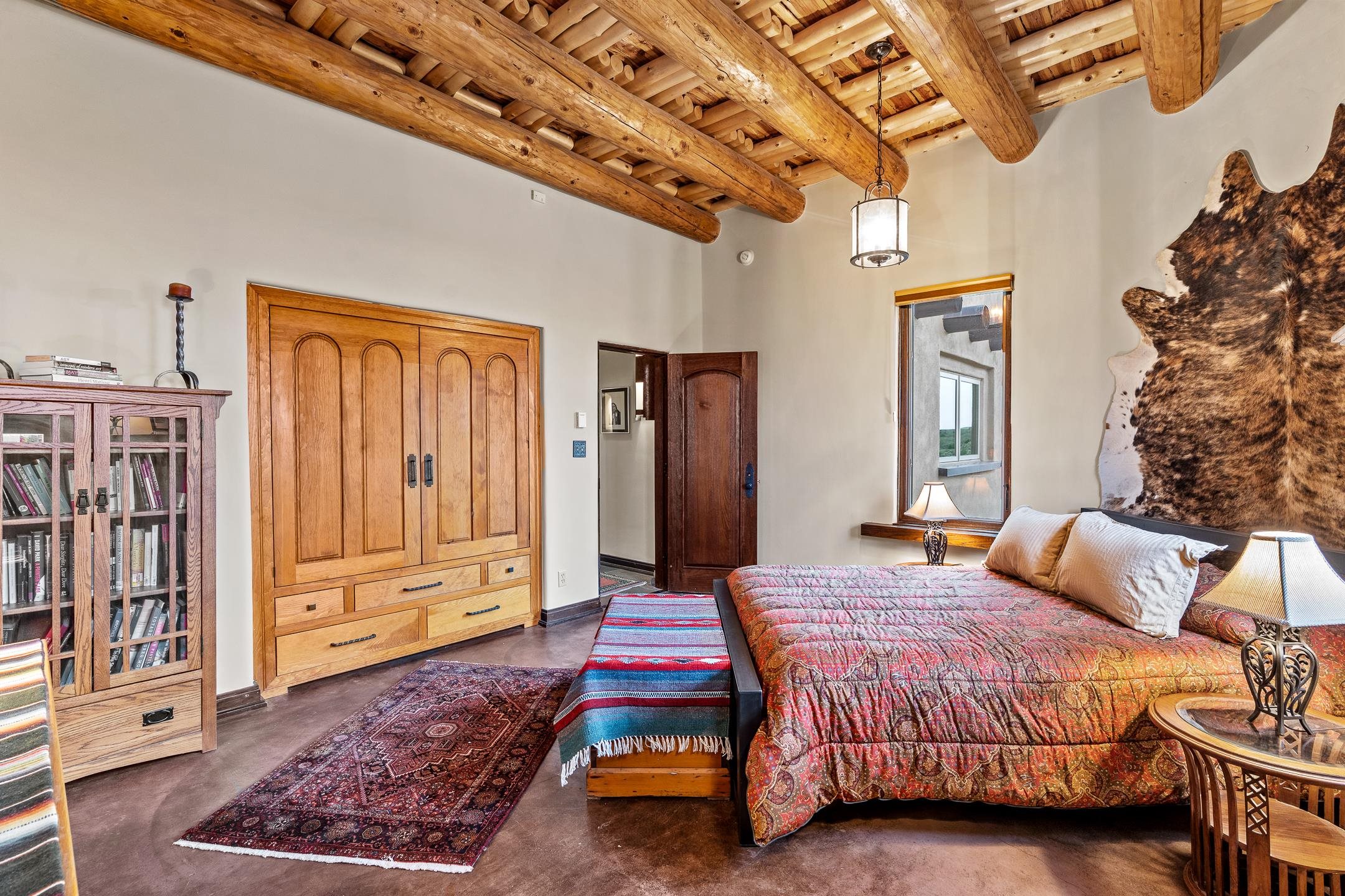 Welcome to 89 Riverbend, an extraordinary 4,233-square-foot Pueblo-style retreat nestled on 8.89 private acres above the Río Pueblo de Taos. This exceptional home artfully blends architectural authenticity with refined modern luxury, offering sweeping panoramic 360-degree views that encompass Taos Mountain, the Río Grande Gorge, and the surrounding mesas—spectacular scenery that shifts and transforms with every season and hour of the day, providing a scenery that is truly alive. Thoughtfully positioned to maximize privacy while maintaining a strong connection to the land, this residence features a dramatic great room with soaring ceilings and floor-to-ceiling windows that frame stunning vistas of the river gorge below—perfect for hosting unforgettable gatherings or enjoying tranquil, solitary reflection. The adjoining formal dining room and cozy family area, complete with a wood-burning fireplace and built-in banco seating, create a warm, inviting ambiance that feels both grand and intimate. At the heart of the home is a chef’s kitchen, fully equipped with a Viking range, high-end appliances, a walk-in pantry, and a temperature-controlled wine cellar—an entertainer’s dream. The expansive primary suite is a true sanctuary, boasting two beautifully designed spa-like bathrooms, each with exquisite finishes, and two separate dressing rooms. Additional guest accommodations include a spacious secondary suite and a versatile third bedroom or office with a built-in desk, offering breathtaking mesa views. Outdoor living is seamlessly integrated with numerous patios and gathering spaces—perfect for sunset dinners, morning coffee, or unwinding in the built-in hot tub, where you can soak under a blanket of stars while listening to the peaceful sounds of nature. Whether witnessing the sunrise over Taos Mountain or exploring nearby canyon trails, this home embodies the spirit of Taos—combining unmatched natural beauty, artistic inspiration, and cultural richness. This property also offers a large workshop space and a greenhouse—ideal for projects, cultivating plants, or studio work. Although it does need some updating, these spaces offer an incredible opportunity for creative pursuits or hobbies in a serene and inspiring setting. Located just minutes from the historic Taos Plaza yet worlds away in its serene, private setting, 89 Riverbend offers a rare opportunity to live in harmony where art, nature, and heritage come together in perfect balance. (Please note: the fireplaces' fires and the water in the hot tub are virtually staged for visualization purposes.) MATTERPORT VIDEO: https://my.matterport.com/show/?m=T6FShCEJfoA
