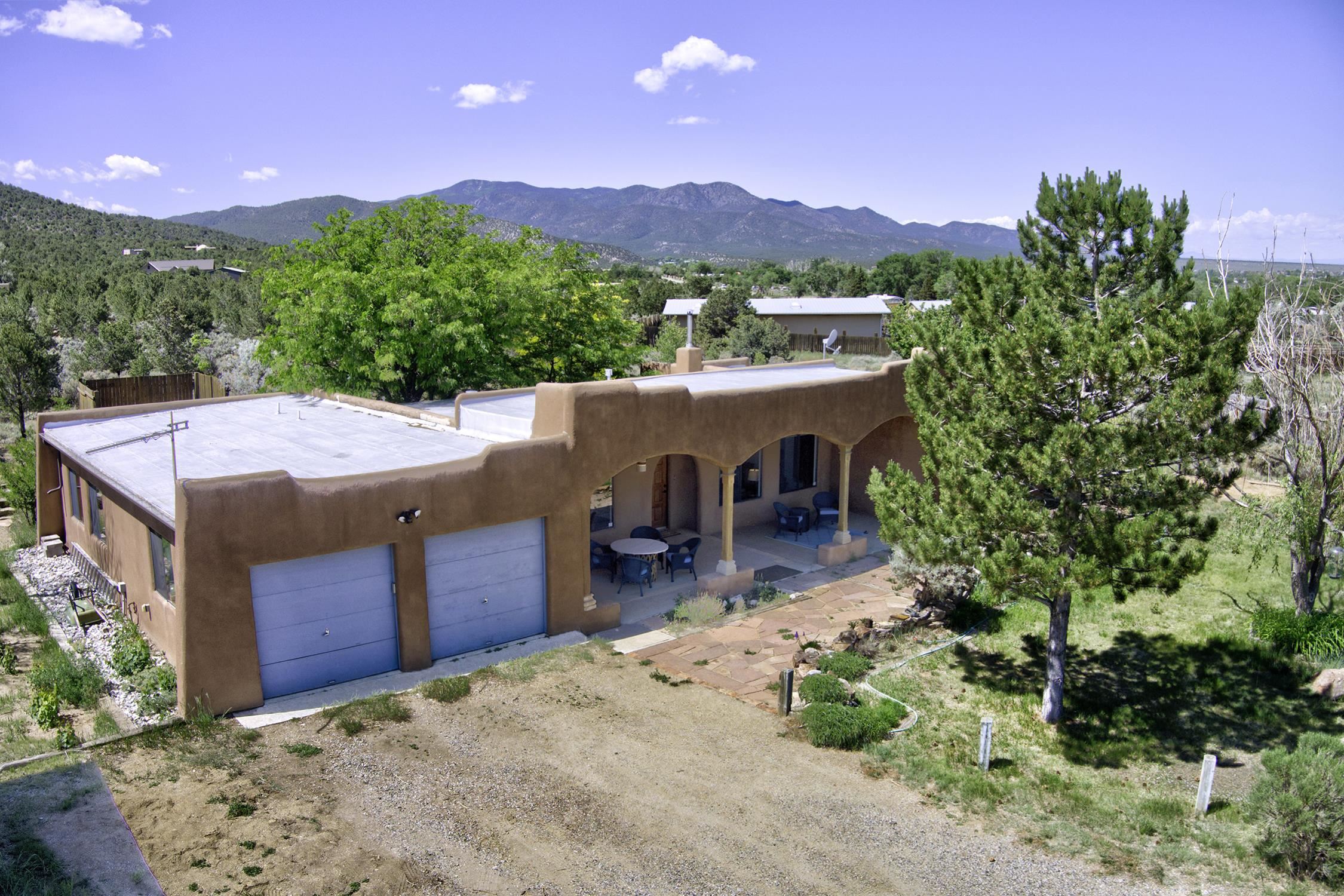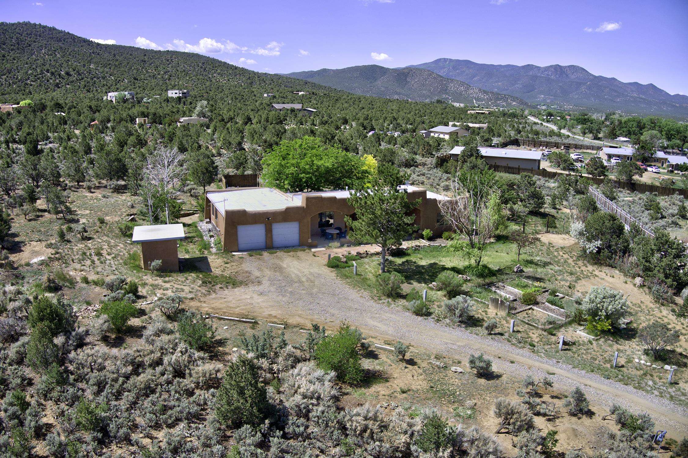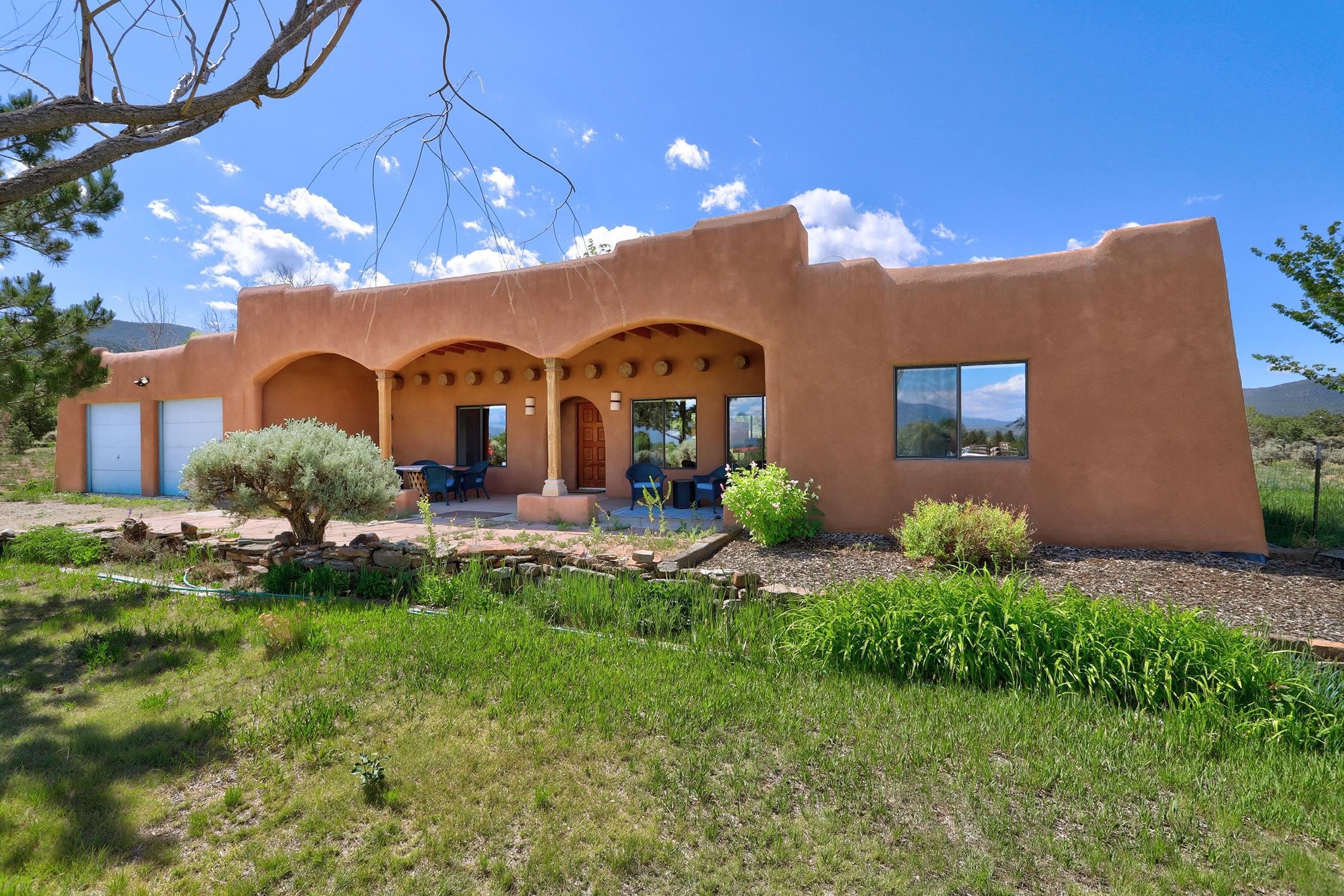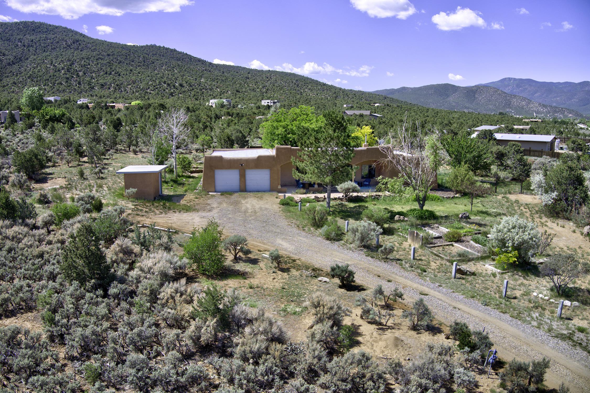 Nestled in the scenic Weimer Foothills, this lovely 3-bedroom, 2-bath home offers 1,674 square feet of comfortable living space on 2 private acres. Inside, you'll find charming Southwest details including Saltillo tile floors, vigas, and tongue-and-groove ceilings that add warmth and character throughout. Enjoy breathtaking views of the mountains, glowing sunsets, and star-filled skies from the deep, covered portal—an ideal space for outdoor dining, entertaining, or simply relaxing out of the elements. The property includes a 2-car garage, a site-built storage shed, and a dedicated deck with electrical already in place—ready for your hot tub. Mature trees and thoughtfully landscaped gardens are supported by a drip irrigation system, creating a peaceful outdoor setting that feels both cultivated and natural. A rare opportunity in one of Taos’ most desirable neighborhoods with easy access to hiking and biking, and a short distance from shopping, dining and all Taos has to offer.