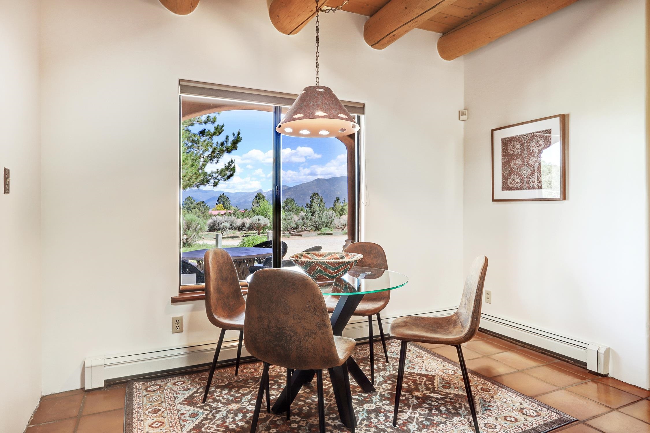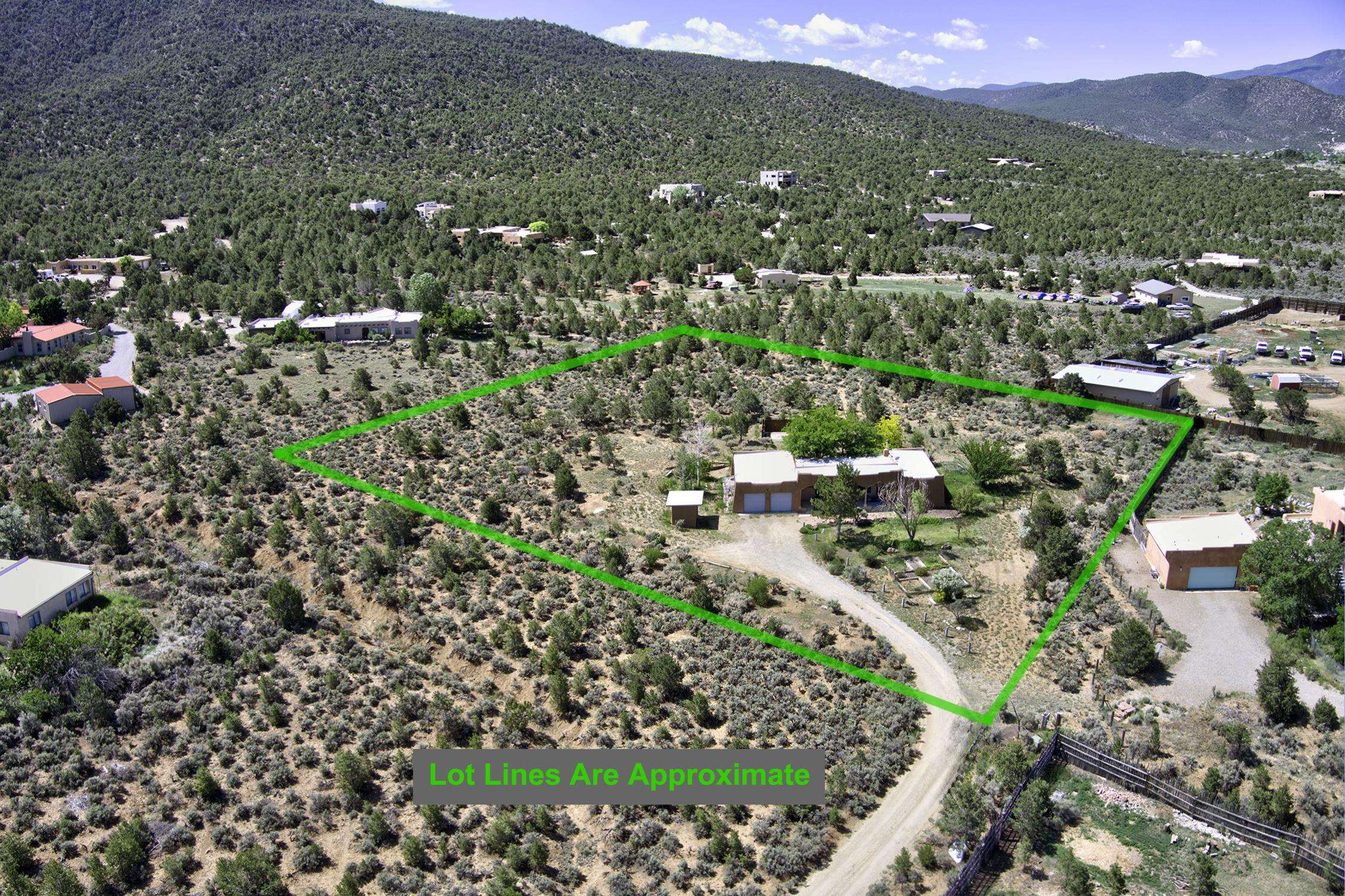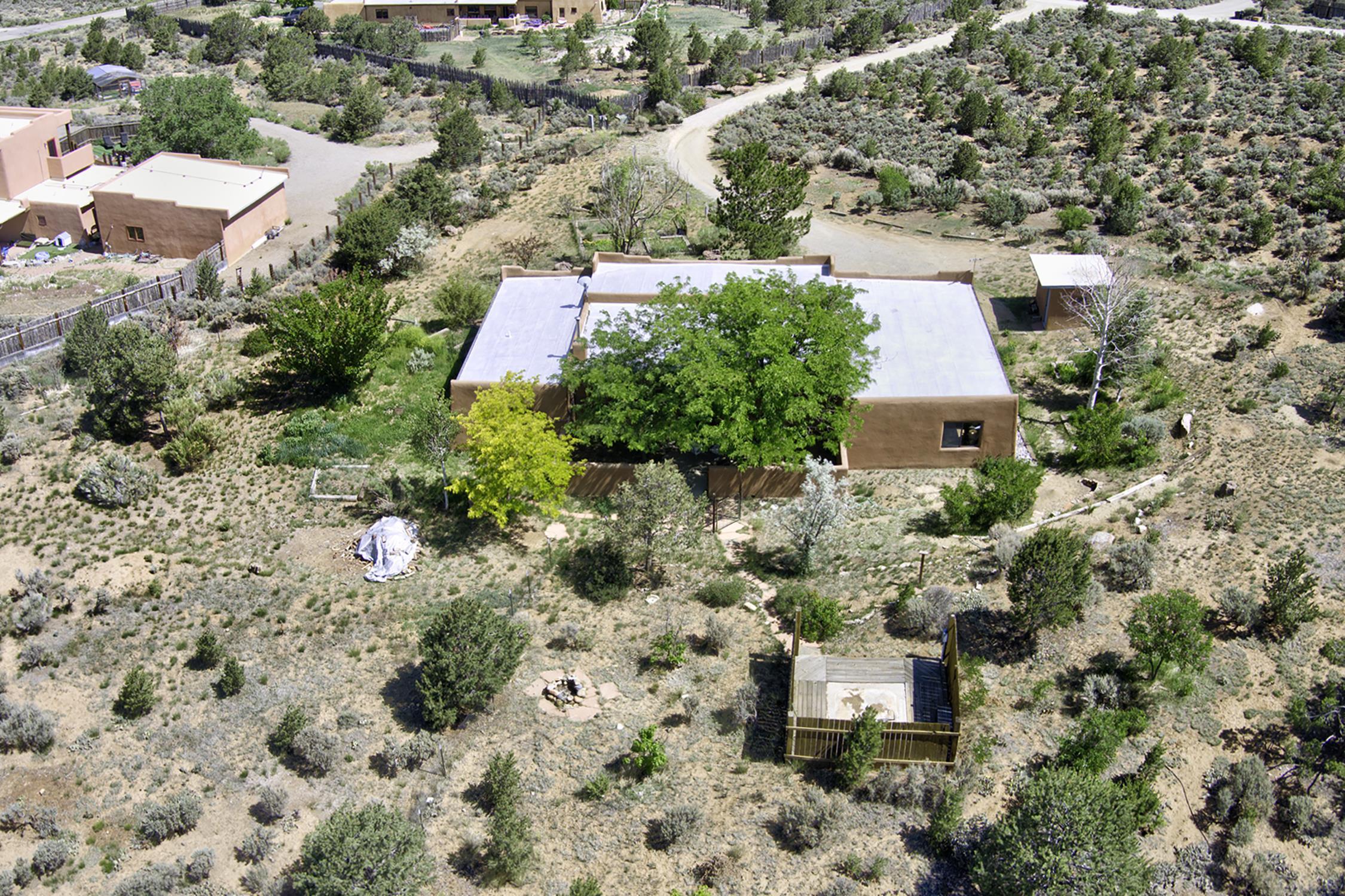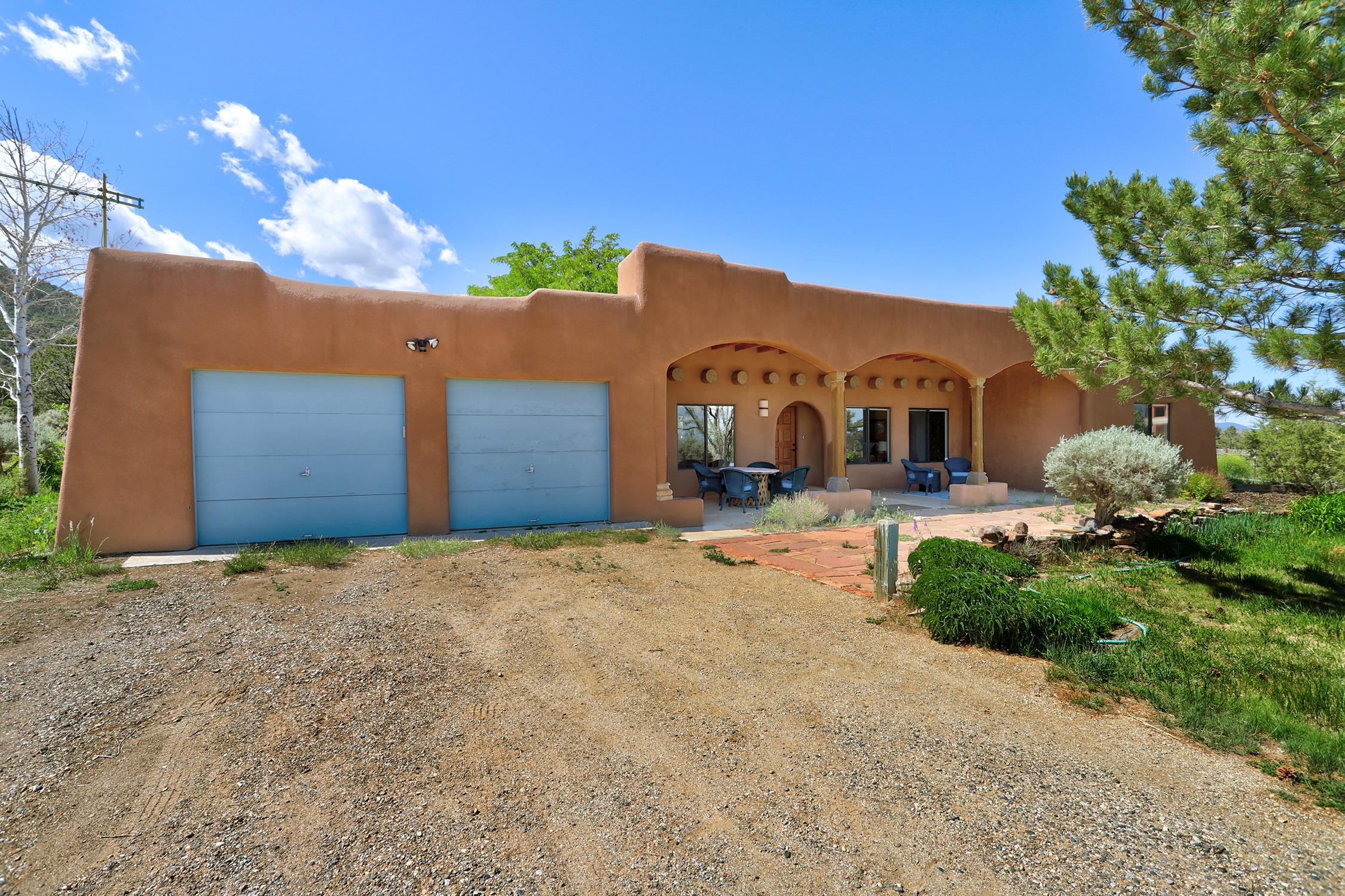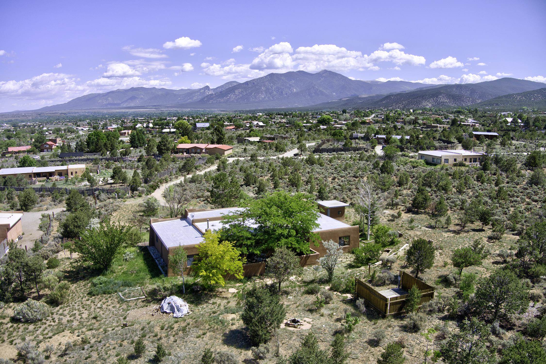 Nestled in the scenic Weimer Foothills, this lovely 3-bedroom, 2-bath home offers 1,674 square feet of comfortable living space on 2 private acres. Inside, you'll find charming Southwest details including Saltillo tile floors, vigas, and tongue-and-groove ceilings that add warmth and character throughout. Enjoy breathtaking views of the mountains, glowing sunsets, and star-filled skies from the deep, covered portal—an ideal space for outdoor dining, entertaining, or simply relaxing out of the elements. The property includes a 2-car garage, a site-built storage shed, and a dedicated deck with electrical already in place—ready for your hot tub. Mature trees and thoughtfully landscaped gardens are supported by a drip irrigation system, creating a peaceful outdoor setting that feels both cultivated and natural. A rare opportunity in one of Taos’ most desirable neighborhoods with easy access to hiking and biking, and a short distance from shopping, dining and all Taos has to offer.