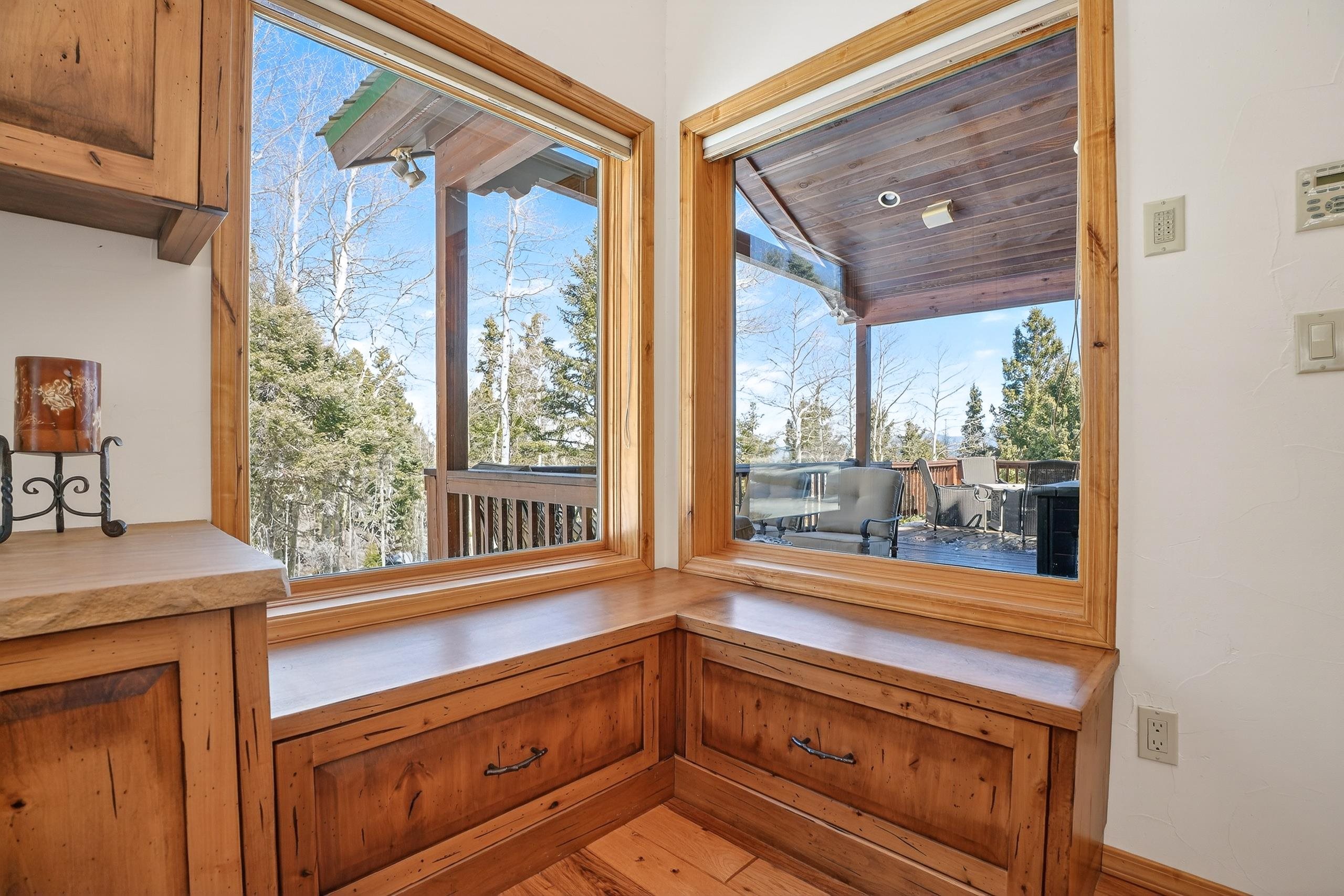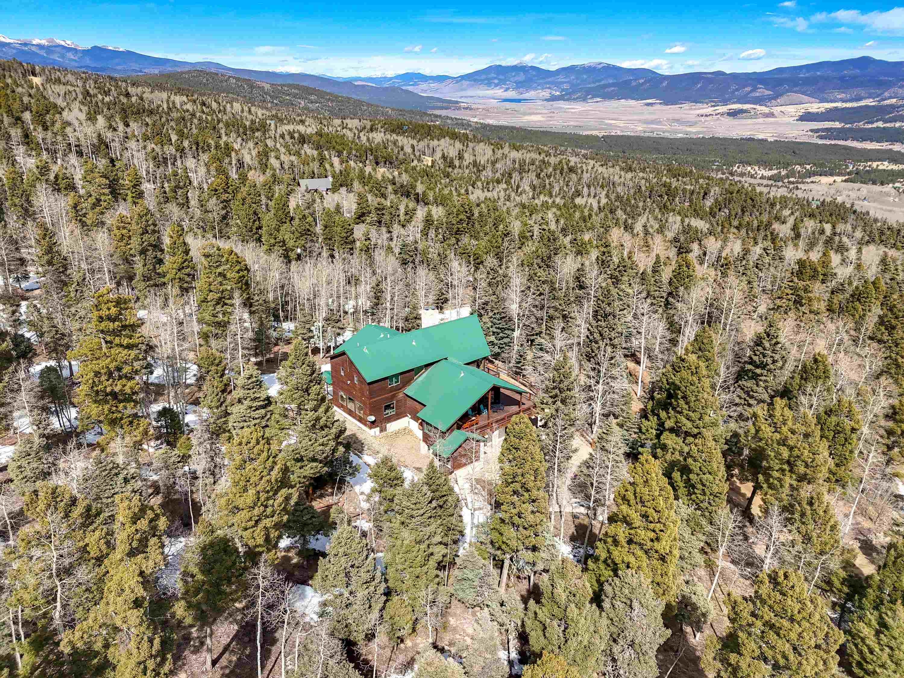 Luxury Mountain Retreat on 5 Acres! Prepare to fall in love with this one-of-a-kind custom mountain home in the sought-after Aspens subdivision of Angel Fire. As part of the Angel Fire Resort Platinum membership, owners enjoy premier amenities including skiing, golfing, tennis courts, a heated swimming pool, Country Club access, and much more. This exceptional property captures expansive panoramic views of the Moreno Valley, the Angel Fire Ski Area, and even into Colorado, making it the quintessential Northern New Mexico mountain retreat. The home features 4 bedrooms and 4.5 bathrooms, thoughtfully designed across three spacious living areas, a private office space, plus a two-car garage with a convenient mudroom and shower—perfect after outdoor adventures. The main living room showcases a stunning floor-to-ceiling rock fireplace, positioned to complement the dramatic wall of windows that frames the breathtaking valley views. The open-concept design flows seamlessly into the well-appointed kitchen, featuring hickory cabinetry, a pasta sink, and a walk-in pantry. The elegant dining area, illuminated by a striking antler chandelier, offers ample space for gatherings with family and friends. After dinner, relax in the cozy lounge area, highlighted by rich teak walls and a decorative bar, creating the perfect space for entertaining. An elevator connects all three levels, providing both convenience and accessibility. The home also features a complete surround sound system throughout, enhancing the living experience in every room. Outside, the fully fire-wise thinned acreage is beautifully landscaped and ready to enjoy. The property sits near trailhead access to the National Forest, making it ideal for hiking, horseback riding, and year-round outdoor recreation plus the Aspens subdivision is horse-friendly. This extraordinary property offers the perfect balance of luxury, comfort, and breathtaking natural beauty.