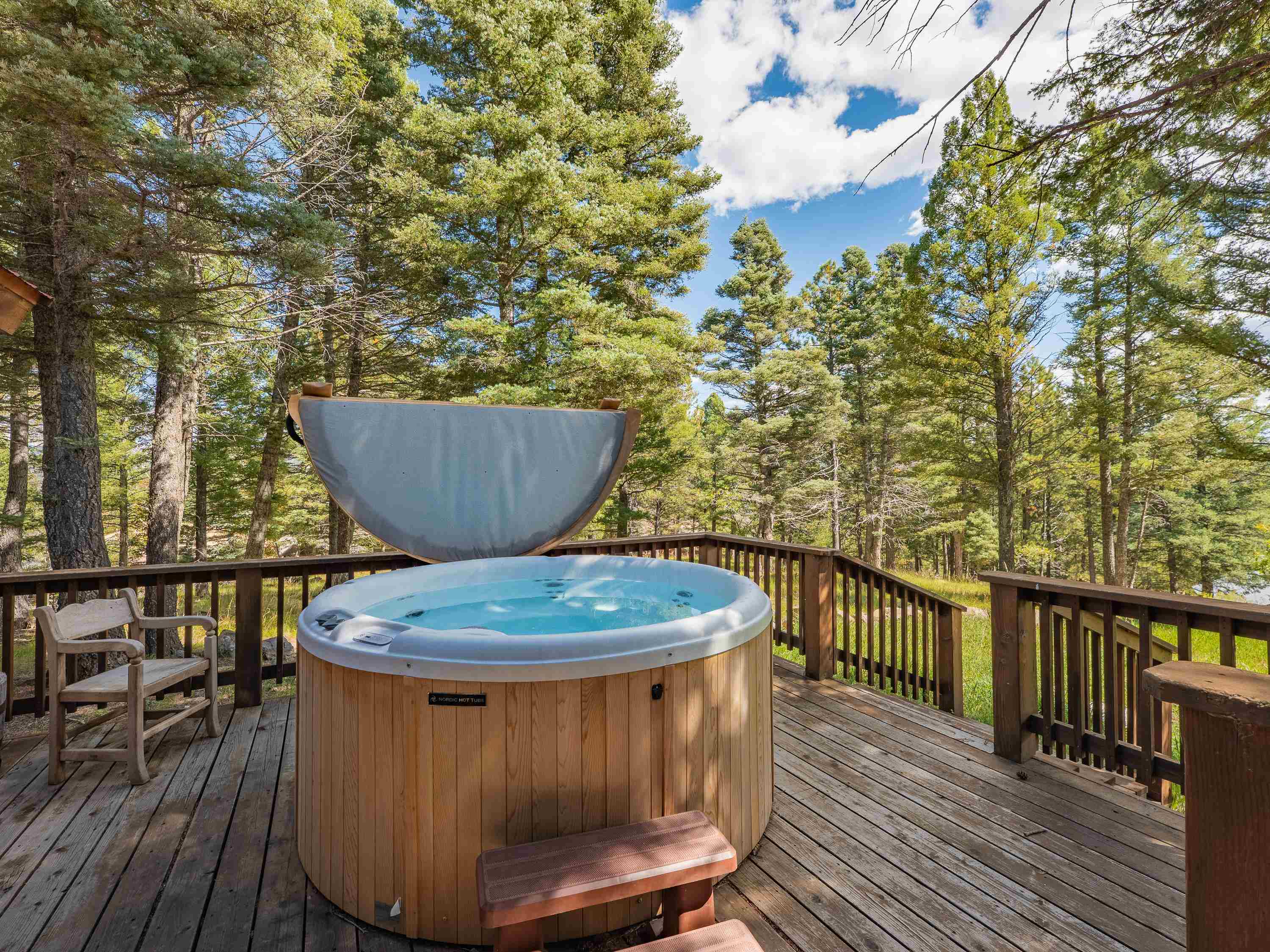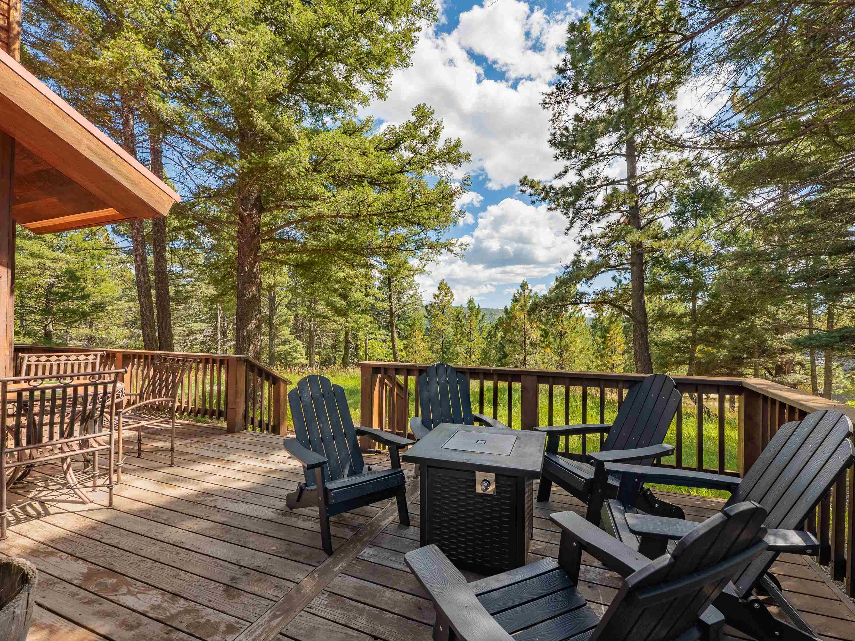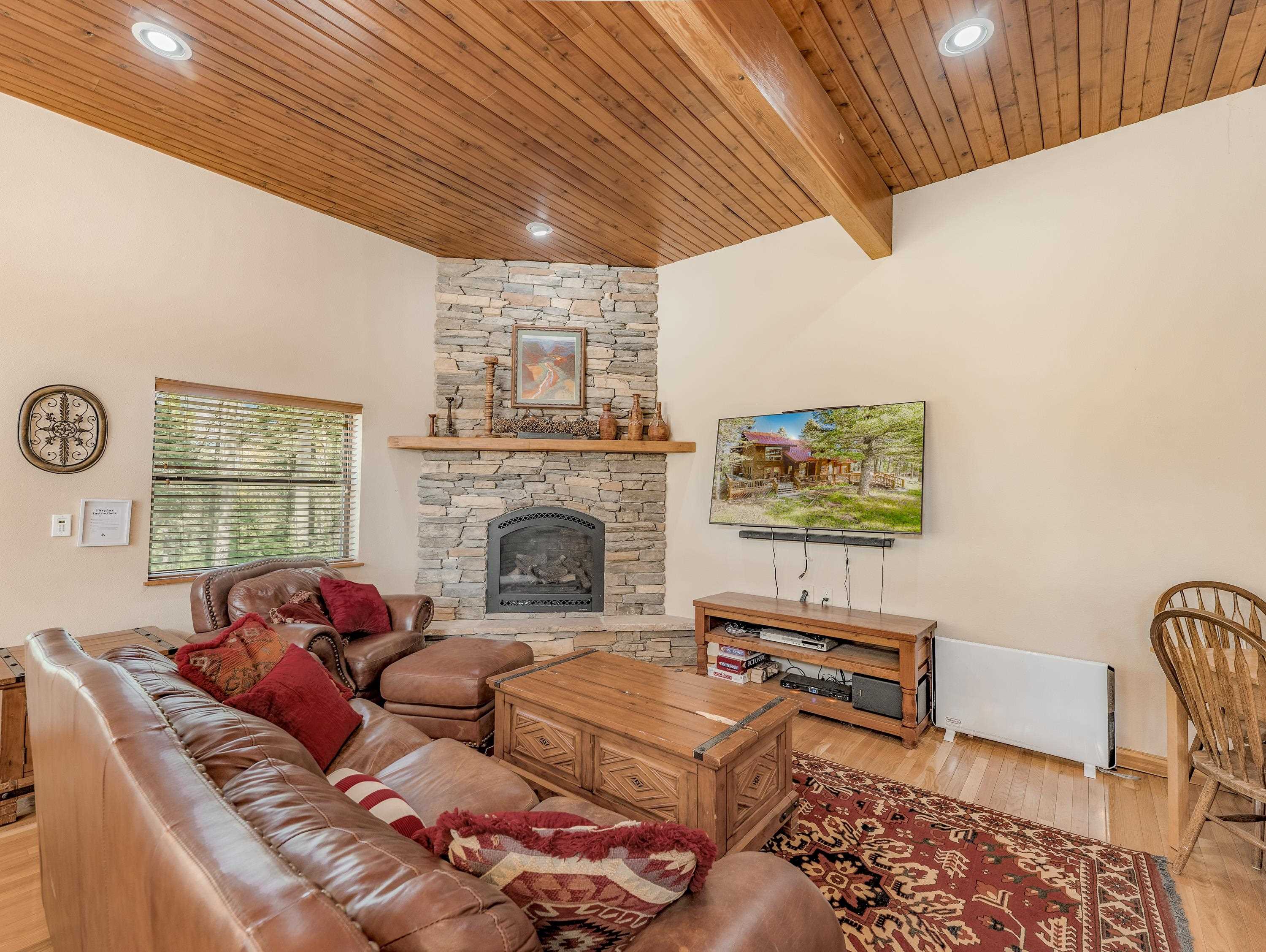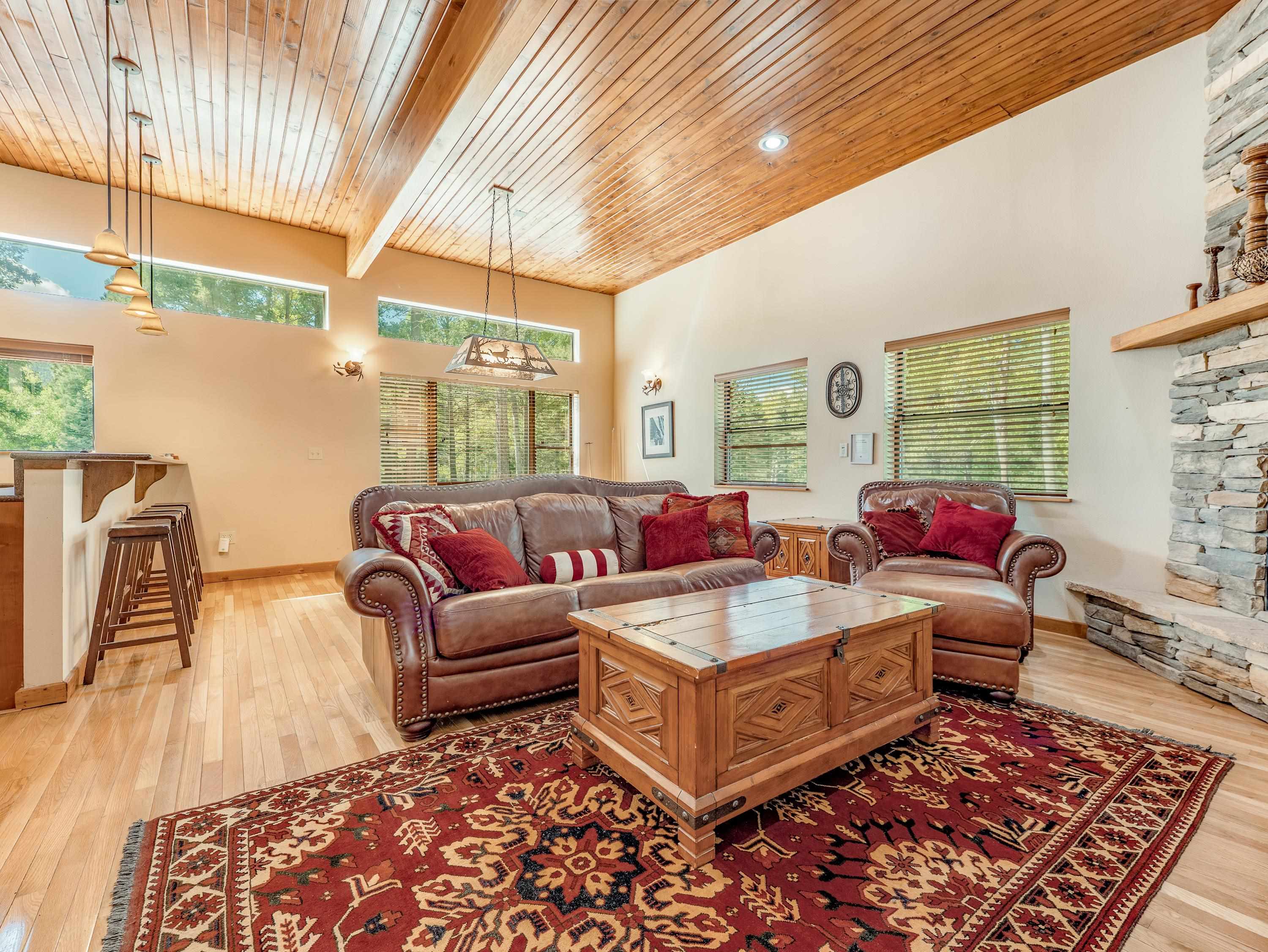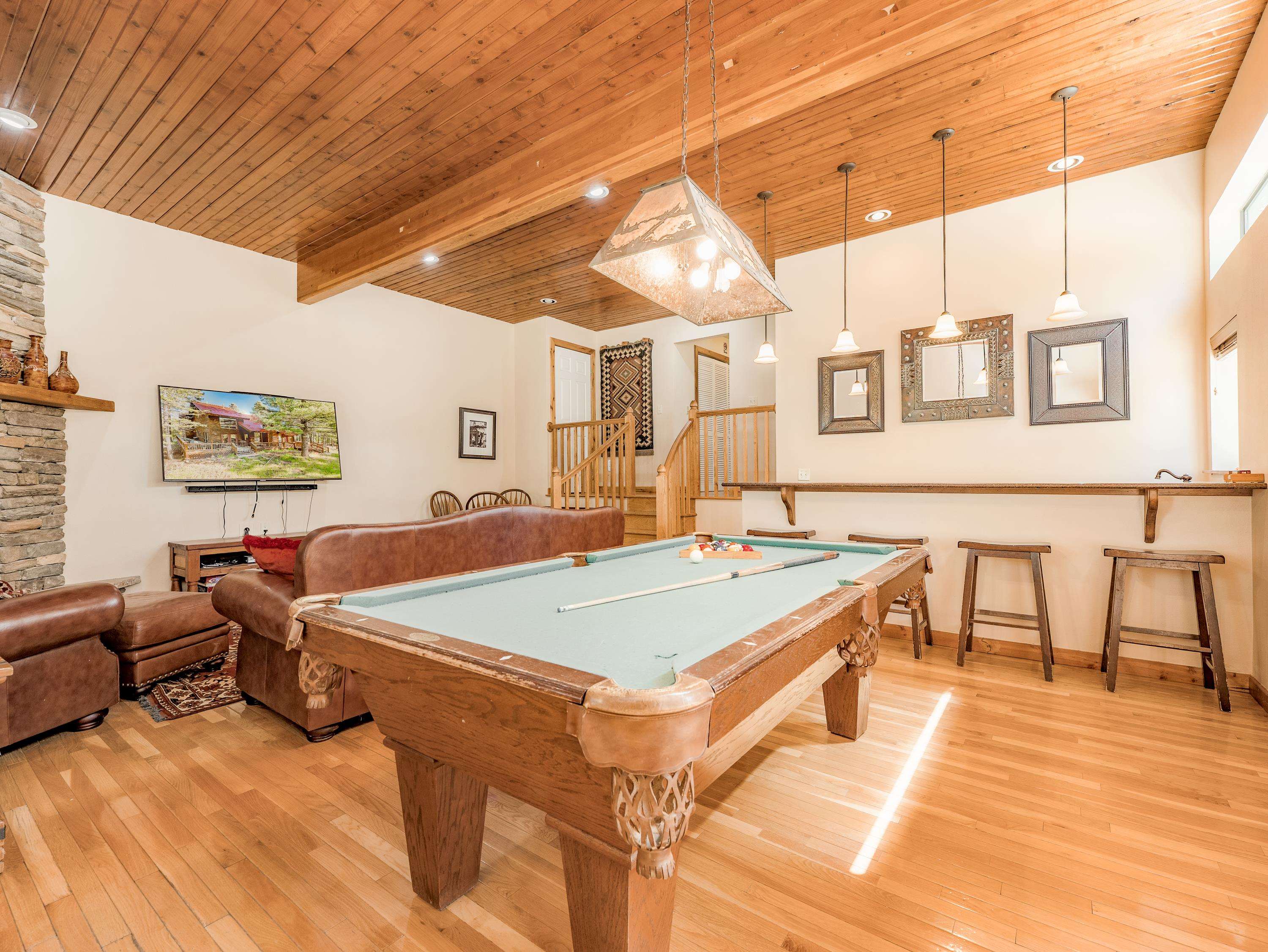 Get ready to create mountain memories with the entire family with 96 Cimarron Trail. With 5 spacious bedrooms, 4 full bathrooms, a half bath, and a bonus den, this home has room for everyone, plus more! Situated on .94 acres with a paved circle driveway, this home can be enjoyed inside and out with a yard that’s perfect for outdoor living and games, large front and rear decks, AND the outdoor hot tub! Inside, relax in the open living area featuring vaulted ceilings, hardwood floors and a wood burning fireplace surrounded by stacked stone. The adjacent kitchen has tile flooring and tongue and groove wood ceilings with a dining area leading to the back deck. Down the hall is the second living area / game room with hardwood floors and ceilings, a fireplace, pool table and a wet bar. The primary bedroom is on the main floor with an attached sunroom and an ensuite bath with a soaking tub and shower. The upstairs features a loft, two full baths, three guest bedrooms and a bunk room (fifth bedroom) that is accessed through the fourth bedroom. 96 Cimarron Trail comes fully furnished and is ready to be your family’s favorite getaway, or a turnkey vacation rental opportunity.