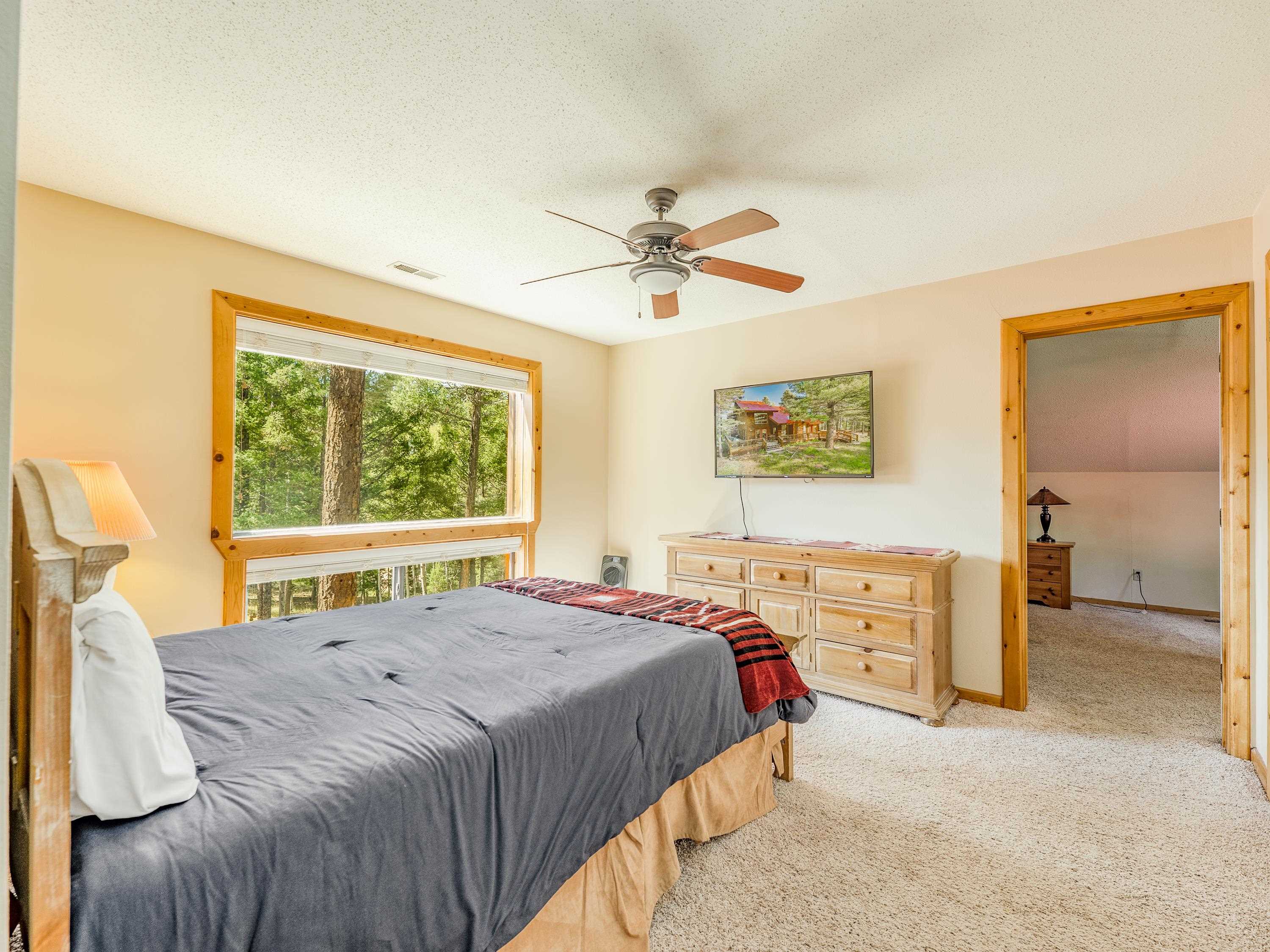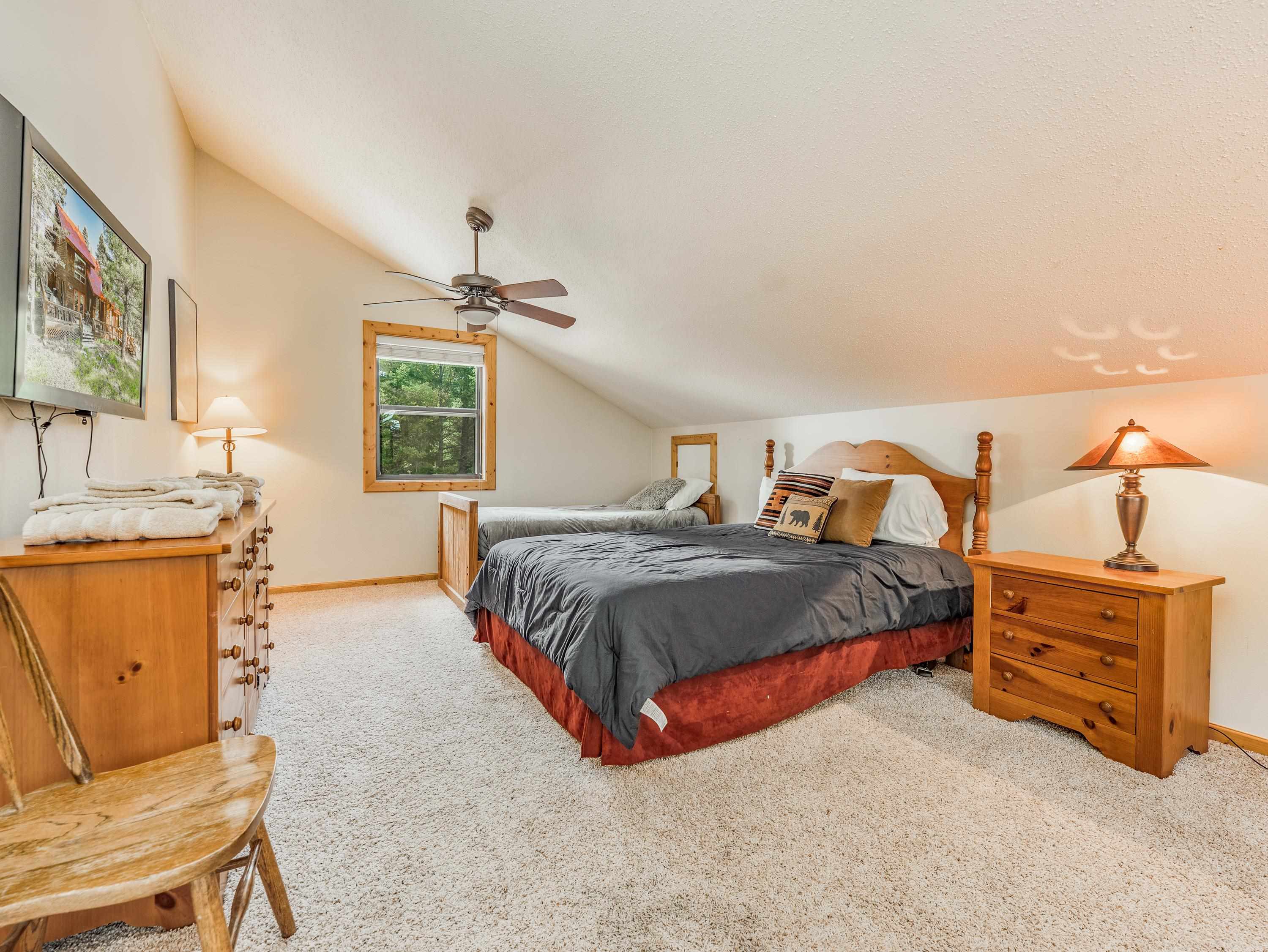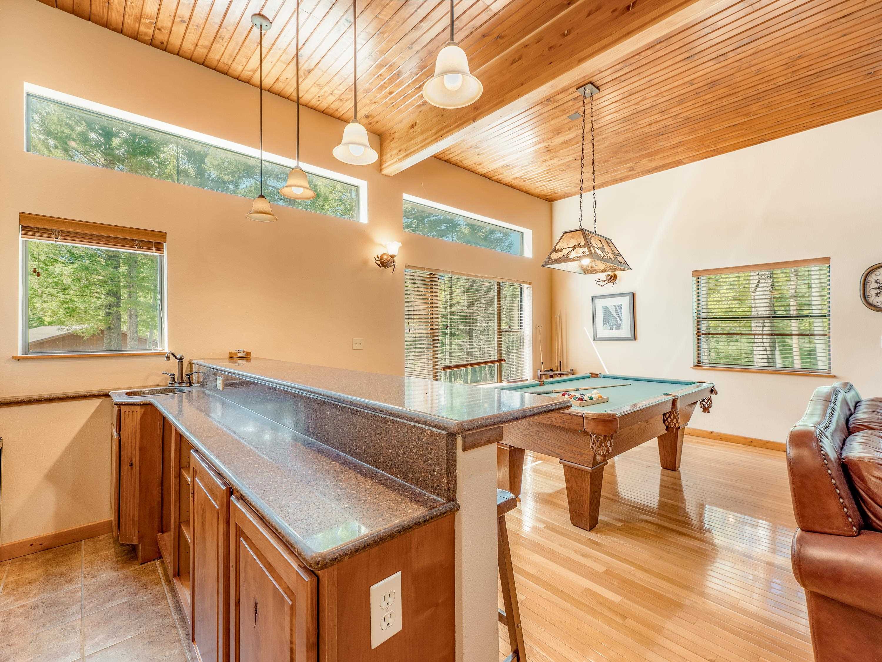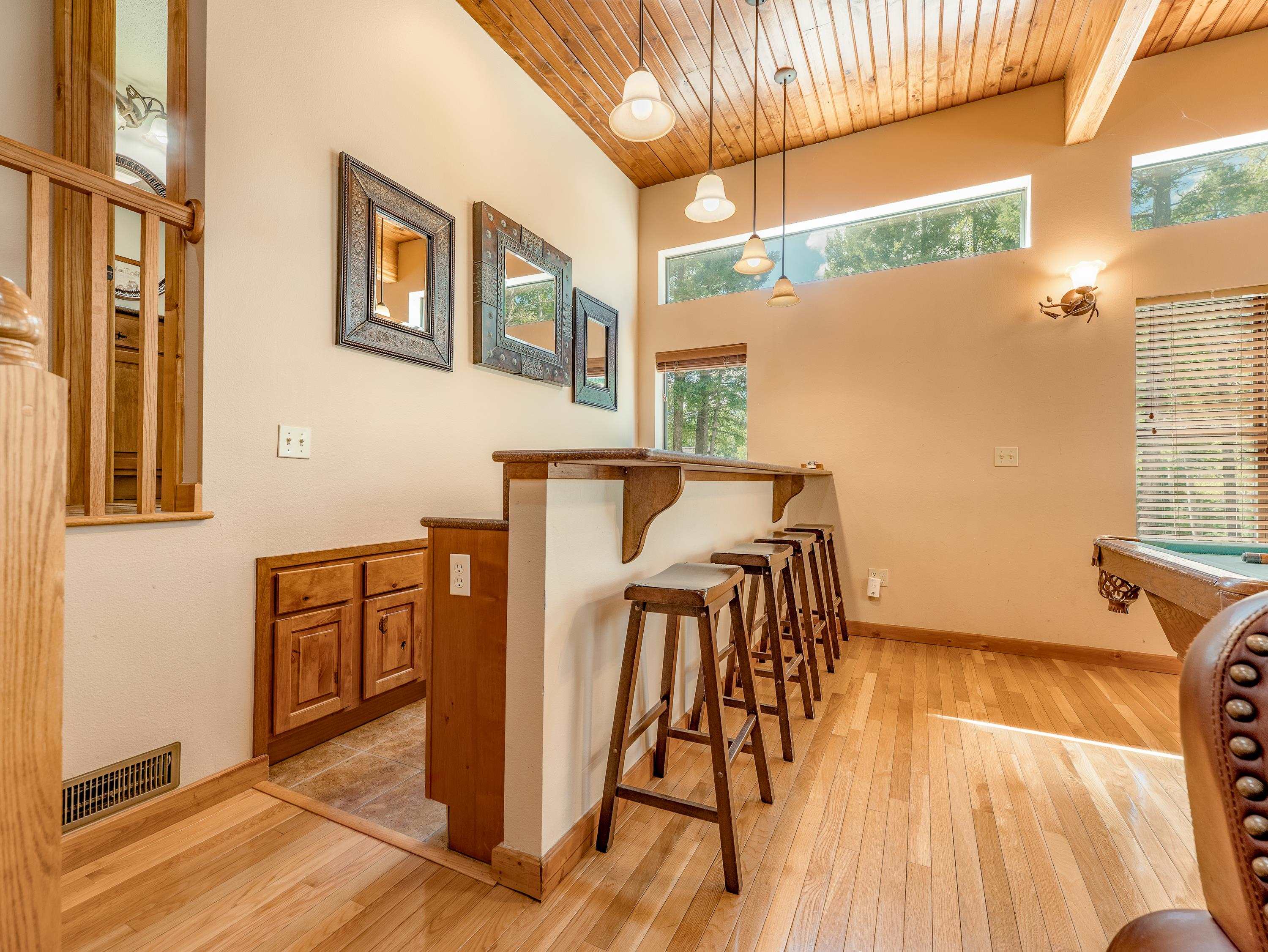 Get ready to create mountain memories with the entire family with 96 Cimarron Trail. With 5 spacious bedrooms, 4 full bathrooms, a half bath, and a bonus den, this home has room for everyone, plus more! Situated on .94 acres with a paved circle driveway, this home can be enjoyed inside and out with a yard that’s perfect for outdoor living and games, large front and rear decks, AND the outdoor hot tub! Inside, relax in the open living area featuring vaulted ceilings, hardwood floors and a wood burning fireplace surrounded by stacked stone. The adjacent kitchen has tile flooring and tongue and groove wood ceilings with a dining area leading to the back deck. Down the hall is the second living area / game room with hardwood floors and ceilings, a fireplace, pool table and a wet bar. The primary bedroom is on the main floor with an attached sunroom and an ensuite bath with a soaking tub and shower. The upstairs features a loft, two full baths, three guest bedrooms and a bunk room (fifth bedroom) that is accessed through the fourth bedroom. 96 Cimarron Trail comes fully furnished and is ready to be your family’s favorite getaway, or a turnkey vacation rental opportunity.
