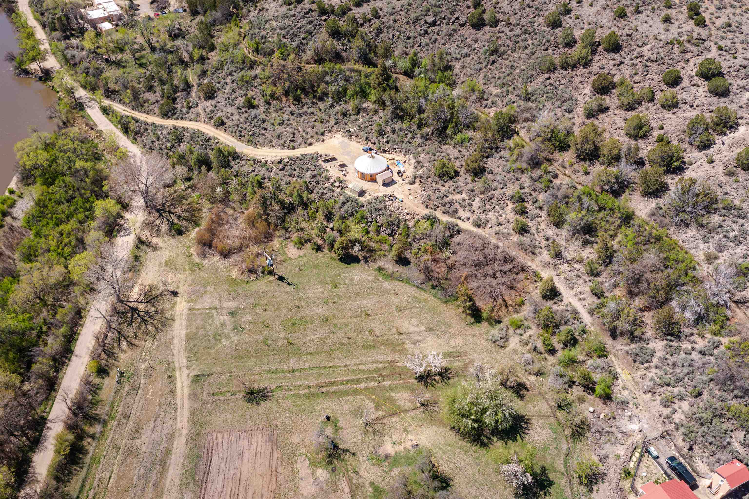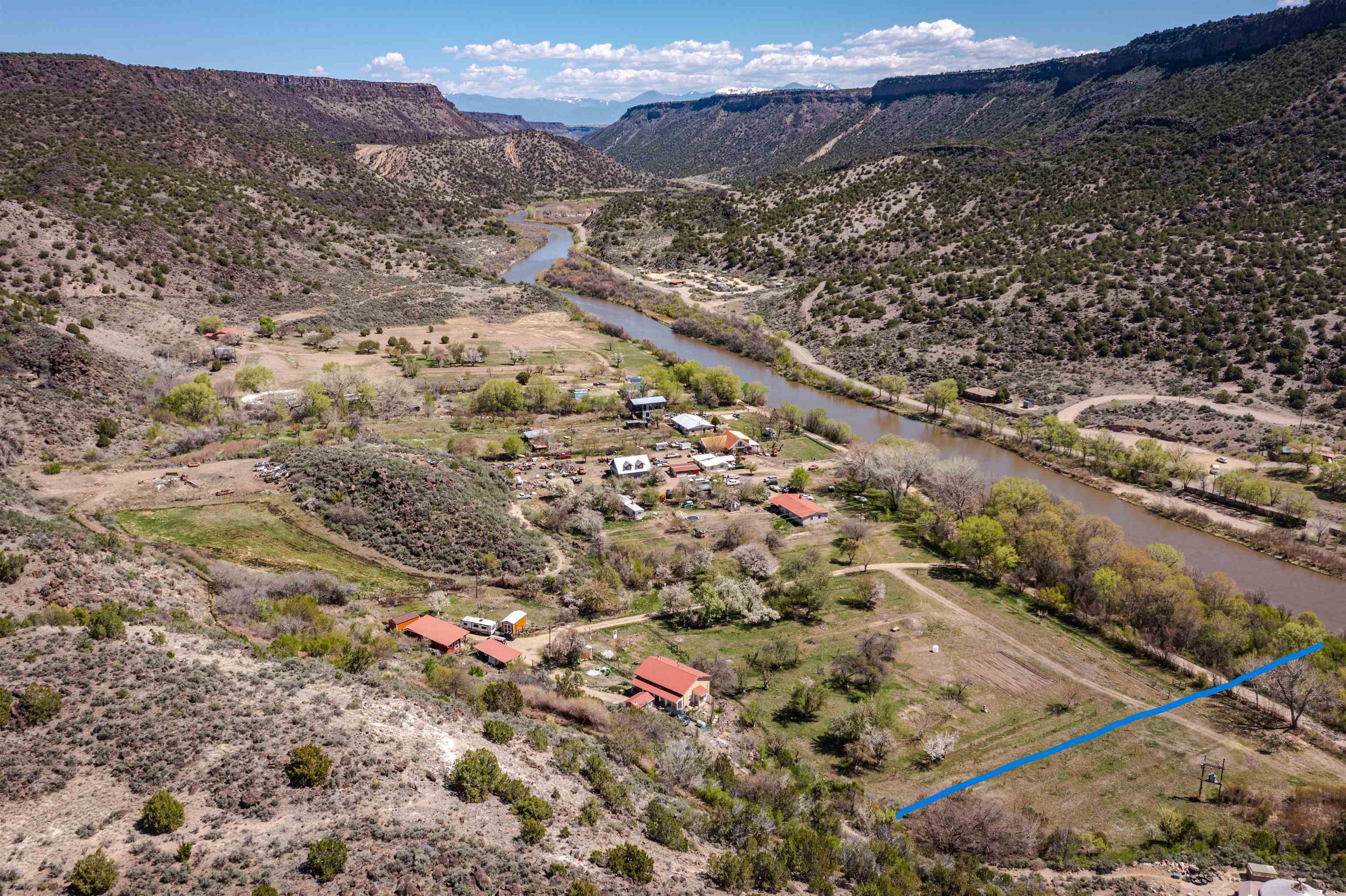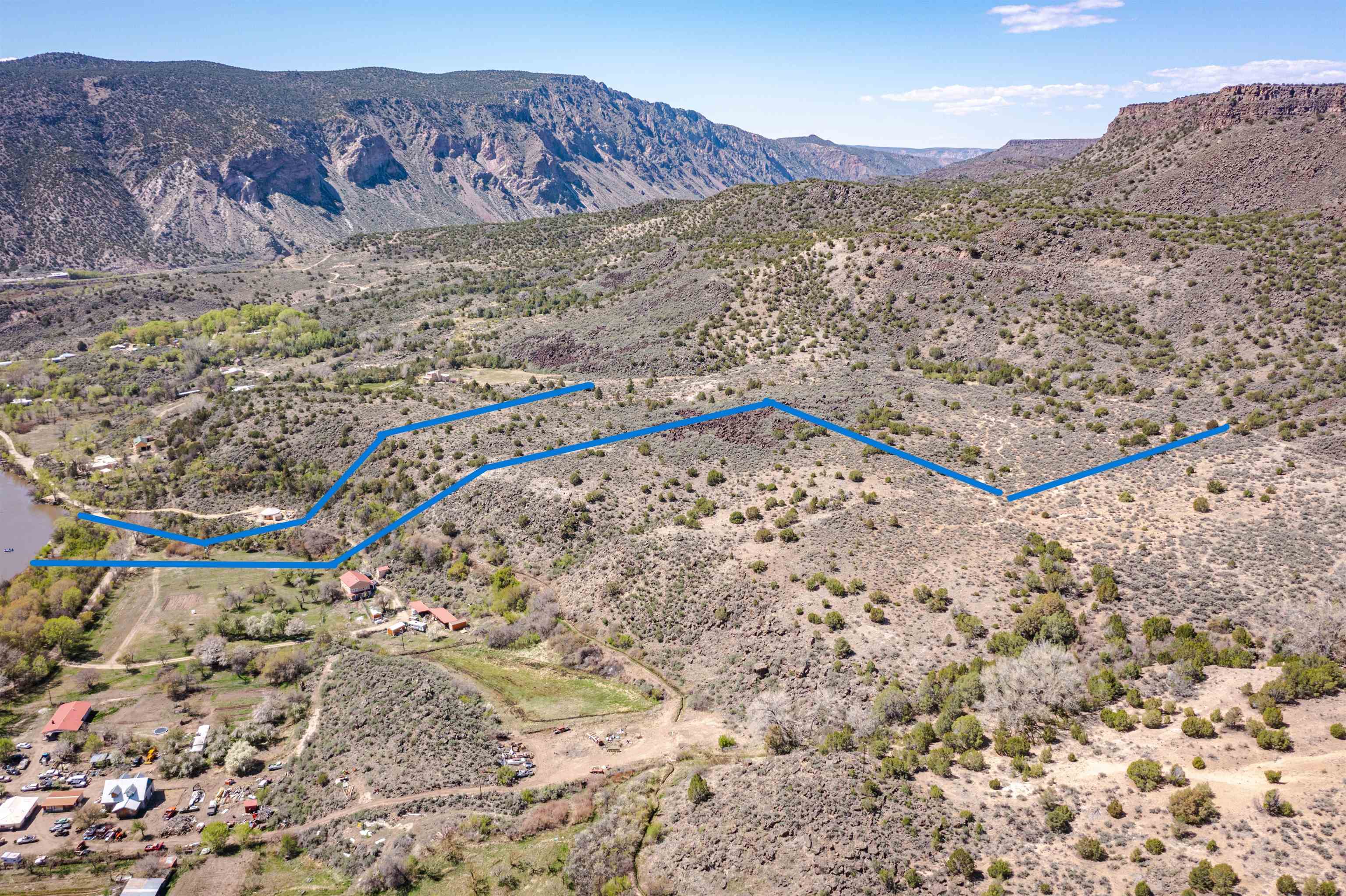 Rare and stunning and absolutely unique: river frontage, beach, a riparian habitat, valley land with an orchard, a building site, an acequia with a long irrigation season, mesa top with magical petroglyphs, and last but not least two year-round springs one in the valley and one at the far western end. This absolutely unique offering begins on the banks of the Rio Grande in Pilar and extends all the way to the BLM encompassing an array of landscape rarely seen in northern NM. The photos have been marked up to illustrate the approximate location of property boundaries. Elk, bob-cat, coyote, deer regularly move through this land on their way to the river to drink; birds migrating up the Rio Grande include golden eagles, bald eagles, osprey and flocks of songbirds. And yet her you are just a short 20 min drive to Taos or back down valley about 1 hour to Santa Fe. Recently surveys and with easements for access in place. Come out and visit this striking land along the Rio Grande in Pilar.