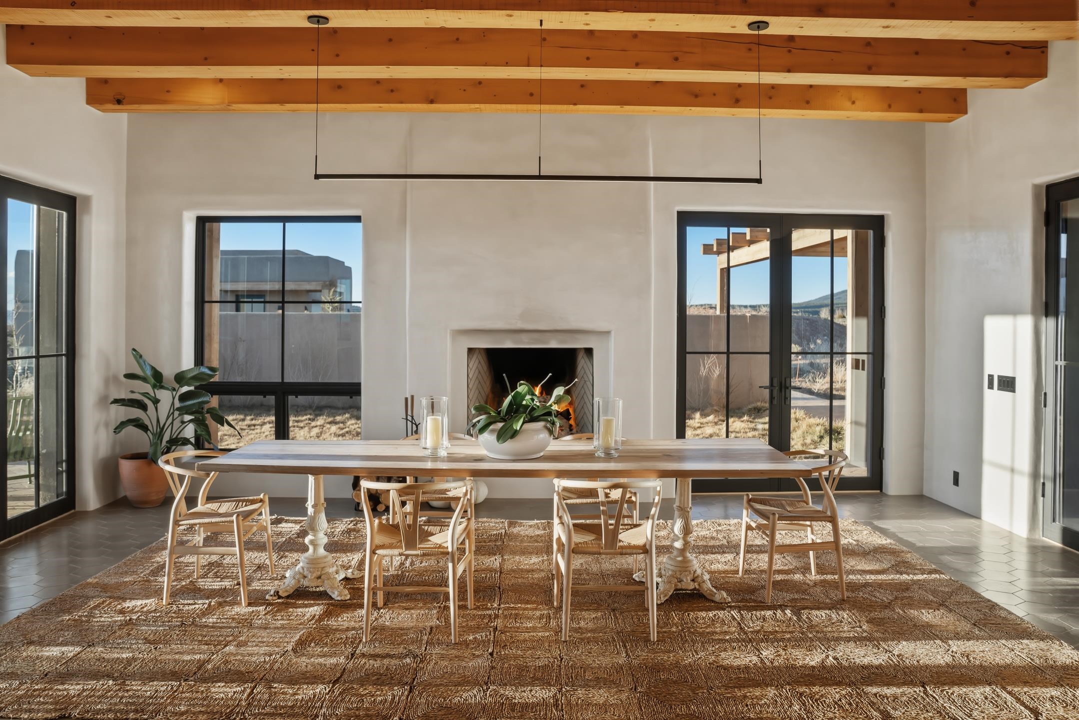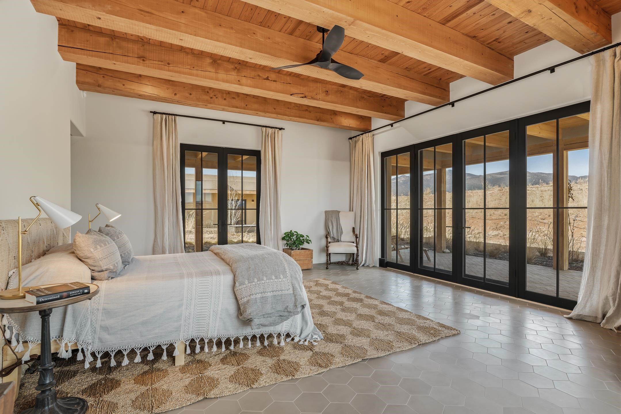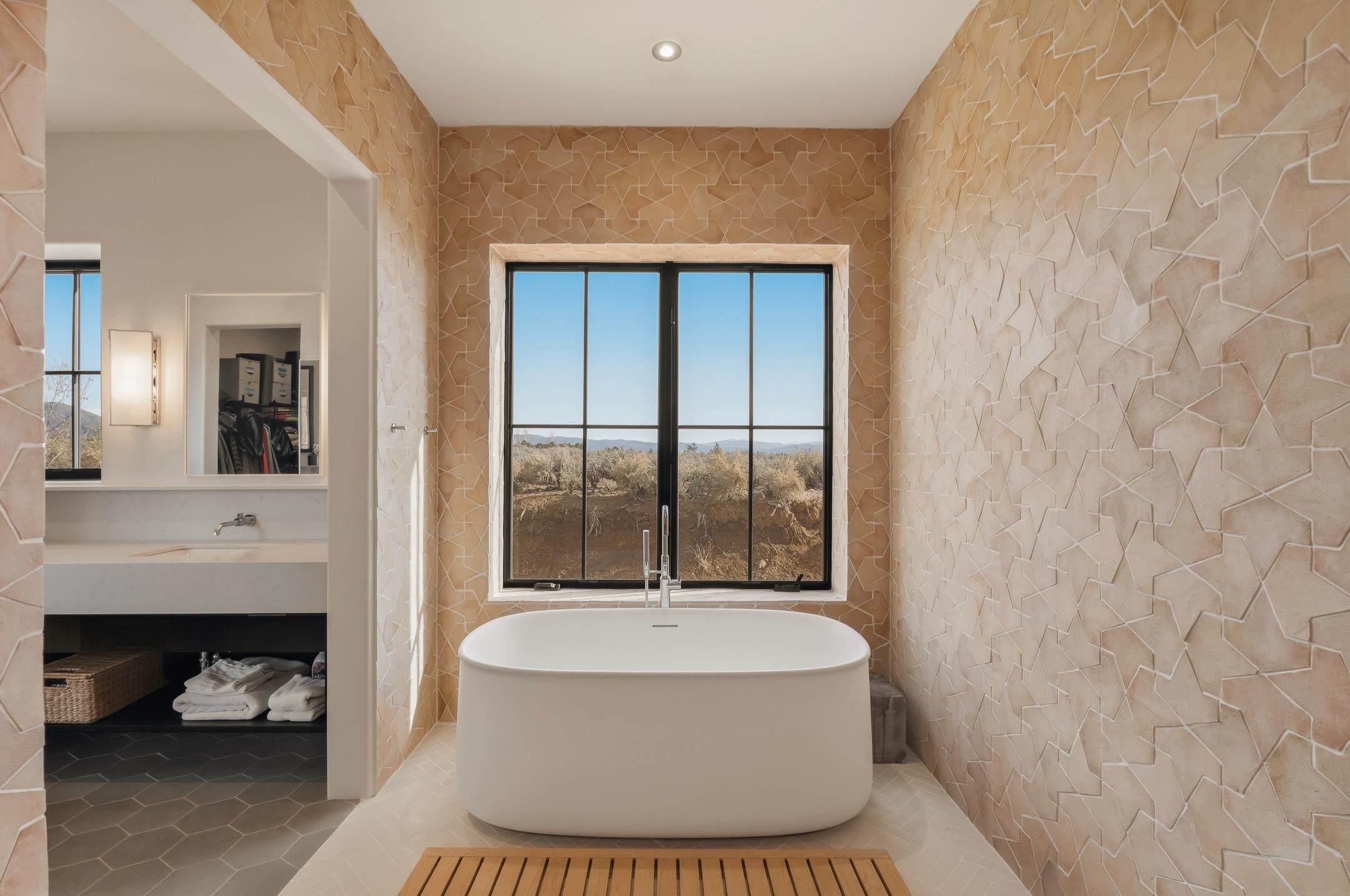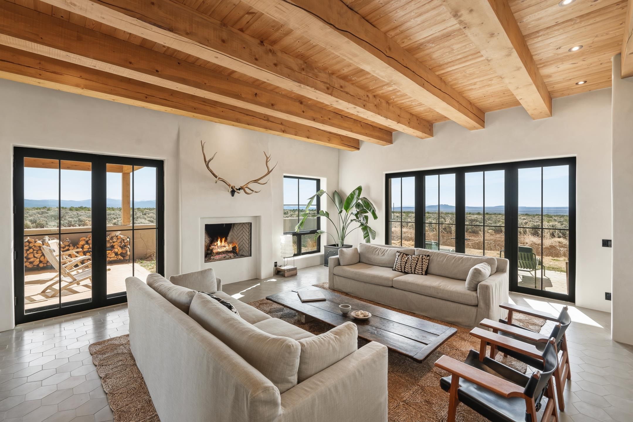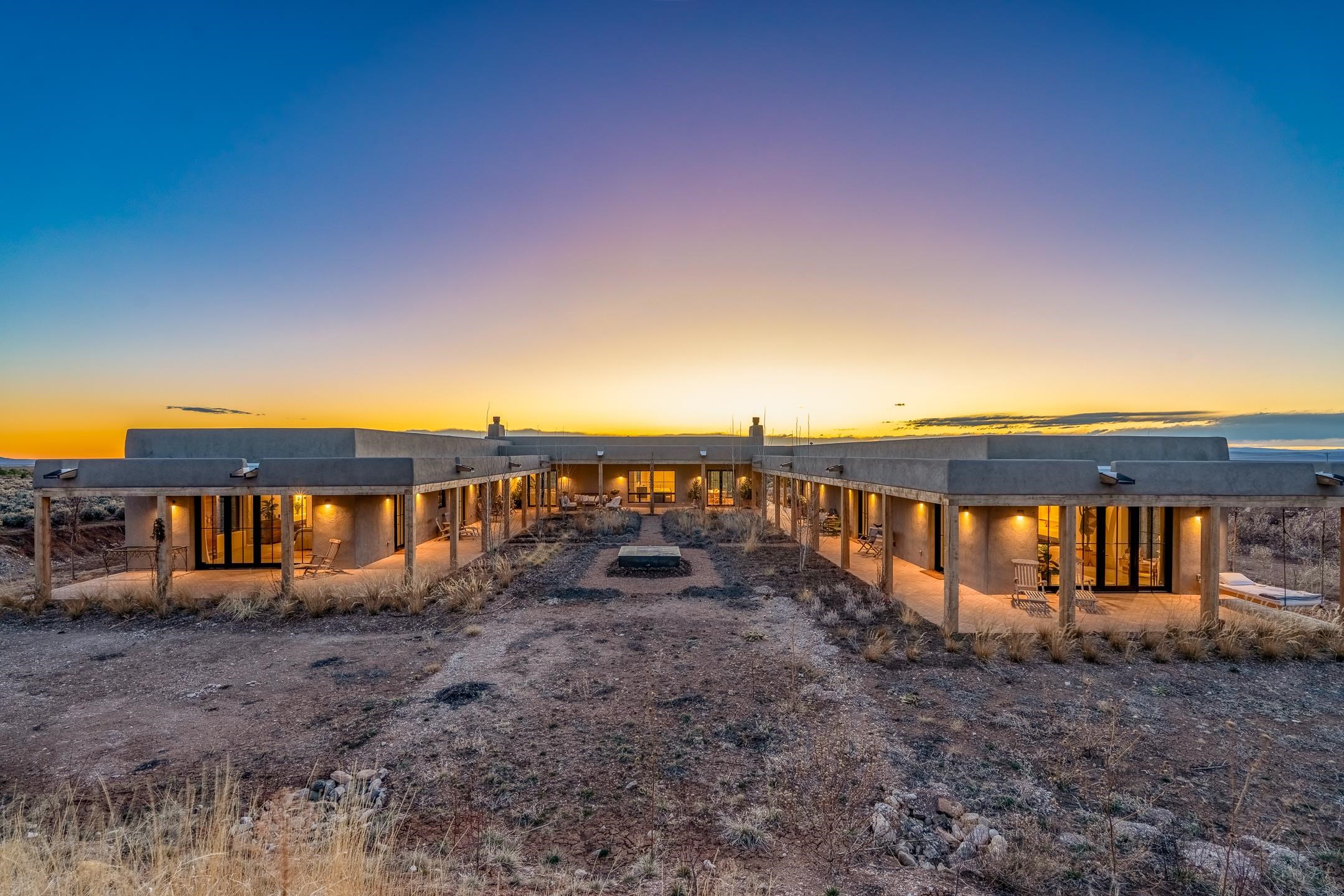 Completed in August 2024, this architecturally refined, modern-hacienda-style residence on Cavalry Camp Road offers a rare blend of contemporary design, thoughtful craftsmanship, and true indoor-outdoor living. Designed by Jed Magee of Magee Design, LLC and built by Aaron Magee of Magee Build, the property embodies exceptional attention to detail, materials, and long-term performance. The property is located in the highly desirable area of Arroyo Seco, with Taos Ski Valley just 20 minutes away, offering access to world-class skiing and year-round mountain recreation. Shopping, dining, and the Historic Taos Plaza are also conveniently close by, providing easy access to the cultural and culinary heart of Taos. The residence sits on 10 acres and borders Pueblo land, which provides additional privacy and long-term protection of the surrounding landscape and stunning views. The residence spans 4,492 square feet across a main residence and a fully independent guest residence, providing flexibility for hosting, multi-generational living, or creative use. The home’s purposeful siting frames dramatic views of the Sangre de Cristo Mountains to its east and reveals an unobstructed 180° sunset panorama to its west. The main residence (3,108 sq ft) features 2 bedrooms and 2 baths, while the guest residence (1,384 sq ft) offers 3 bedrooms and 2.5 baths, for a total of 5 bedrooms and 4.5 bathrooms (including one bedroom currently used as a library). Each part of the extended home is designed to open to the substantial 2,700+ sq ft courtyard of lavender, English roses, and native plants. Both the main house and the guest wing are fully self-sufficient with separate radiant heating systems, dedicated on-demand water heaters, laundry facilities, and mechanical rooms, ensuring comfort, efficiency, and privacy. Each room is equipped with individual smart thermostats, and a centralized smart home hub allows seamless control of lighting and heating throughout the property. Indoor spaces open gracefully to expansive exterior living areas, including a substantial 2,400 square feet of covered portals framing the central courtyard and multiple patios positioned to capture light, extraordinary views, and total privacy—hallmarks of the home’s modern hacienda design. A detached two-car garage completes the compound. Constructed with 6-inch ICF walls for superior insulation and durability, the residence features TPO roofing with copper-lined cedar canales, cottonwood-colored stucco, and Sierra Pacific clad windows and doors. Interior finishes include pigmented finish plaster walls, quartz countertops throughout, two fireplaces, and Zia handmade encaustic cement tile flooring. The primary and guest baths are accented with Zia handmade cotto tile, reinforcing the home’s refined Southwestern character. The kitchen is outfitted with a premium appliance suite, including Wolf, Sub-Zero, Monogram, and Bosch, complemented by multiple freezer units for convenience and storage. This newly completed residence offers a compelling combination of architectural integrity, craftsmanship, privacy, protected views, and lifestyle—ideal for those seeking a private courtyard compound in one of Arroyo Seco’s most desirable settings with convenient access to Taos Ski Valley and the very best of Taos. MATTERPORT VIDEO LINK: https://www.zillow.com/view-imx/5030e743-d9f9-4232-ae0e-d473c40fdee2?setAttribution=mls&wl=true&initialViewType=pano&utm_source=dashboard More information about this stunning property can be viewed at these links: https://mageebuild.com/project/the-courtyard/ and https://mageedesignworks.com/the-taos-courtyard/.