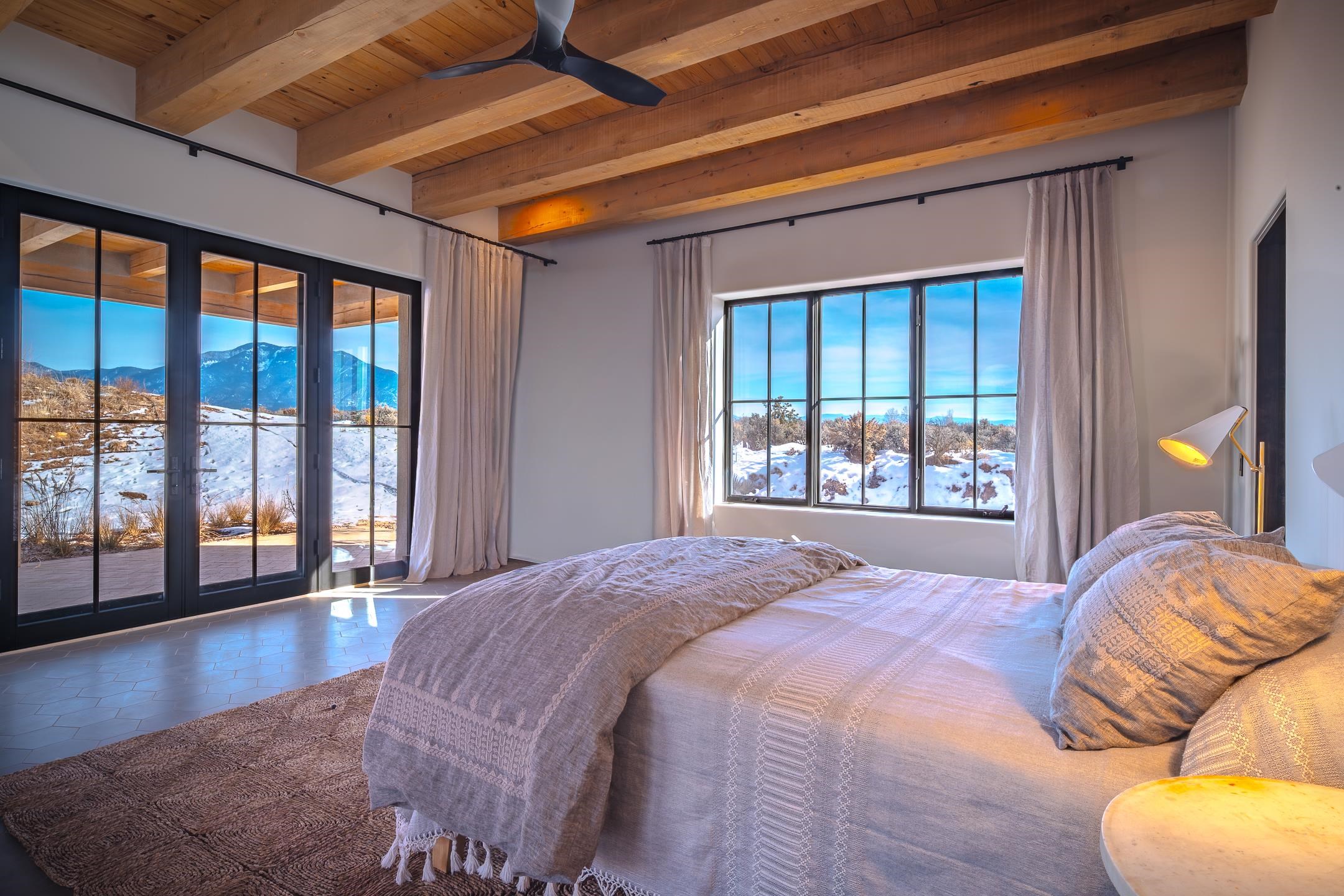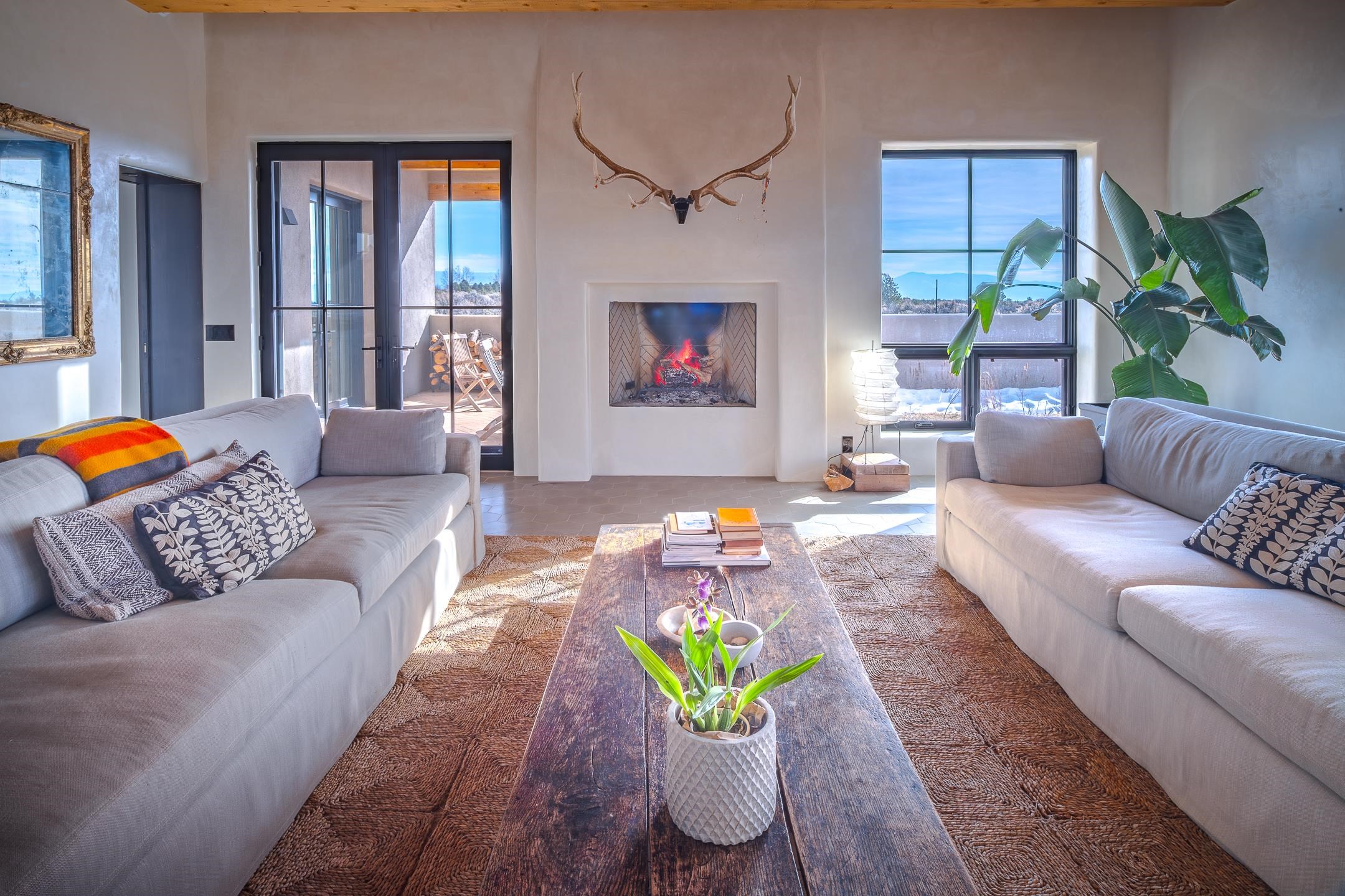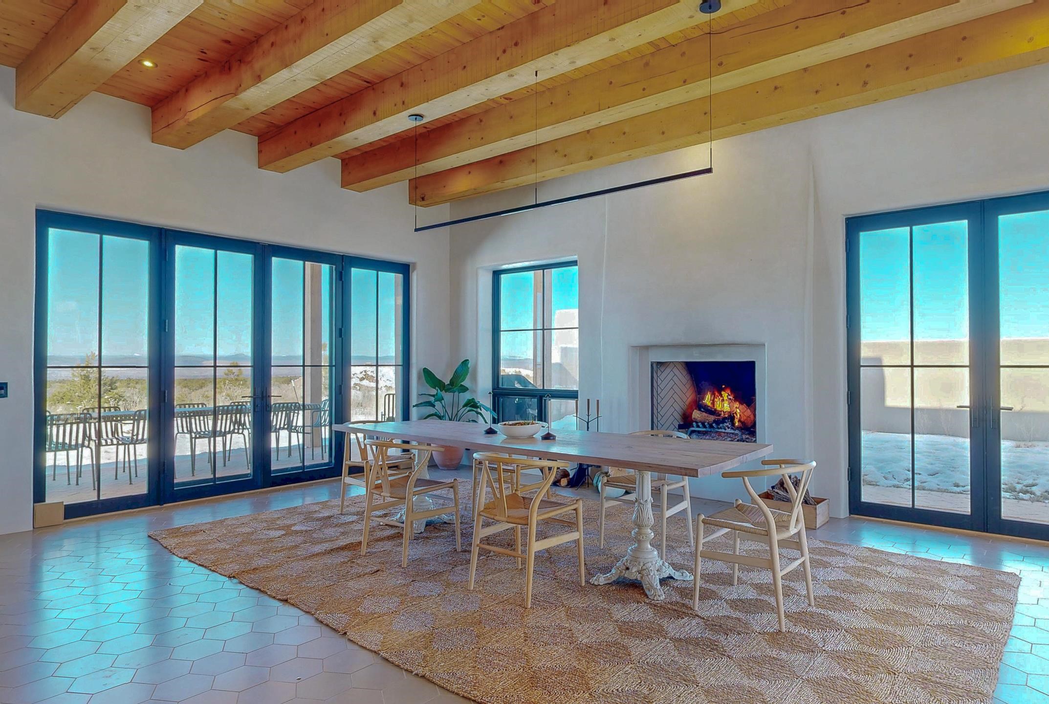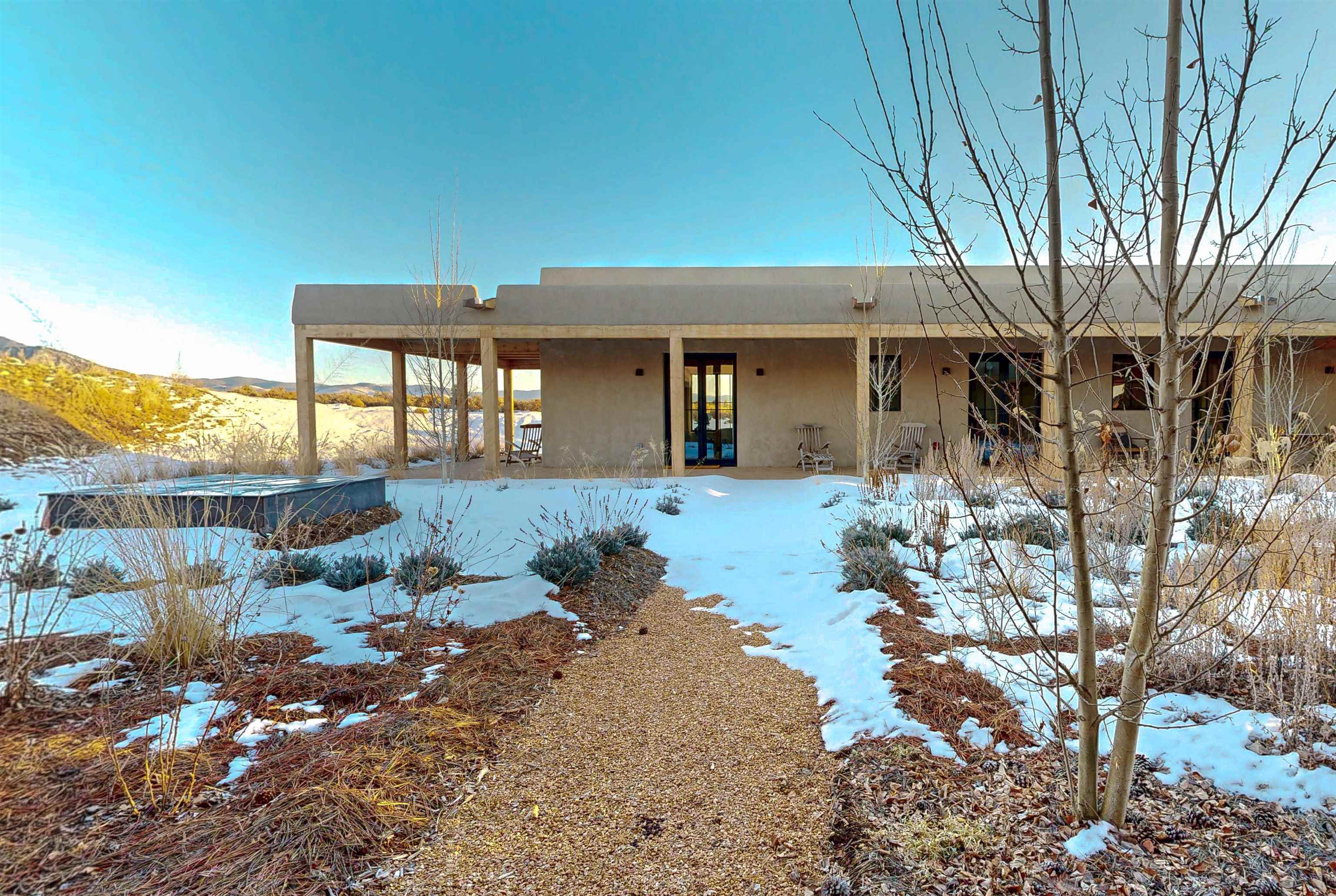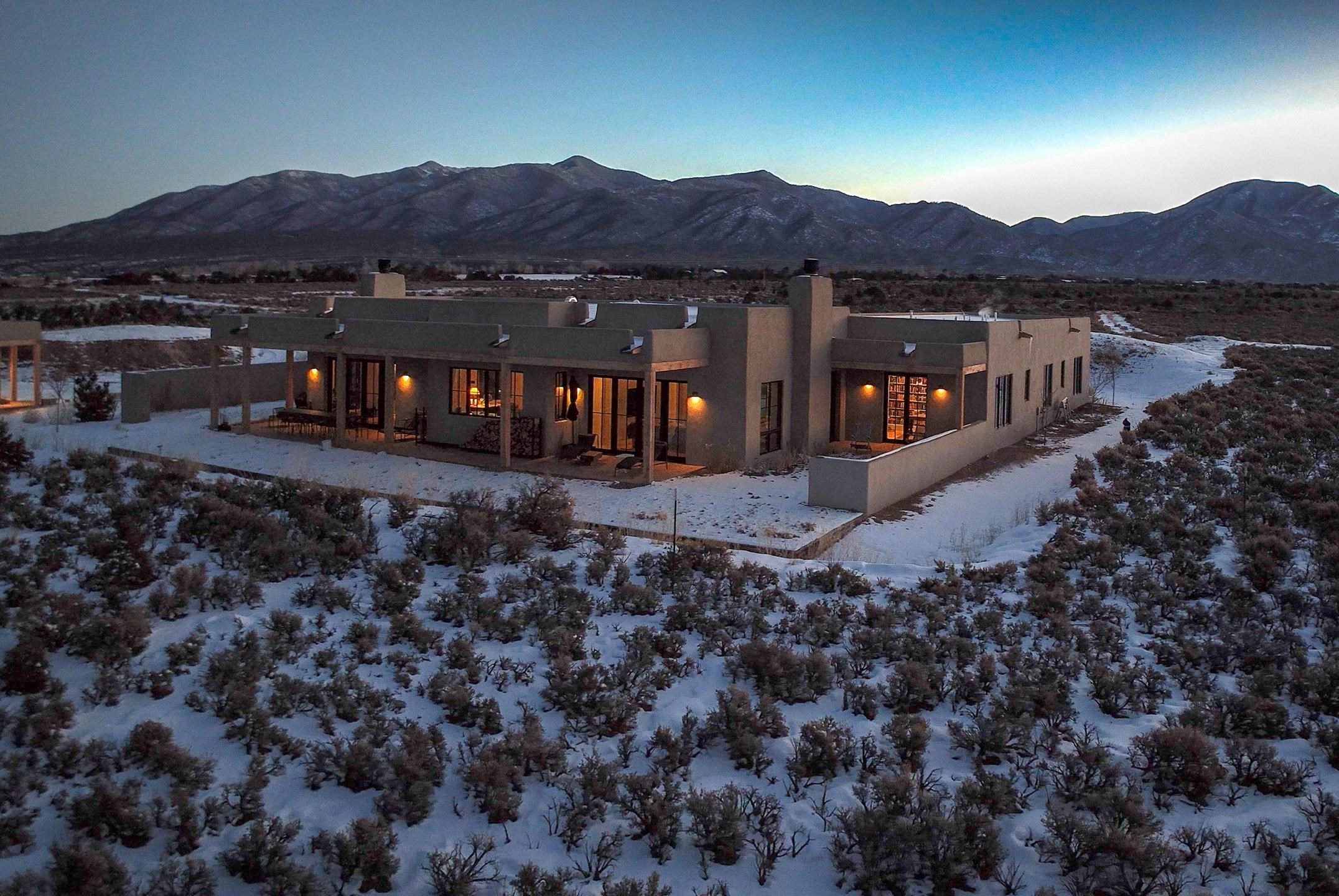 Completed in August 2024, this architecturally refined, modern-hacienda-style residence on Cavalry Camp Road offers a rare blend of contemporary design, thoughtful craftsmanship, and true indoor-outdoor living. Designed by Jed Magee of Magee Design, LLC and built by Aaron Magee of Magee Build, the property embodies exceptional attention to detail, materials, and long-term performance. The property is located in the highly desirable area of Arroyo Seco, with Taos Ski Valley just 20 minutes away, offering access to world-class skiing and year-round mountain recreation. Shopping, dining, and the Historic Taos Plaza are also conveniently close by, providing easy access to the cultural and culinary heart of Taos. The residence sits on 10 acres and borders Pueblo land, which provides additional privacy and long-term protection of the surrounding landscape and stunning views. The residence spans 4,492 square feet across a main residence and a fully independent guest residence, providing flexibility for hosting, multi-generational living, or creative use. The home’s purposeful siting frames dramatic views of the Sangre de Cristo Mountains to its east and reveals an unobstructed 180° sunset panorama to its west. The main residence (3,108 sq ft) features 2 bedrooms and 2 baths, while the guest residence (1,384 sq ft) offers 3 bedrooms and 2.5 baths, for a total of 5 bedrooms and 4.5 bathrooms (including one bedroom currently used as a library). Each part of the extended home is designed to open to the substantial 2,700+ sq ft courtyard of lavender, English roses, and native plants. Both the main house and the guest wing are fully self-sufficient with separate radiant heating systems, dedicated on-demand water heaters, laundry facilities, and mechanical rooms, ensuring comfort, efficiency, and privacy. Each room is equipped with individual smart thermostats, and a centralized smart home hub allows seamless control of lighting and heating throughout the property. Indoor spaces open gracefully to expansive exterior living areas, including a substantial 2,400 square feet of covered portals framing the central courtyard and multiple patios positioned to capture light, extraordinary views, and total privacy—hallmarks of the home’s modern hacienda design. A detached two-car garage completes the compound. Constructed with 6-inch ICF walls for superior insulation and durability, the residence features TPO roofing with copper-lined cedar canales, cottonwood-colored stucco, and Sierra Pacific clad windows and doors. Interior finishes include pigmented finish plaster walls, quartz countertops throughout, two fireplaces, and Zia handmade encaustic cement tile flooring. The primary and guest baths are accented with Zia handmade cotto tile, reinforcing the home’s refined Southwestern character. The kitchen is outfitted with a premium appliance suite, including Wolf, Sub-Zero, Monogram, and Bosch, complemented by multiple freezer units for convenience and storage. This newly completed residence offers a compelling combination of architectural integrity, craftsmanship, privacy, protected views, and lifestyle—ideal for those seeking a private courtyard compound in one of Arroyo Seco’s most desirable settings with convenient access to Taos Ski Valley and the very best of Taos.
