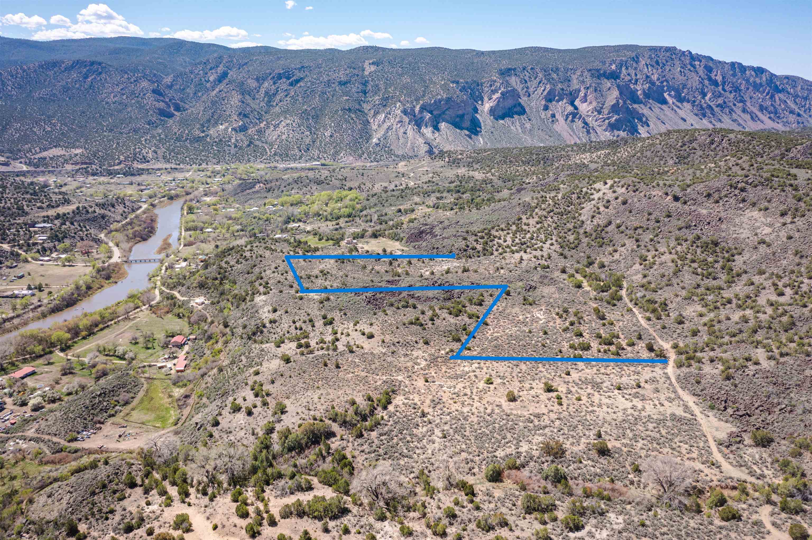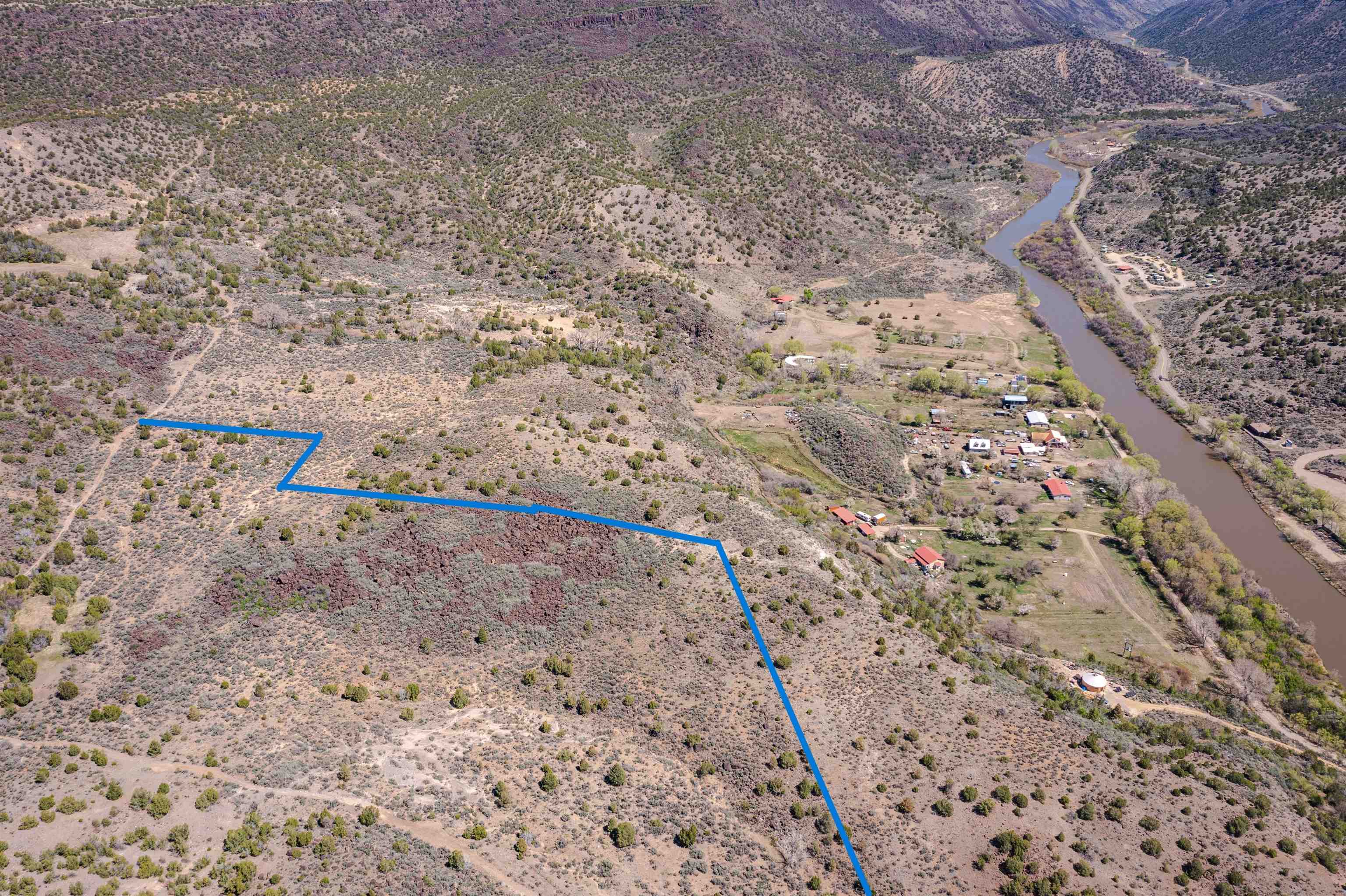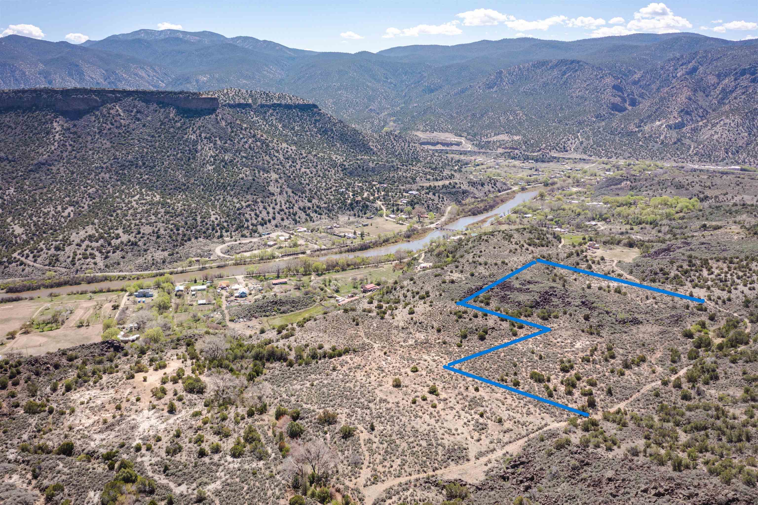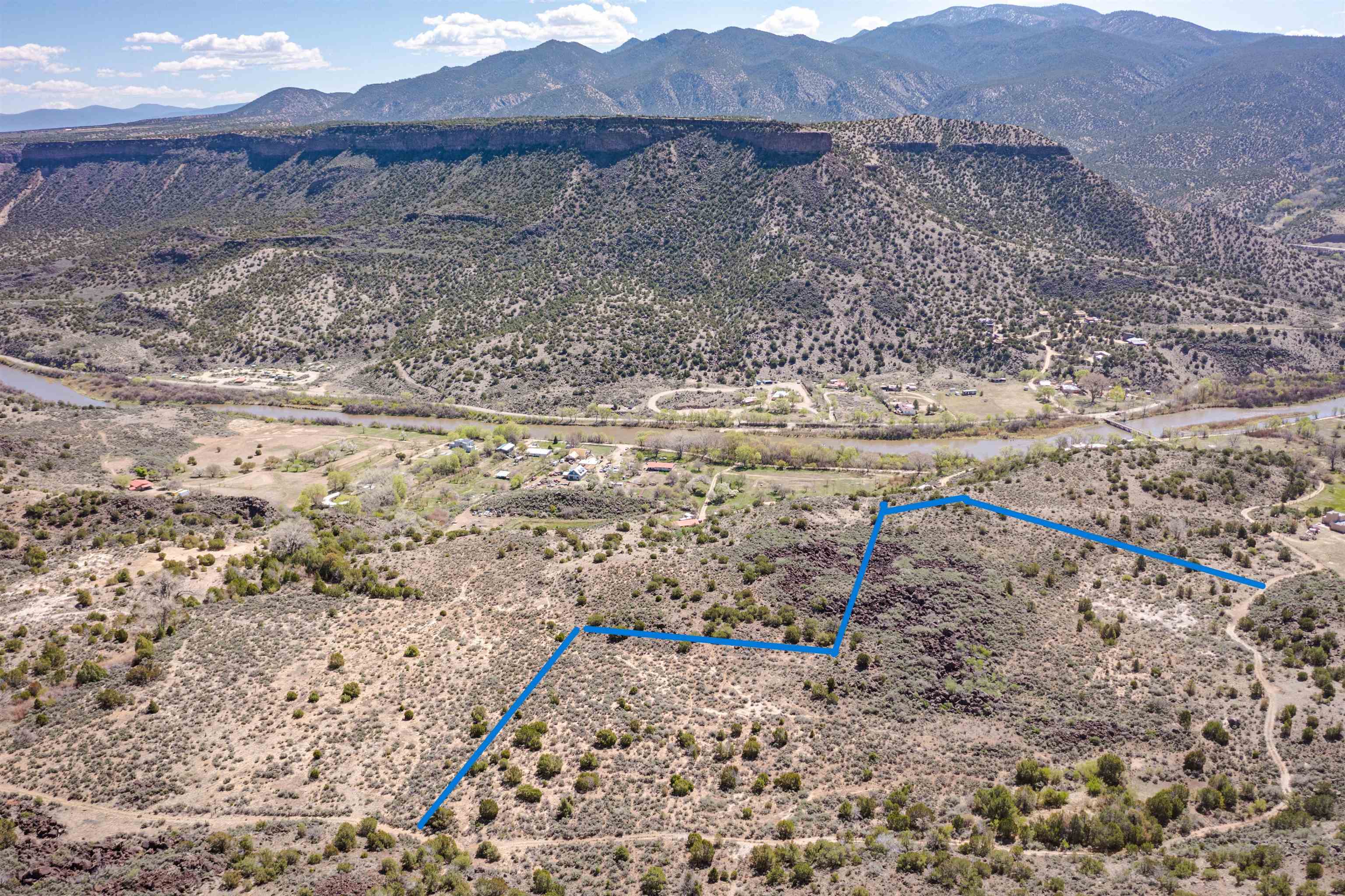 This Very secluded 16+ acre mesa-top lot is a rarity. From this gently sloping perch you look over the Pilar valley of the Rio Grande with unbelievable views northwards towards Lobo Peak and Vallecitos Peak in Taos. To the east you look towards Picuris Mtn and behind you is the Rio Grande National Monument and to the SW is the Carson National Forest. Blessed with a year round spring in the SW corner, living here you will experience the sights and sounds and seasons of nature without city lights, and without city sounds. Elk, bob-cat, coyote, deer regularly move through this land on their way to the river to drink; birds migrating up the Rio Grande include golden eagles, bald eagles, osprey and flocks of songbirds. And yet her you are just a short 20 min drive to Taos or back down valley about 1 hour to Santa Fe. This lot is recently surveyed and has recorded easements for access in place - so you can bring to life your imagination of life lived in nature. Marked up images are meant to convey approximate location of property boundaries; on the westerly boundary the access road (that goes towards Carson) separates this tract from BLM lands.