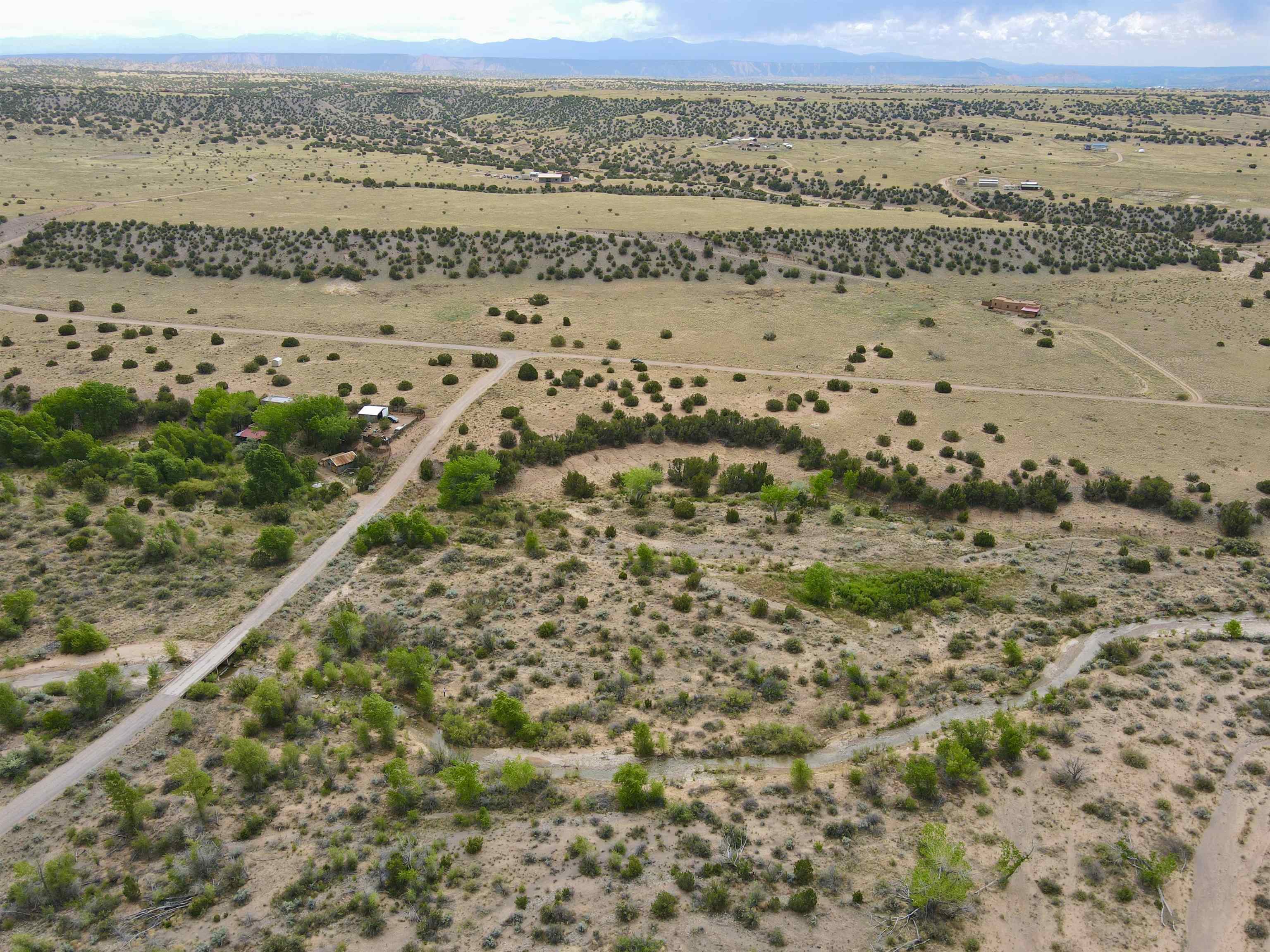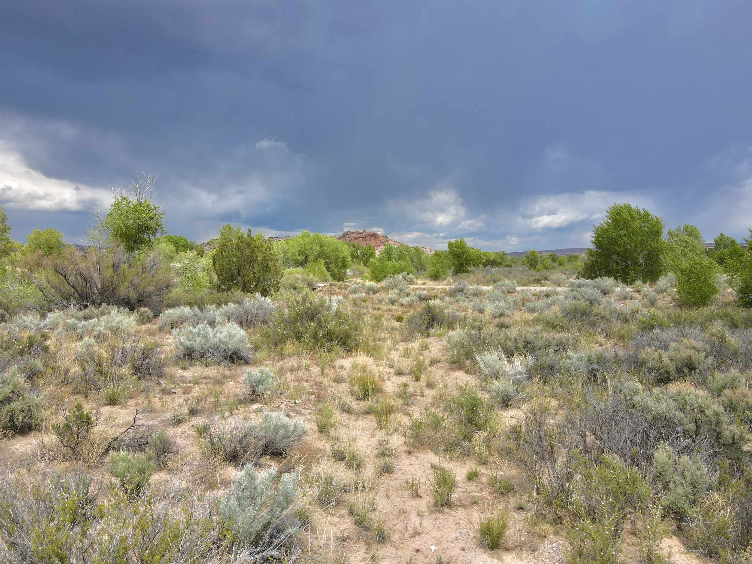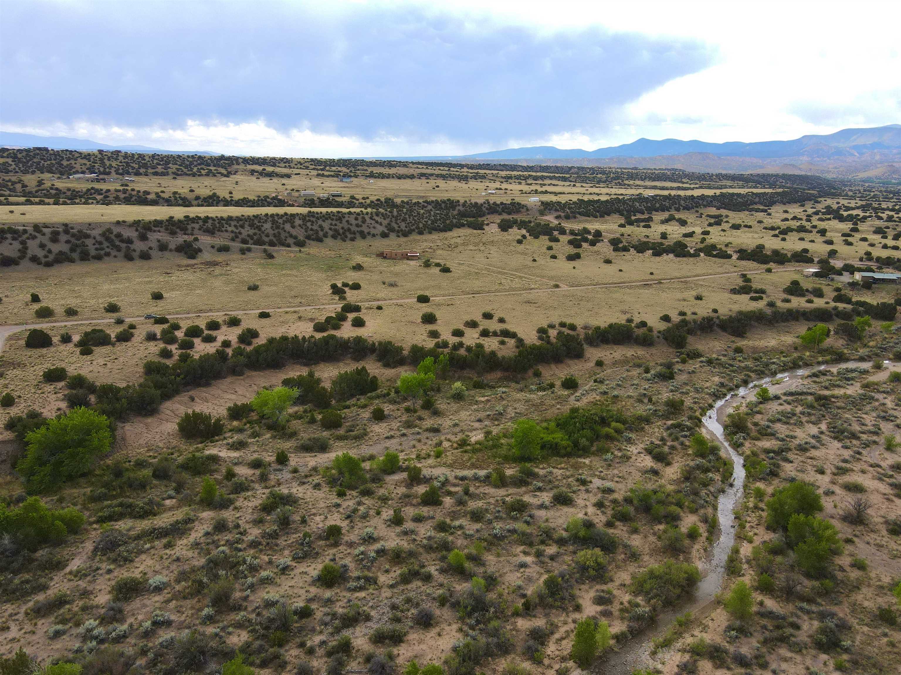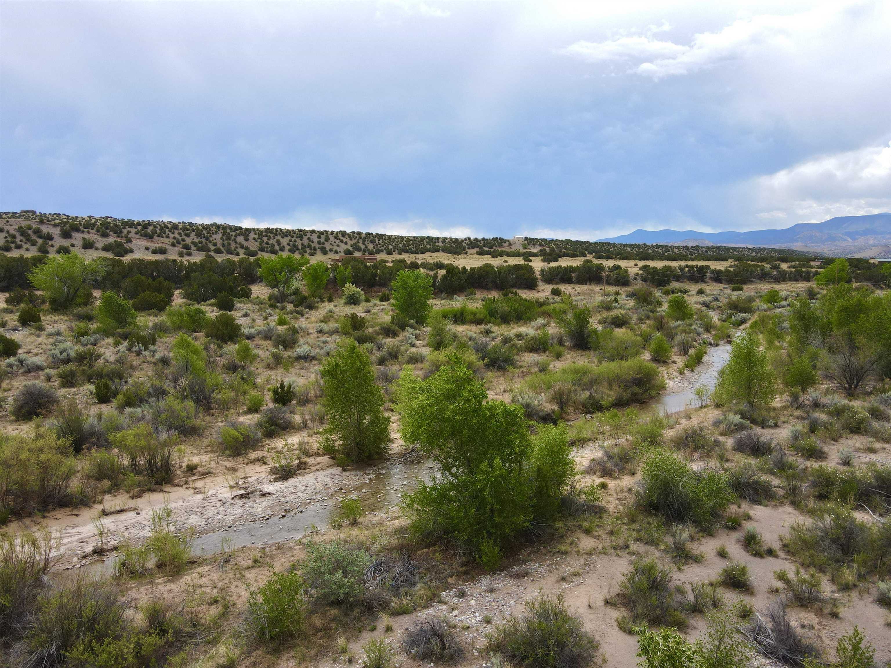This property is well suited for your horses—just add the corral! Two adjacent lots total 10.92 acres, only 20 minutes from Abiquiú Lake. One lot offers cleared, mostly flat ground ready for construction. The second lot, directly across the road, has a gentle slope that dips into Arroyo del Perro, which crosses the property. A natural tree line follows the arroyo, creating a sheltered corridor through the land. The property also offers wide views of the Sierra Negra mountains and a mix of open space and natural cover, well suited for a private homesite with varied terrain and seasonal water flow.