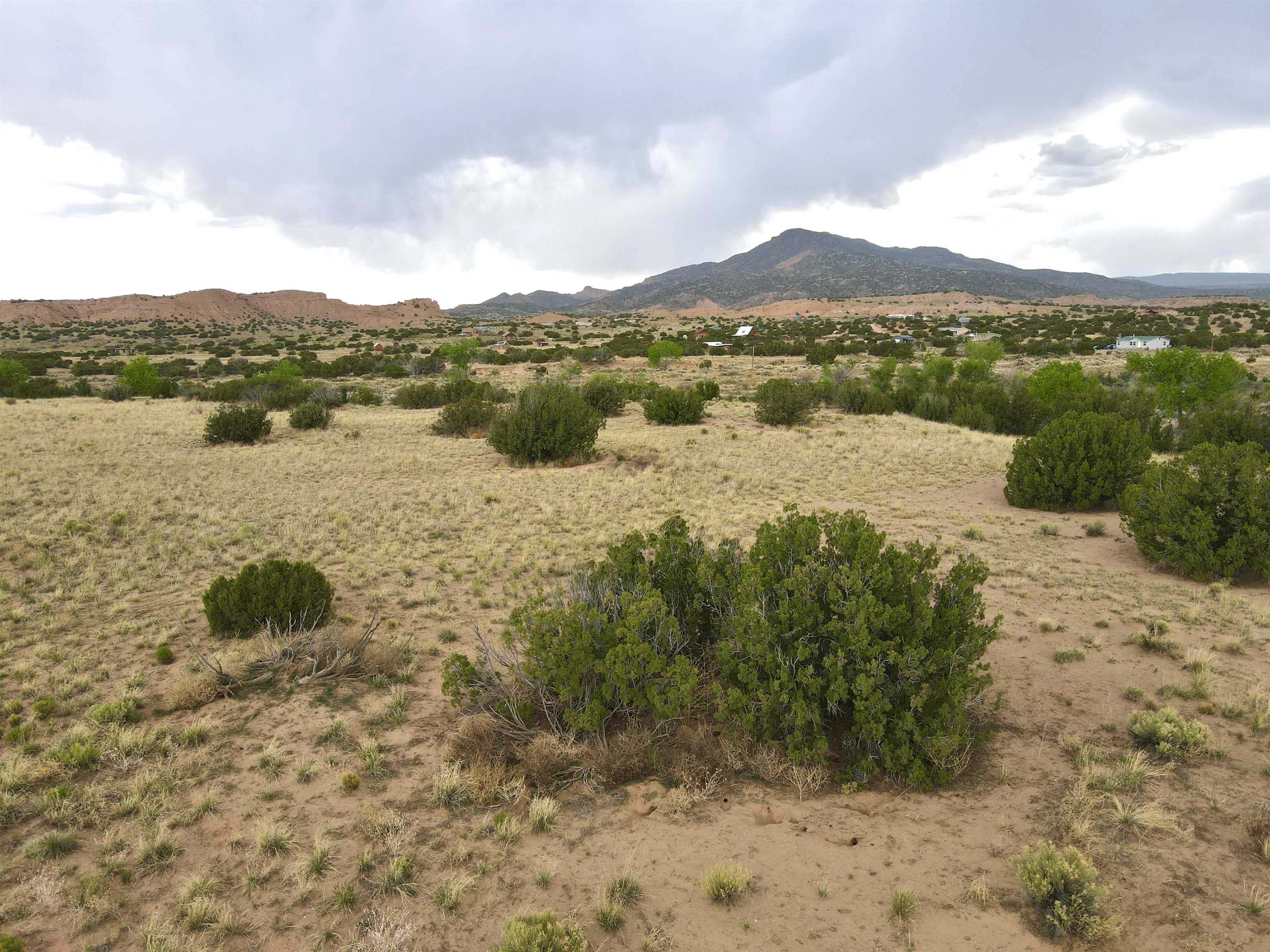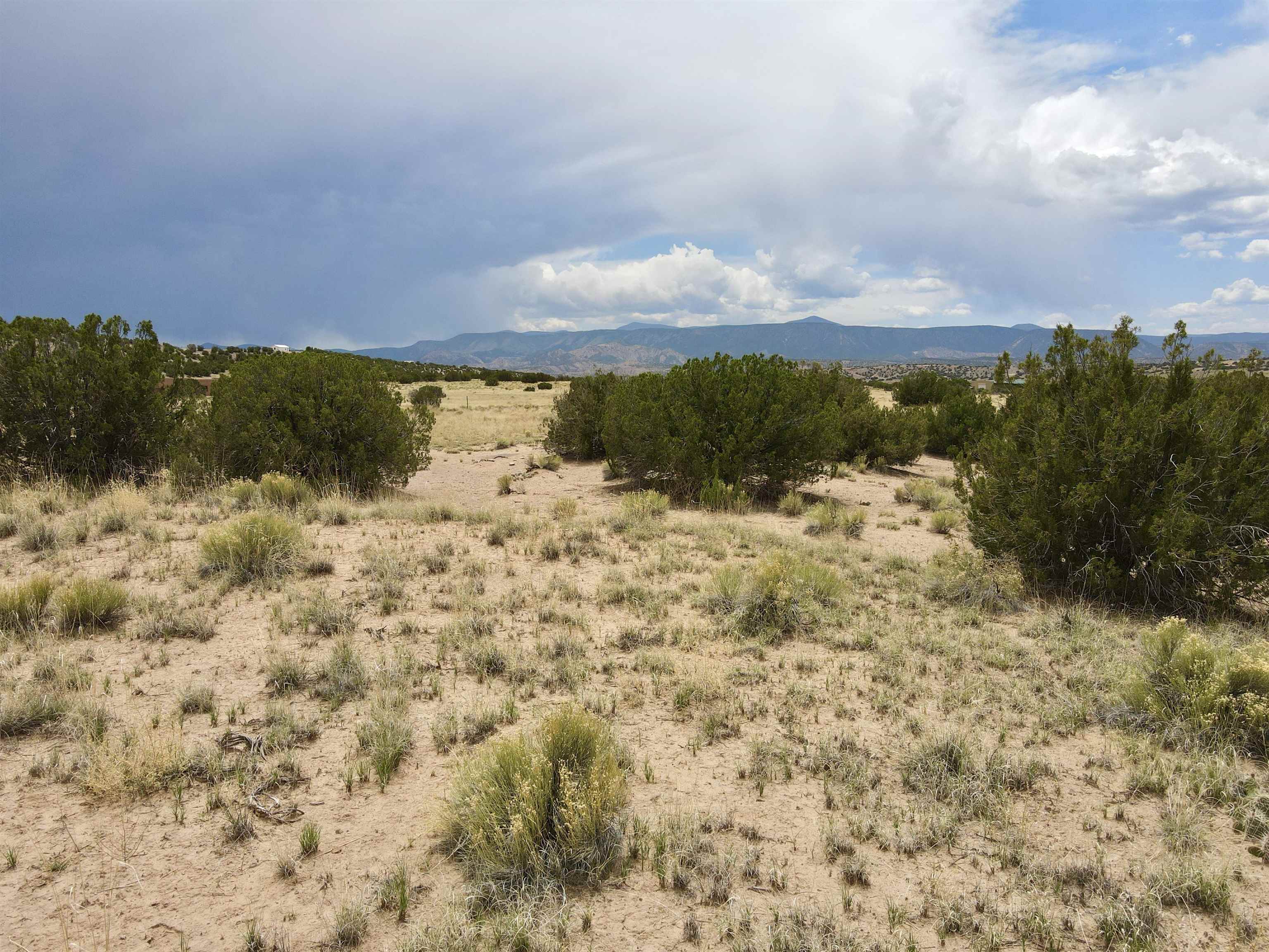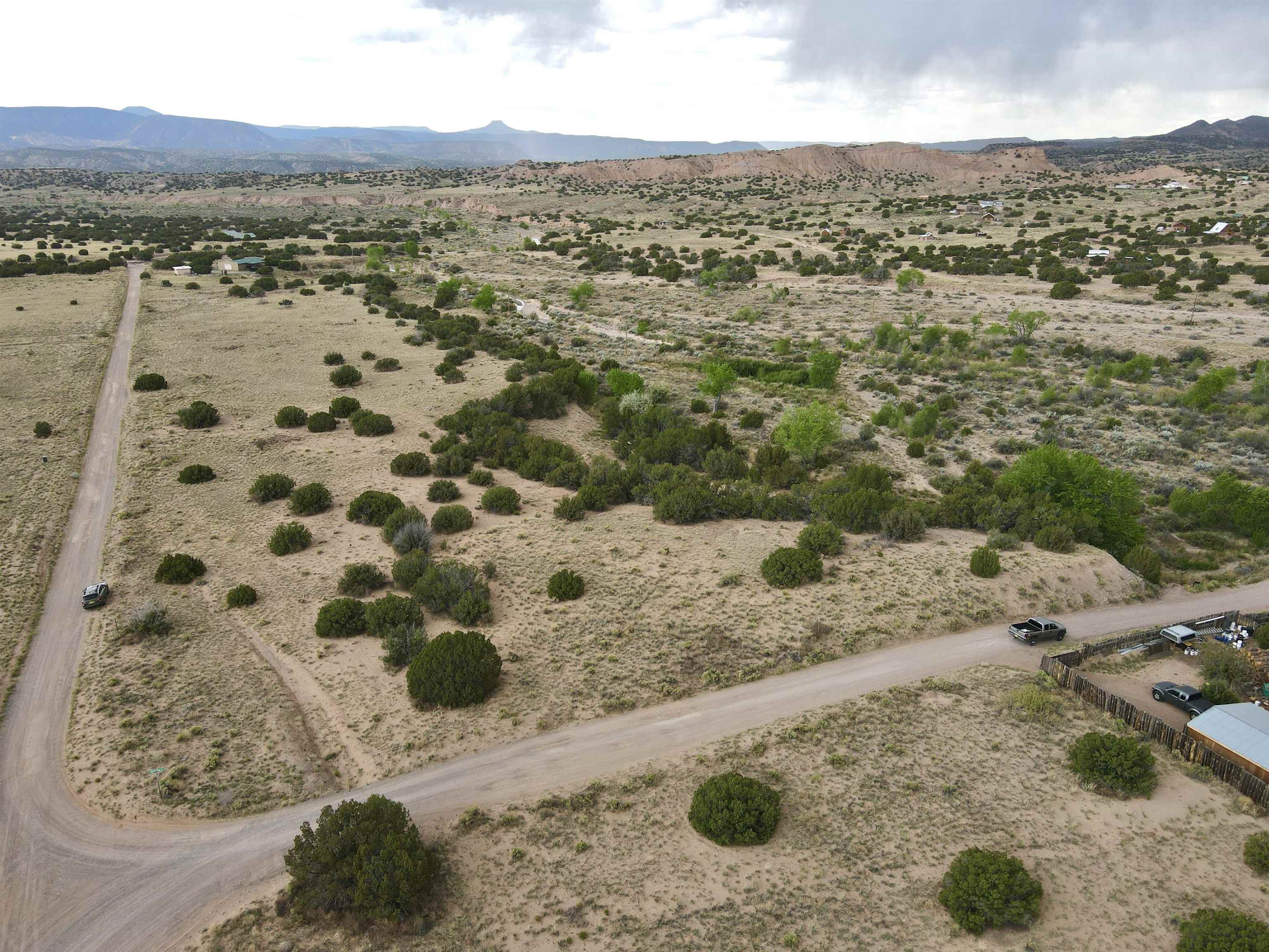 This property is well suited for your horses—just add the corral! Two adjacent lots total 10.92 acres, only 20 minutes from Abiquiú Lake. One lot offers cleared, mostly flat ground ready for construction. The second lot, directly across the road, has a gentle slope that dips into Arroyo del Perro, which crosses the property. A natural tree line follows the arroyo, creating a sheltered corridor through the land. The property also offers wide views of the Sierra Negra mountains and a mix of open space and natural cover, well suited for a private homesite with varied terrain and seasonal water flow.