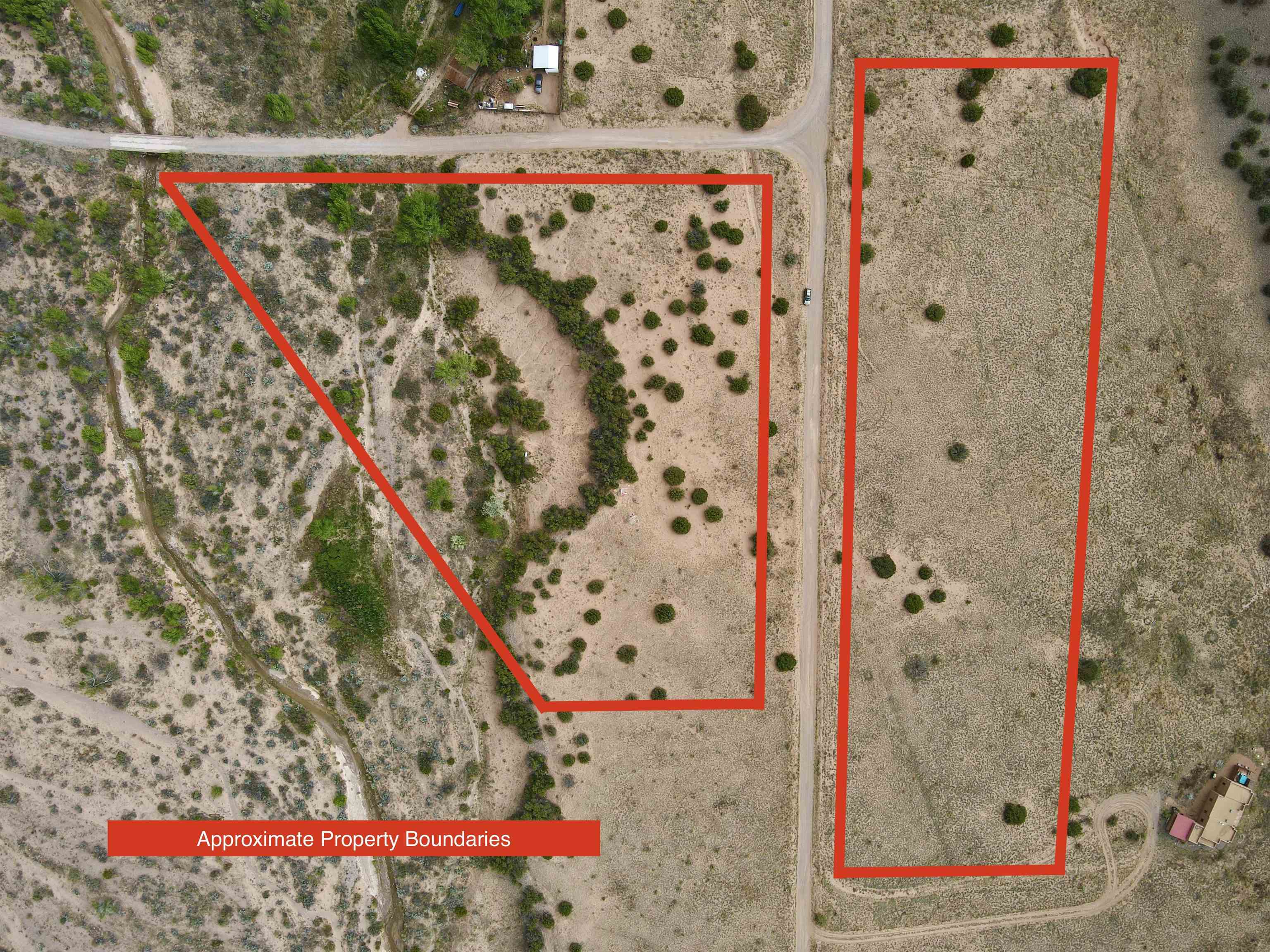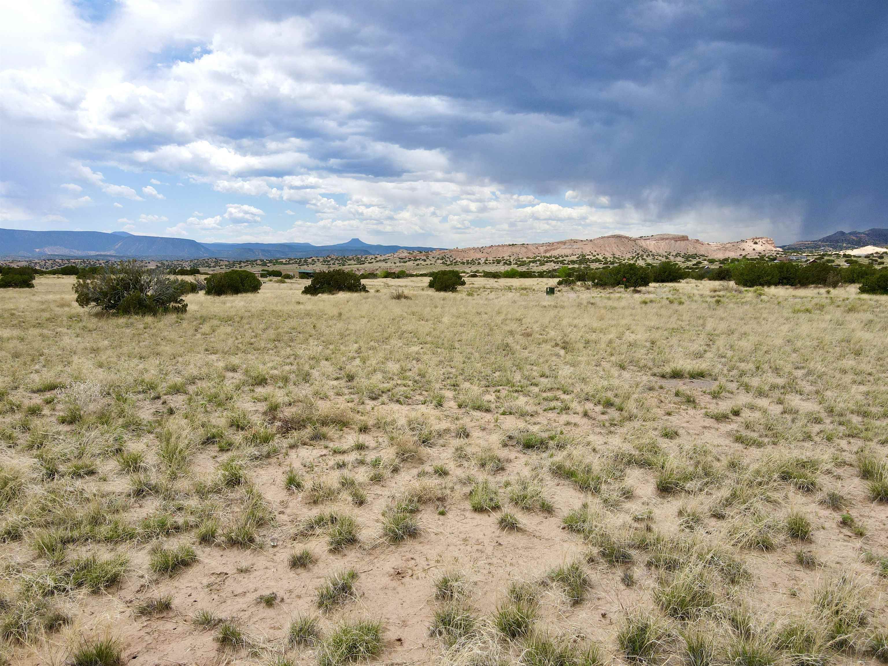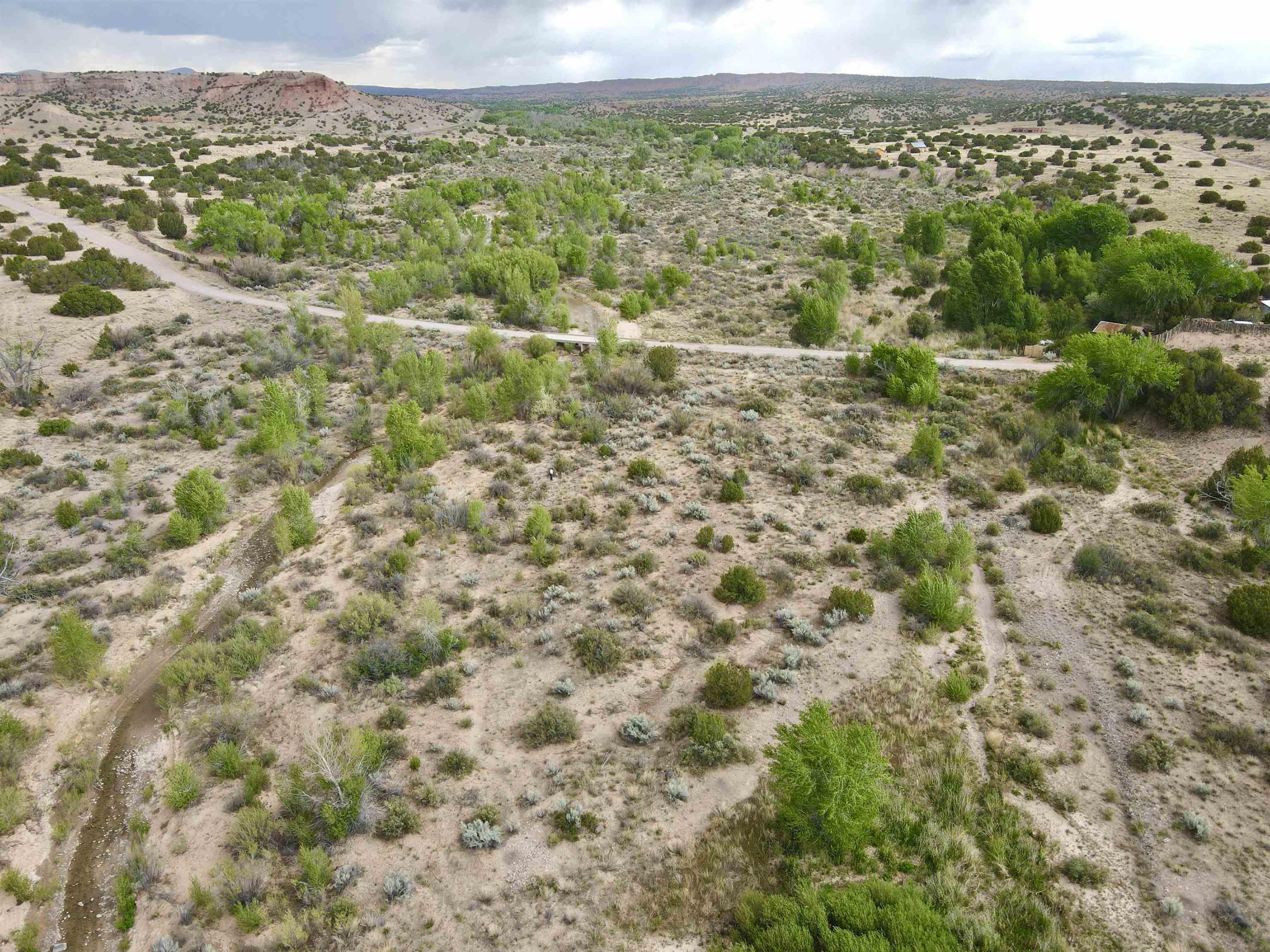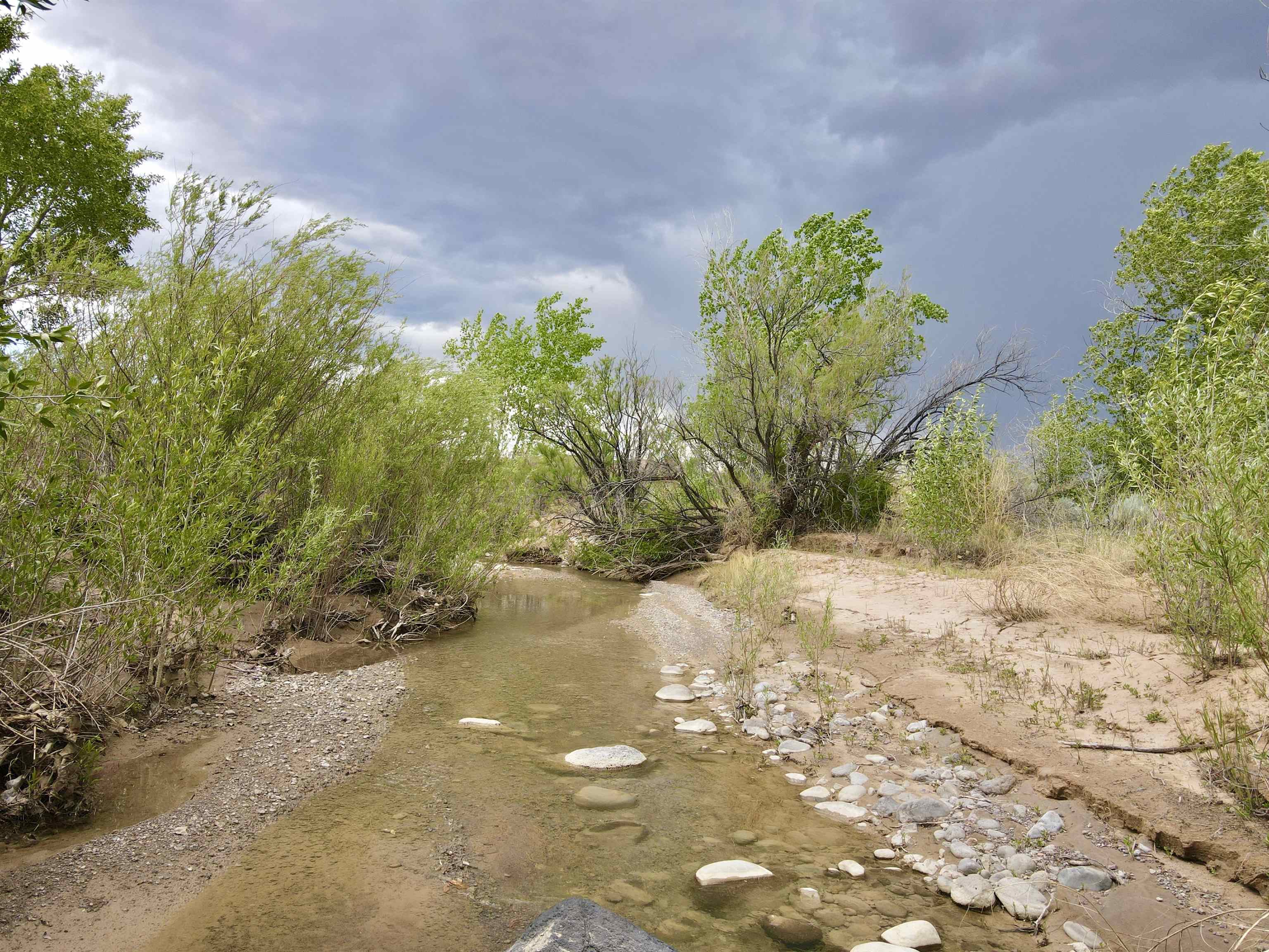 This property is well suited for your horses—just add the corral! Two adjacent lots total 10.92 acres, only 20 minutes from Abiquiú Lake. One lot offers cleared, mostly flat ground ready for construction. The second lot, directly across the road, has a gentle slope that dips into Arroyo del Perro, which crosses the property. A natural tree line follows the arroyo, creating a sheltered corridor through the land. The property also offers wide views of the Sierra Negra mountains and a mix of open space and natural cover, well suited for a private homesite with varied terrain and seasonal water flow.